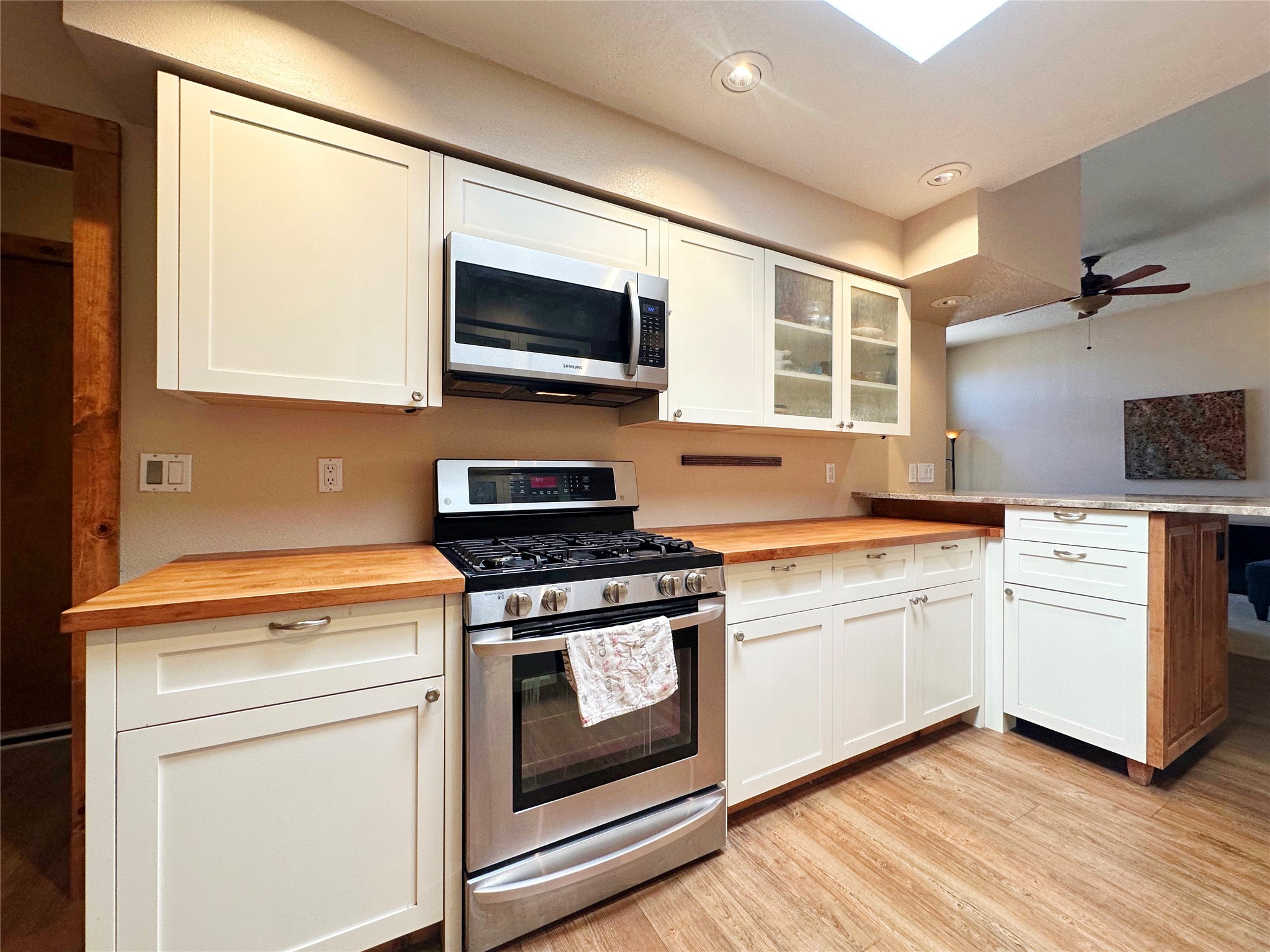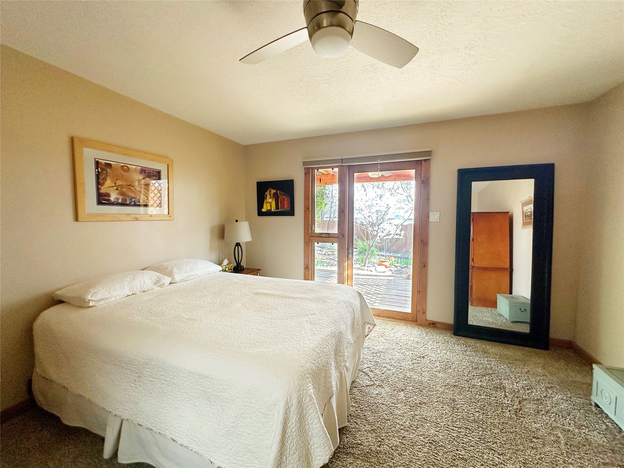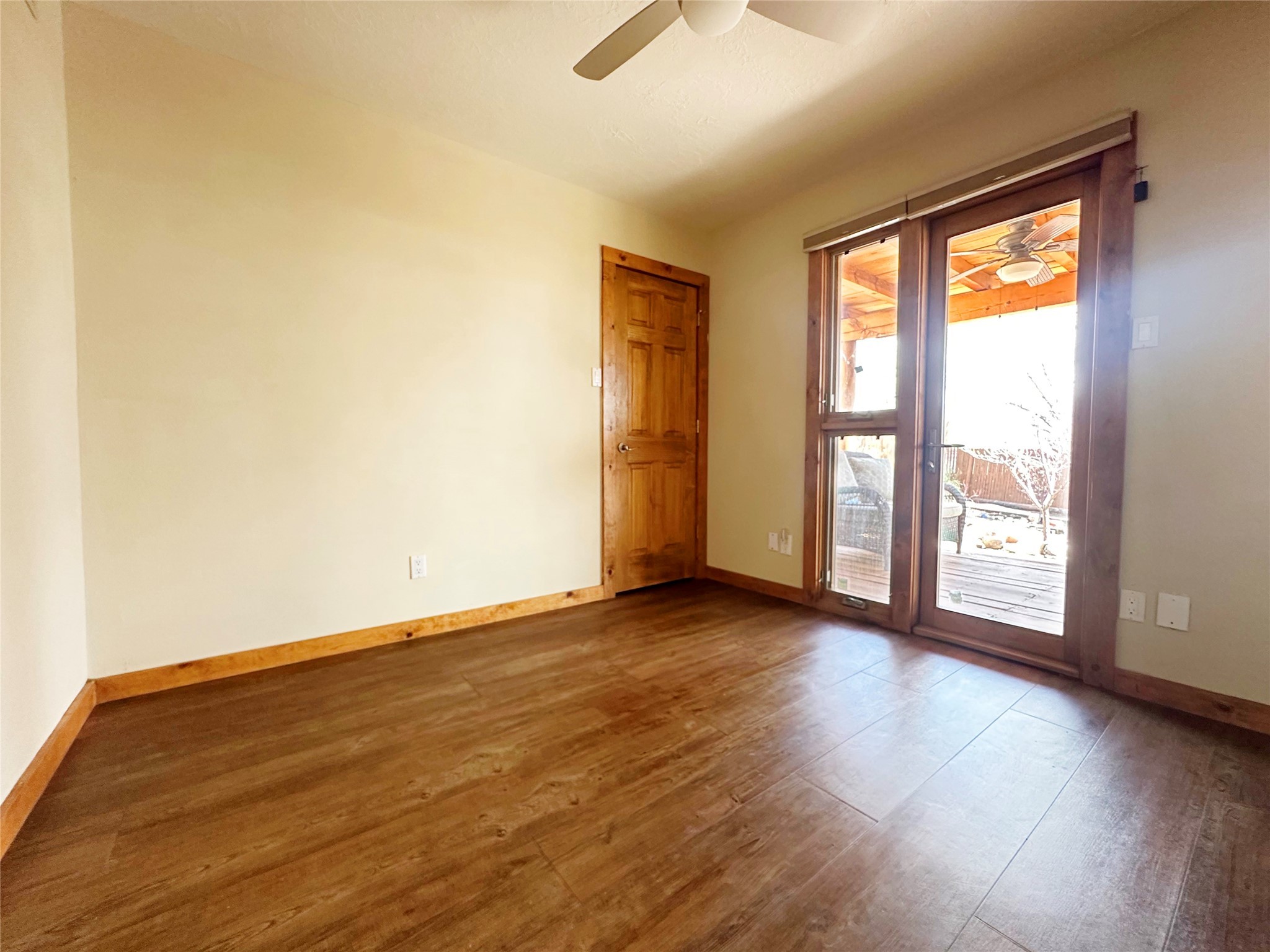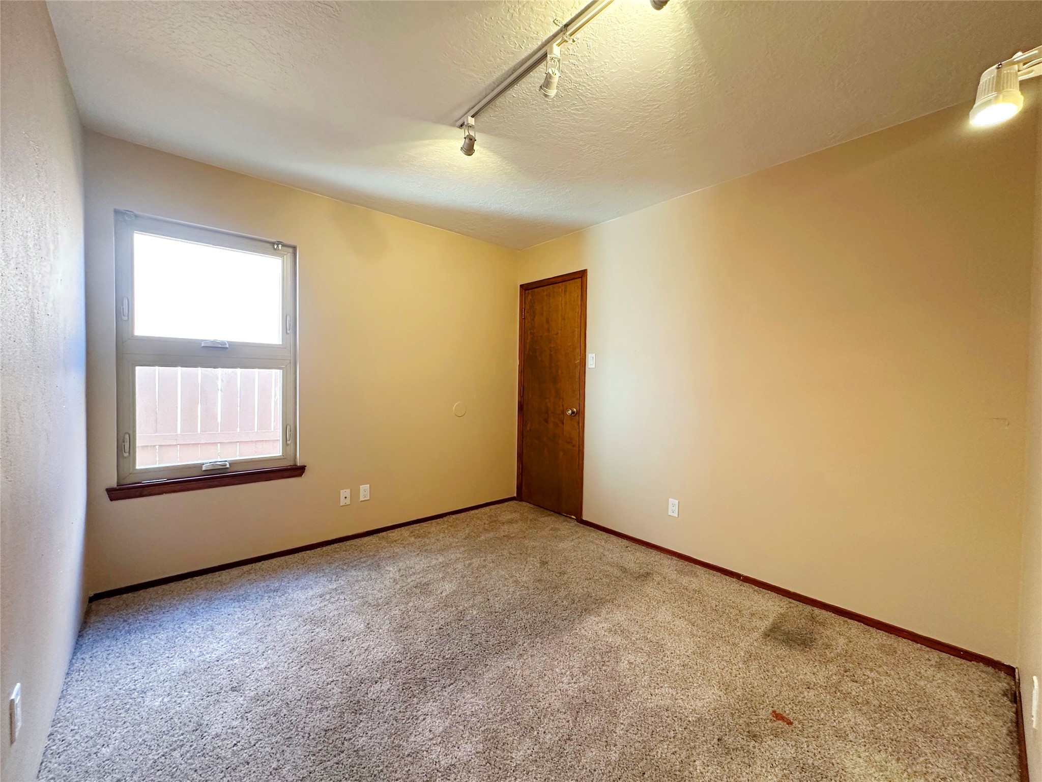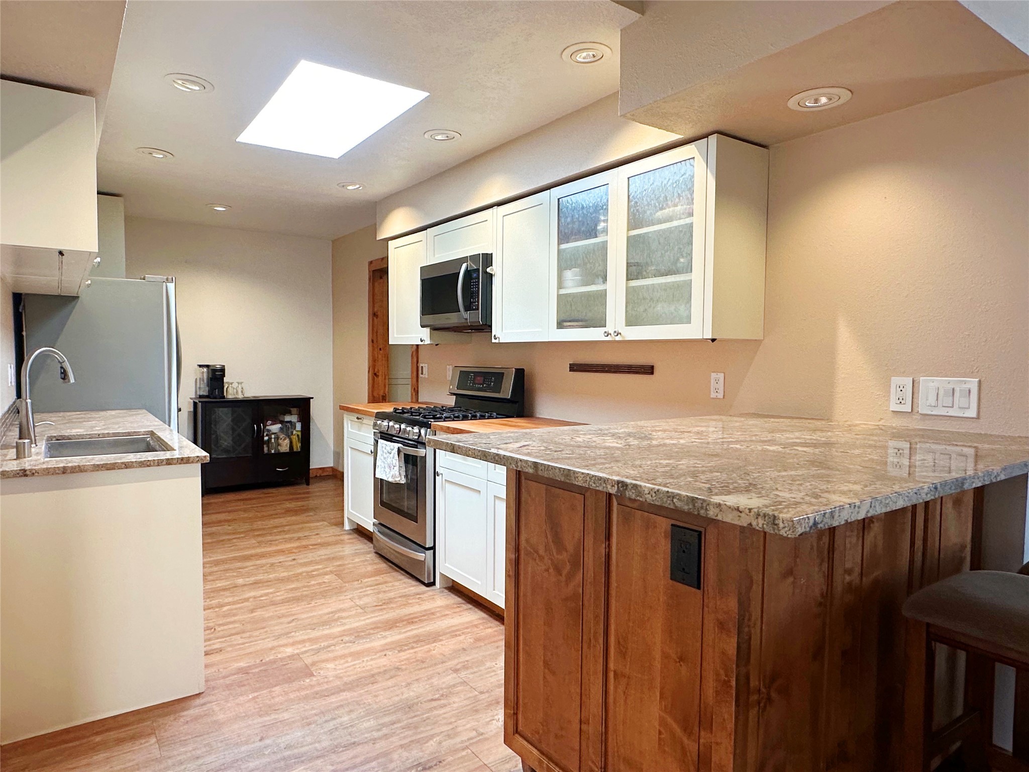 Well-maintained Santa Fe home offering three bedrooms and two baths in a convenient location. The heart of the home presents an open-concept living area with a well-designed kitchen, featuring butcher block countertops, stainless steel appliances, and glass display cabinetry. A large skylight and modern recessed lighting create bright, welcoming spaces throughout. Embracing Santa Fe's indoor-outdoor lifestyle, both the primary suite and second bedroom open directly to a covered deck with cooling fans, creating natural extensions of the living space. The primary suite includes an en-suite bath, while a tastefully refreshed guest bath completes the modern layout. A beautiful backyard features a flourishing Japanese blossom tree, offering a peaceful setting with room for additional landscaping. Multiple outdoor living spaces, including an intimate side patio and welcoming front courtyard, provide versatile areas for relaxation or entertaining. The two-car garage provides secure parking and storage space. Set near the Santa Fe Rail Trail with easy I-25 access, this home is just a 10-minute drive to the historic Plaza. The location perfectly combines pleasant residential living with convenient access to Santa Fe's culture. Adding to this home's appeal, the seller provides a generous $3,000 credit at closing towards carpet replacement in the bedrooms.