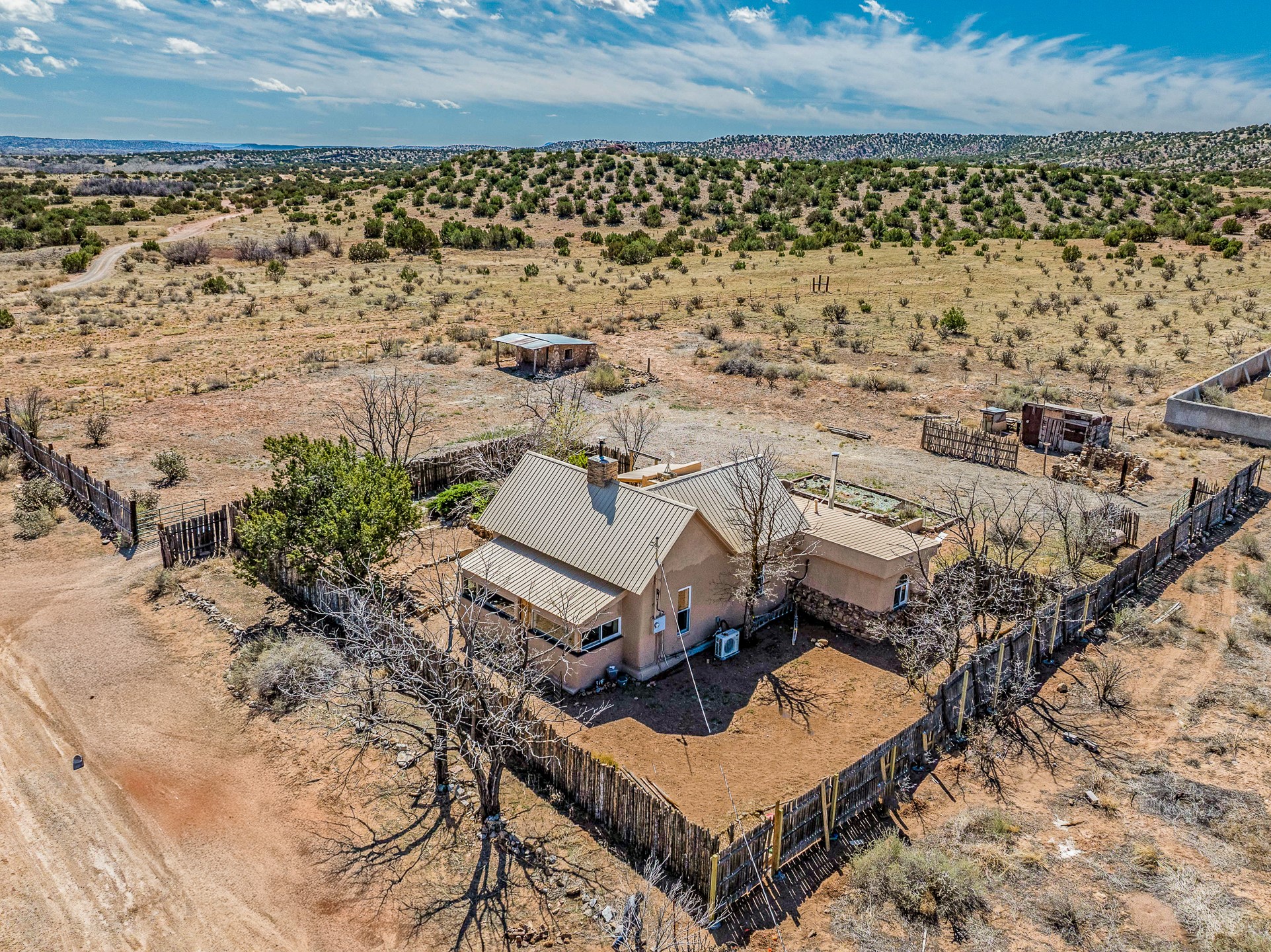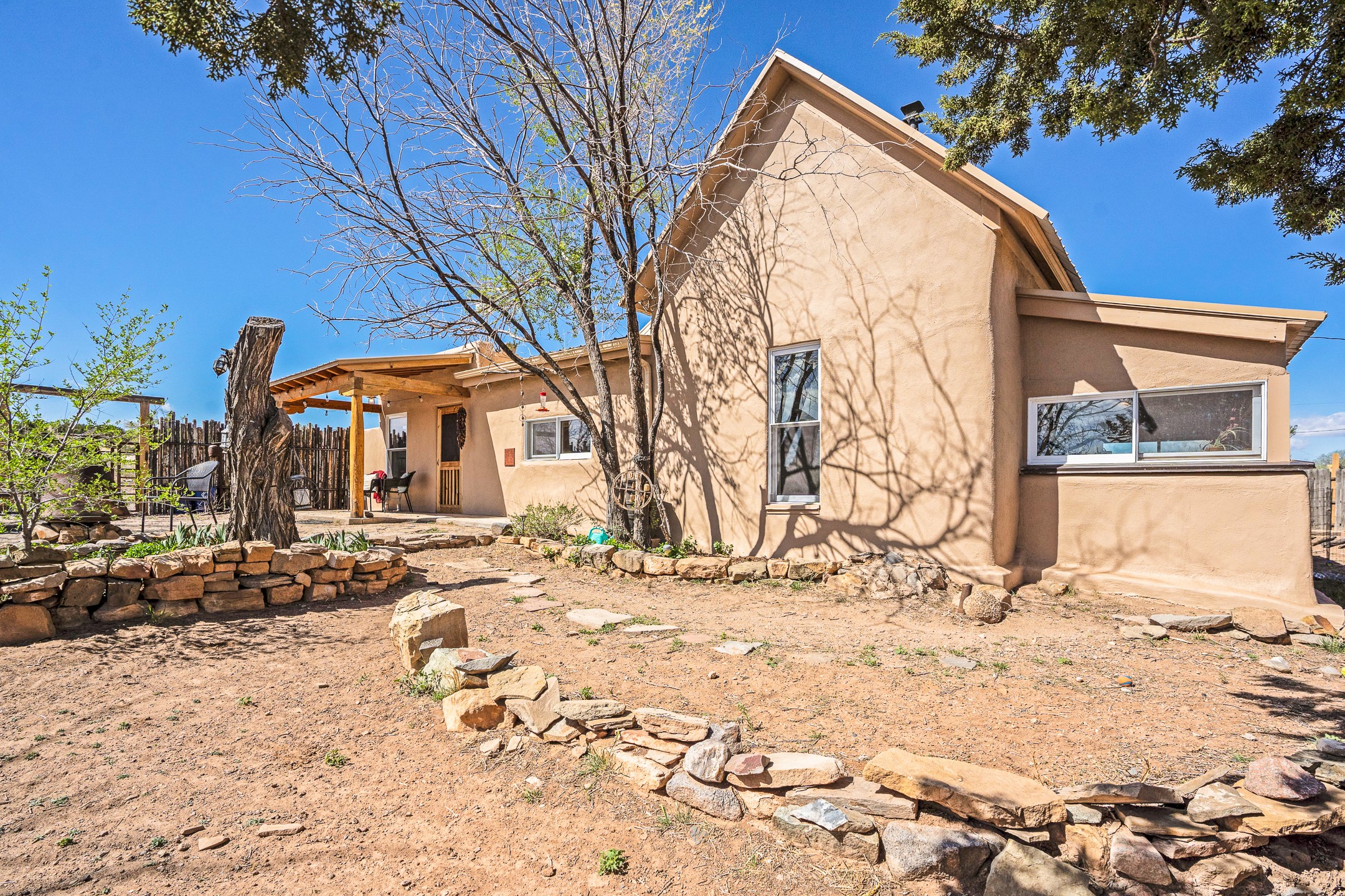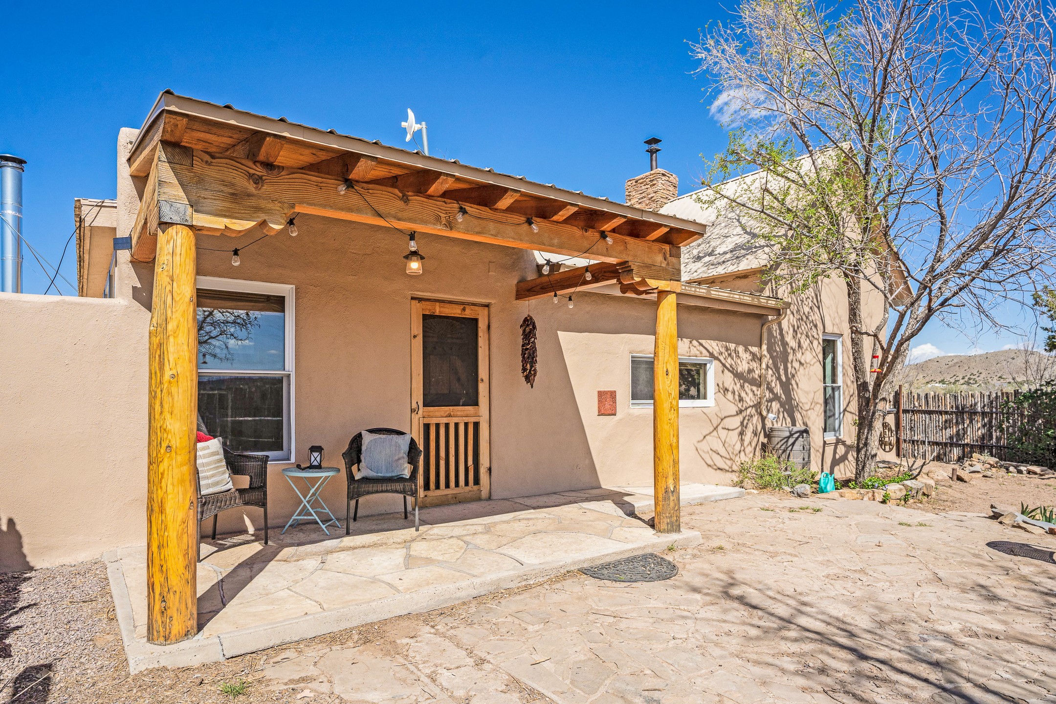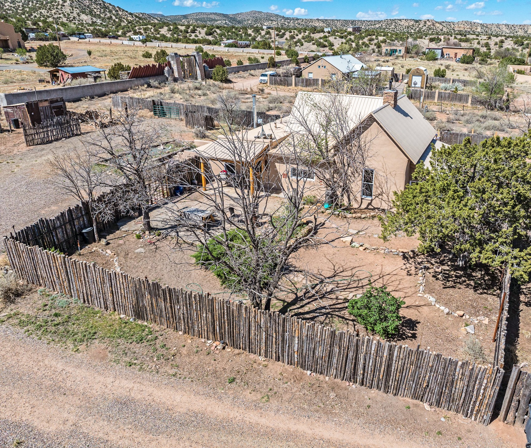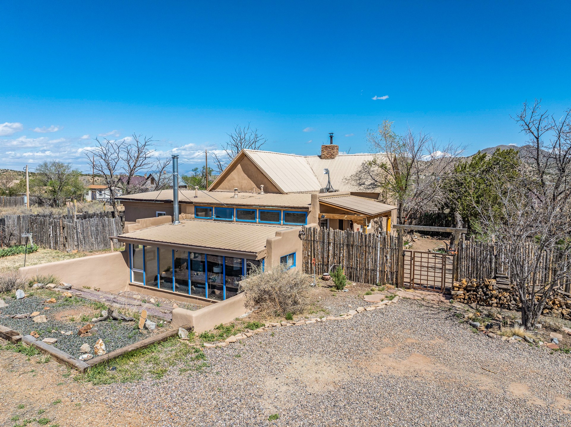 Old West charm abounds in this light filled home just outside of Cerrillos. The original parts of the building are believed to date to 1900, and many vintage details remain intact, including the wood floors and high, stamped metal ceilings. A lower level addition with banks of south facing windows brings in light and solar gain in winter, while mini-splits cool in summer. Outdoor spaces are well delineated, with mature plantings, a pleasant fenced patio space, and an old stone building has been used as a studio. A chicken coop, not currently occupied, doubles as a storage space. Less than a minute from the pavement, and on community water, the home is within walking distance of Cerrillos or a quick drive from Santa Fe.
