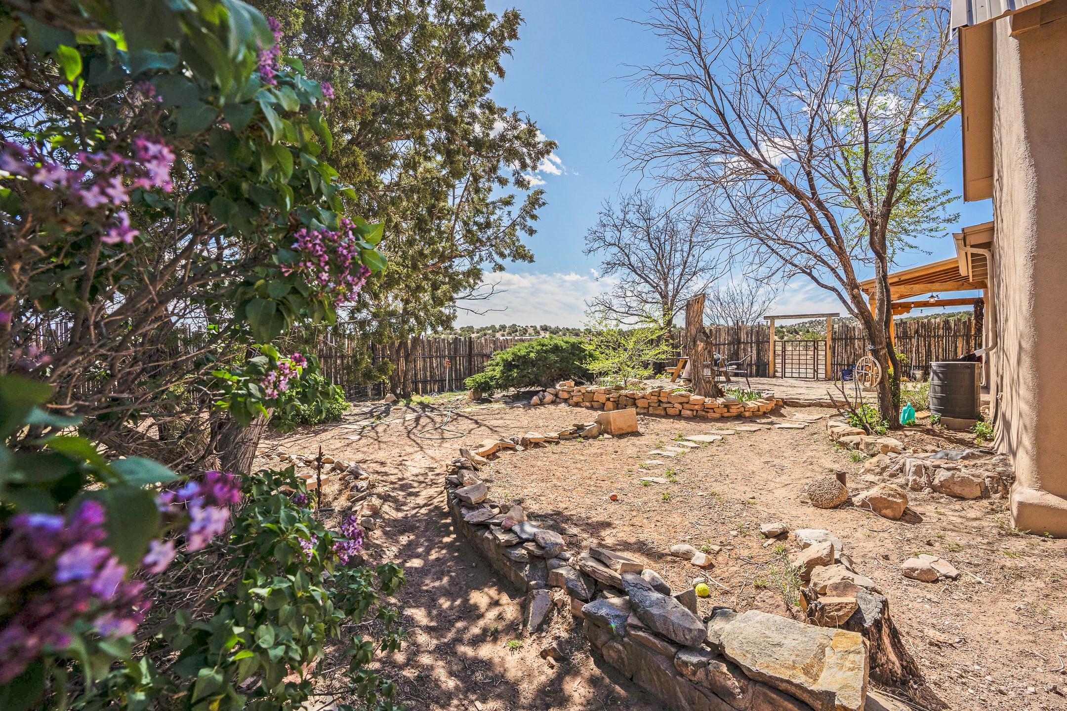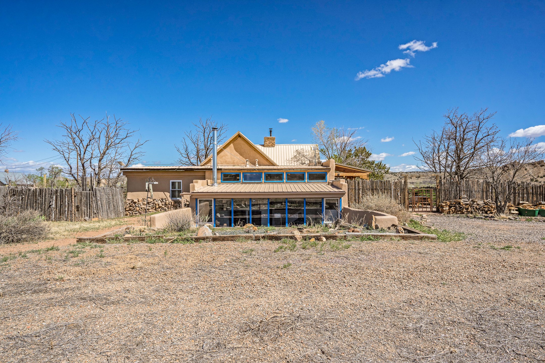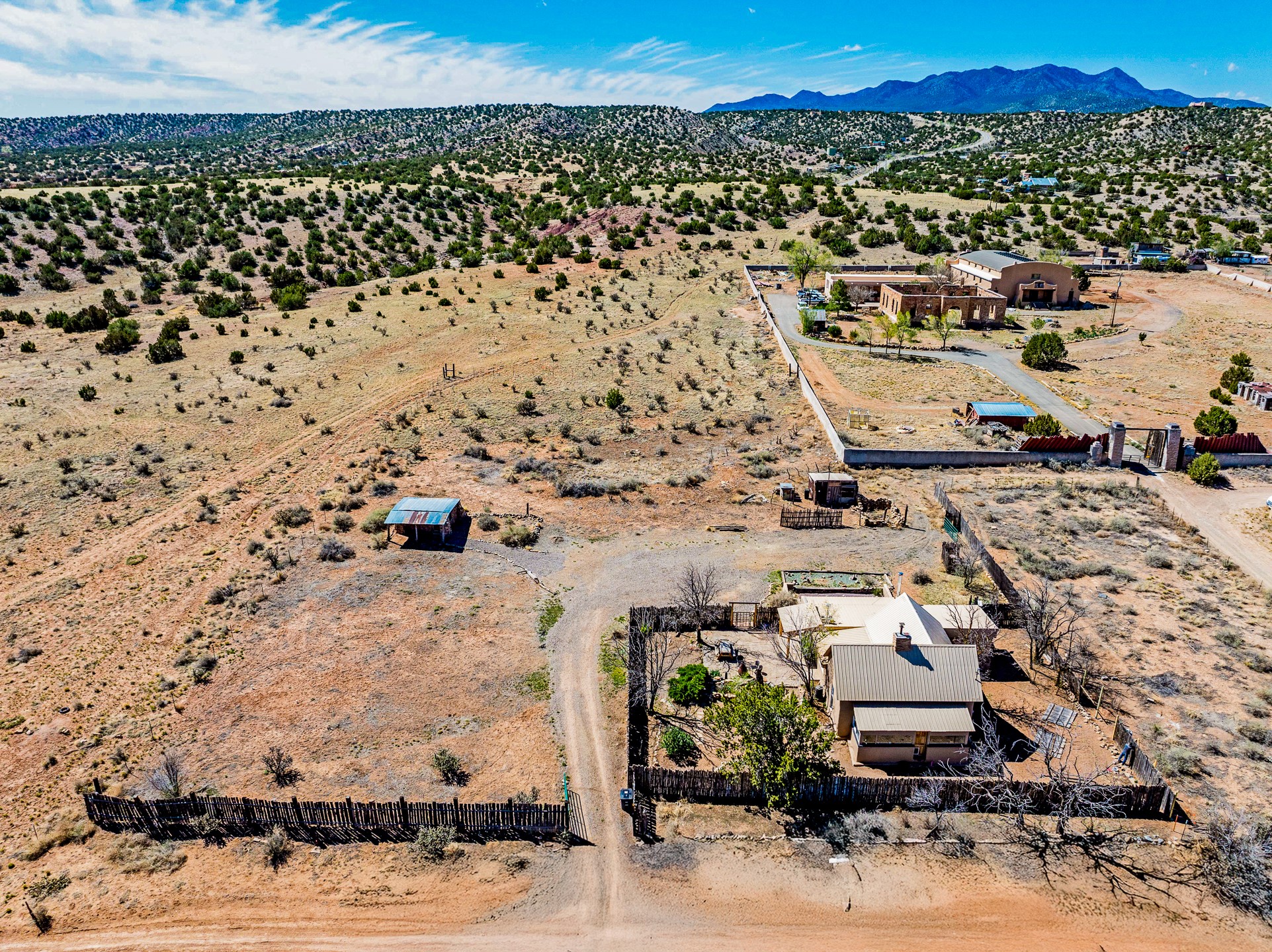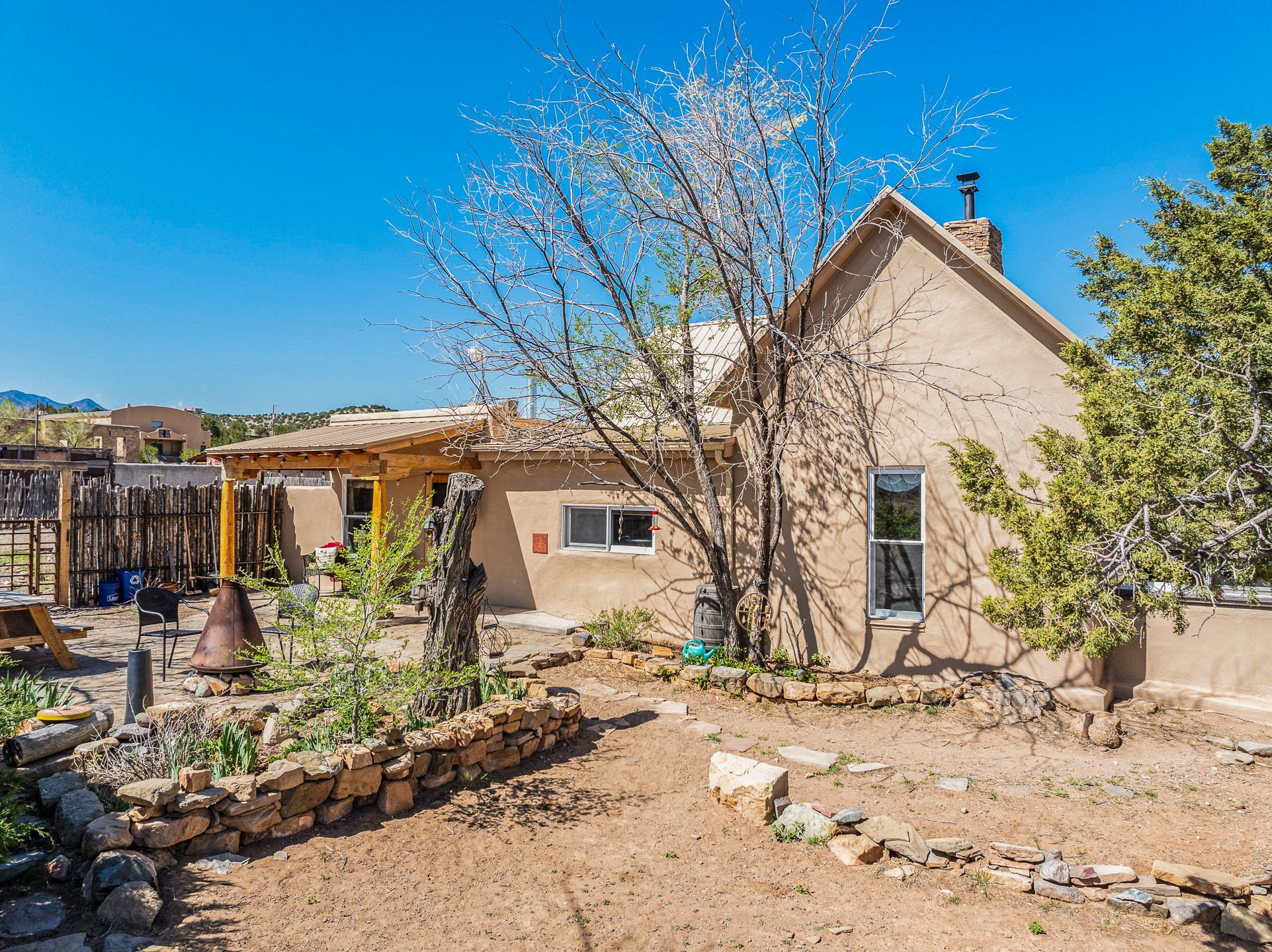 Old West charm abounds in this light filled home just outside of Cerrillos. The original parts of the building are believed to date to 1900, and many vintage details remain intact, including the wood floors and high, stamped metal ceilings. A lower level addition with banks of south facing windows brings in light and solar gain in winter, while mini-splits cool in summer. Outdoor spaces are well delineated, with mature plantings, a pleasant fenced patio space, and an old stone building has been used as a studio. A chicken coop, not currently occupied, doubles as a storage space. Less than a minute from the pavement, and on community water, the home is within walking distance of Cerrillos or a quick drive from Santa Fe.