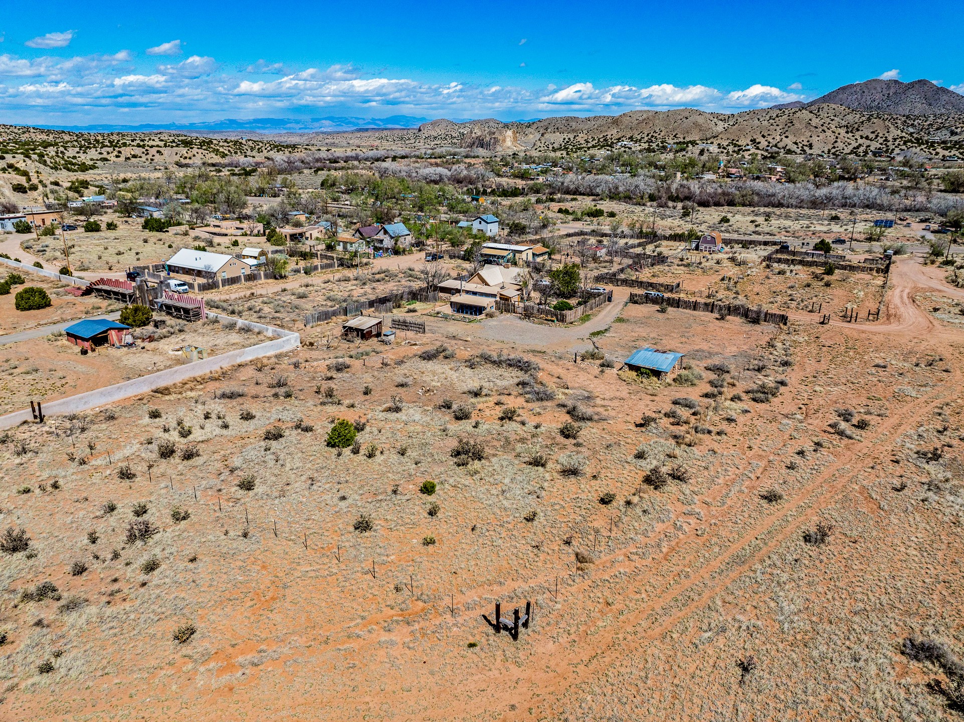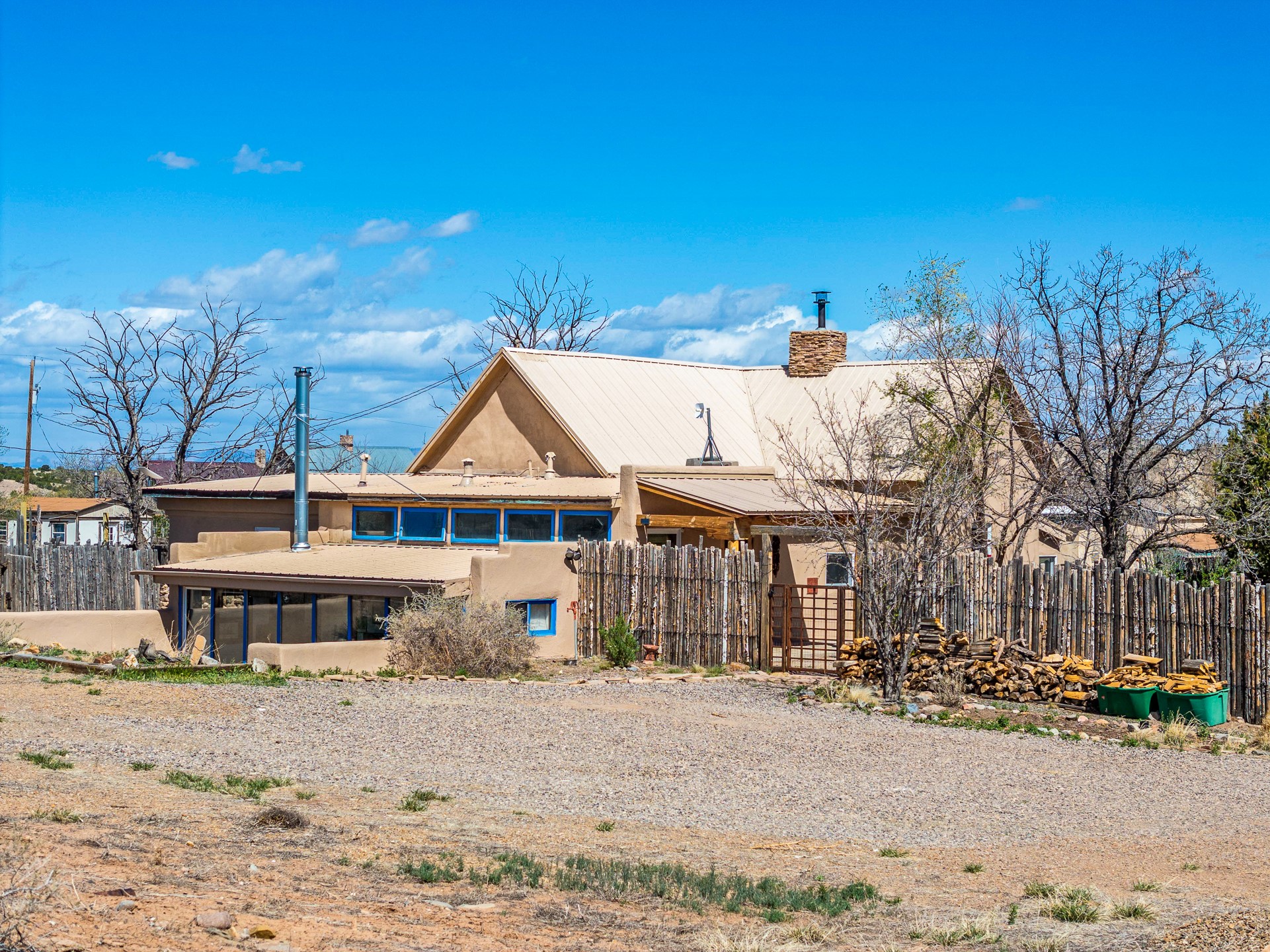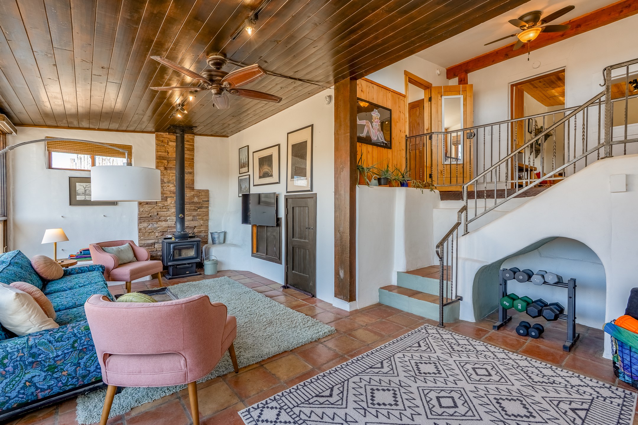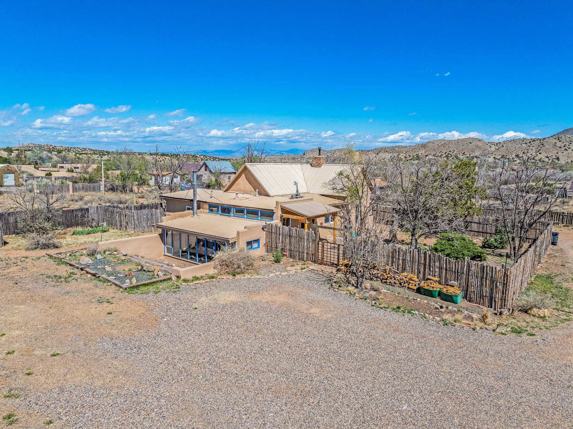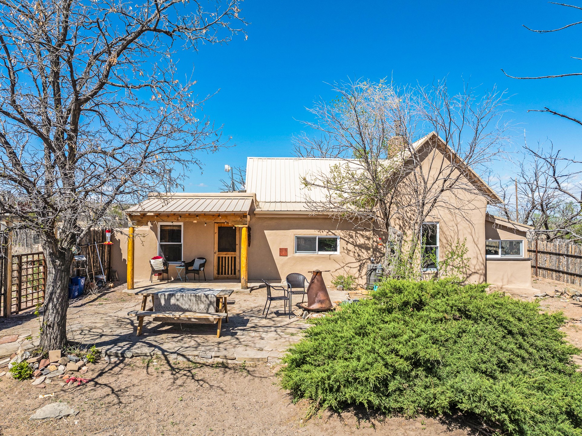 Old West charm abounds in this light filled home just outside of Cerrillos. The original parts of the building are believed to date to 1900, and many vintage details remain intact, including the wood floors and high, stamped metal ceilings. A lower level addition with banks of south facing windows brings in light and solar gain in winter, while mini-splits cool in summer. Outdoor spaces are well delineated, with mature plantings, a pleasant fenced patio space, and an old stone building has been used as a studio. A chicken coop, not currently occupied, doubles as a storage space. Less than a minute from the pavement, and on community water, the home is within walking distance of Cerrillos or a quick drive from Santa Fe.