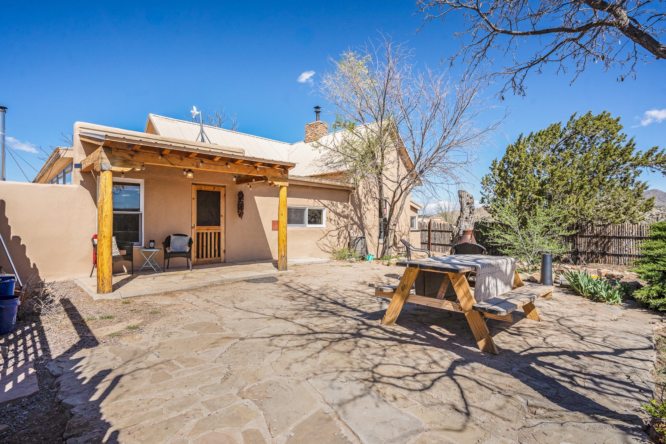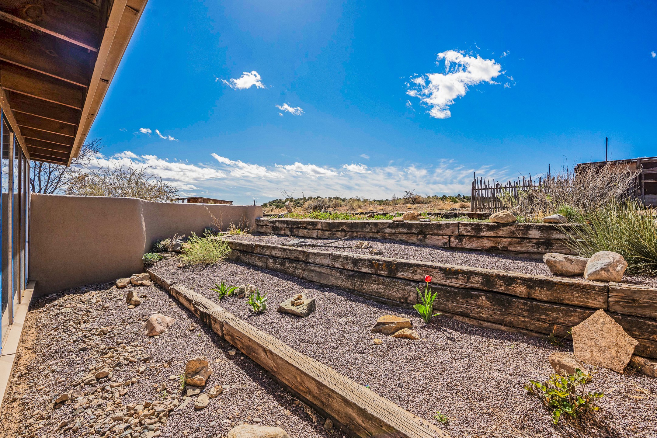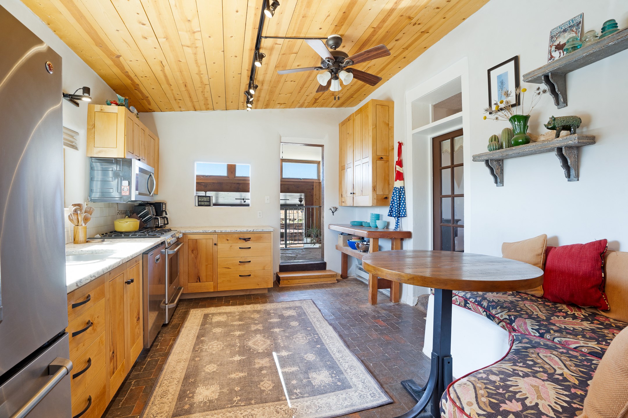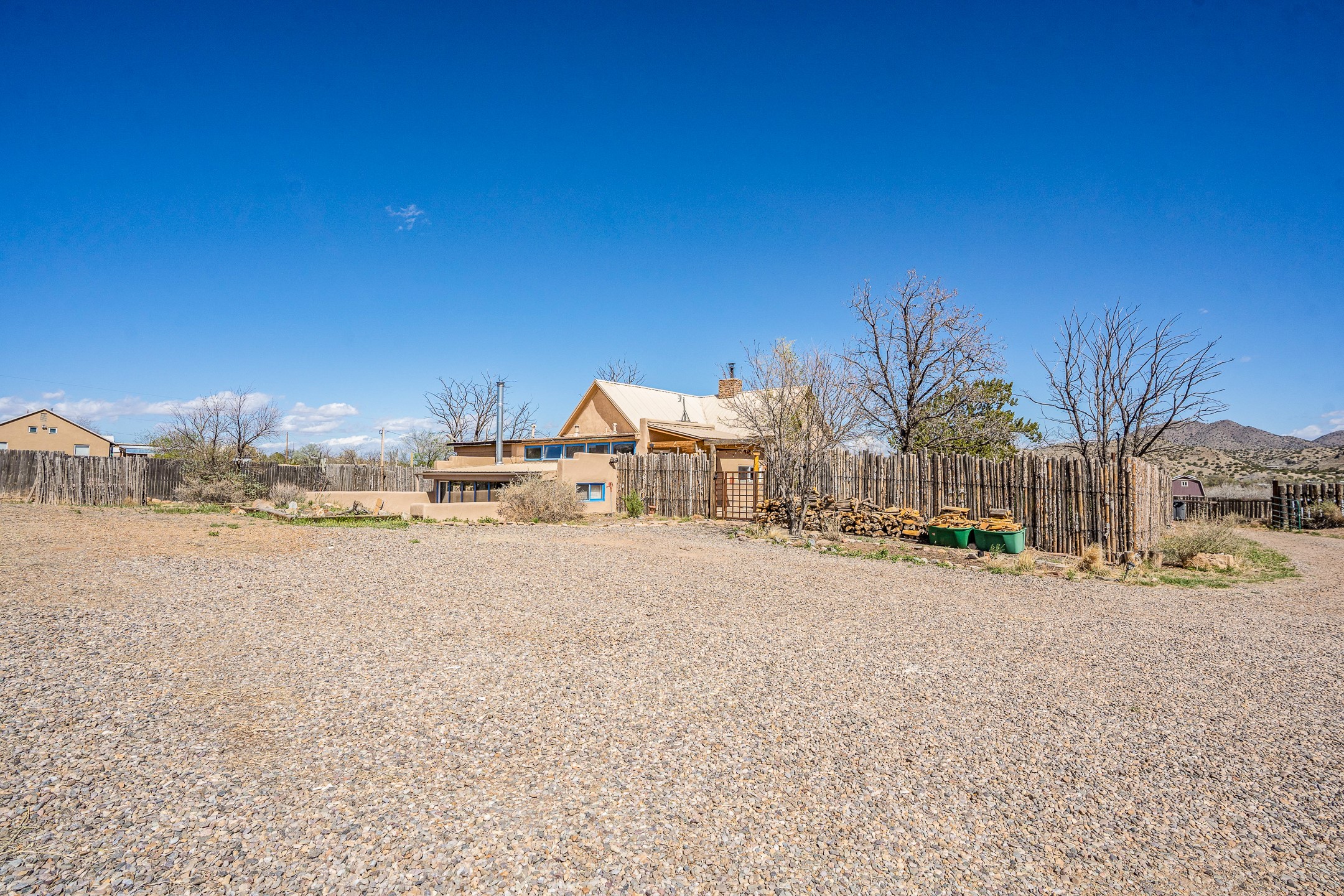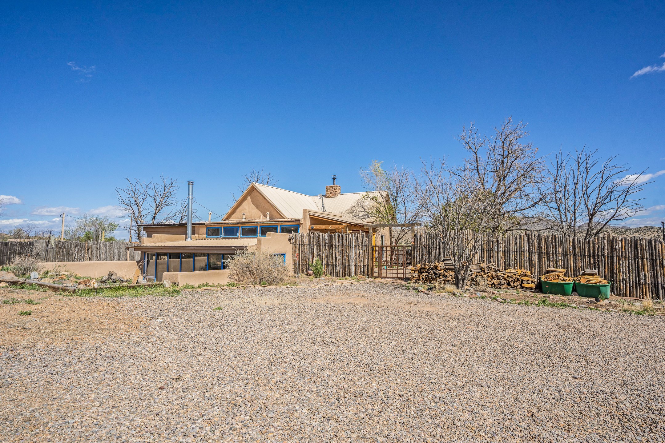 Old West charm abounds in this light filled home just outside of Cerrillos. The original parts of the building are believed to date to 1900, and many vintage details remain intact, including the wood floors and high, stamped metal ceilings. A lower level addition with banks of south facing windows brings in light and solar gain in winter, while mini-splits cool in summer. Outdoor spaces are well delineated, with mature plantings, a pleasant fenced patio space, and an old stone building has been used as a studio. A chicken coop, not currently occupied, doubles as a storage space. Less than a minute from the pavement, and on community water, the home is within walking distance of Cerrillos or a quick drive from Santa Fe.