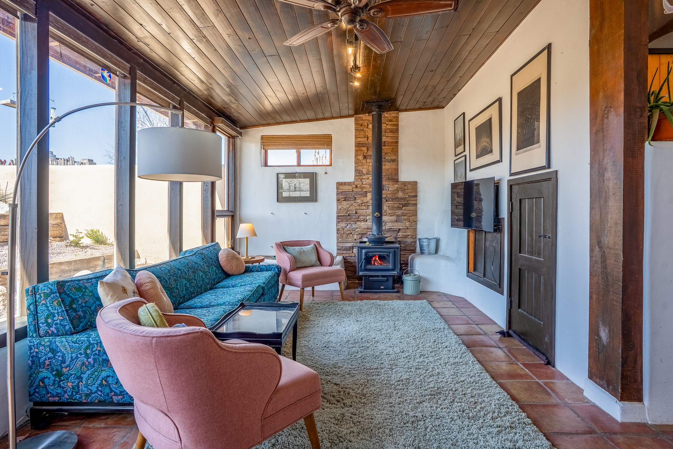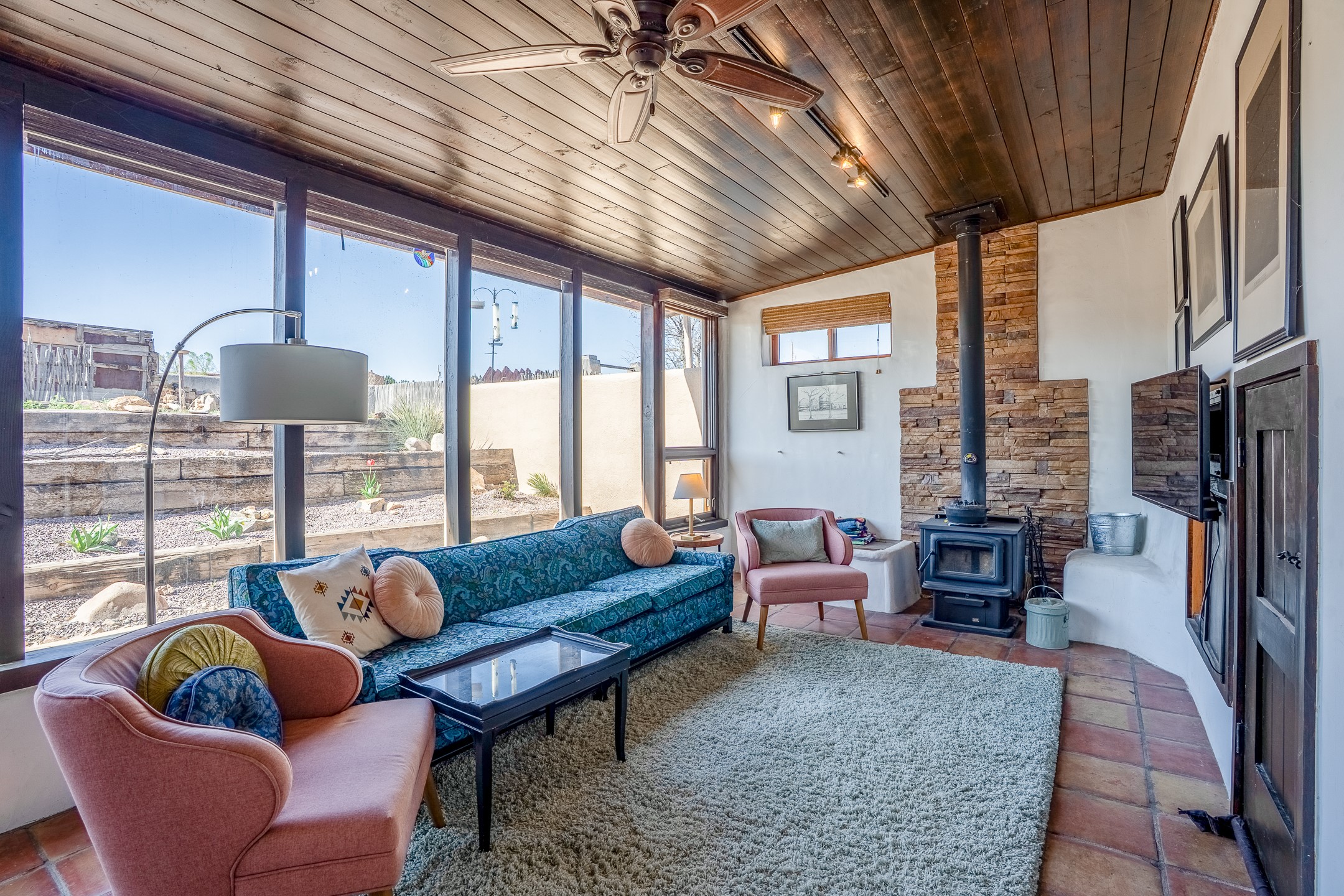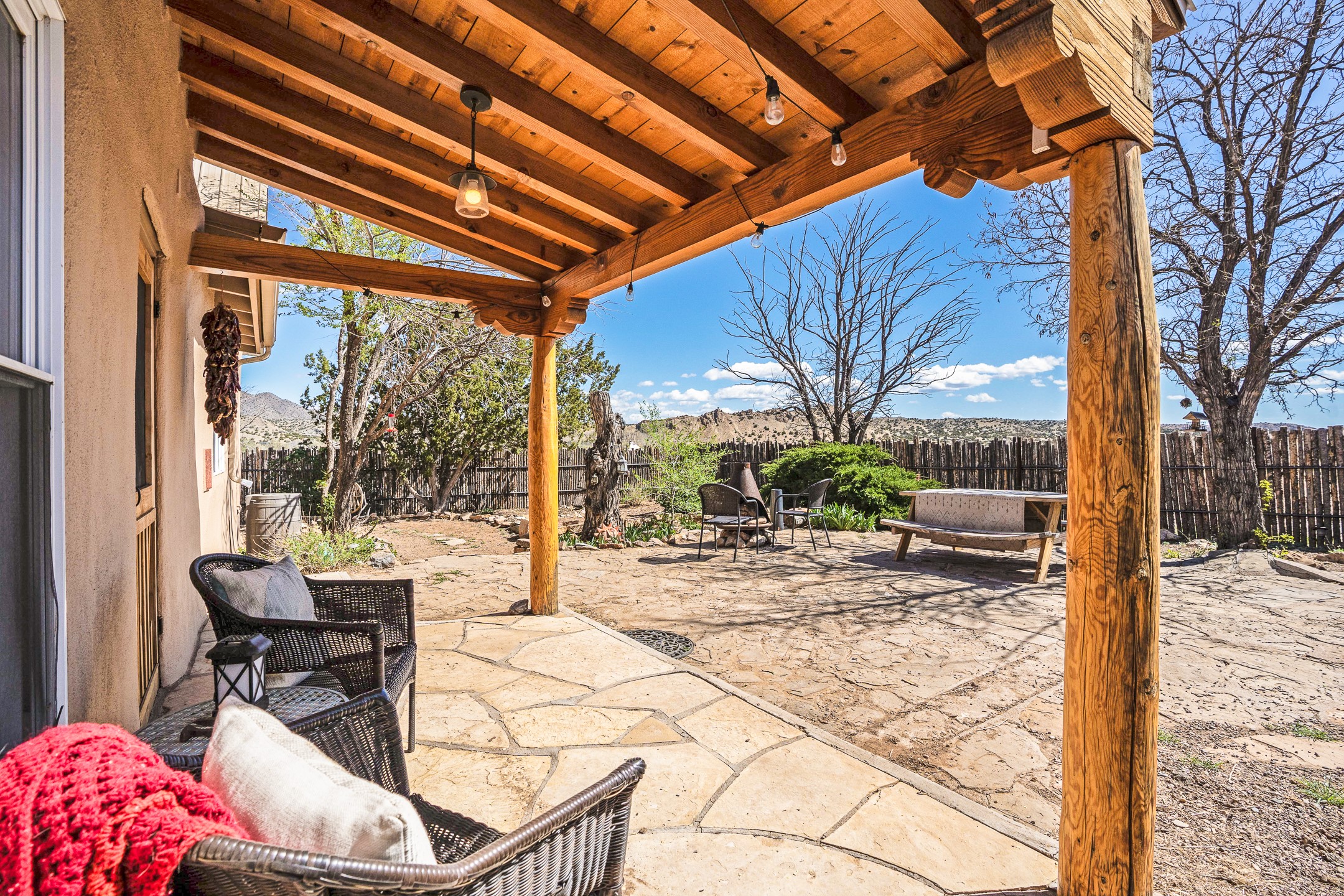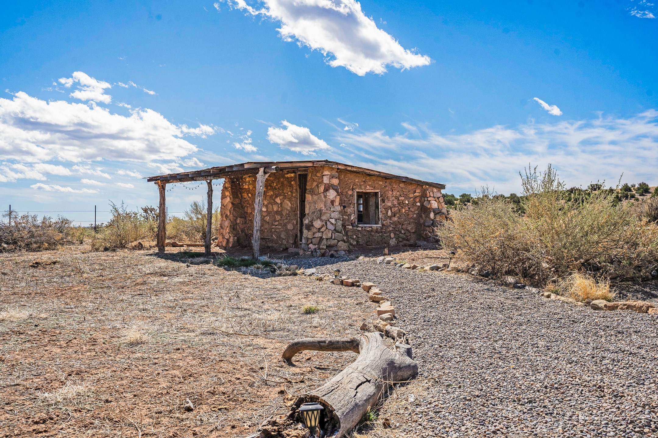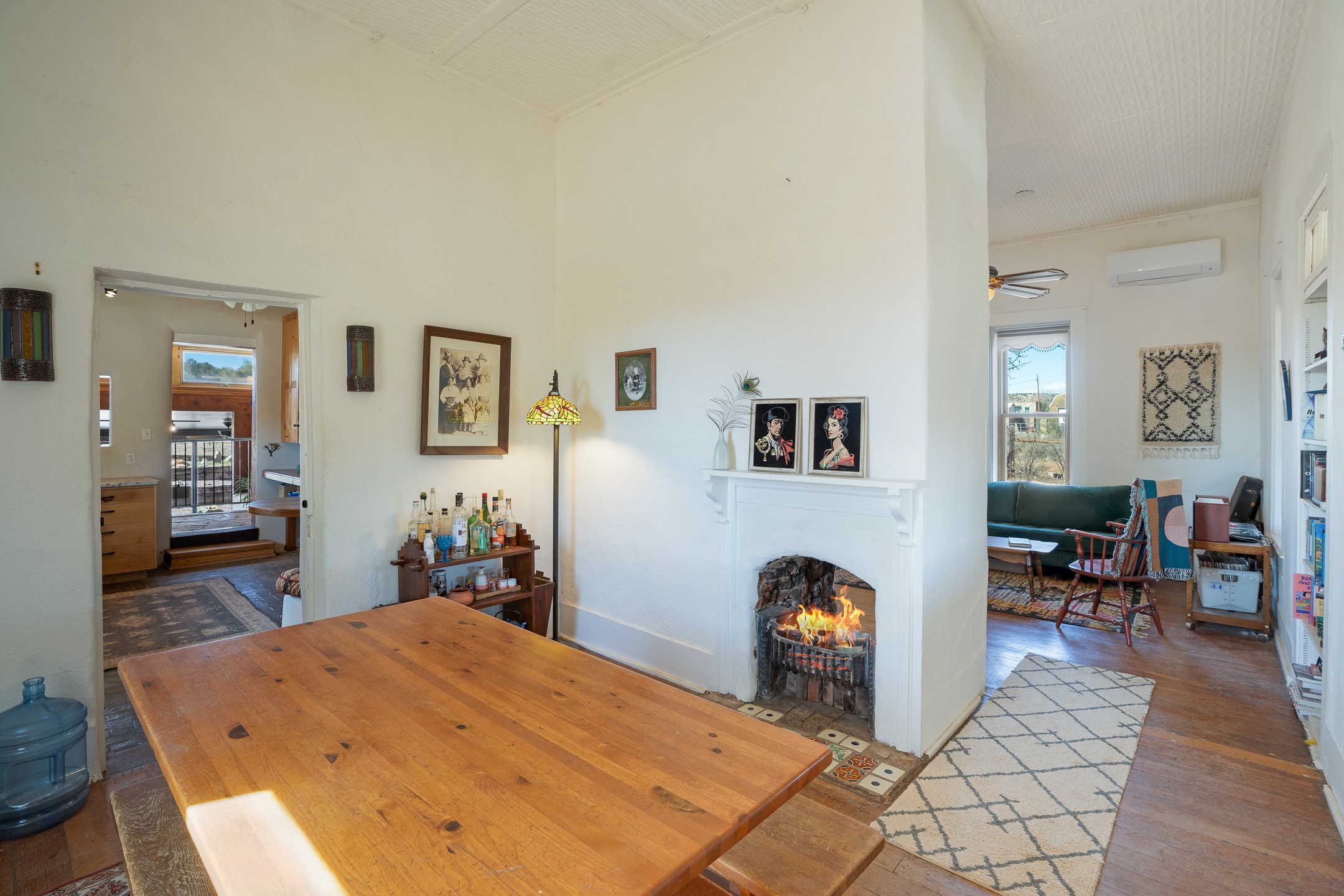 Old West charm abounds in this light filled home just outside of Cerrillos. The original parts of the building are believed to date to 1900, and many vintage details remain intact, including the wood floors and high, stamped metal ceilings. A lower level addition with banks of south facing windows brings in light and solar gain in winter, while mini-splits cool in summer. Outdoor spaces are well delineated, with mature plantings, a pleasant fenced patio space, and an old stone building has been used as a studio. A chicken coop, not currently occupied, doubles as a storage space. Less than a minute from the pavement, and on community water, the home is within walking distance of Cerrillos or a quick drive from Santa Fe.