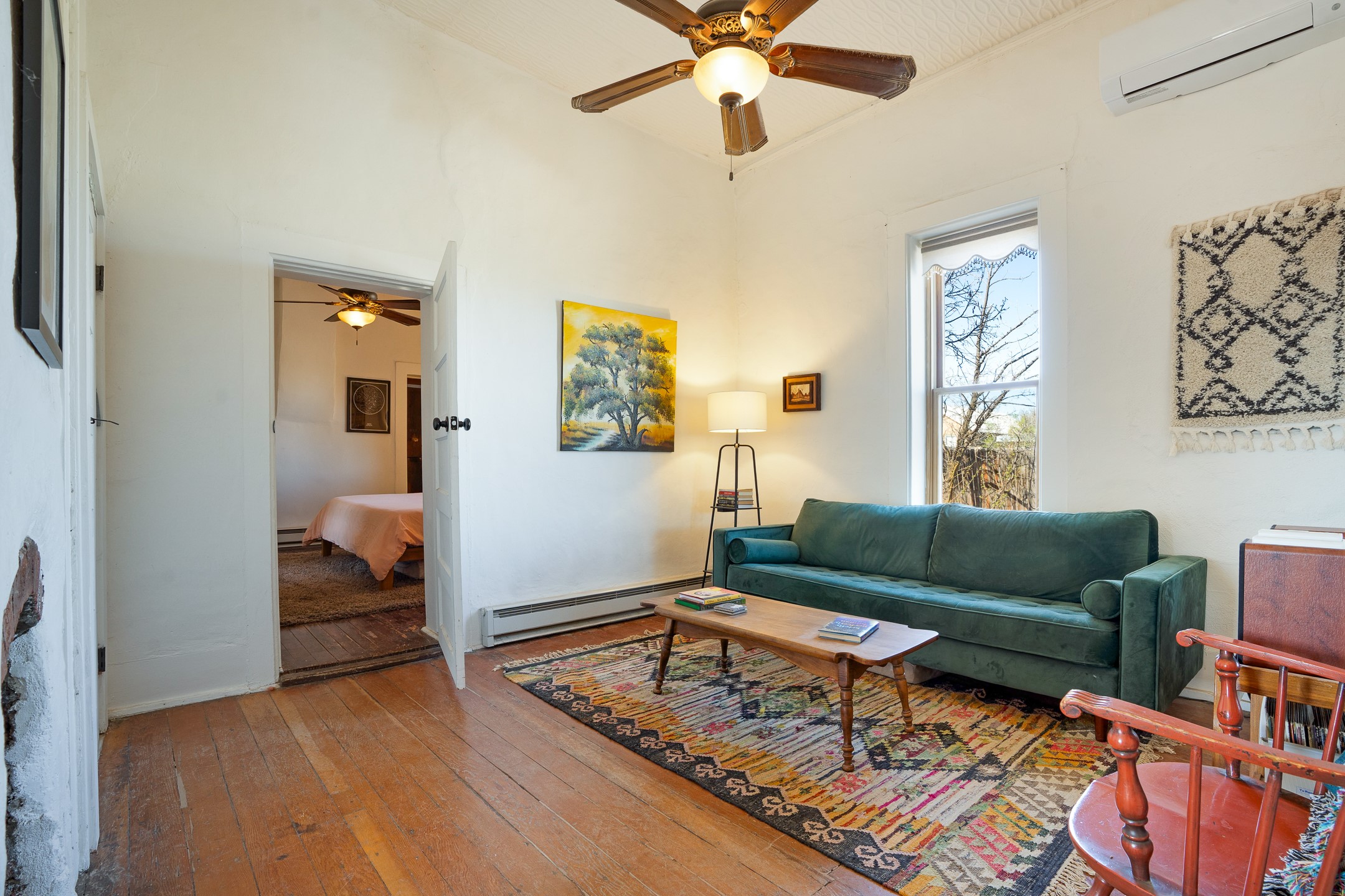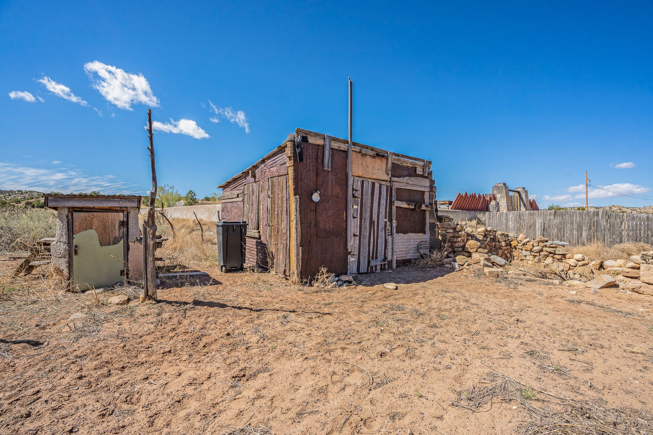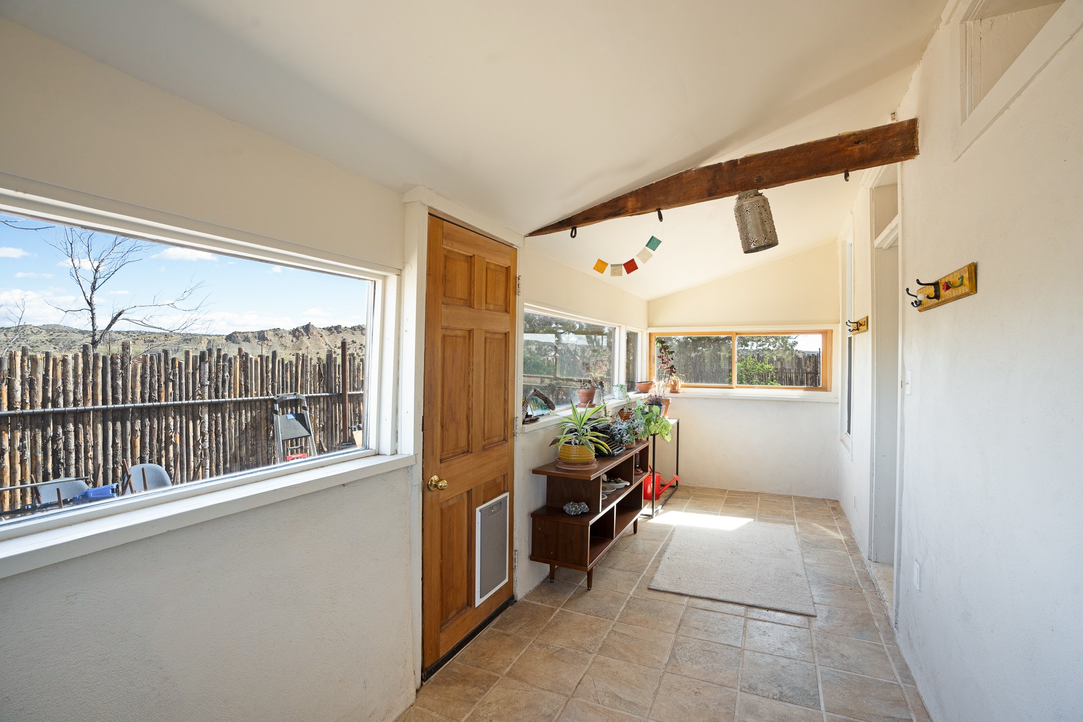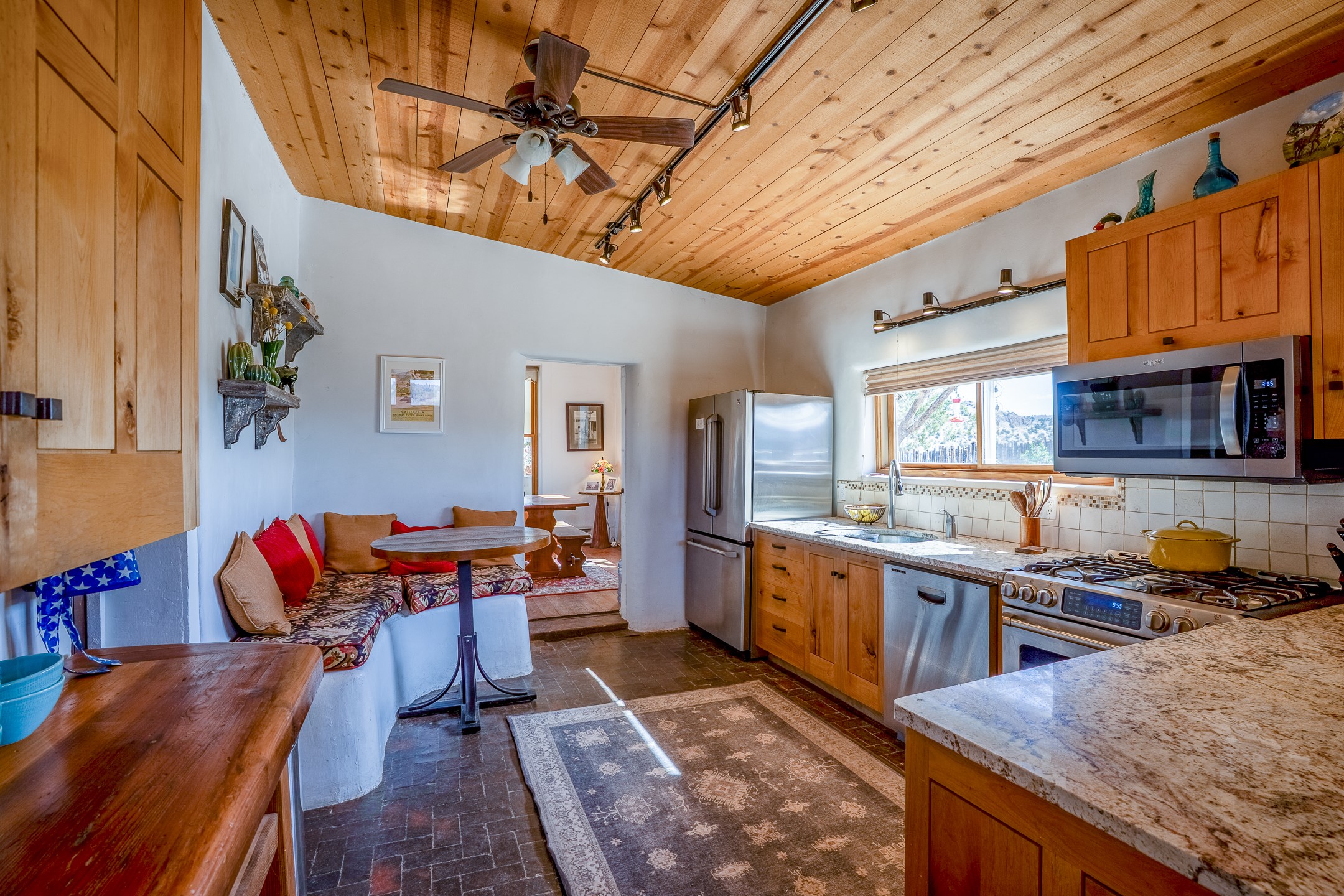 Old West charm abounds in this light filled home just outside of Cerrillos. The original parts of the building are believed to date to 1900, and many vintage details remain intact, including the wood floors and high, stamped metal ceilings. A lower level addition with banks of south facing windows brings in light and solar gain in winter, while mini-splits cool in summer. Outdoor spaces are well delineated, with mature plantings, a pleasant fenced patio space, and an old stone building has been used as a studio. A chicken coop, not currently occupied, doubles as a storage space. Less than a minute from the pavement, and on community water, the home is within walking distance of Cerrillos or a quick drive from Santa Fe.