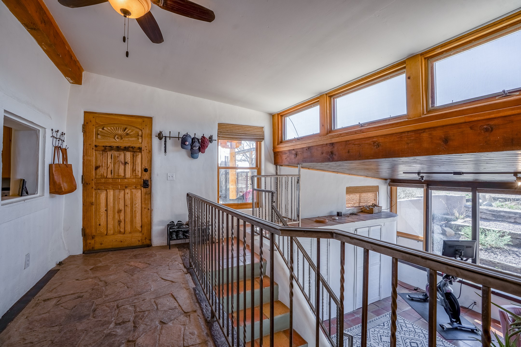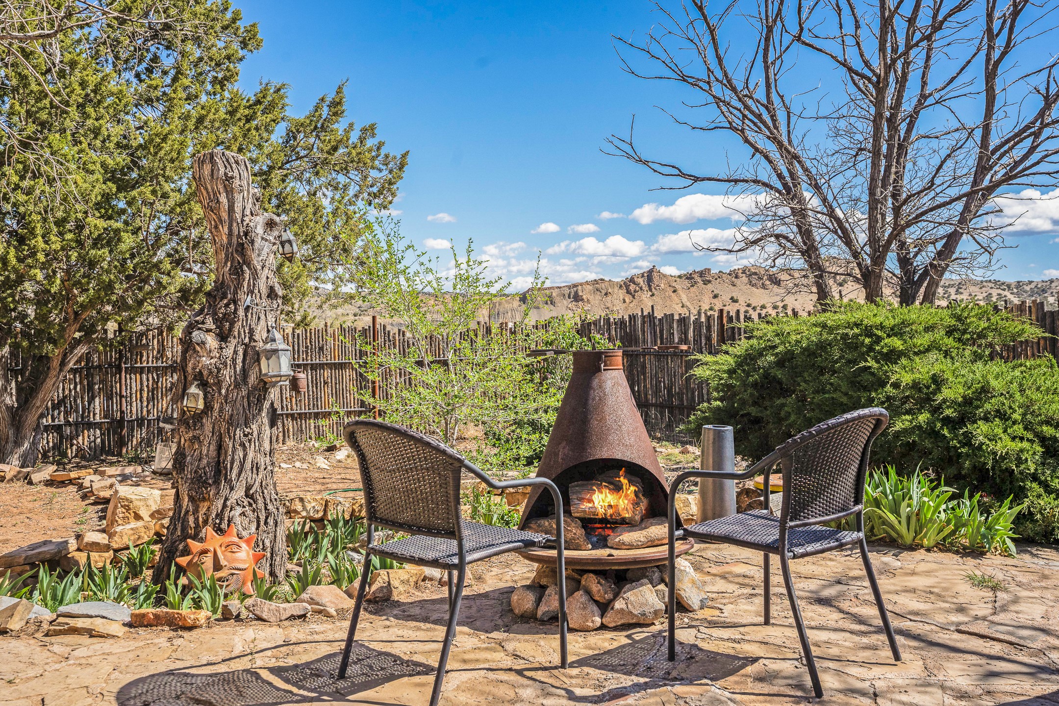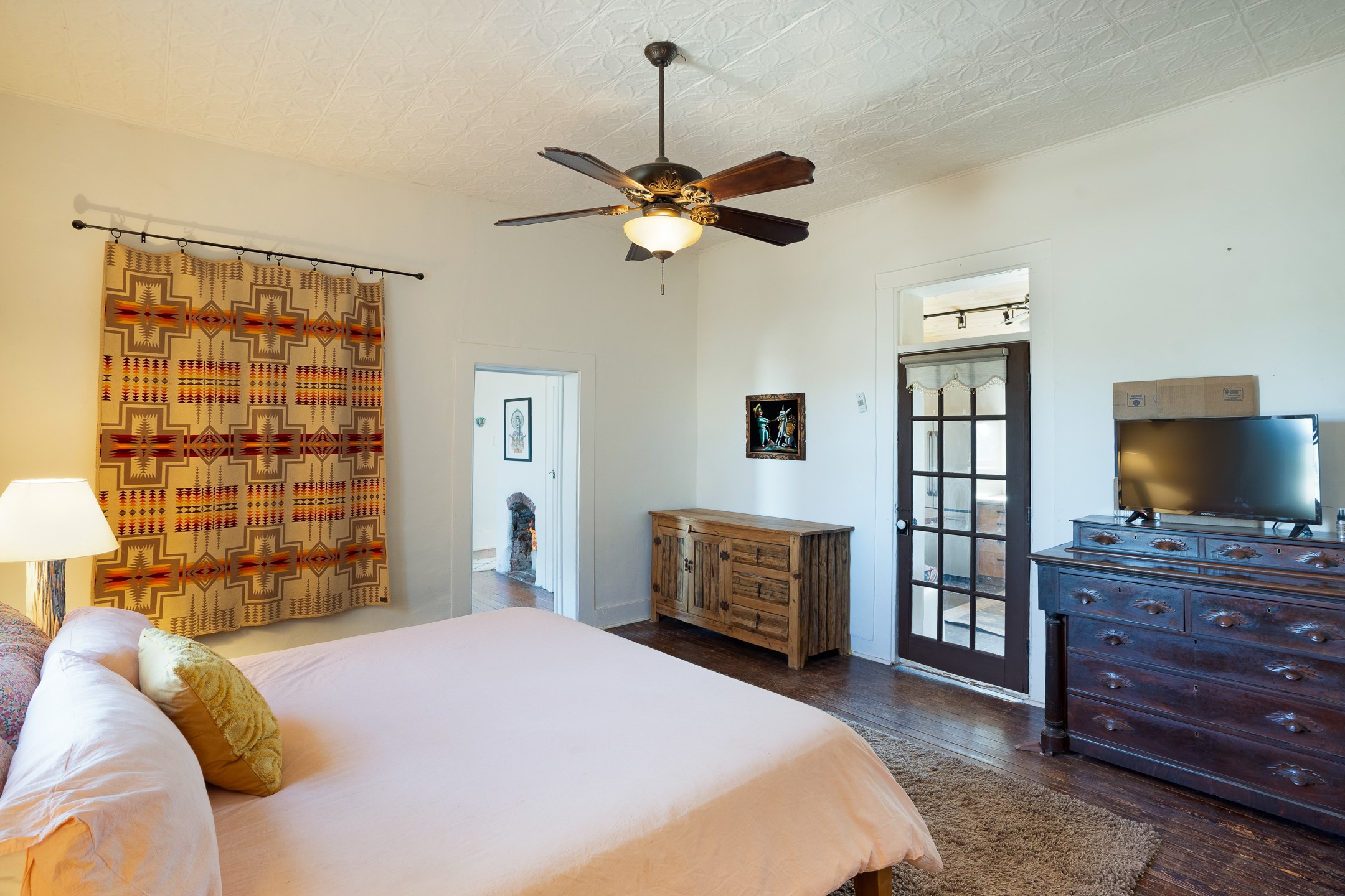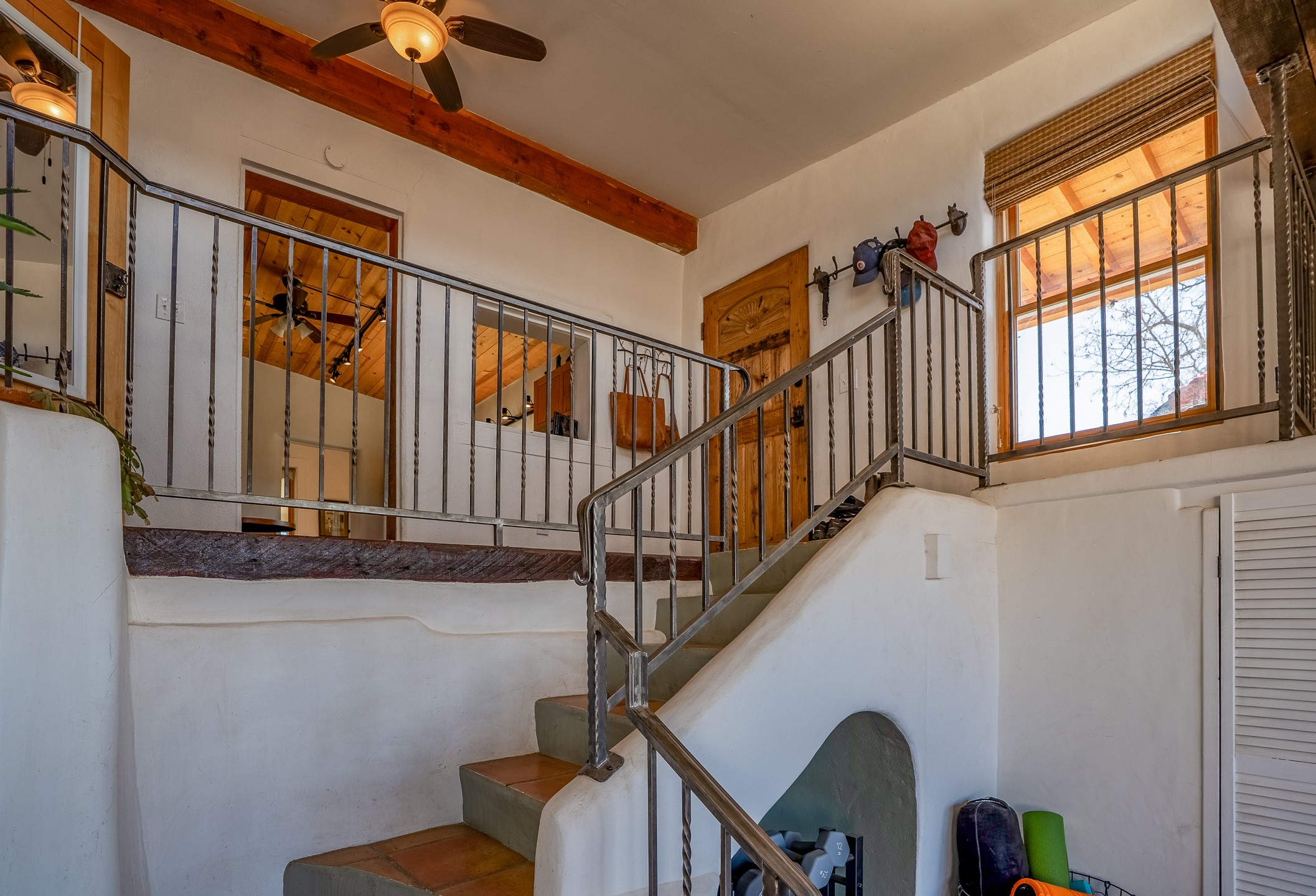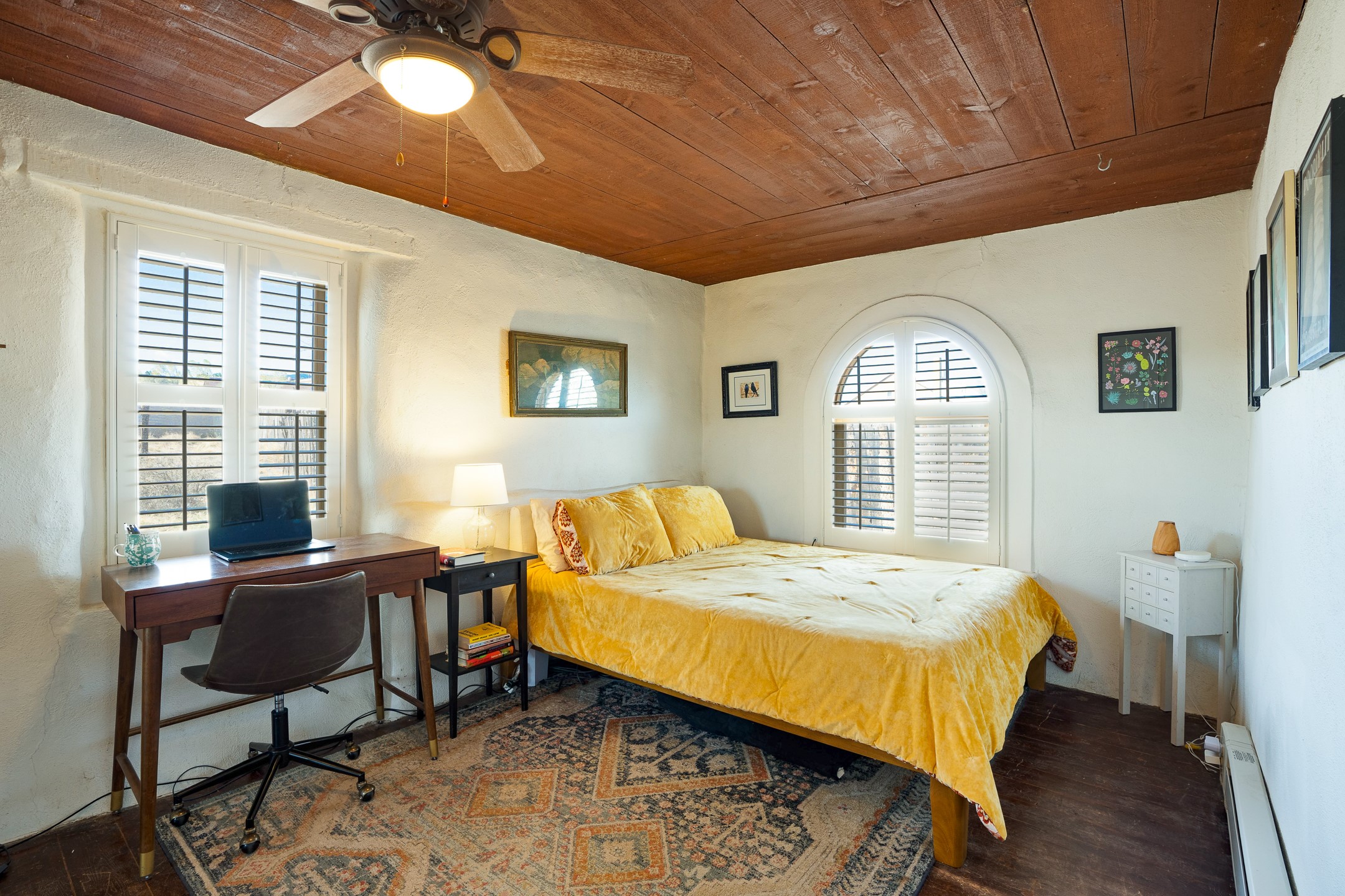 Old West charm abounds in this light filled home just outside of Cerrillos. The original parts of the building are believed to date to 1900, and many vintage details remain intact, including the wood floors and high, stamped metal ceilings. A lower level addition with banks of south facing windows brings in light and solar gain in winter, while mini-splits cool in summer. Outdoor spaces are well delineated, with mature plantings, a pleasant fenced patio space, and an old stone building has been used as a studio. A chicken coop, not currently occupied, doubles as a storage space. Less than a minute from the pavement, and on community water, the home is within walking distance of Cerrillos or a quick drive from Santa Fe.