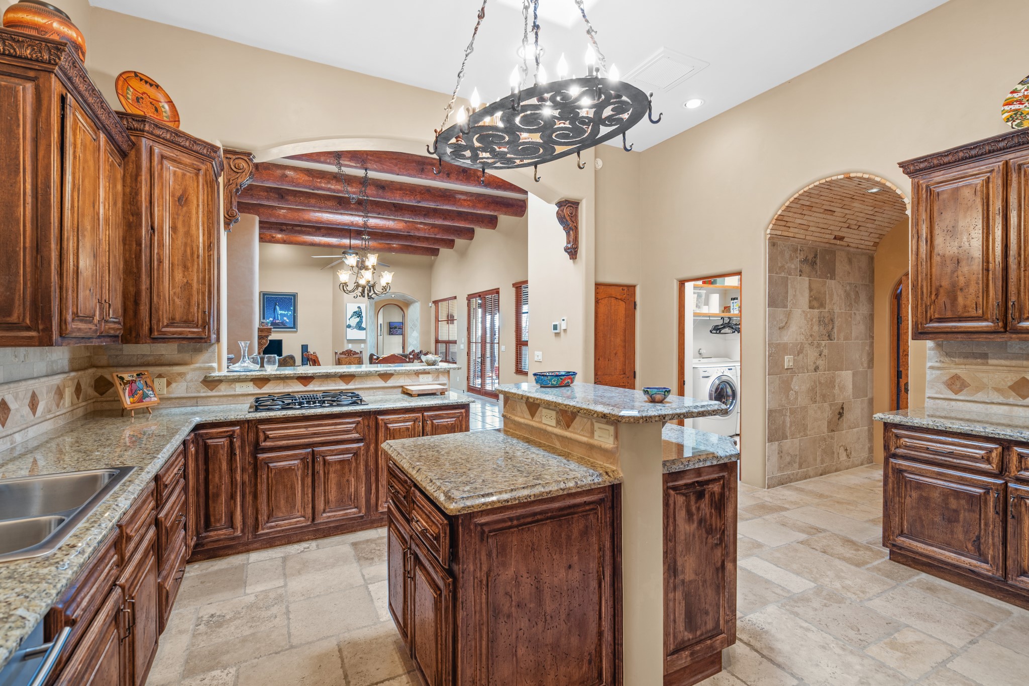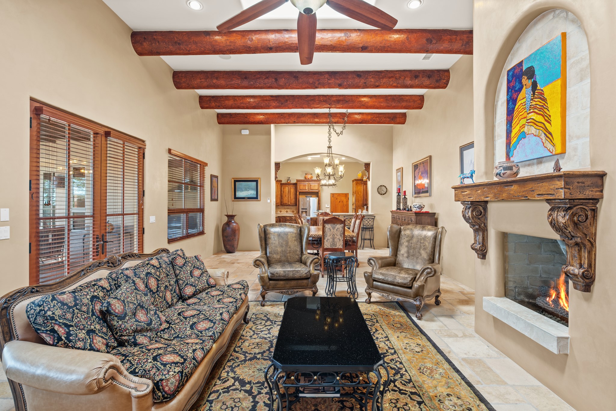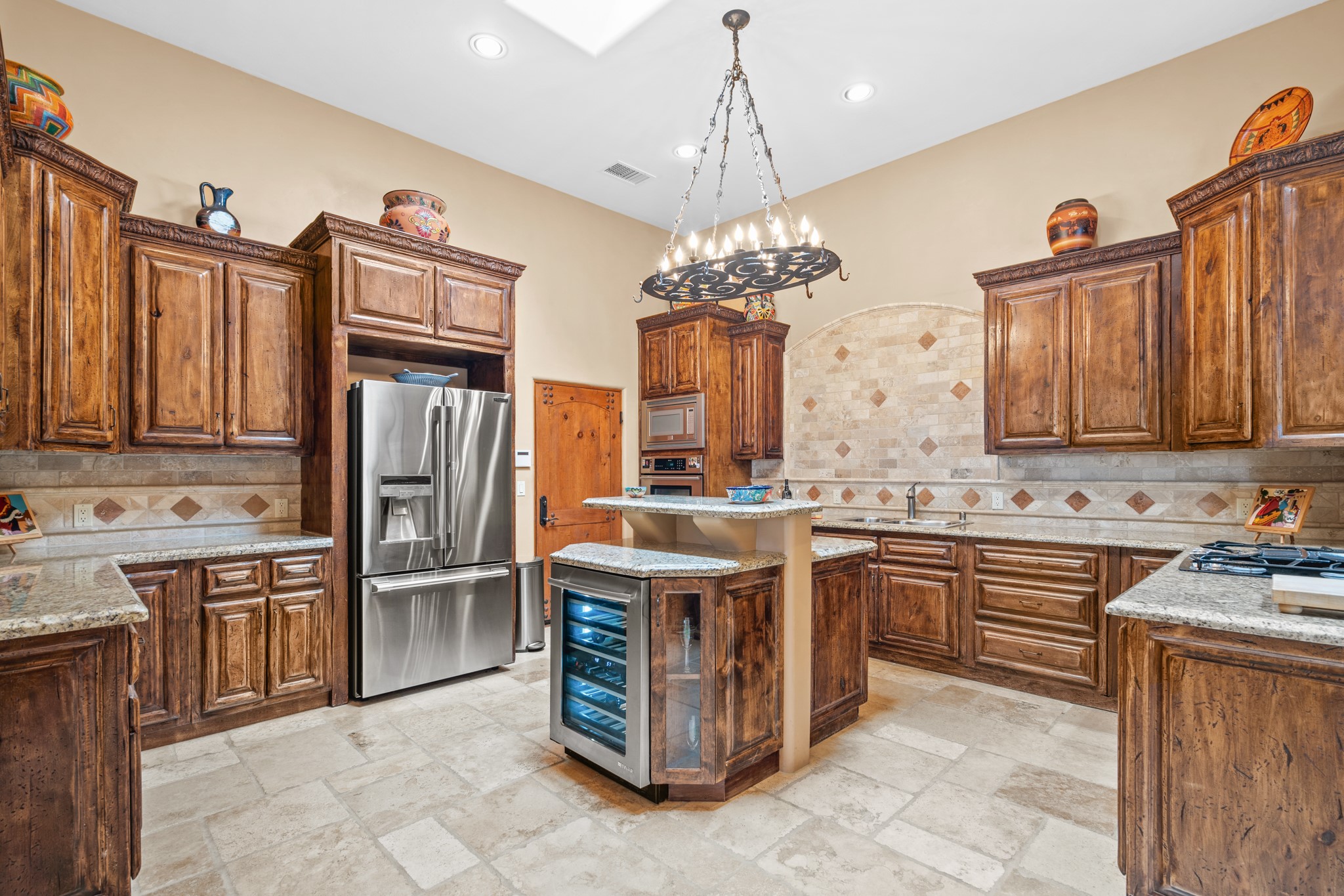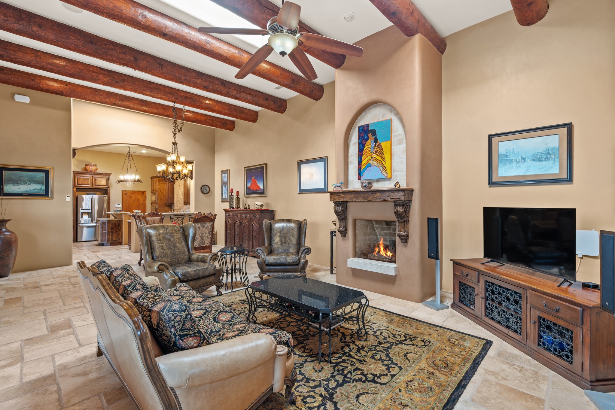 Discover this amazing single-level home with a detached guest house nestled in the serene community of Aldea. Located on a quiet cul-de-sac, this property welcomes you home with a charming enclosed courtyard and fountain, leading into a light-filled, open-concept floor plan that's perfect for both relaxing and entertaining. Enjoy breathtaking sunset views from the covered portals, or cozy up by one of the two gas fireplaces. The home features vaulted ceilings, beautiful travertine tile, and handcrafted wood doors and cabinetry imported from Mexico. The chef's kitchen is a dream, complete with a pantry, wine cooler, and plenty of space for culinary creativity. Each bedroom is ensuite with its own bathroom and walk-in closet, offering great separation and privacy. Just minutes from downtown, the neighborhood offers quiet charm, walking and hiking paths, a tennis court, a basketball court, and regular HOA-hosted events. With peaceful open spaces, wildlife, and a strong sense of community, this home truly has it all.