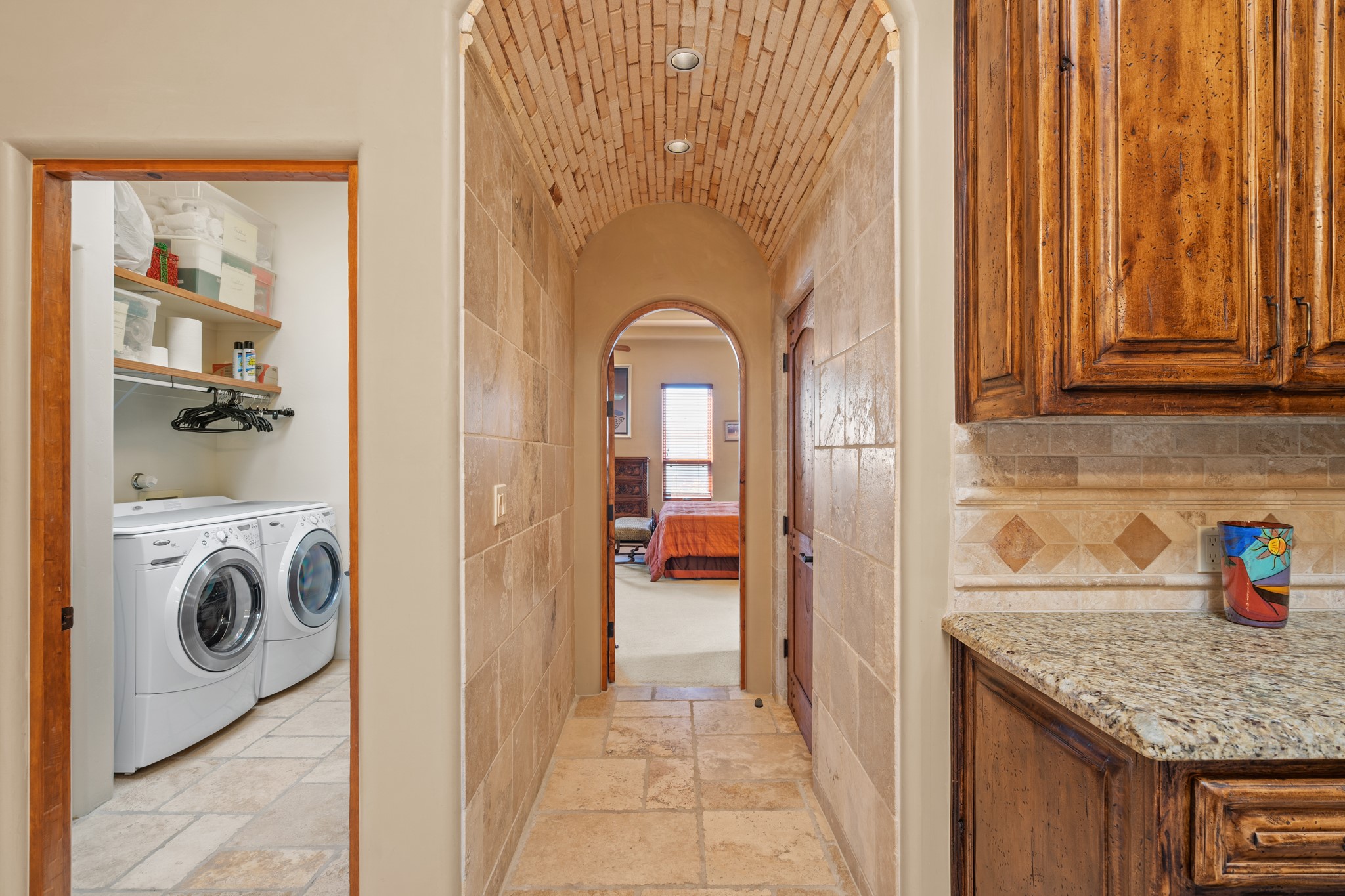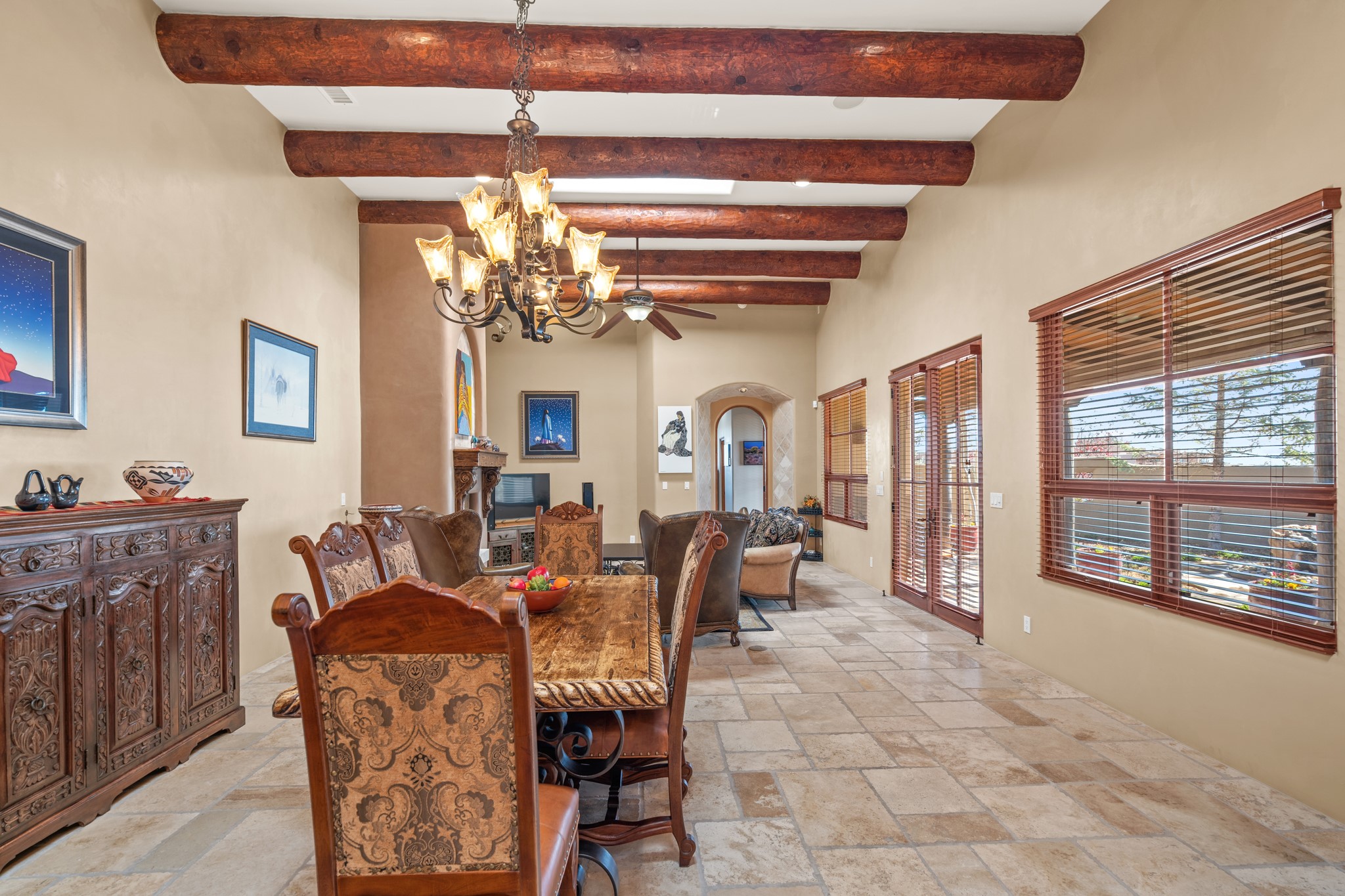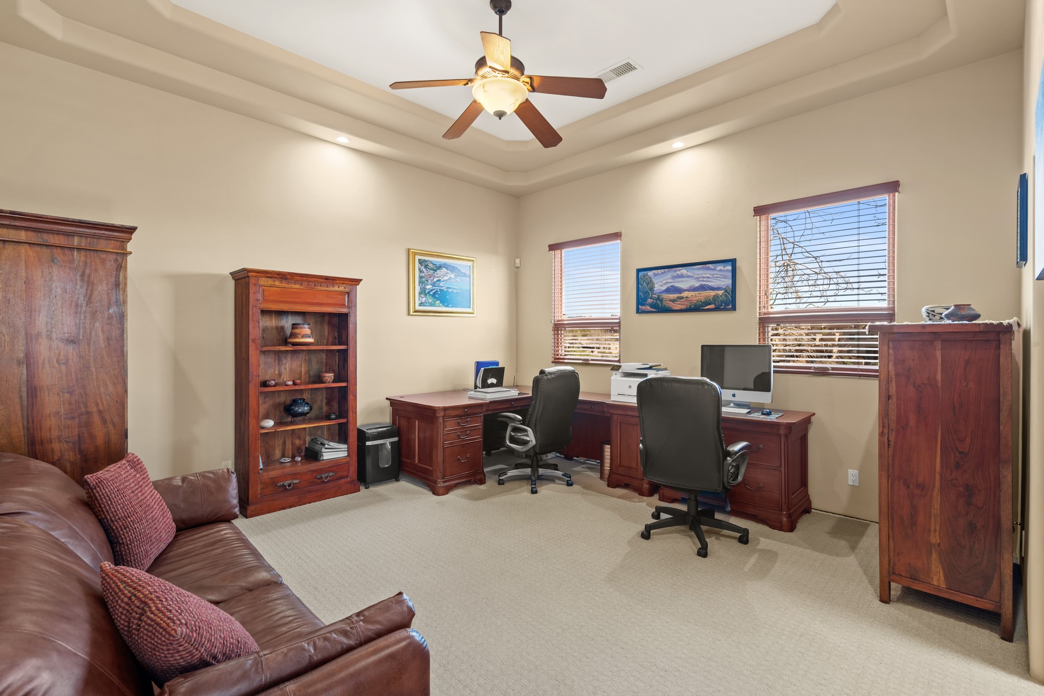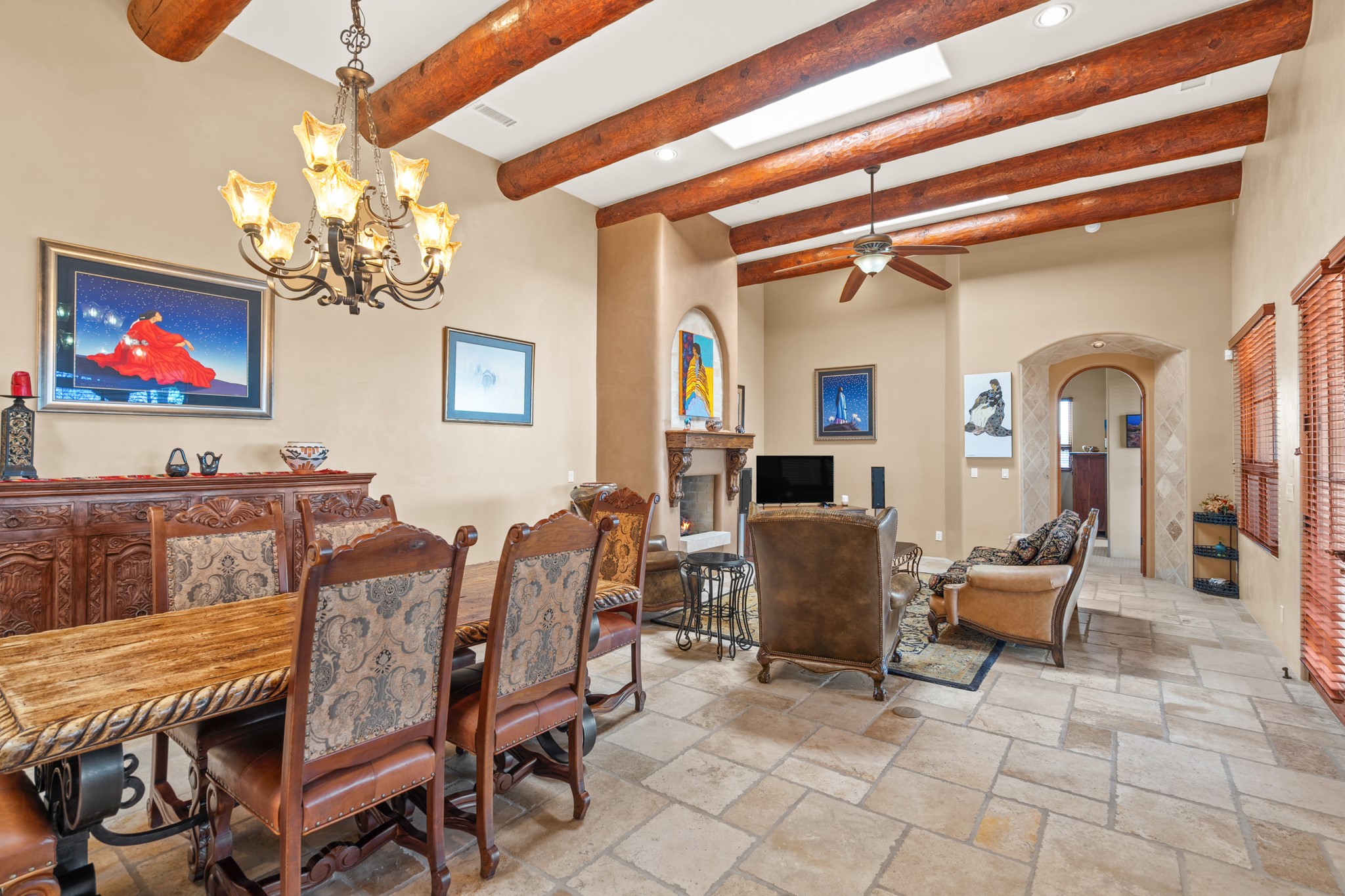 Discover this amazing single-level home with a detached guest house nestled in the serene community of Aldea. Located on a quiet cul-de-sac, this property welcomes you home with a charming enclosed courtyard and fountain, leading into a light-filled, open-concept floor plan that's perfect for both relaxing and entertaining. Enjoy breathtaking sunset views from the covered portals, or cozy up by one of the two gas fireplaces. The home features vaulted ceilings, beautiful travertine tile, and handcrafted wood doors and cabinetry imported from Mexico. The chef's kitchen is a dream, complete with a pantry, wine cooler, and plenty of space for culinary creativity. Each bedroom is ensuite with its own bathroom and walk-in closet, offering great separation and privacy. Just minutes from downtown, the neighborhood offers quiet charm, walking and hiking paths, a tennis court, a basketball court, and regular HOA-hosted events. With peaceful open spaces, wildlife, and a strong sense of community, this home truly has it all.