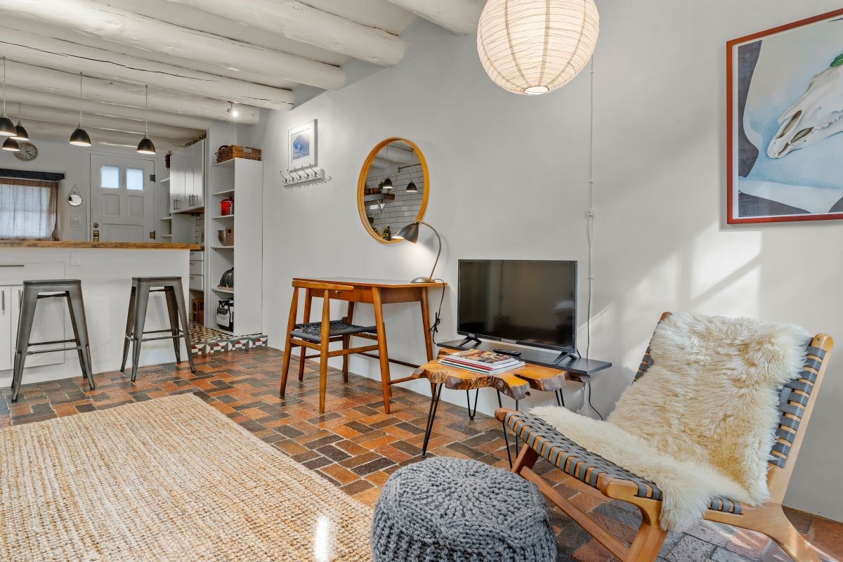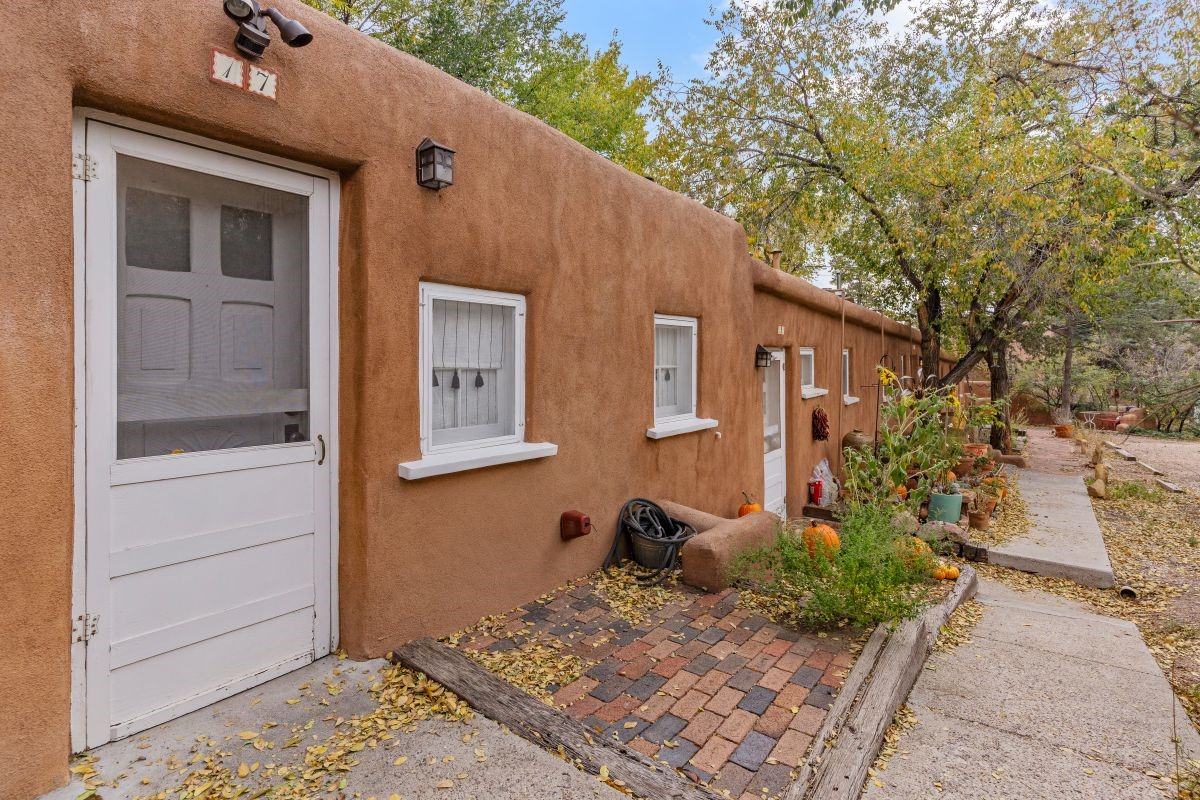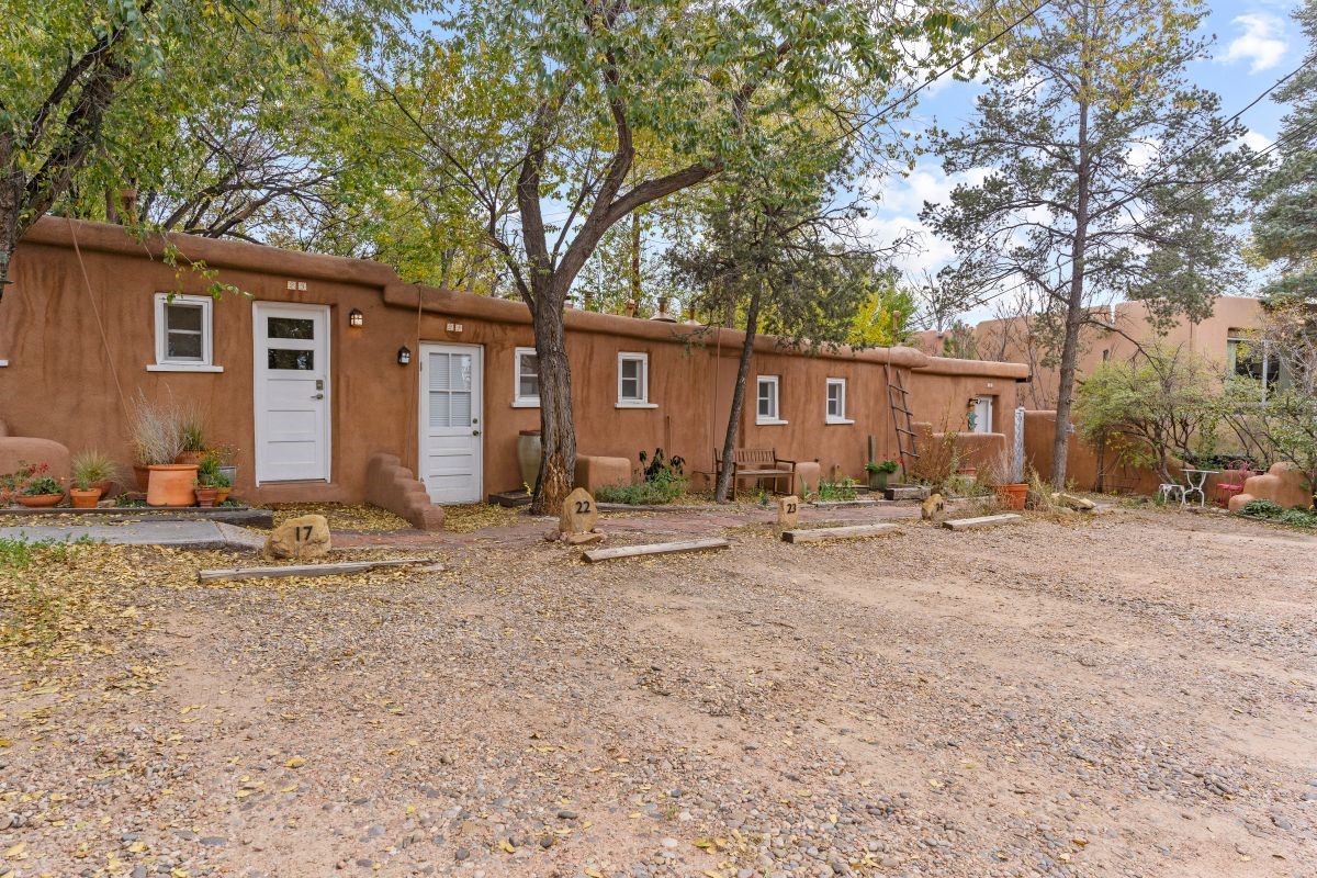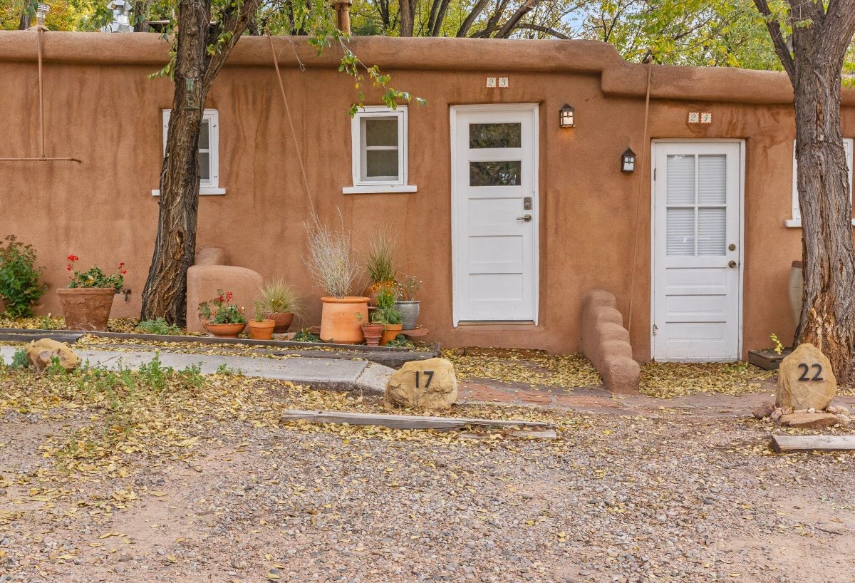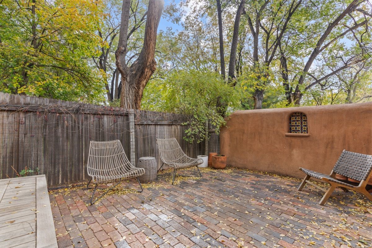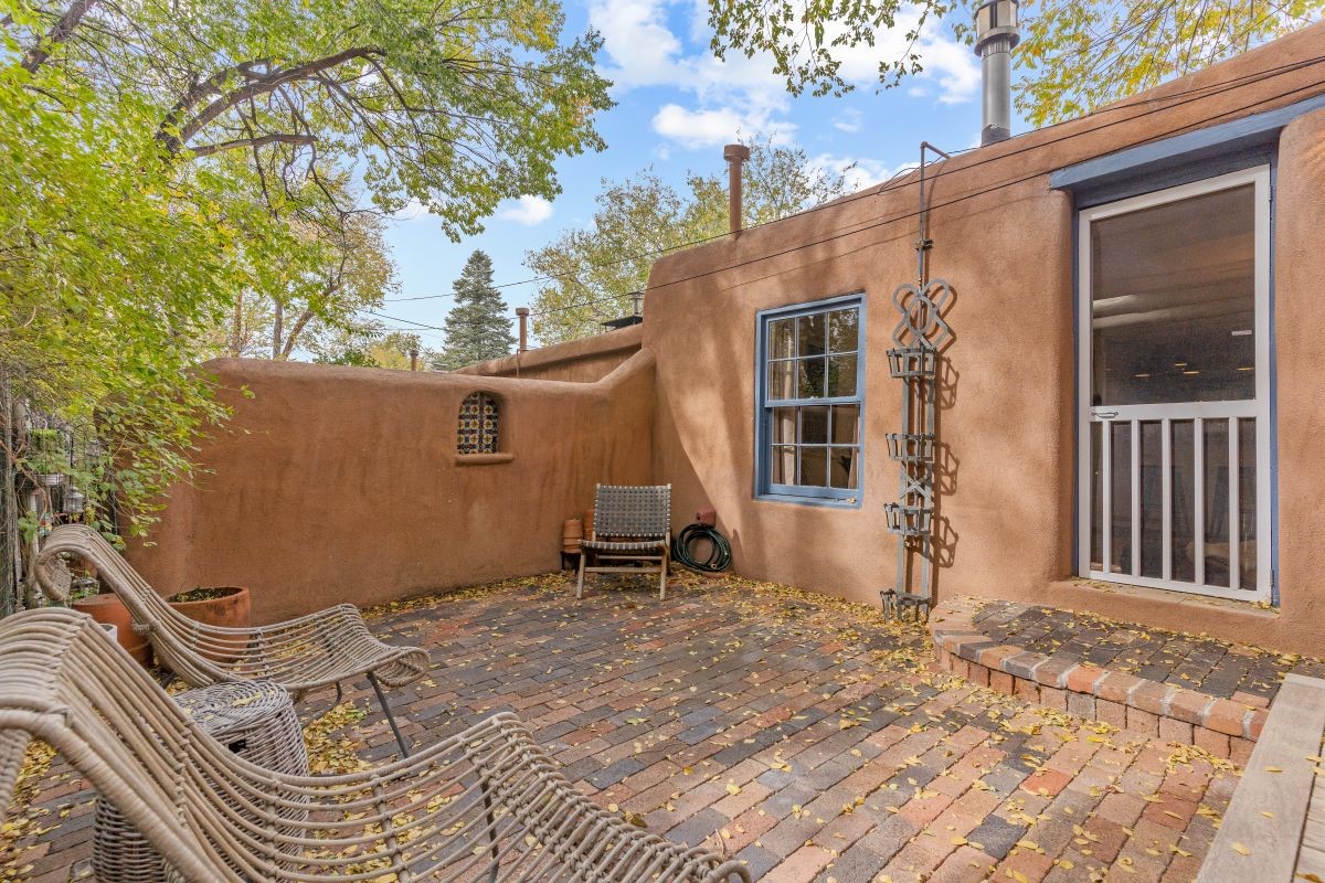 Rare charming historic adobe gem on one of Santa Fe's most adored streets, a stunning stroll to the downtown plaza. This renovated studio condo is sold fully furnished and its darling, with tile floors, viga ceilings, a gas fireplace that also heats, a fully equipped kitchen with half size fridge and dishwasher and high-end appliances. The bathroom is luxurious with a large shower, full size washer and drier. Enjoy the peace and tranquility of the shady private courtyard. The property is part of Santa Fe's rich history, a historic hideaway in the heart of old Santa Fe which was part of the original Webster Compound founded by Ann Webster in the 1930's for artists & writers. Legend has it that 54 books have been written and published including KON TIKI by Thor Heyerdahl at the compound. The condo is perfect as a residence, vacation rental, or artist's/writer's studio. Stroll over to the famed Canyon Rd with galleries and restaurants. Walk the block to Downtown Subscription for a fab coffee. The property has one step down from Kitchen to main area
