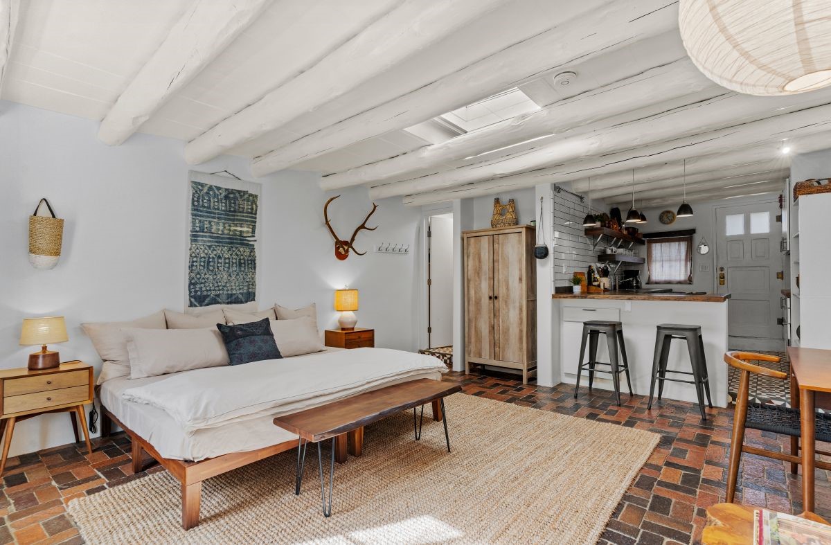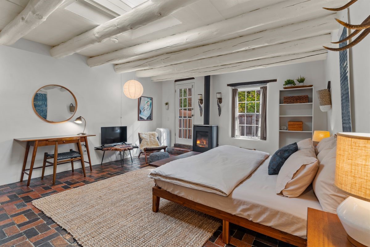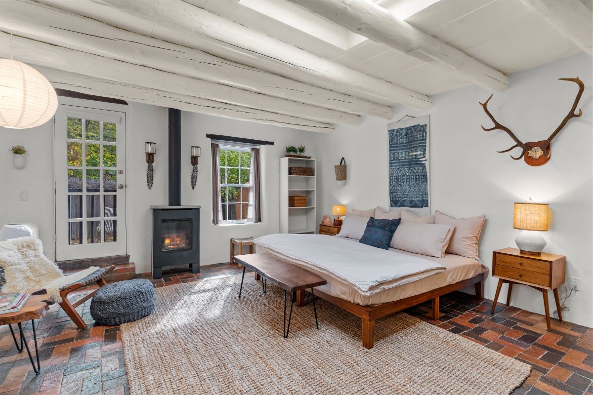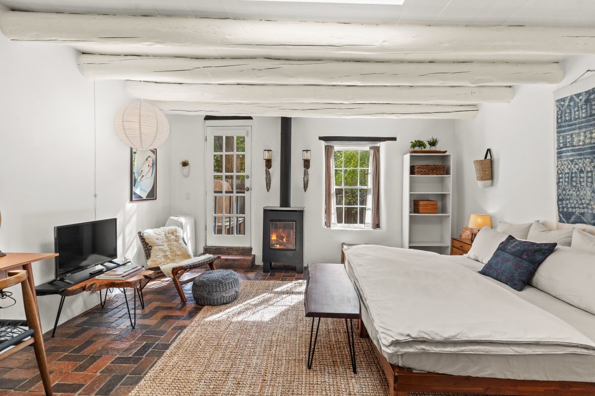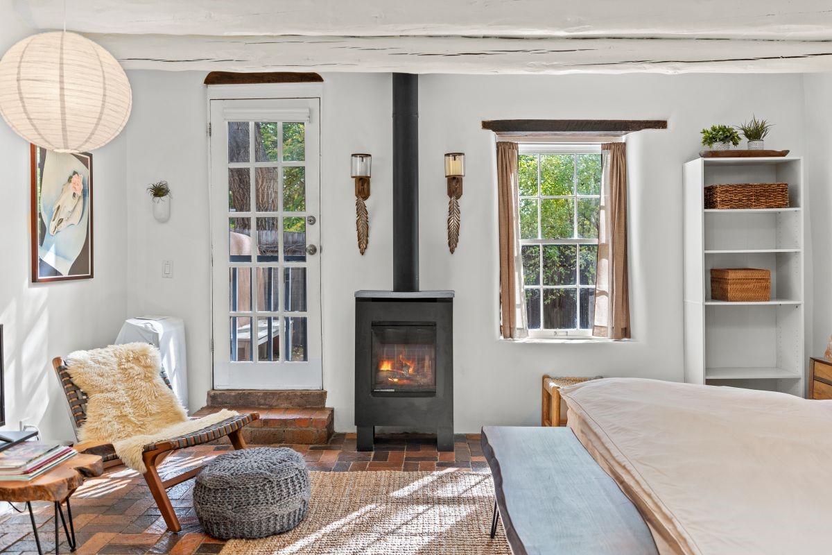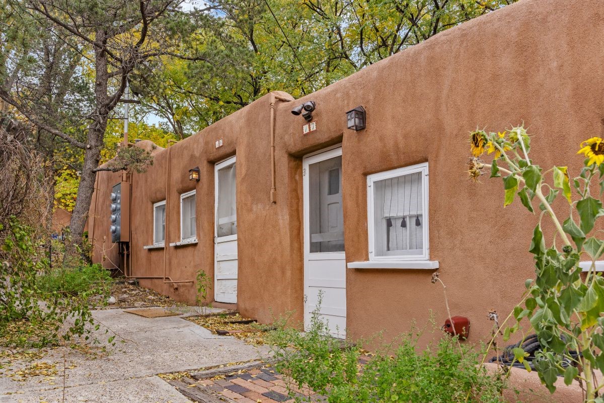 Rare charming historic adobe gem on one of Santa Fe's most adored streets, a stunning stroll to the downtown plaza. This renovated studio condo is sold fully furnished and its darling, with tile floors, viga ceilings, a gas fireplace that also heats, a fully equipped kitchen with half size fridge and dishwasher and high-end appliances. The bathroom is luxurious with a large shower, full size washer and drier. Enjoy the peace and tranquility of the shady private courtyard. The property is part of Santa Fe's rich history, a historic hideaway in the heart of old Santa Fe which was part of the original Webster Compound founded by Ann Webster in the 1930's for artists & writers. Legend has it that 54 books have been written and published including KON TIKI by Thor Heyerdahl at the compound. The condo is perfect as a residence, vacation rental, or artist's/writer's studio. Stroll over to the famed Canyon Rd with galleries and restaurants. Walk the block to Downtown Subscription for a fab coffee. The property has one step down from Kitchen to main area