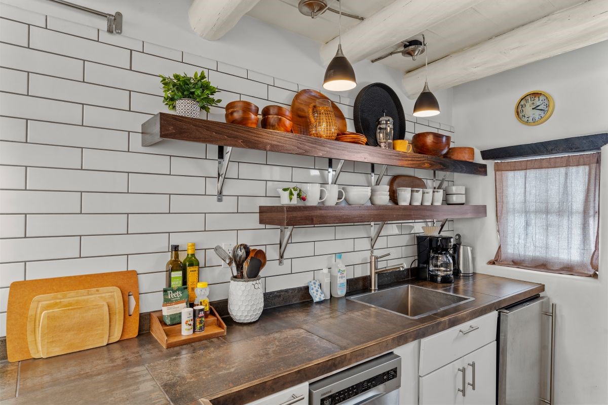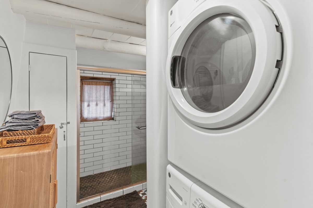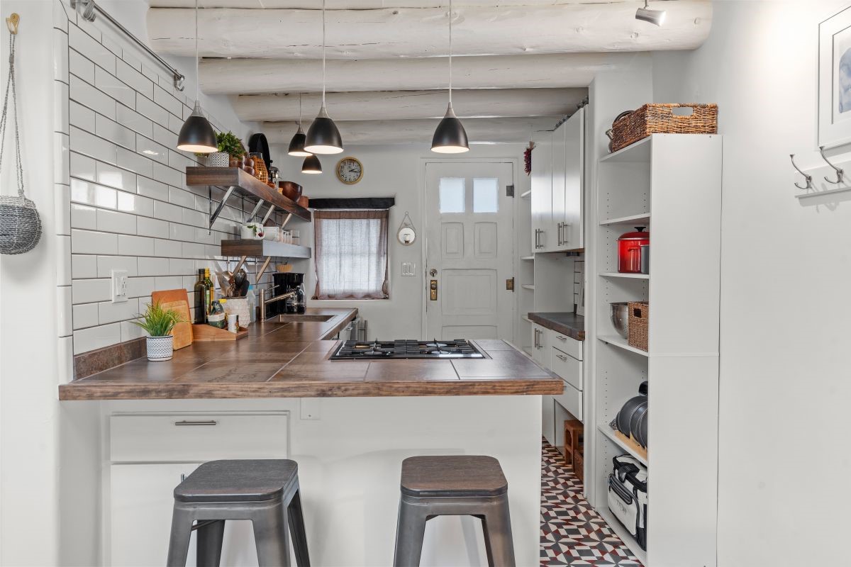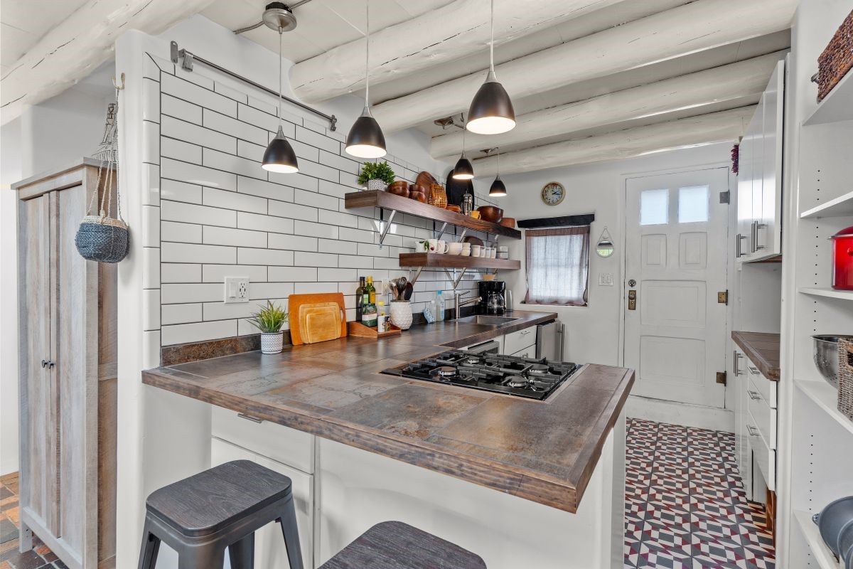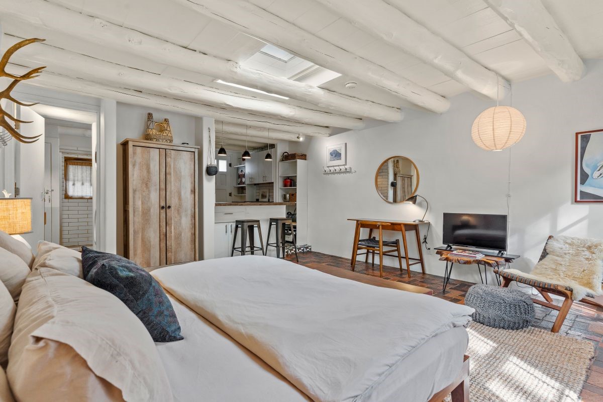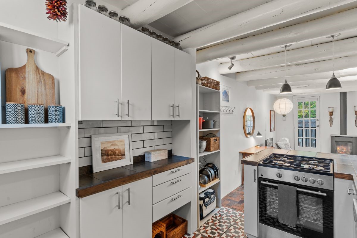 Rare charming historic adobe gem on one of Santa Fe's most adored streets, a stunning stroll to the downtown plaza. This renovated studio condo is sold fully furnished and its darling, with tile floors, viga ceilings, a gas fireplace that also heats, a fully equipped kitchen with half size fridge and dishwasher and high-end appliances. The bathroom is luxurious with a large shower, full size washer and drier. Enjoy the peace and tranquility of the shady private courtyard. The property is part of Santa Fe's rich history, a historic hideaway in the heart of old Santa Fe which was part of the original Webster Compound founded by Ann Webster in the 1930's for artists & writers. Legend has it that 54 books have been written and published including KON TIKI by Thor Heyerdahl at the compound. The condo is perfect as a residence, vacation rental, or artist's/writer's studio. Stroll over to the famed Canyon Rd with galleries and restaurants. Walk the block to Downtown Subscription for a fab coffee. The property has one step down from Kitchen to main area