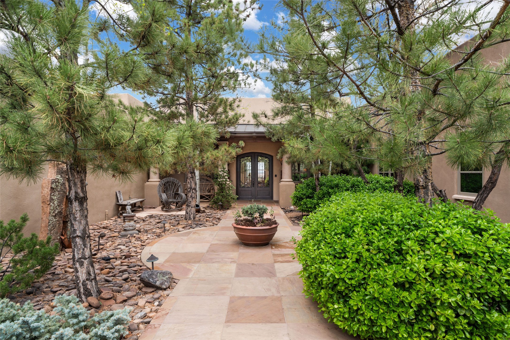 41 Avenida de Las Casas presents a rare opportunity to own one of the single family homes within the prestigious and gated Casas de San Juan community. Enjoy sweeping northern vistas, dramatic views of the Badlands, and dynamic seasonal tableaus of the Sangre de Cristo mountains from this stunning residence. Designed for both comfort and elegance, this approximately 5,000 square foot, two-level home with four generously sized bedrooms. There's a grandeur and stately quality to the property, typified by the high wood beamed ceiling in the living room that welcomes guests to the home. Spacious entertaining rooms are complimented by less formal and intimate spaces. The main level has three bedroom suites, each with their own outdoor access to secluded patios and portals. The lower level functions as a private one-bedroom guest casita, complete with its own living/dining area and kitchenette--ideal for visitors or multi-generational living. A spacious family room sits just off the fully equipped kitchen, creating a perfect flow for everyday living and entertaining. The outdoor spaces are impeccable with multiple formal and informal eating areas, an outdoor grill and bar, a stone fire pit, and a hot tub with a view to Colorado. The property is offered with the existing furniture included.