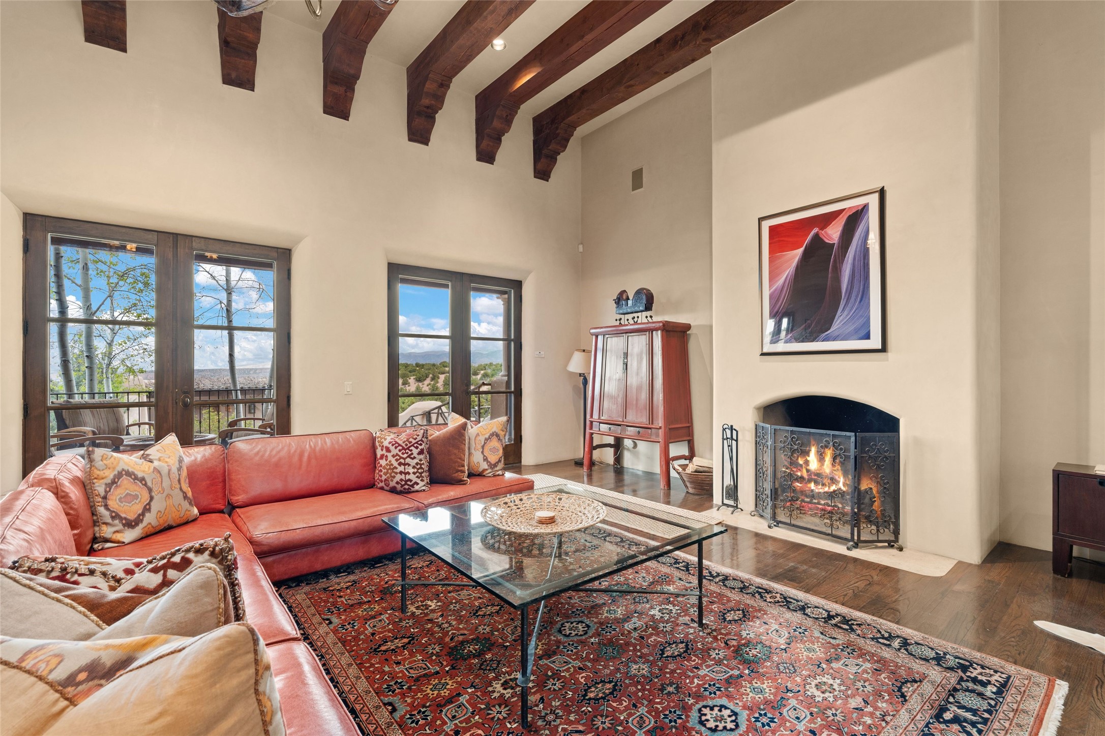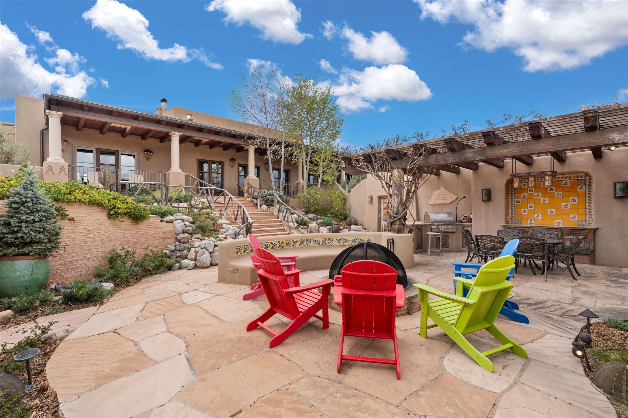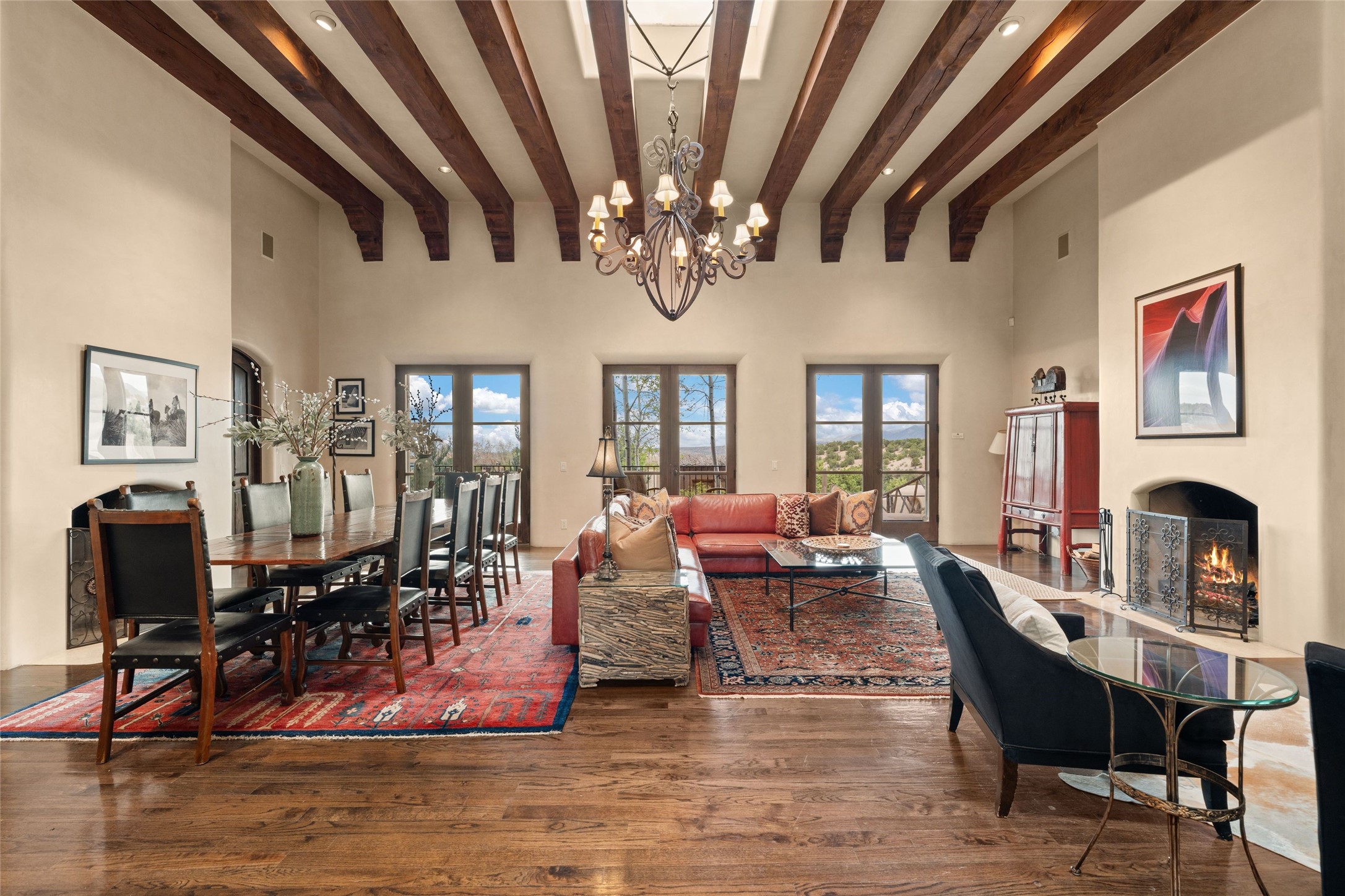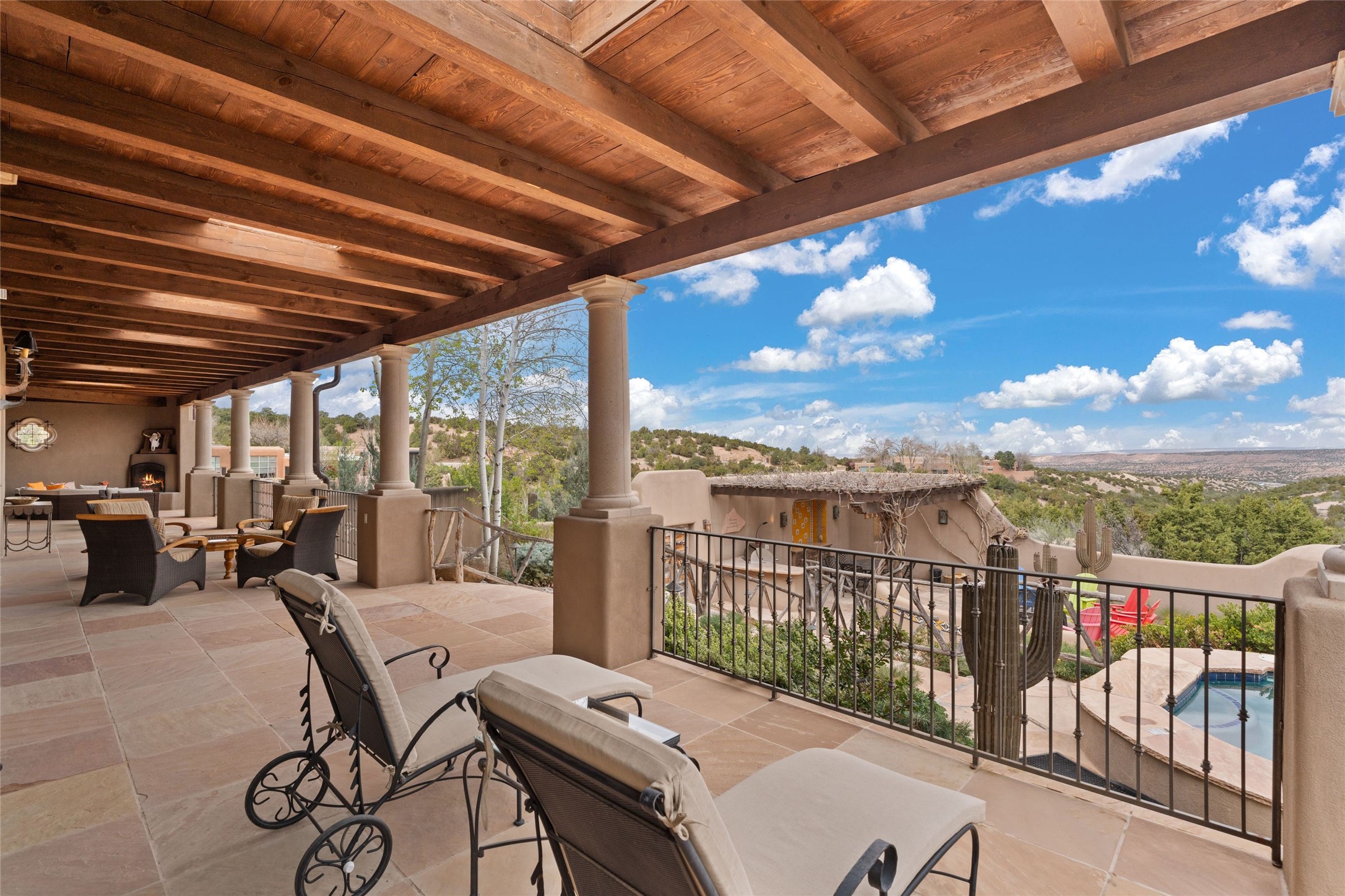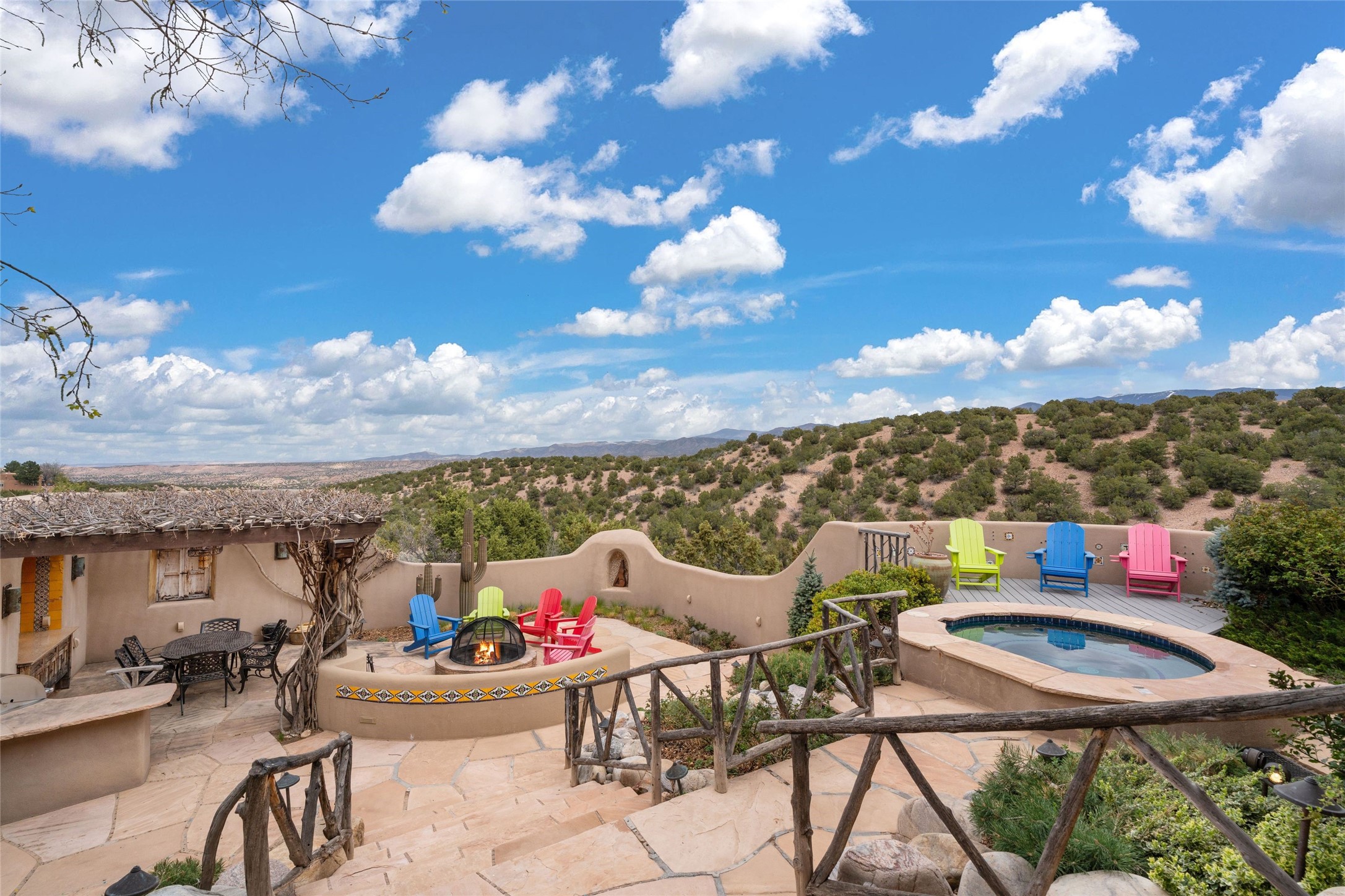 41 Avenida de Las Casas presents a rare opportunity to own one of the single family homes within the prestigious and gated Casas de San Juan community. Enjoy sweeping northern vistas, dramatic views of the Badlands, and dynamic seasonal tableaus of the Sangre de Cristo mountains from this stunning residence. Designed for both comfort and elegance, this approximately 5,000 square foot, two-level home with four generously sized bedrooms. There's a grandeur and stately quality to the property, typified by the high wood beamed ceiling in the living room that welcomes guests to the home. Spacious entertaining rooms are complimented by less formal and intimate spaces. The main level has three bedroom suites, each with their own outdoor access to secluded patios and portals. The lower level functions as a private one-bedroom guest casita, complete with its own living/dining area and kitchenette--ideal for visitors or multi-generational living. A spacious family room sits just off the fully equipped kitchen, creating a perfect flow for everyday living and entertaining. The outdoor spaces are impeccable with multiple formal and informal eating areas, an outdoor grill and bar, a stone fire pit, and a hot tub with a view to Colorado. The property is offered with the existing furniture included.
