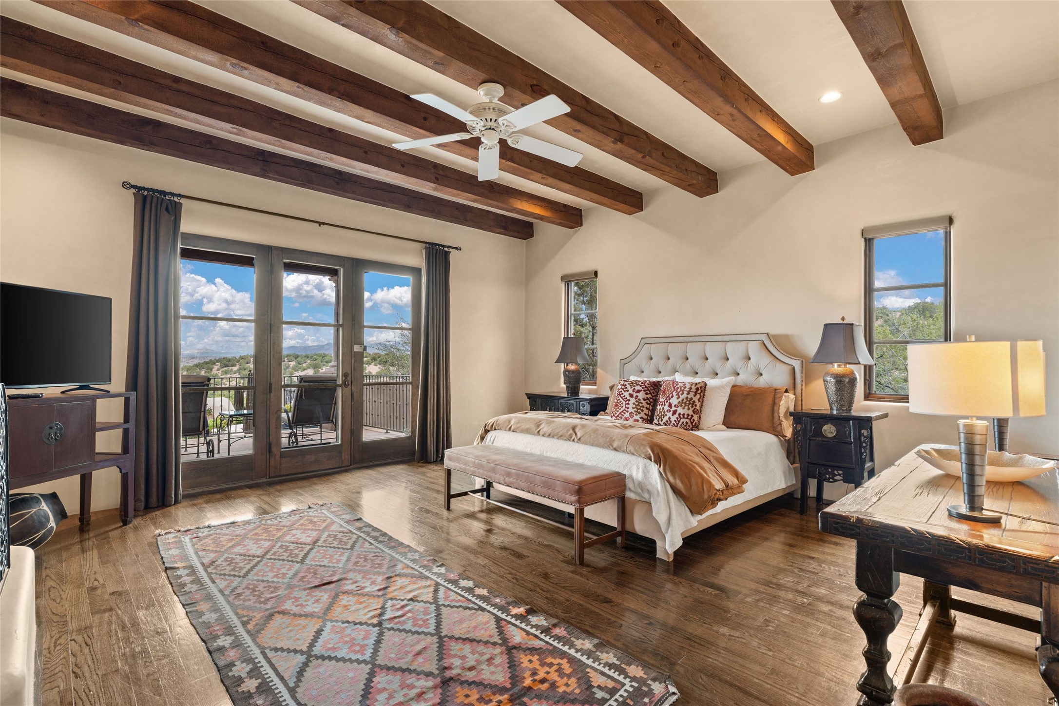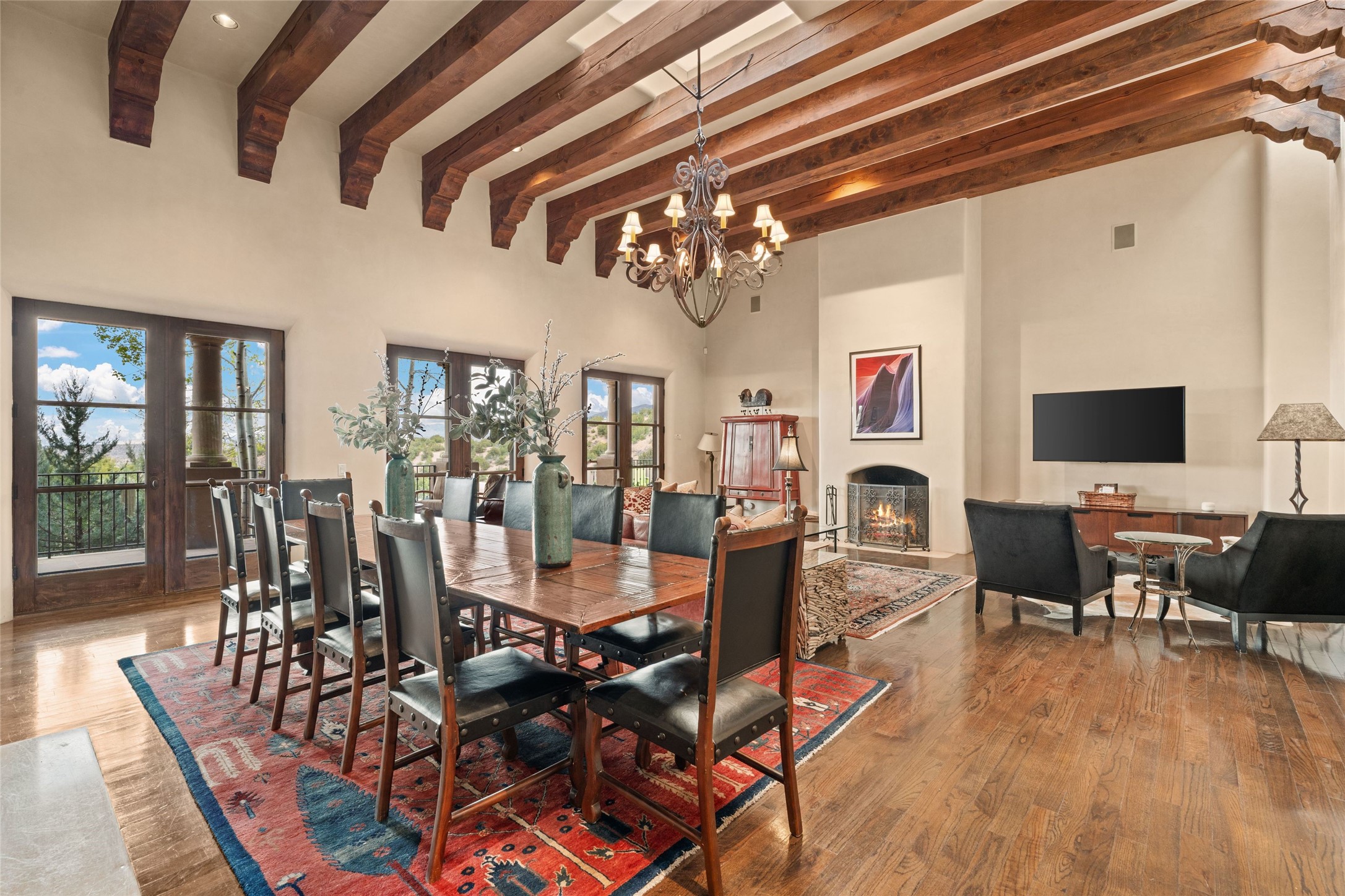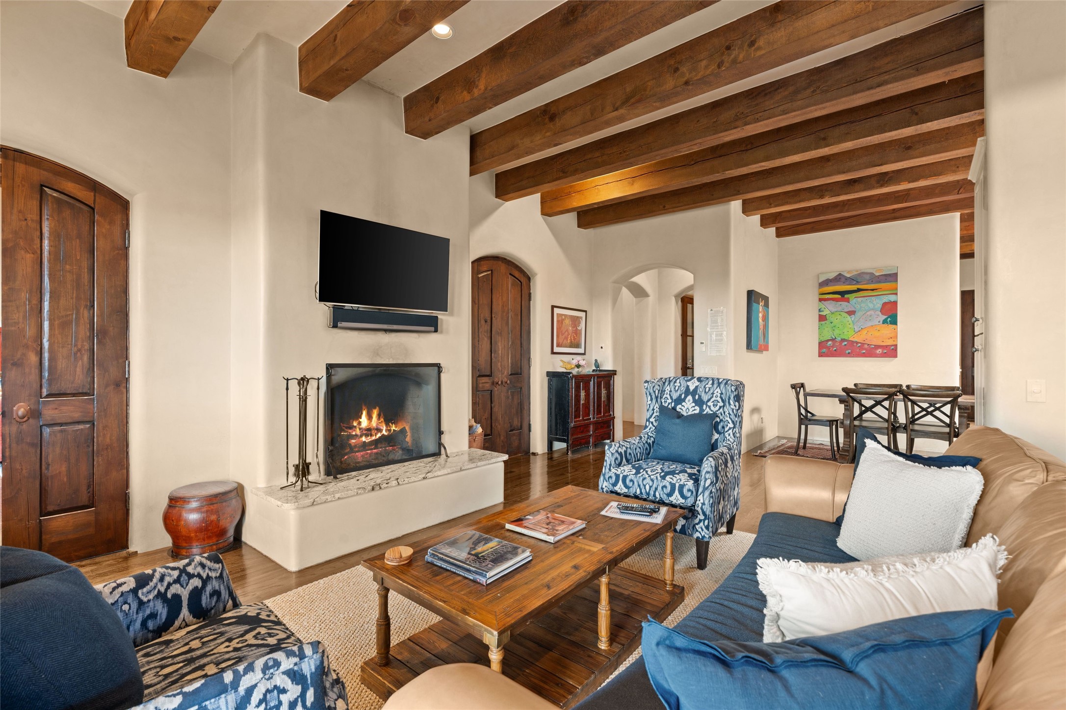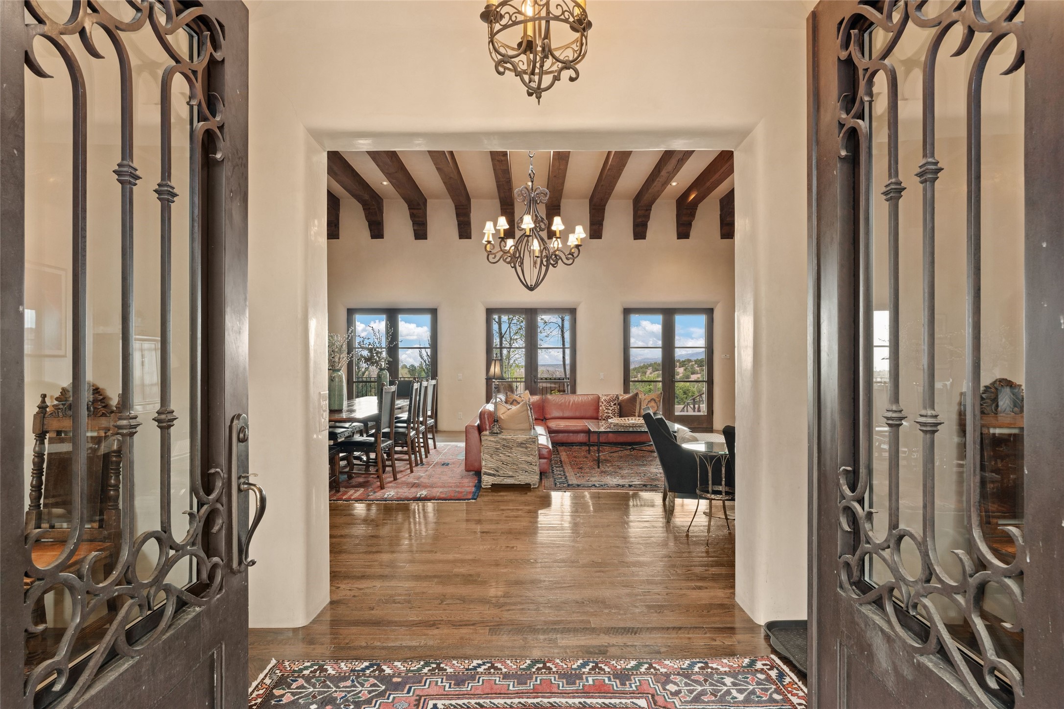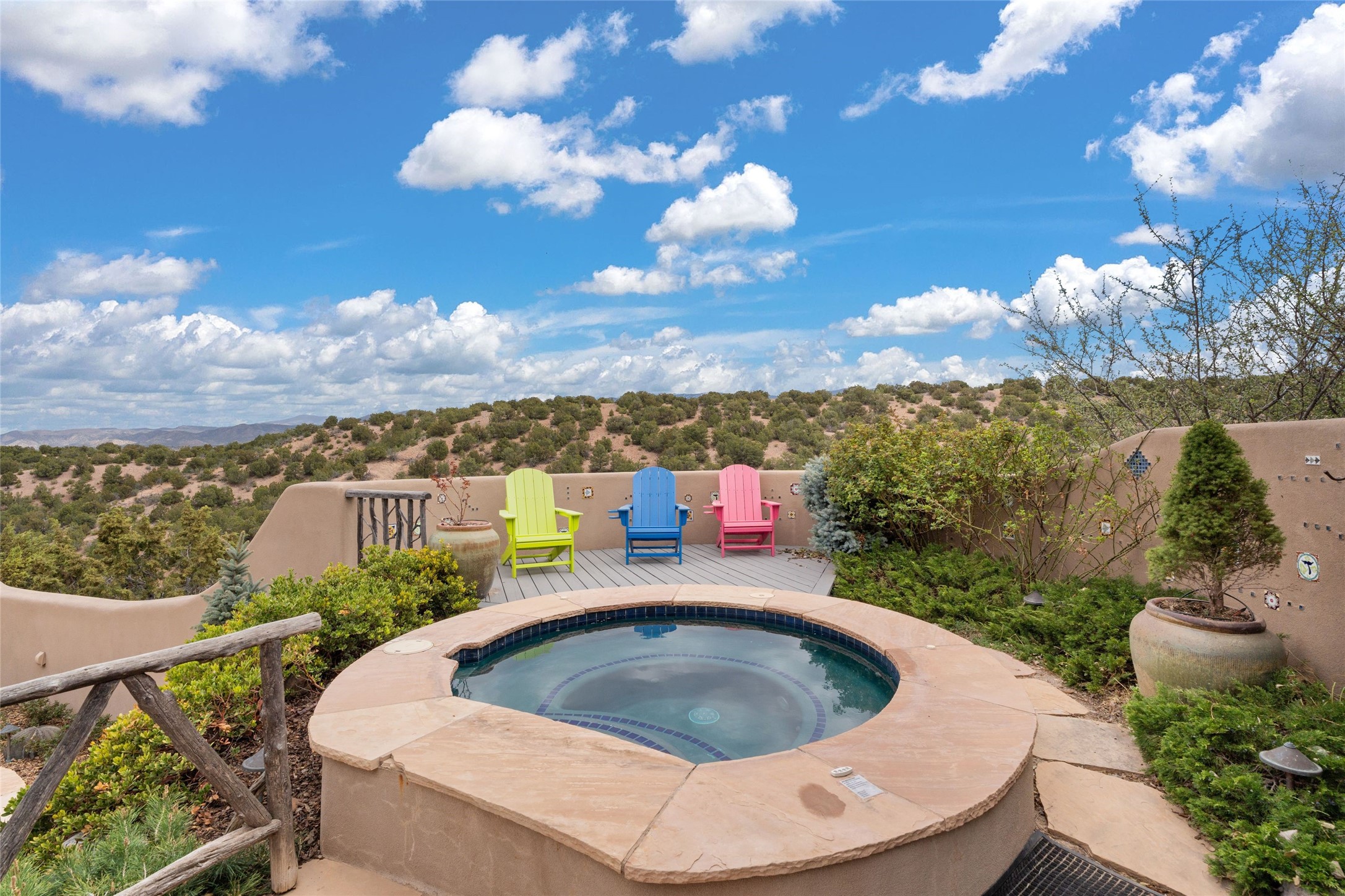 41 Avenida de Las Casas presents a rare opportunity to own one of the single family homes within the prestigious and gated Casas de San Juan community. Enjoy sweeping northern vistas, dramatic views of the Badlands, and dynamic seasonal tableaus of the Sangre de Cristo mountains from this stunning residence. Designed for both comfort and elegance, this approximately 5,000 square foot, two-level home with four generously sized bedrooms. There's a grandeur and stately quality to the property, typified by the high wood beamed ceiling in the living room that welcomes guests to the home. Spacious entertaining rooms are complimented by less formal and intimate spaces. The main level has three bedroom suites, each with their own outdoor access to secluded patios and portals. The lower level functions as a private one-bedroom guest casita, complete with its own living/dining area and kitchenette--ideal for visitors or multi-generational living. A spacious family room sits just off the fully equipped kitchen, creating a perfect flow for everyday living and entertaining. The outdoor spaces are impeccable with multiple formal and informal eating areas, an outdoor grill and bar, a stone fire pit, and a hot tub with a view to Colorado. The property is offered with the existing furniture included.