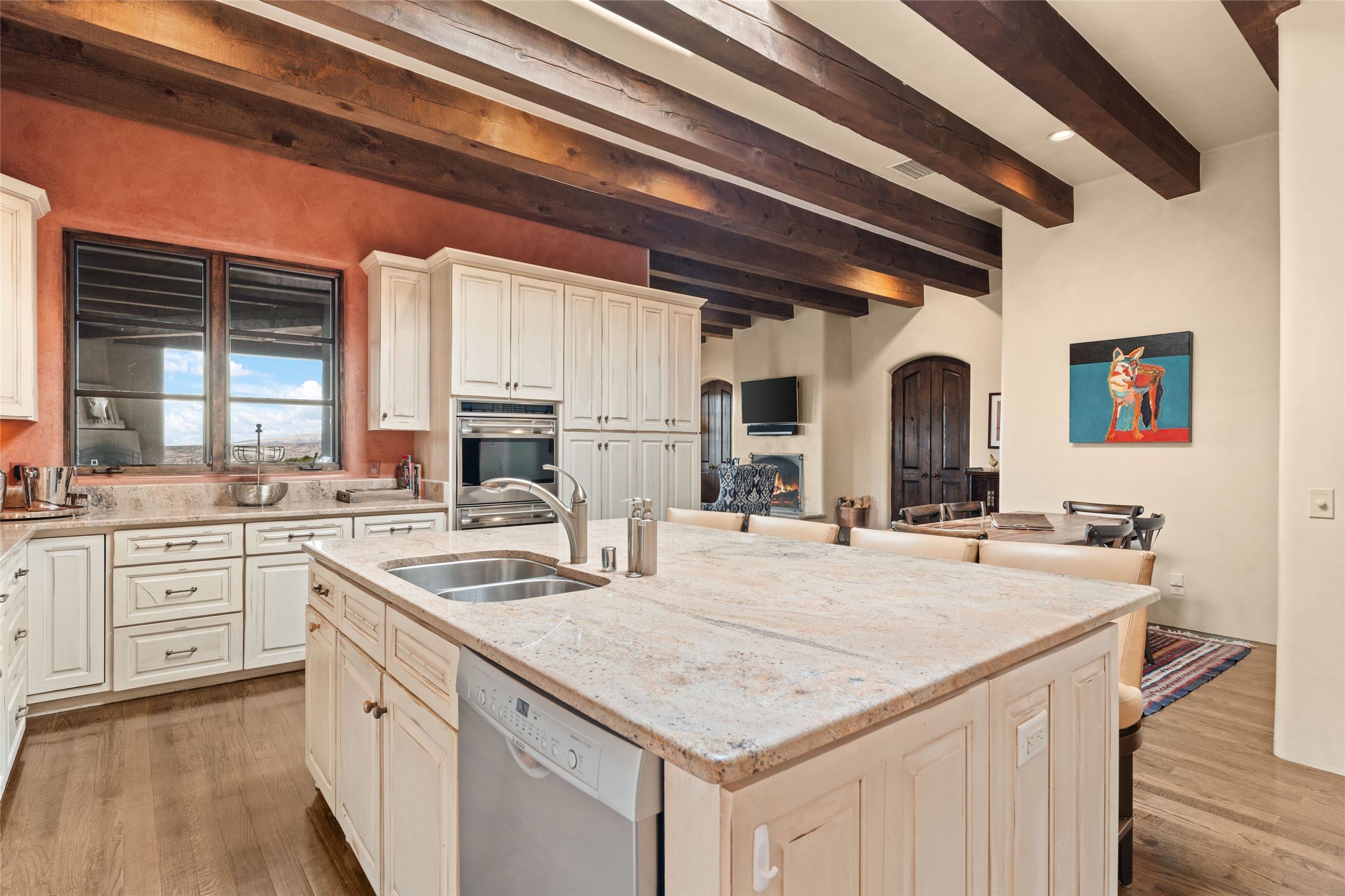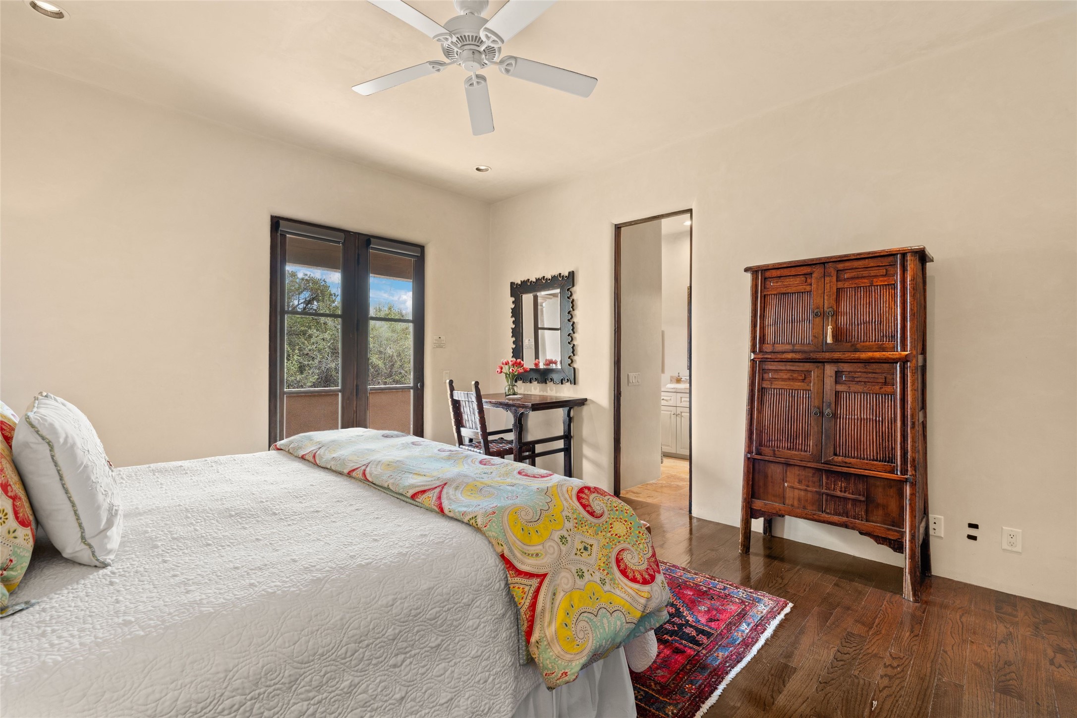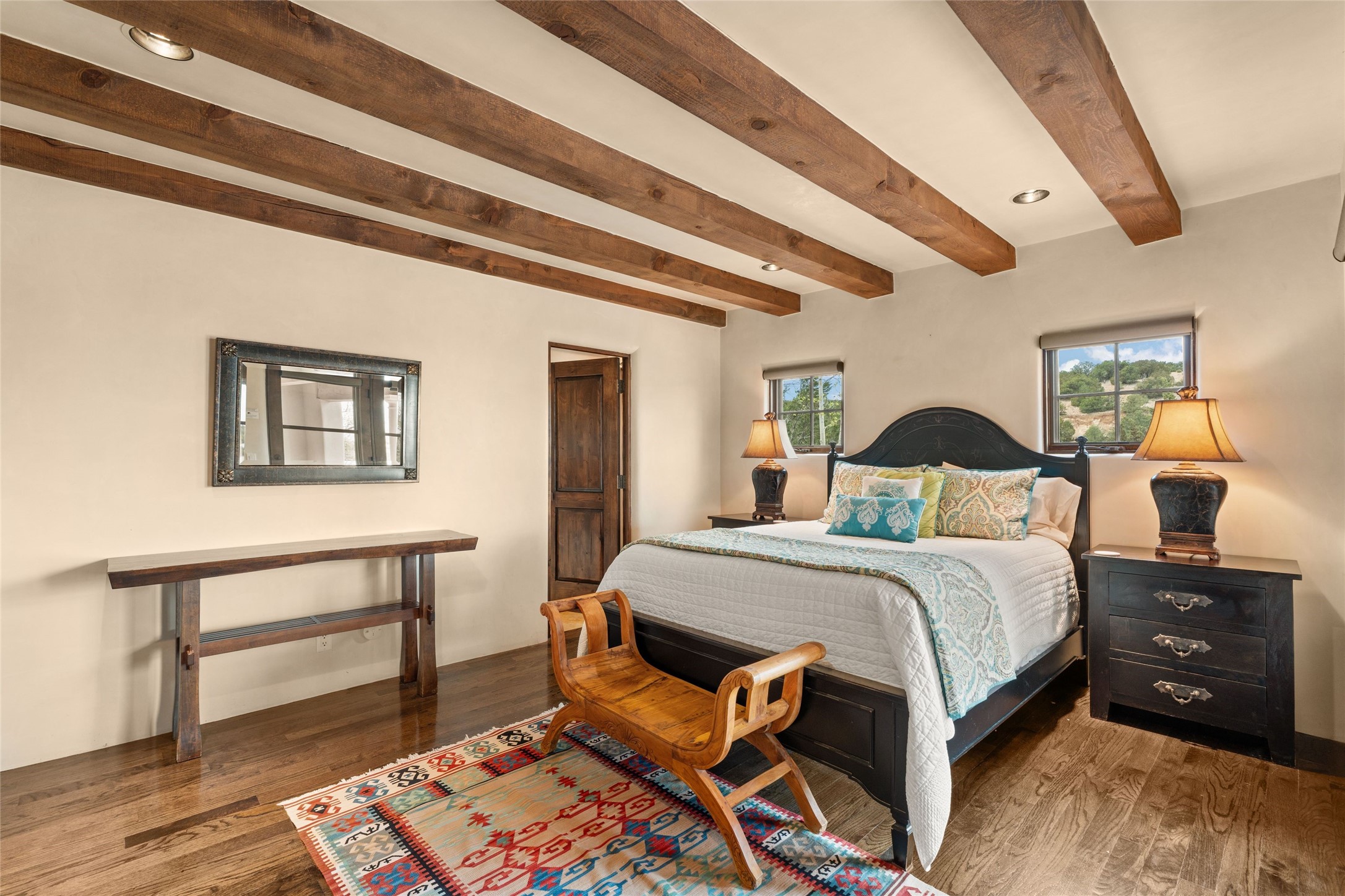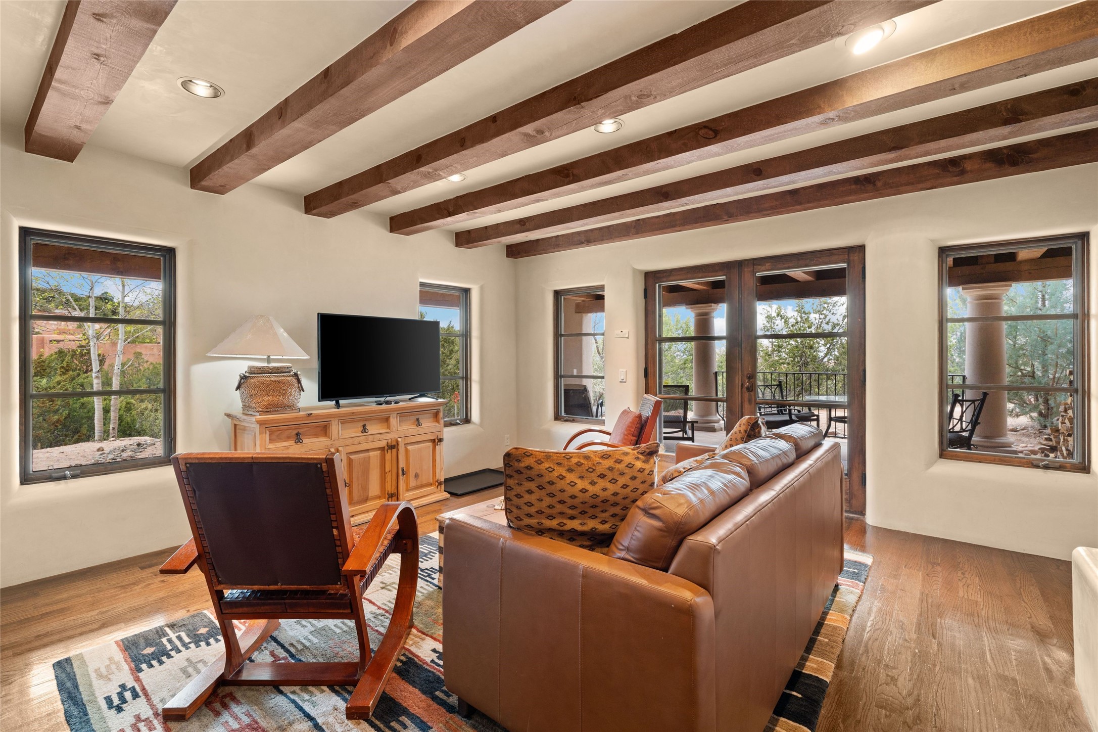 41 Avenida de Las Casas presents a rare opportunity to own one of the single family homes within the prestigious and gated Casas de San Juan community. Enjoy sweeping northern vistas, dramatic views of the Badlands, and dynamic seasonal tableaus of the Sangre de Cristo mountains from this stunning residence. Designed for both comfort and elegance, this approximately 5,000 square foot, two-level home with four generously sized bedrooms. There's a grandeur and stately quality to the property, typified by the high wood beamed ceiling in the living room that welcomes guests to the home. Spacious entertaining rooms are complimented by less formal and intimate spaces. The main level has three bedroom suites, each with their own outdoor access to secluded patios and portals. The lower level functions as a private one-bedroom guest casita, complete with its own living/dining area and kitchenette--ideal for visitors or multi-generational living. A spacious family room sits just off the fully equipped kitchen, creating a perfect flow for everyday living and entertaining. The outdoor spaces are impeccable with multiple formal and informal eating areas, an outdoor grill and bar, a stone fire pit, and a hot tub with a view to Colorado. The property is offered with the existing furniture included.