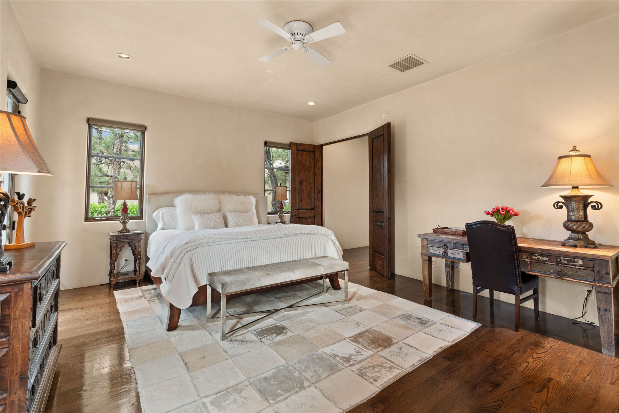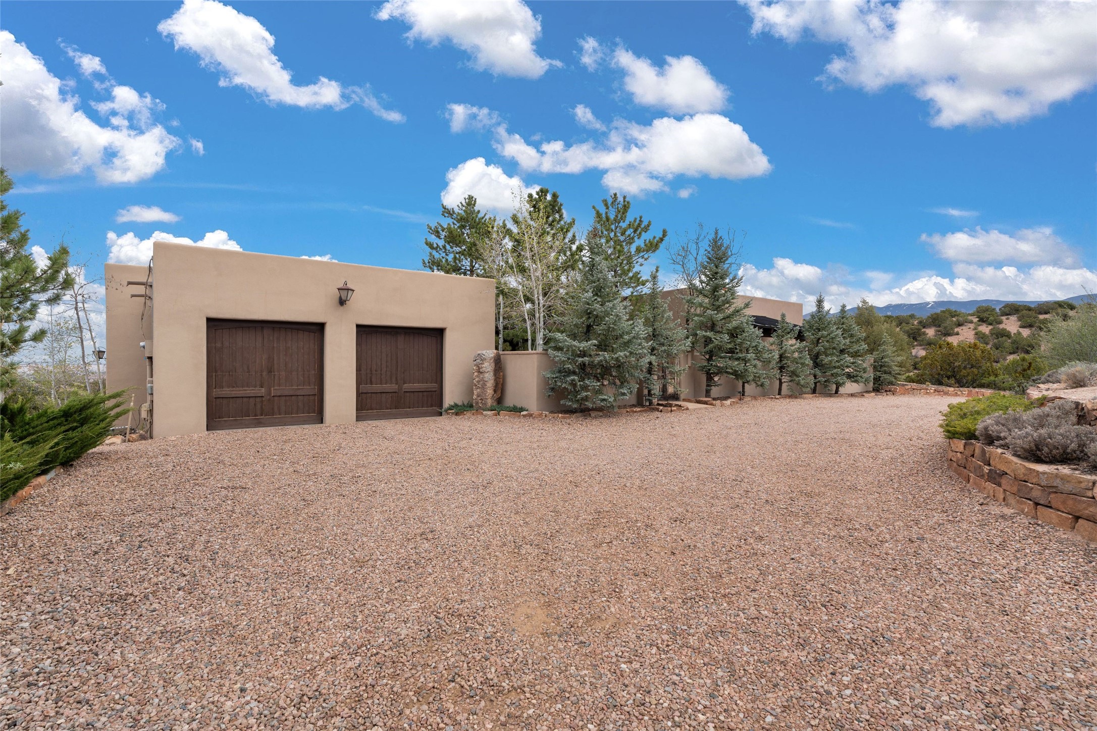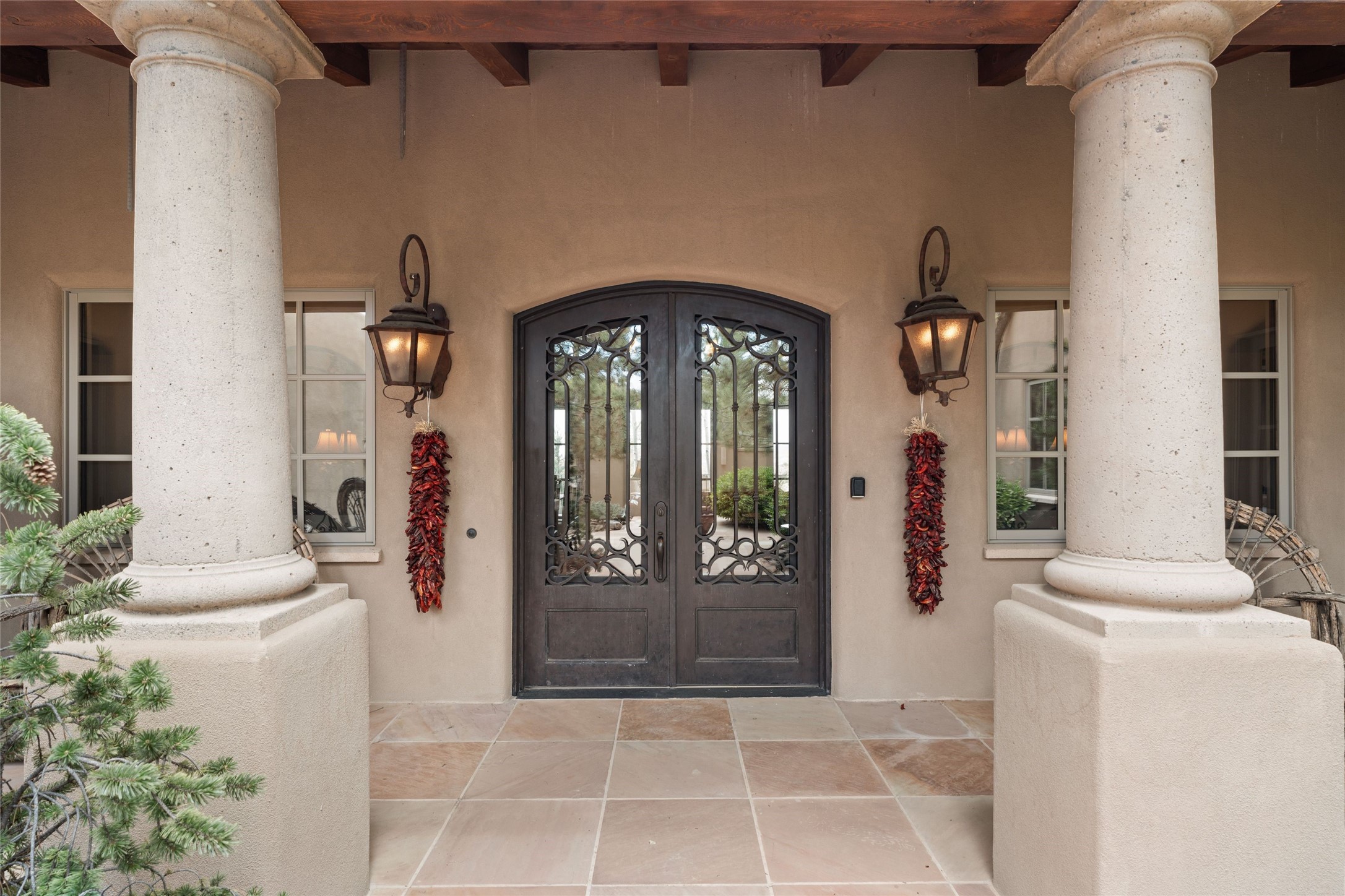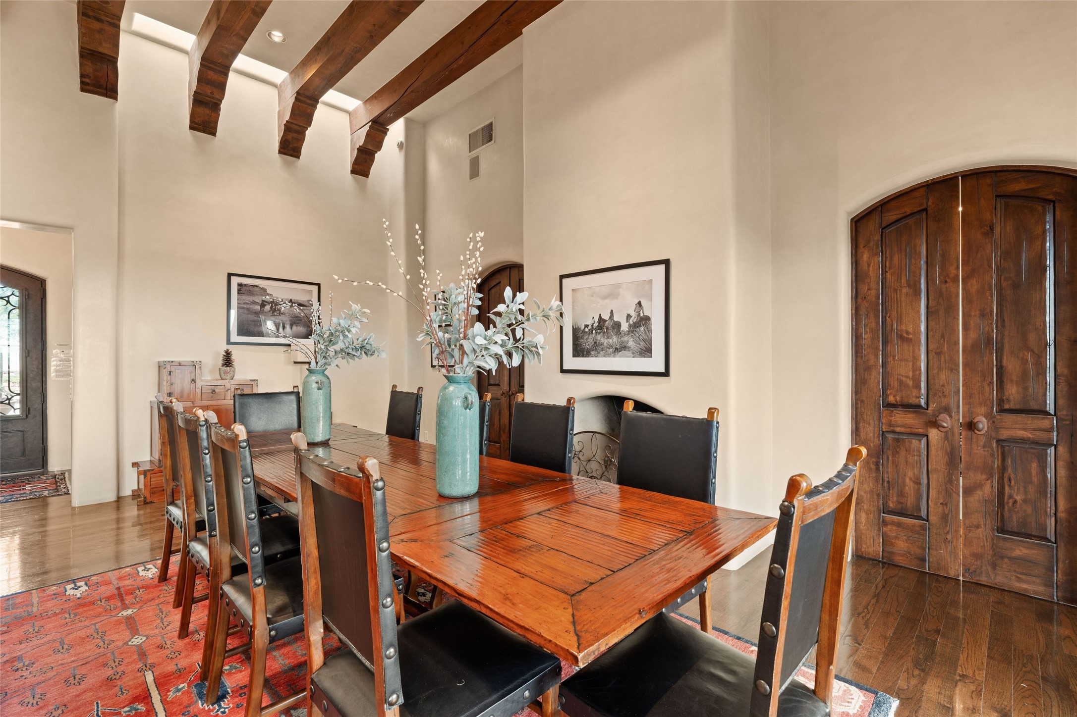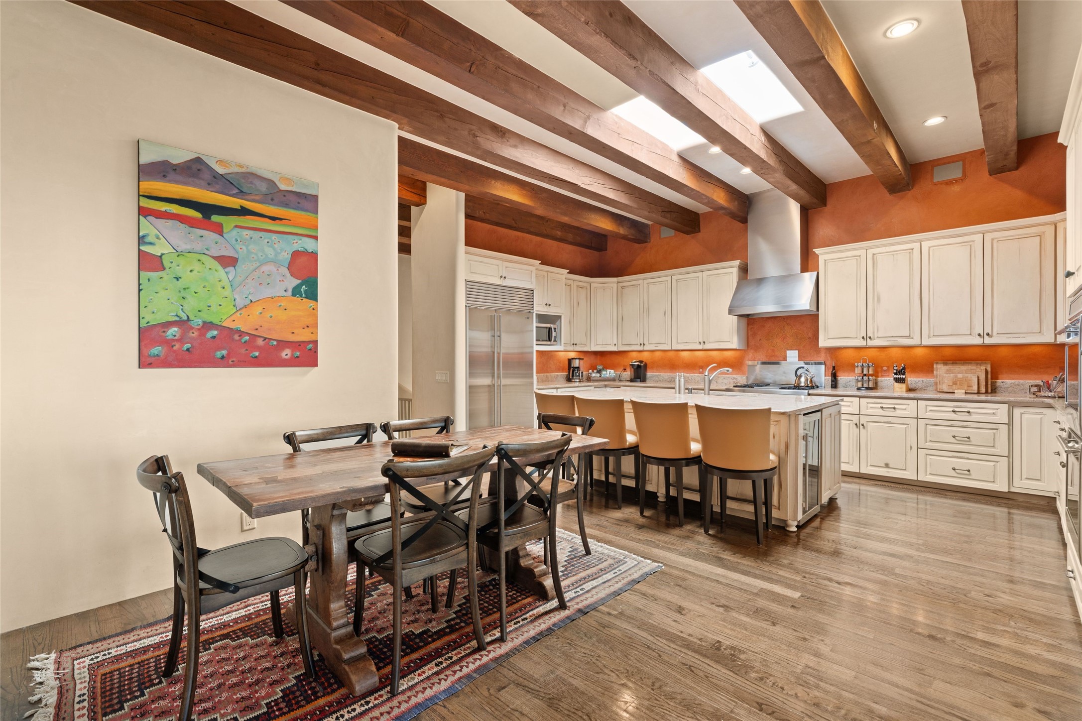 41 Avenida de Las Casas presents a rare opportunity to own one of the single family homes within the prestigious and gated Casas de San Juan community. Enjoy sweeping northern vistas, dramatic views of the Badlands, and dynamic seasonal tableaus of the Sangre de Cristo mountains from this stunning residence. Designed for both comfort and elegance, this approximately 5,000 square foot, two-level home with four generously sized bedrooms. There's a grandeur and stately quality to the property, typified by the high wood beamed ceiling in the living room that welcomes guests to the home. Spacious entertaining rooms are complimented by less formal and intimate spaces. The main level has three bedroom suites, each with their own outdoor access to secluded patios and portals. The lower level functions as a private one-bedroom guest casita, complete with its own living/dining area and kitchenette--ideal for visitors or multi-generational living. A spacious family room sits just off the fully equipped kitchen, creating a perfect flow for everyday living and entertaining. The outdoor spaces are impeccable with multiple formal and informal eating areas, an outdoor grill and bar, a stone fire pit, and a hot tub with a view to Colorado. The property is offered with the existing furniture included.