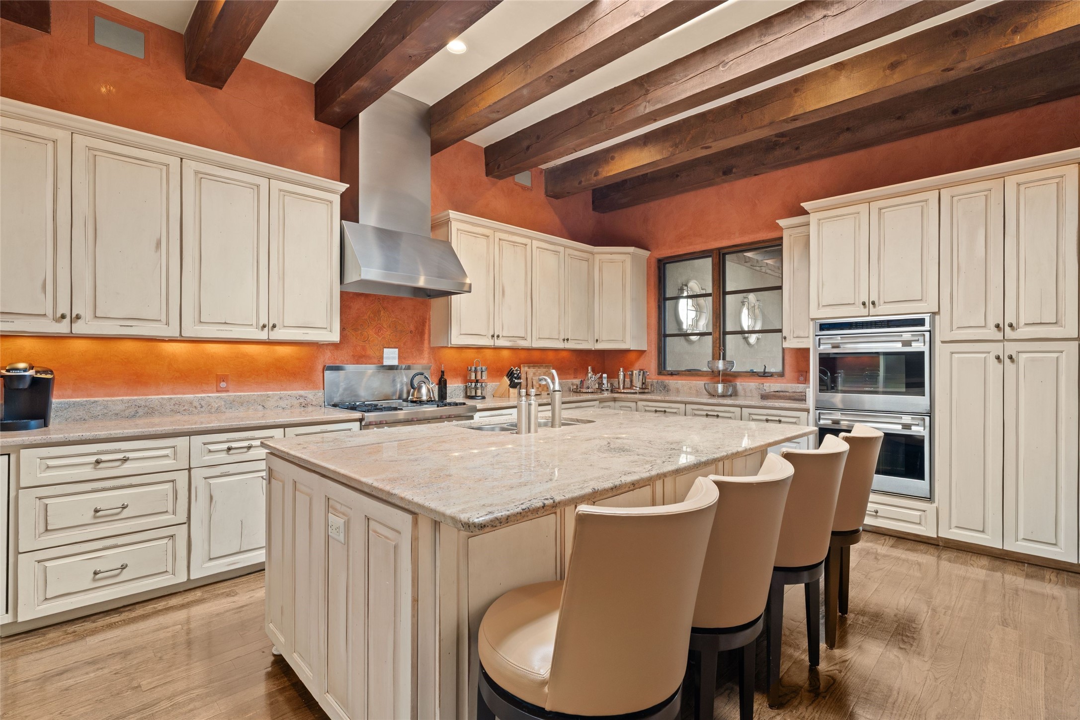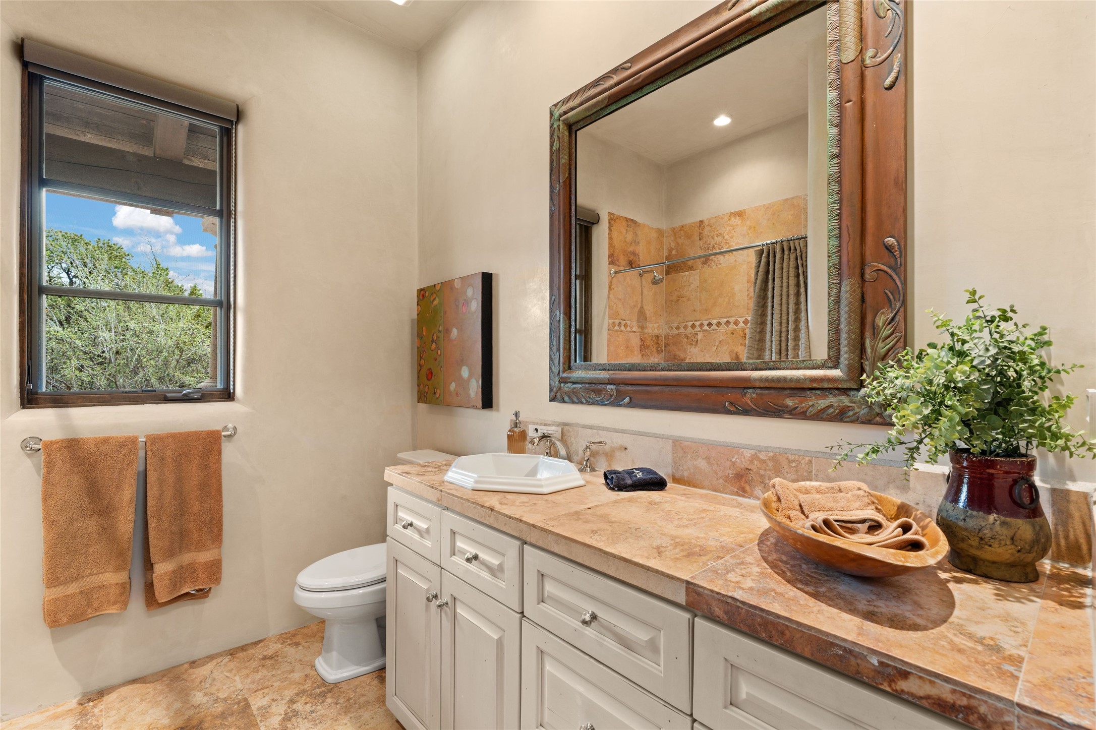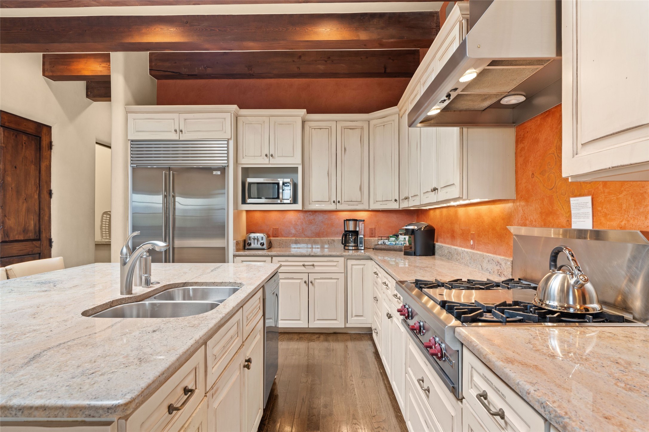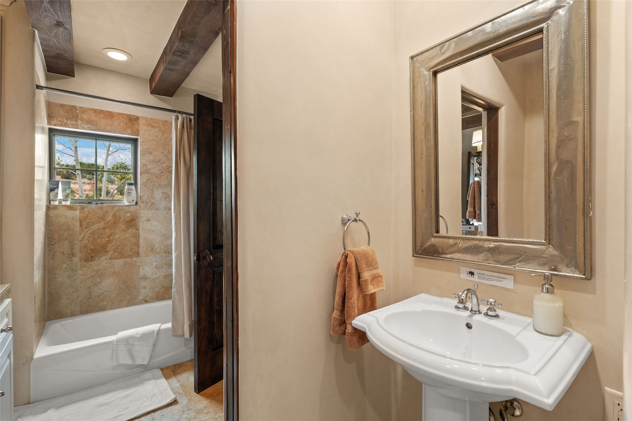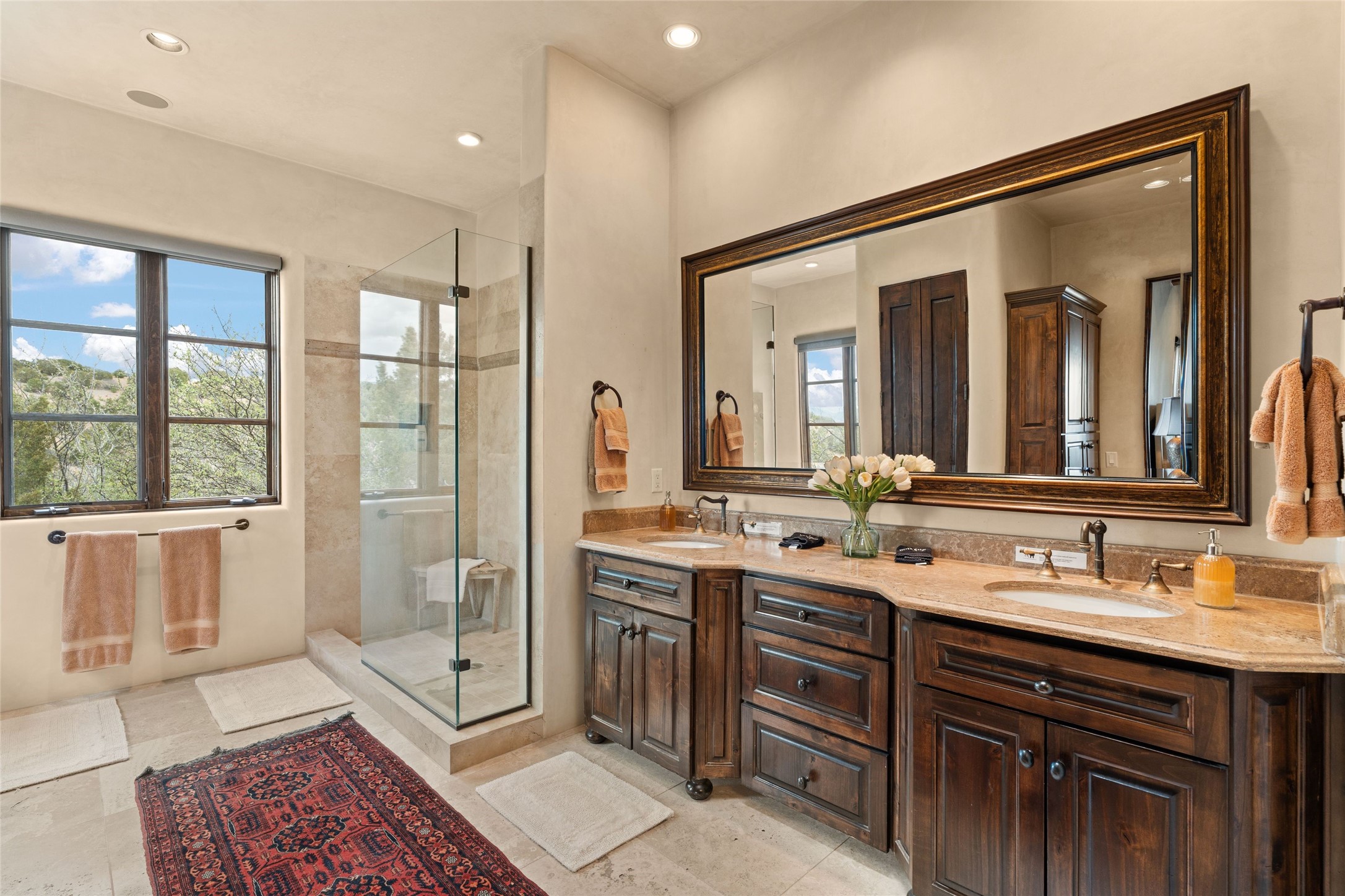 41 Avenida de Las Casas presents a rare opportunity to own one of the single family homes within the prestigious and gated Casas de San Juan community. Enjoy sweeping northern vistas, dramatic views of the Badlands, and dynamic seasonal tableaus of the Sangre de Cristo mountains from this stunning residence. Designed for both comfort and elegance, this approximately 5,000 square foot, two-level home with four generously sized bedrooms. There's a grandeur and stately quality to the property, typified by the high wood beamed ceiling in the living room that welcomes guests to the home. Spacious entertaining rooms are complimented by less formal and intimate spaces. The main level has three bedroom suites, each with their own outdoor access to secluded patios and portals. The lower level functions as a private one-bedroom guest casita, complete with its own living/dining area and kitchenette--ideal for visitors or multi-generational living. A spacious family room sits just off the fully equipped kitchen, creating a perfect flow for everyday living and entertaining. The outdoor spaces are impeccable with multiple formal and informal eating areas, an outdoor grill and bar, a stone fire pit, and a hot tub with a view to Colorado. The property is offered with the existing furniture included.