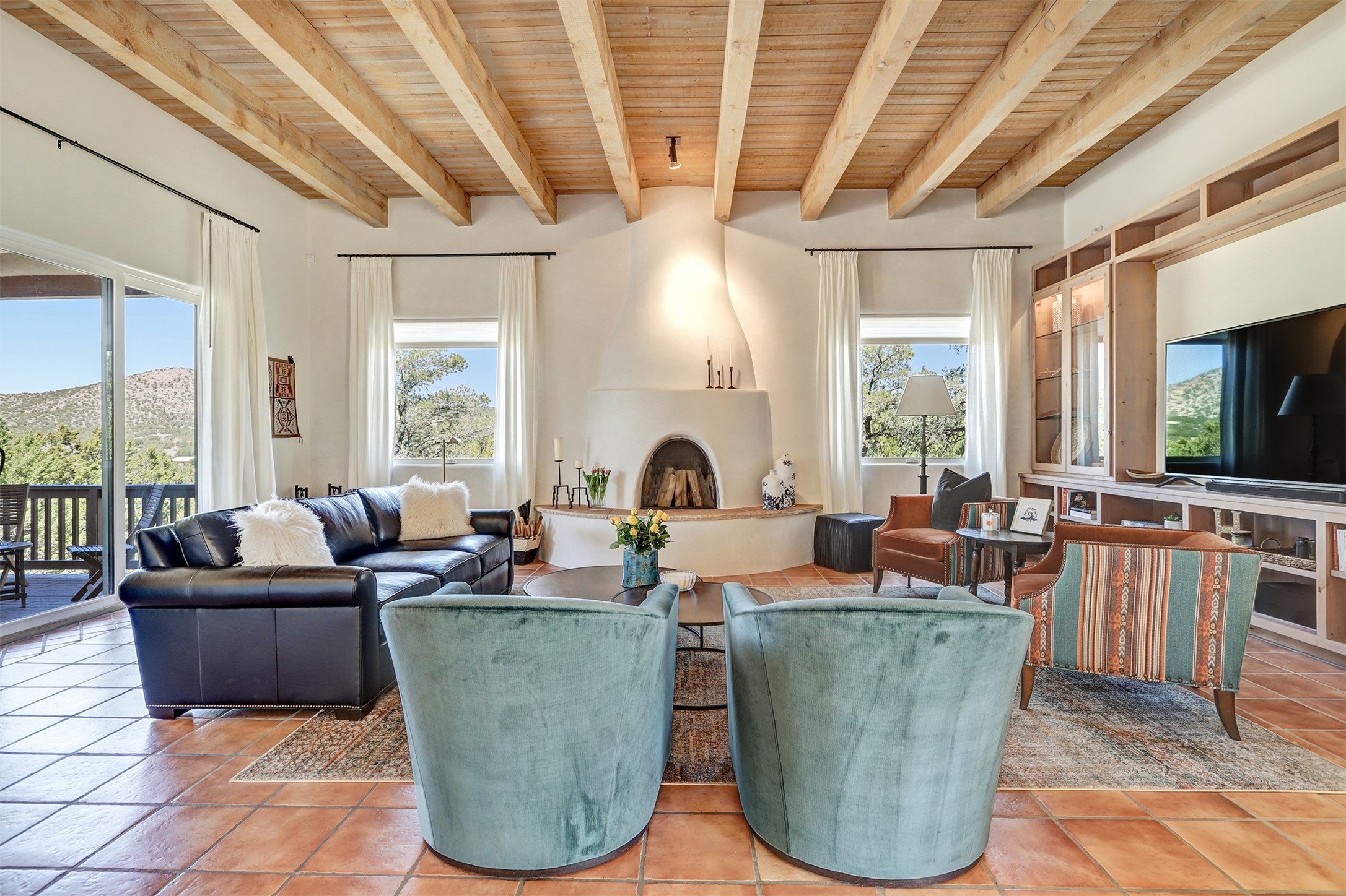 This tastefully remodeled, bright, and move-in-ready 2,879 sq ft, 3-bedroom, 2-bathroom single-level home is nestled within the neighborhood The Ridges, a prestigious and serene enclave just ~20 minutes from the heart of Santa Fe. Offering a seamless blend of classic Santa Fe architecture and modern upgrades, every detail is designed for comfort, style, and function.From the moment you arrive, the fresh new stucco exterior and brand-new garage doors hint at the impeccable updates found throughout.Step inside to discover a spacious and airy open floor plan anchored by a custom-built wood-burning kiva fireplace, framed by dramatic beamed ceilings that gracefully flow throughout the entire home, creating a warm, Santa Fe atmosphere.Natural light fills the living spaces through all-new Windsor windows and enlarged sliding doors, offering captivating picture-framed views of the surrounding landscape. Every window feels like a living canvas, inviting Santa Fe's natural beauty indoors. Custom window treatments add a perfect touch of elegance and privacy. Throughout the home, new light fixtures and fresh paint enhance the refined yet cozy ambiance.The charming kitchen and laundry room shine with sleek new quartz countertops and stainless steel appliances, offering a perfect balance of style and functionality.A standout feature is the inviting private inner courtyard, completely reimagined with premium flagstone pavers and a French drain system, creating a tranquil oasis ideal for al fresco dining, entertaining, or simply relaxing under the starry Santa Fe sky.Set on a quiet and picturesque 4-acre lot, the property welcomes two horses. You'll enjoy the perfect balance of natural serenity and modern convenience, with shopping, dining, medical facilities, and Santa Fe's vibrant cultural scene all within easy reach.