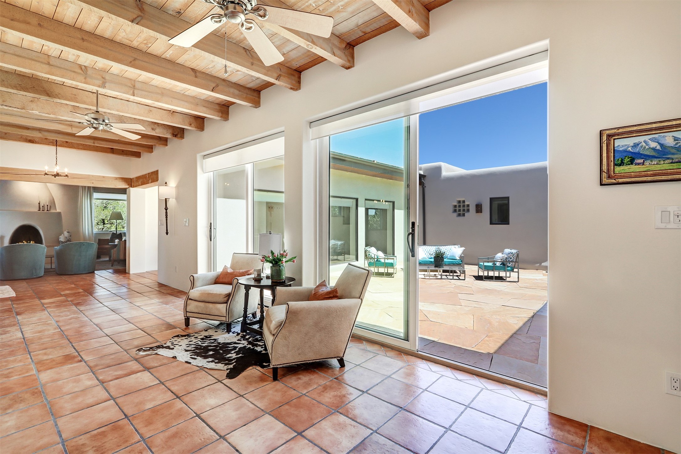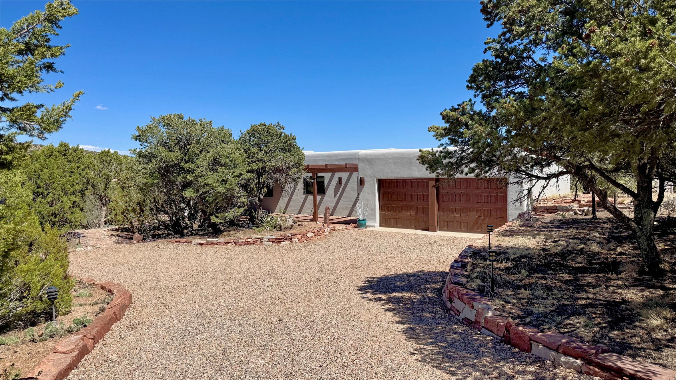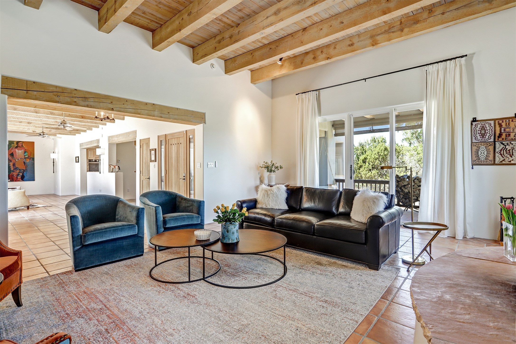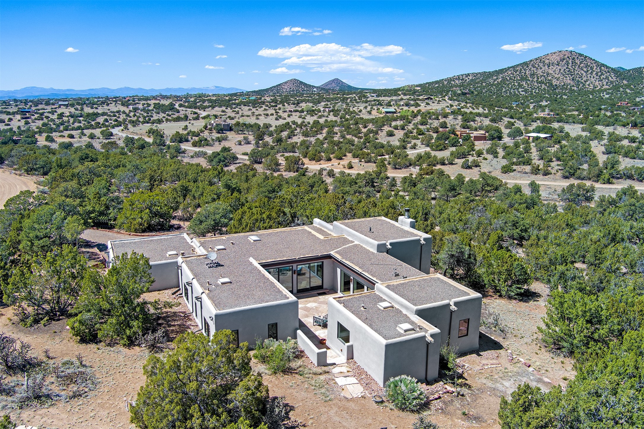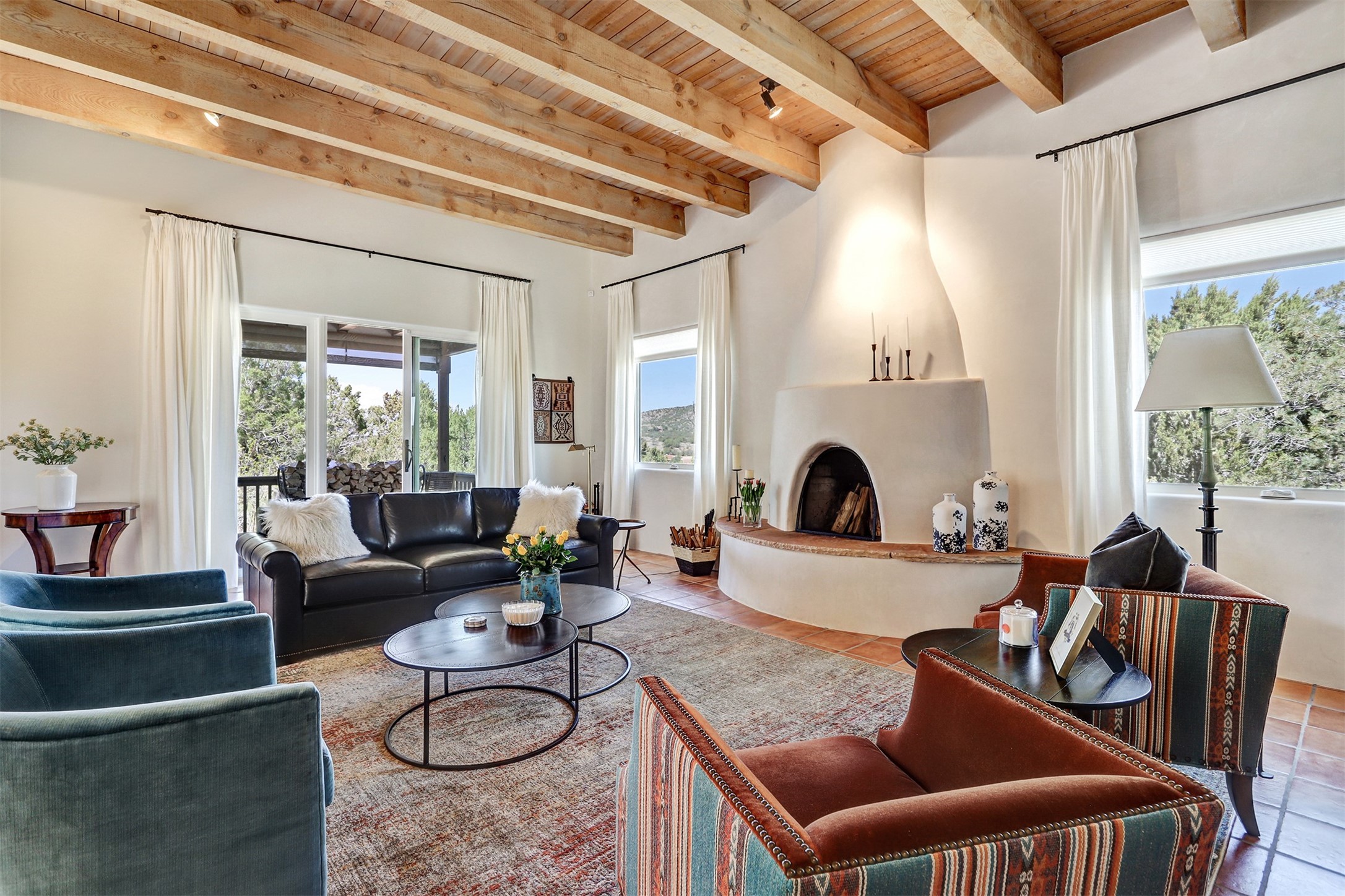 This tastefully remodeled, bright, and move-in-ready 2,879 sq ft, 3-bedroom, 2-bathroom single-level home is nestled within the neighborhood The Ridges, a prestigious and serene enclave just ~20 minutes from the heart of Santa Fe. Offering a seamless blend of classic Santa Fe architecture and modern upgrades, every detail is designed for comfort, style, and function.From the moment you arrive, the fresh new stucco exterior and brand-new garage doors hint at the impeccable updates found throughout.Step inside to discover a spacious and airy open floor plan anchored by a custom-built wood-burning kiva fireplace, framed by dramatic beamed ceilings that gracefully flow throughout the entire home, creating a warm, Santa Fe atmosphere.Natural light fills the living spaces through all-new Windsor windows and enlarged sliding doors, offering captivating picture-framed views of the surrounding landscape. Every window feels like a living canvas, inviting Santa Fe's natural beauty indoors. Custom window treatments add a perfect touch of elegance and privacy. Throughout the home, new light fixtures and fresh paint enhance the refined yet cozy ambiance.The charming kitchen and laundry room shine with sleek new quartz countertops and stainless steel appliances, offering a perfect balance of style and functionality.A standout feature is the inviting private inner courtyard, completely reimagined with premium flagstone pavers and a French drain system, creating a tranquil oasis ideal for al fresco dining, entertaining, or simply relaxing under the starry Santa Fe sky.Set on a quiet and picturesque 4-acre lot, the property welcomes two horses. You'll enjoy the perfect balance of natural serenity and modern convenience, with shopping, dining, medical facilities, and Santa Fe's vibrant cultural scene all within easy reach.