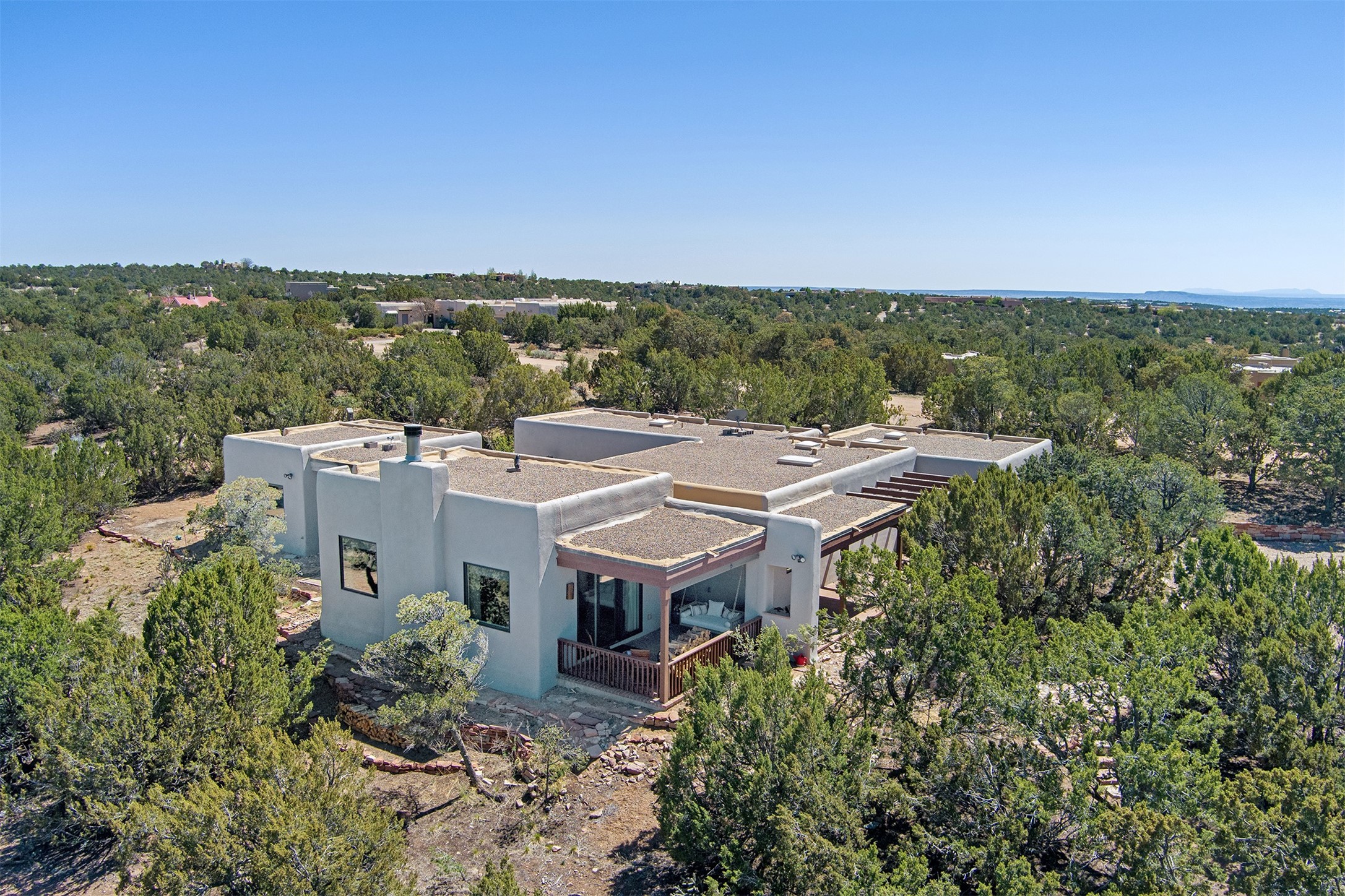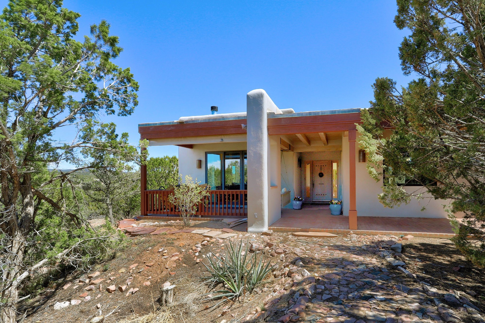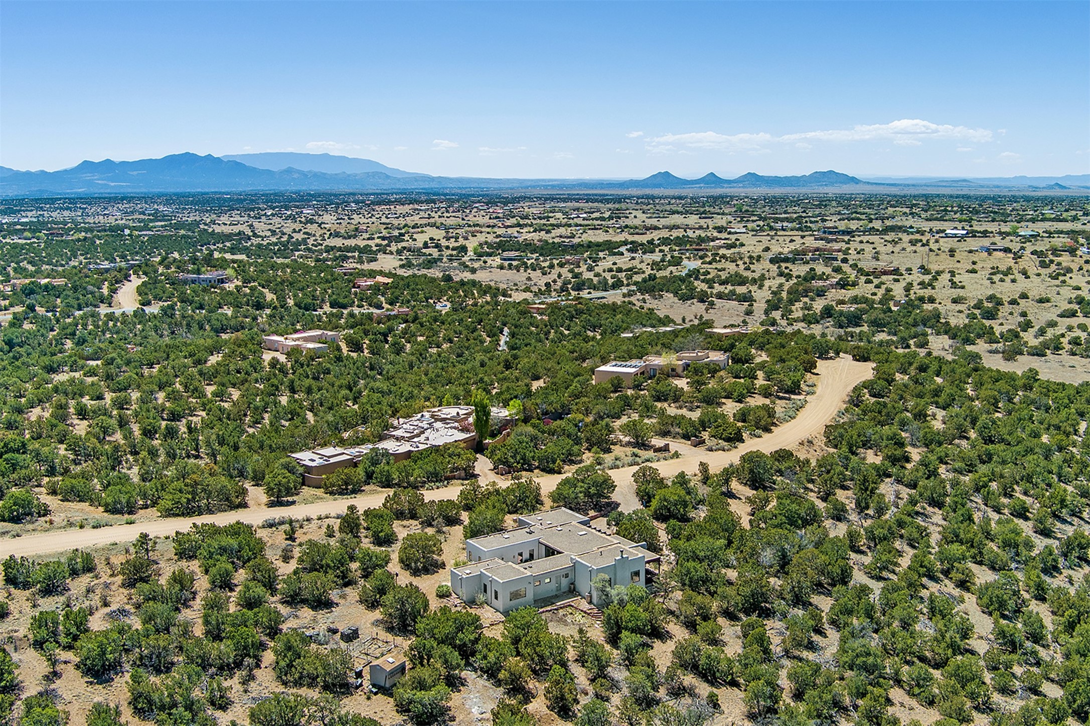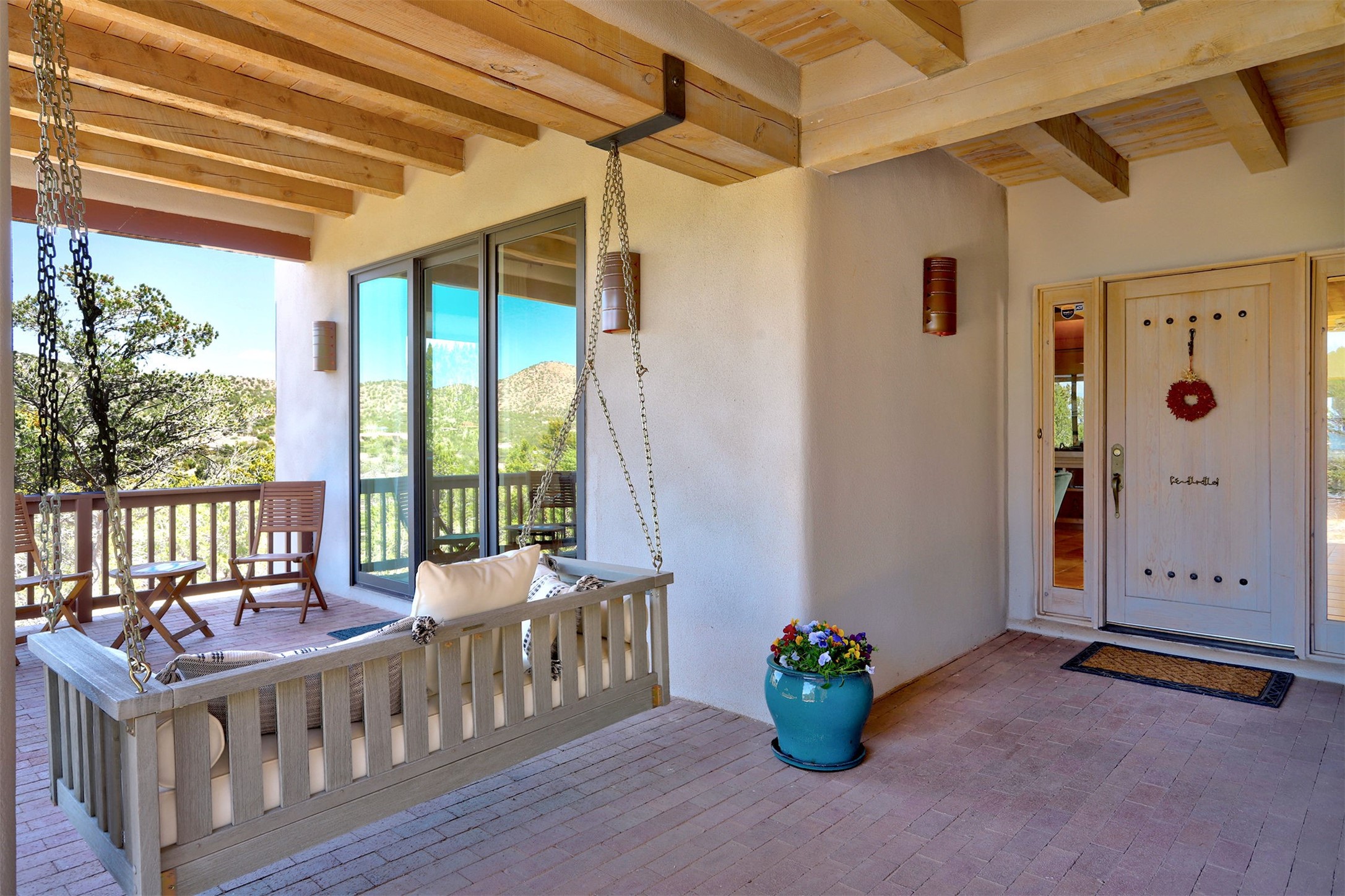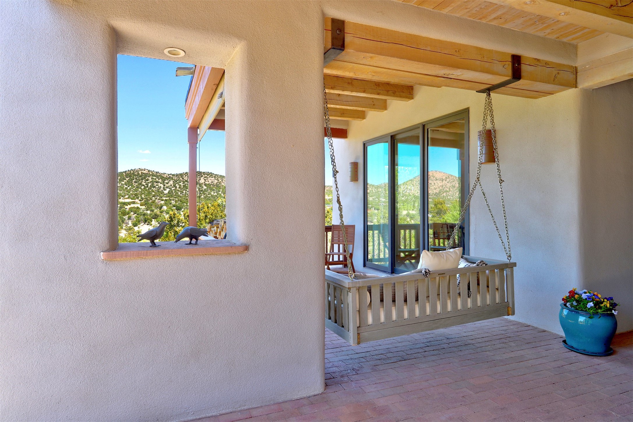This tastefully remodeled, bright, and move-in-ready 2,879 sq ft, 3-bedroom, 2-bathroom single-level home is nestled within the neighborhood The Ridges, a prestigious and serene enclave just ~20 minutes from the heart of Santa Fe. Offering a seamless blend of classic Santa Fe architecture and modern upgrades, every detail is designed for comfort, style, and function.From the moment you arrive, the fresh new stucco exterior and brand-new garage doors hint at the impeccable updates found throughout.Step inside to discover a spacious and airy open floor plan anchored by a custom-built wood-burning kiva fireplace, framed by dramatic beamed ceilings that gracefully flow throughout the entire home, creating a warm, Santa Fe atmosphere.Natural light fills the living spaces through all-new Windsor windows and enlarged sliding doors, offering captivating picture-framed views of the surrounding landscape. Every window feels like a living canvas, inviting Santa Fe's natural beauty indoors. Custom window treatments add a perfect touch of elegance and privacy. Throughout the home, new light fixtures and fresh paint enhance the refined yet cozy ambiance.The charming kitchen and laundry room shine with sleek new quartz countertops and stainless steel appliances, offering a perfect balance of style and functionality.A standout feature is the inviting private inner courtyard, completely reimagined with premium flagstone pavers and a French drain system, creating a tranquil oasis ideal for al fresco dining, entertaining, or simply relaxing under the starry Santa Fe sky.Set on a quiet and picturesque 4-acre lot, the property welcomes two horses. You'll enjoy the perfect balance of natural serenity and modern convenience, with shopping, dining, medical facilities, and Santa Fe's vibrant cultural scene all within easy reach.