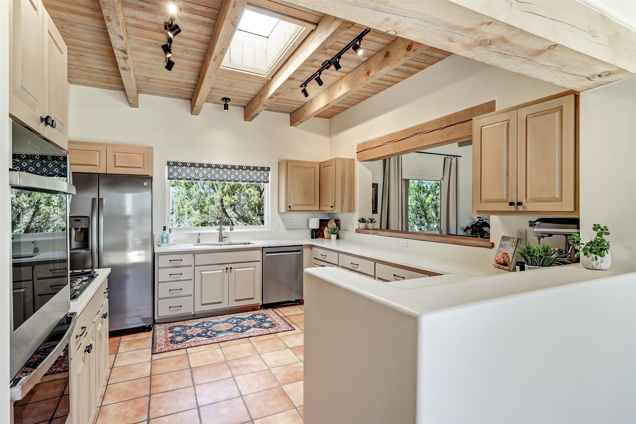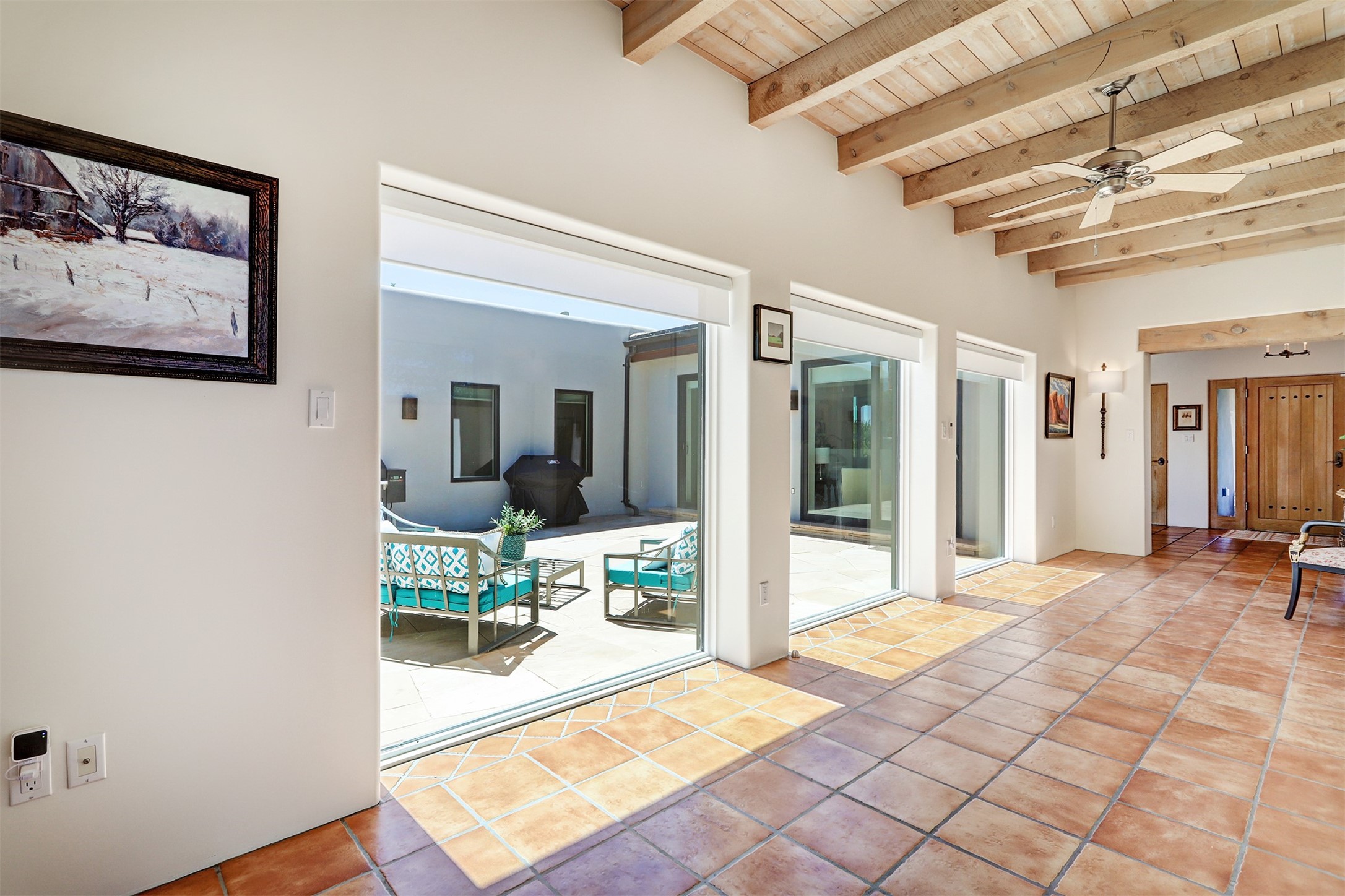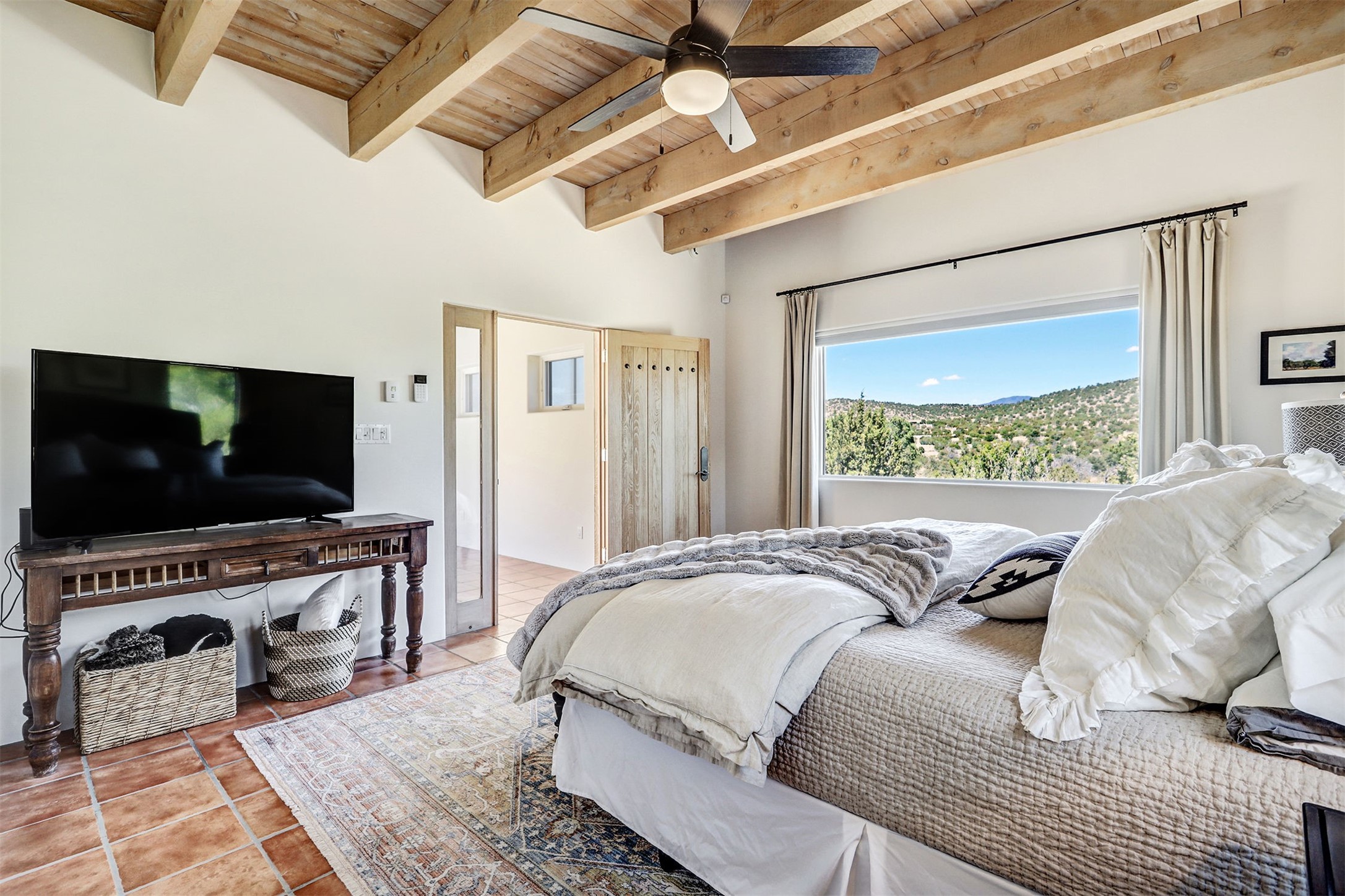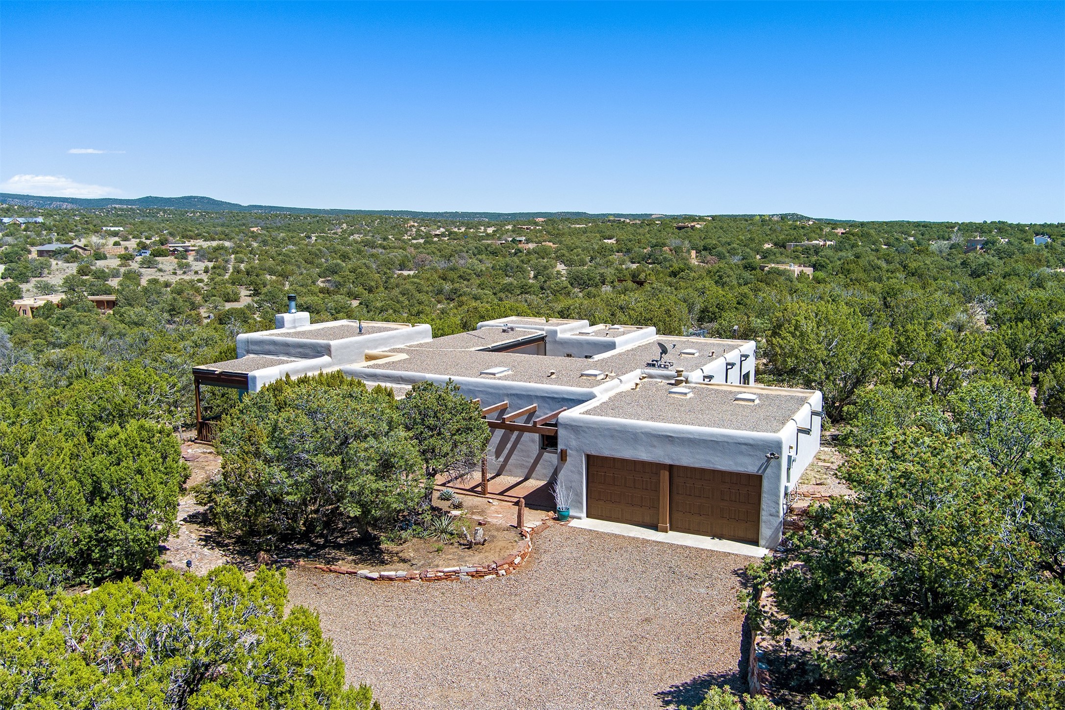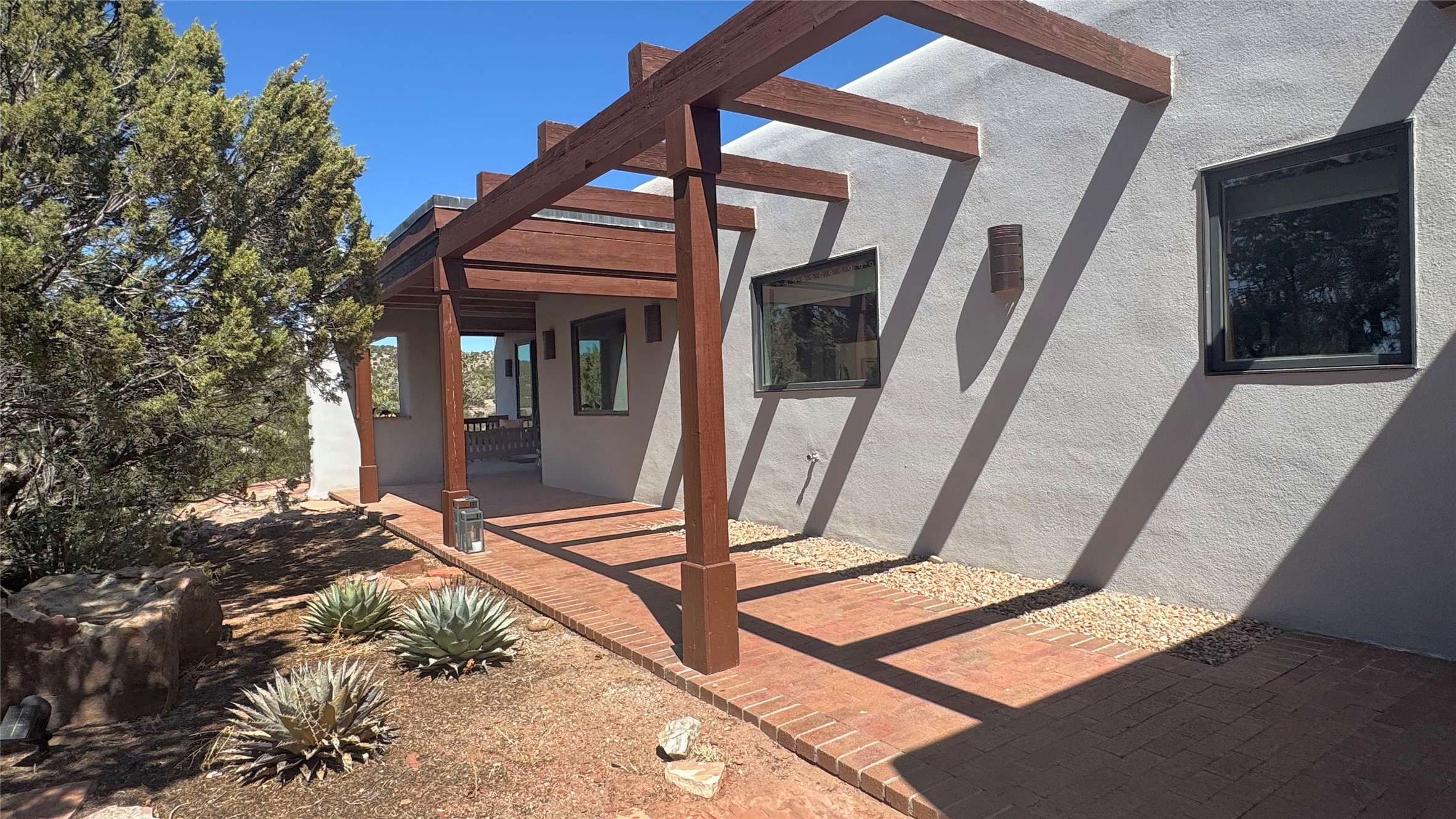 This tastefully remodeled, bright, and move-in-ready 2,879 sq ft, 3-bedroom, 2-bathroom single-level home is nestled within the neighborhood The Ridges, a prestigious and serene enclave just ~20 minutes from the heart of Santa Fe. Offering a seamless blend of classic Santa Fe architecture and modern upgrades, every detail is designed for comfort, style, and function.From the moment you arrive, the fresh new stucco exterior and brand-new garage doors hint at the impeccable updates found throughout.Step inside to discover a spacious and airy open floor plan anchored by a custom-built wood-burning kiva fireplace, framed by dramatic beamed ceilings that gracefully flow throughout the entire home, creating a warm, Santa Fe atmosphere.Natural light fills the living spaces through all-new Windsor windows and enlarged sliding doors, offering captivating picture-framed views of the surrounding landscape. Every window feels like a living canvas, inviting Santa Fe's natural beauty indoors. Custom window treatments add a perfect touch of elegance and privacy. Throughout the home, new light fixtures and fresh paint enhance the refined yet cozy ambiance.The charming kitchen and laundry room shine with sleek new quartz countertops and stainless steel appliances, offering a perfect balance of style and functionality.A standout feature is the inviting private inner courtyard, completely reimagined with premium flagstone pavers and a French drain system, creating a tranquil oasis ideal for al fresco dining, entertaining, or simply relaxing under the starry Santa Fe sky.Set on a quiet and picturesque 4-acre lot, the property welcomes two horses. You'll enjoy the perfect balance of natural serenity and modern convenience, with shopping, dining, medical facilities, and Santa Fe's vibrant cultural scene all within easy reach.