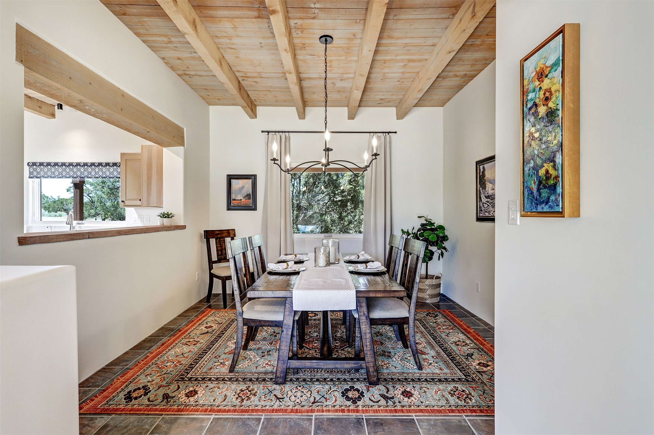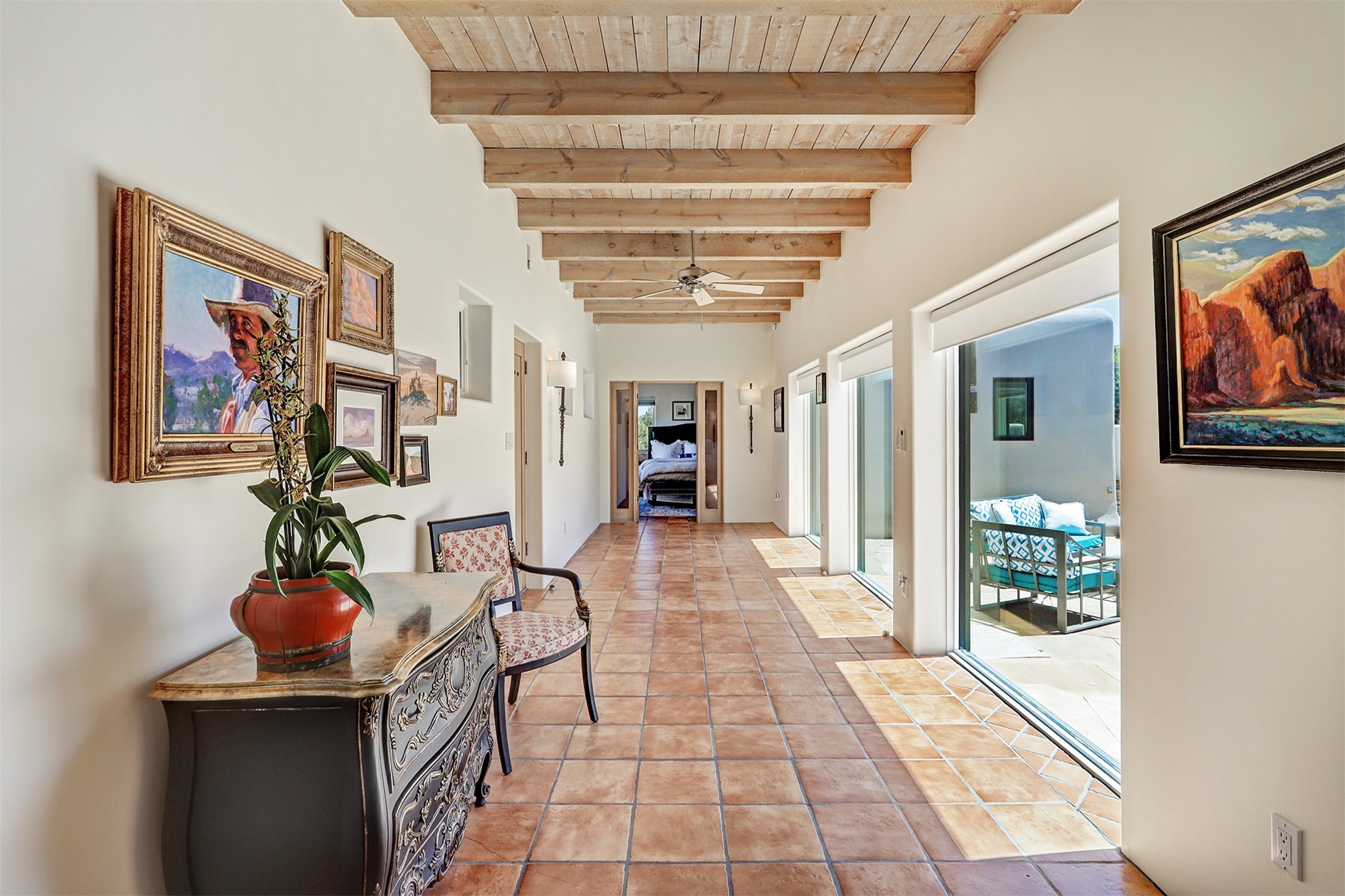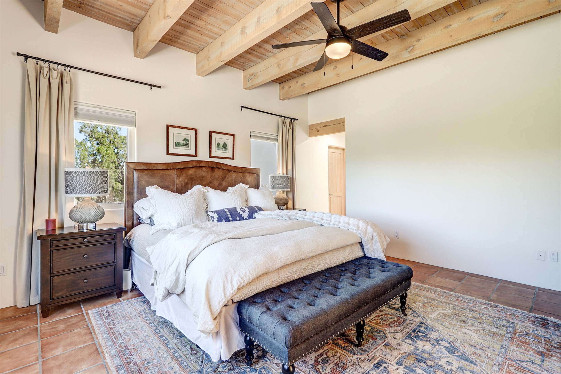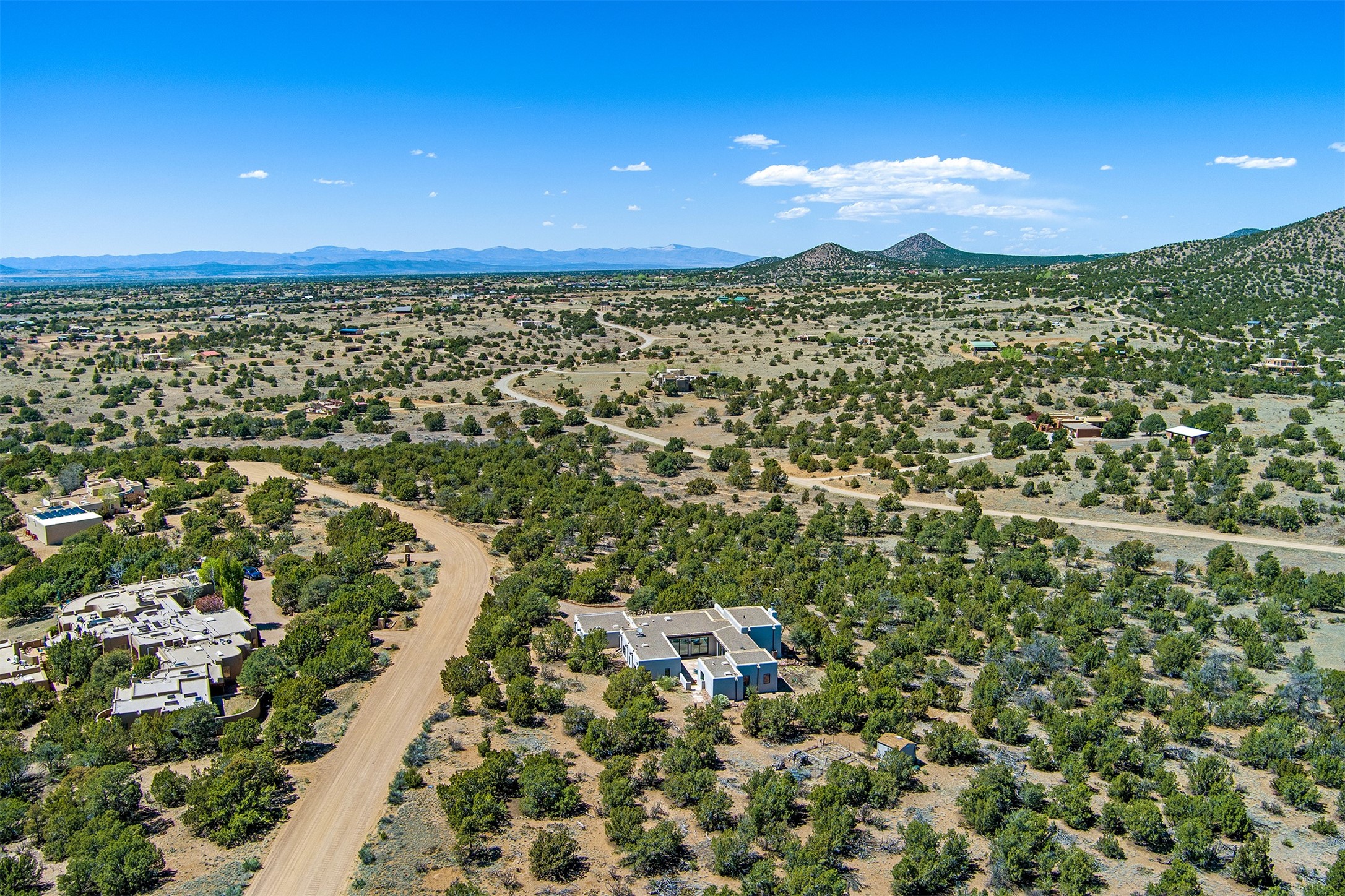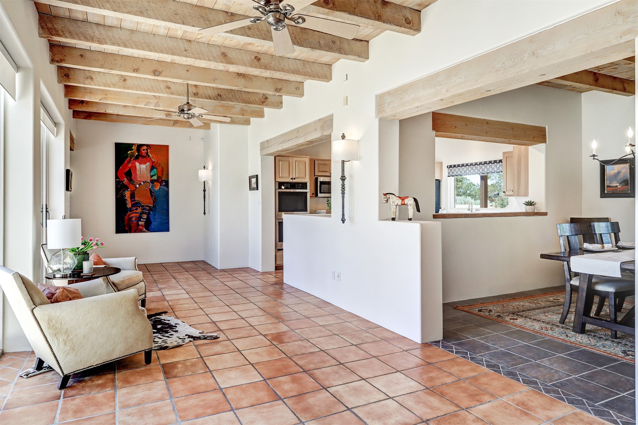 This tastefully remodeled, bright, and move-in-ready 2,879 sq ft, 3-bedroom, 2-bathroom single-level home is nestled within the neighborhood The Ridges, a prestigious and serene enclave just ~20 minutes from the heart of Santa Fe. Offering a seamless blend of classic Santa Fe architecture and modern upgrades, every detail is designed for comfort, style, and function.From the moment you arrive, the fresh new stucco exterior and brand-new garage doors hint at the impeccable updates found throughout.Step inside to discover a spacious and airy open floor plan anchored by a custom-built wood-burning kiva fireplace, framed by dramatic beamed ceilings that gracefully flow throughout the entire home, creating a warm, Santa Fe atmosphere.Natural light fills the living spaces through all-new Windsor windows and enlarged sliding doors, offering captivating picture-framed views of the surrounding landscape. Every window feels like a living canvas, inviting Santa Fe's natural beauty indoors. Custom window treatments add a perfect touch of elegance and privacy. Throughout the home, new light fixtures and fresh paint enhance the refined yet cozy ambiance.The charming kitchen and laundry room shine with sleek new quartz countertops and stainless steel appliances, offering a perfect balance of style and functionality.A standout feature is the inviting private inner courtyard, completely reimagined with premium flagstone pavers and a French drain system, creating a tranquil oasis ideal for al fresco dining, entertaining, or simply relaxing under the starry Santa Fe sky.Set on a quiet and picturesque 4-acre lot, the property welcomes two horses. You'll enjoy the perfect balance of natural serenity and modern convenience, with shopping, dining, medical facilities, and Santa Fe's vibrant cultural scene all within easy reach.