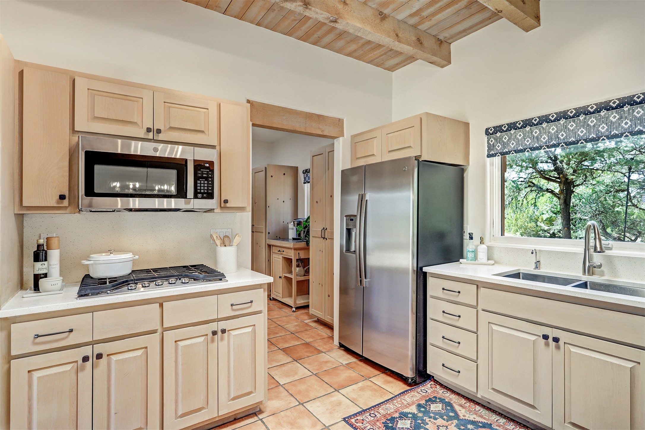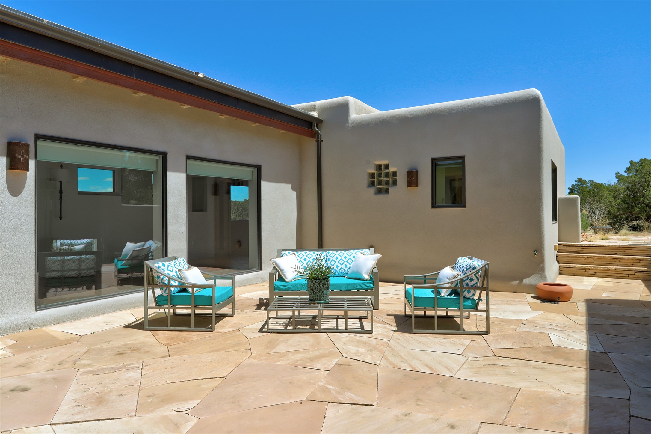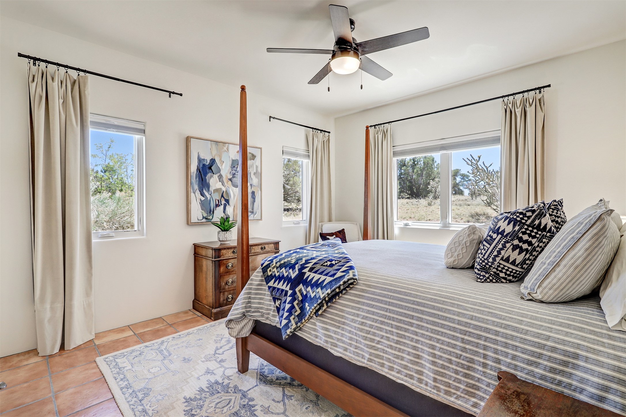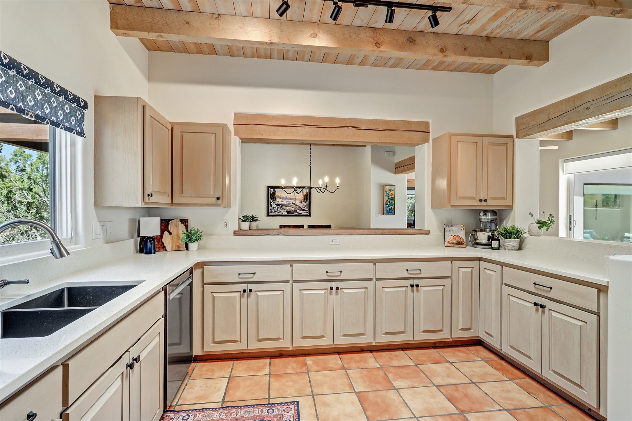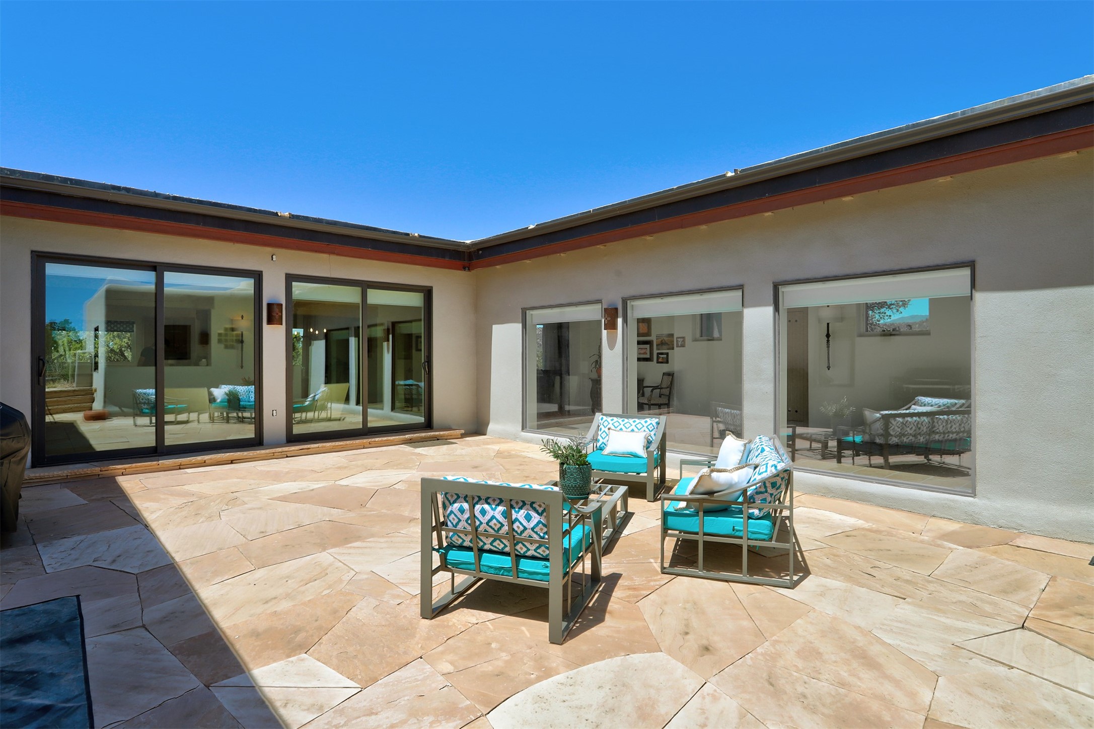 This tastefully remodeled, bright, and move-in-ready 2,879 sq ft, 3-bedroom, 2-bathroom single-level home is nestled within the neighborhood The Ridges, a prestigious and serene enclave just ~20 minutes from the heart of Santa Fe. Offering a seamless blend of classic Santa Fe architecture and modern upgrades, every detail is designed for comfort, style, and function.From the moment you arrive, the fresh new stucco exterior and brand-new garage doors hint at the impeccable updates found throughout.Step inside to discover a spacious and airy open floor plan anchored by a custom-built wood-burning kiva fireplace, framed by dramatic beamed ceilings that gracefully flow throughout the entire home, creating a warm, Santa Fe atmosphere.Natural light fills the living spaces through all-new Windsor windows and enlarged sliding doors, offering captivating picture-framed views of the surrounding landscape. Every window feels like a living canvas, inviting Santa Fe's natural beauty indoors. Custom window treatments add a perfect touch of elegance and privacy. Throughout the home, new light fixtures and fresh paint enhance the refined yet cozy ambiance.The charming kitchen and laundry room shine with sleek new quartz countertops and stainless steel appliances, offering a perfect balance of style and functionality.A standout feature is the inviting private inner courtyard, completely reimagined with premium flagstone pavers and a French drain system, creating a tranquil oasis ideal for al fresco dining, entertaining, or simply relaxing under the starry Santa Fe sky.Set on a quiet and picturesque 4-acre lot, the property welcomes two horses. You'll enjoy the perfect balance of natural serenity and modern convenience, with shopping, dining, medical facilities, and Santa Fe's vibrant cultural scene all within easy reach.