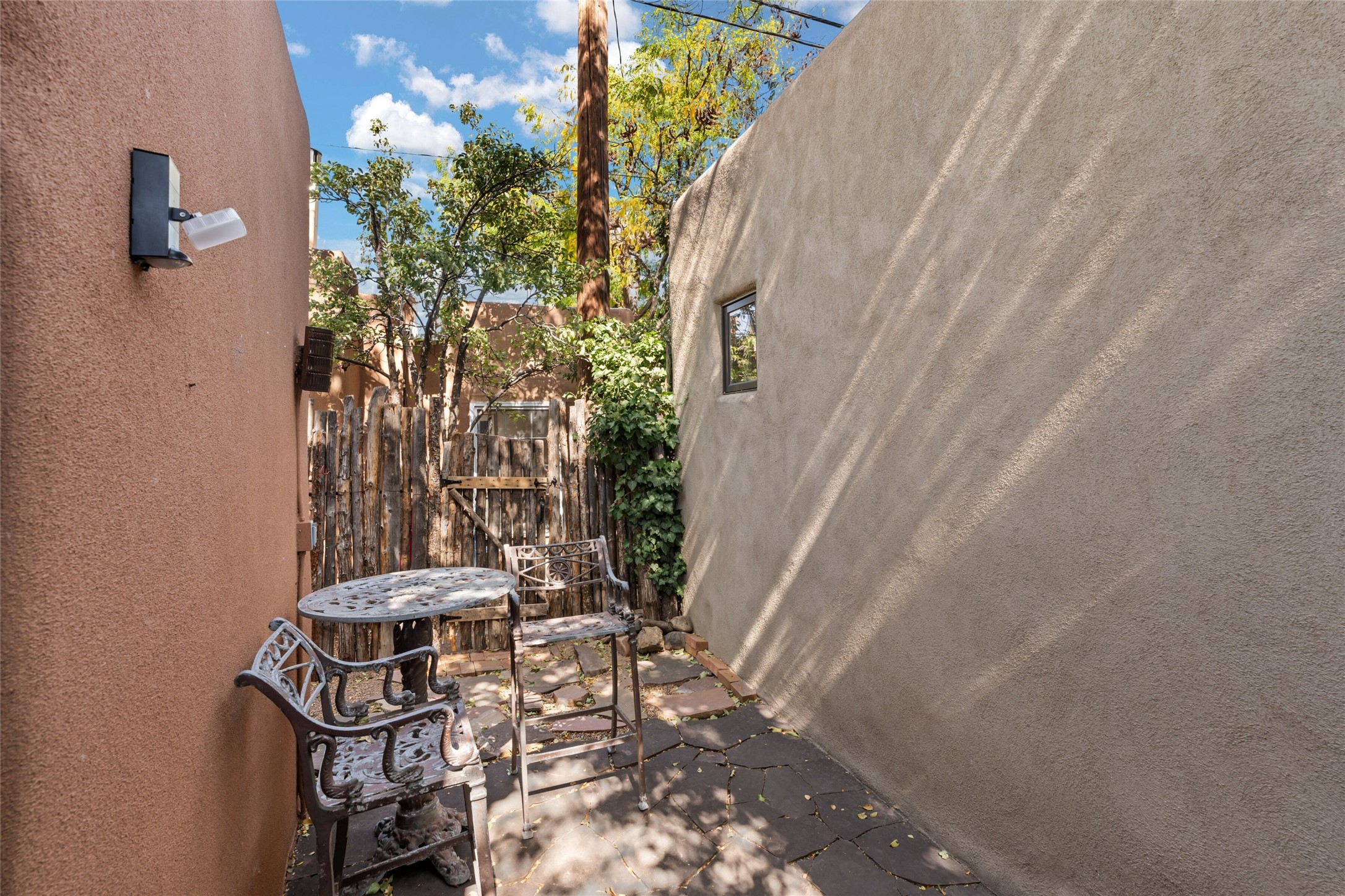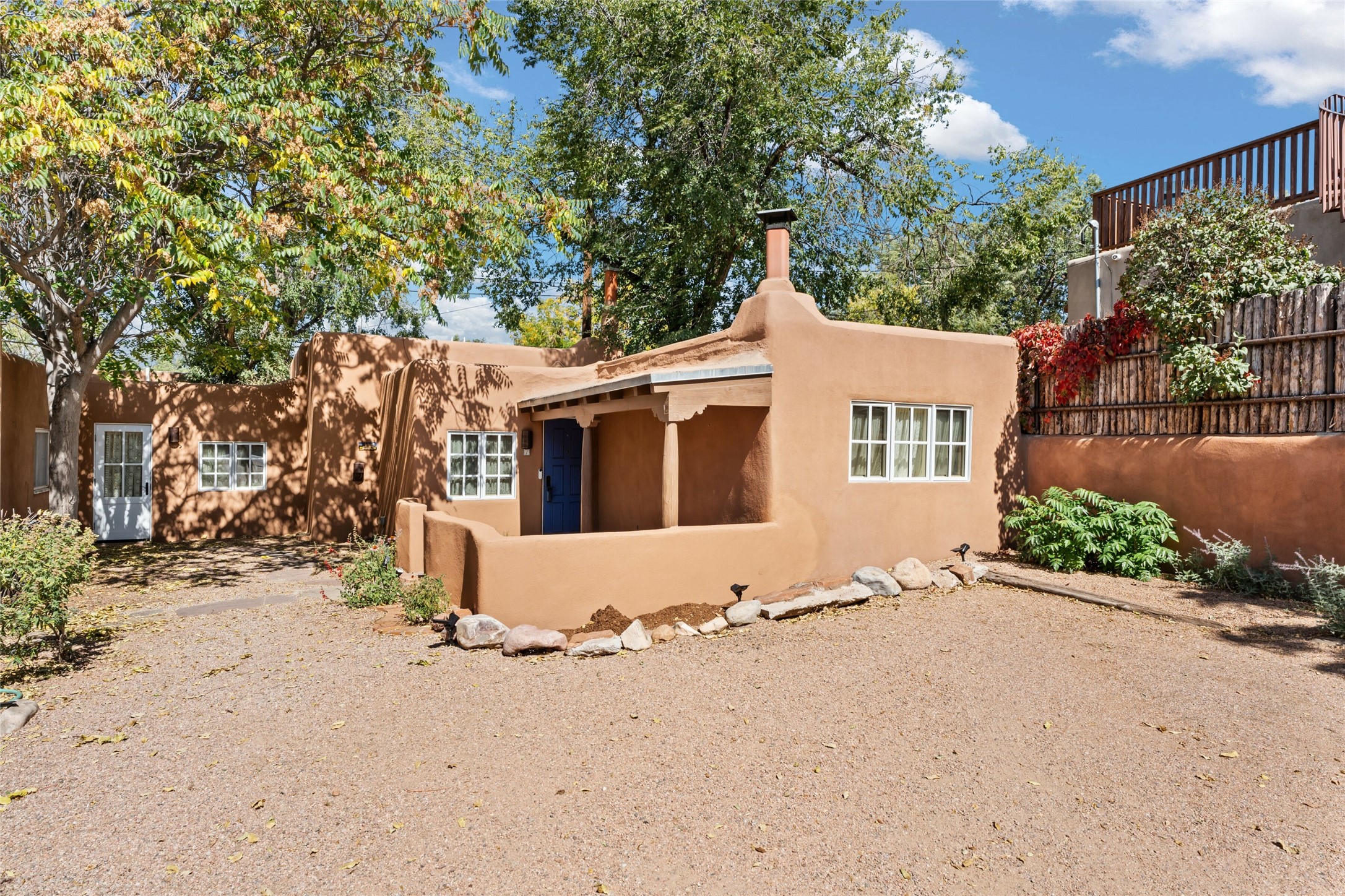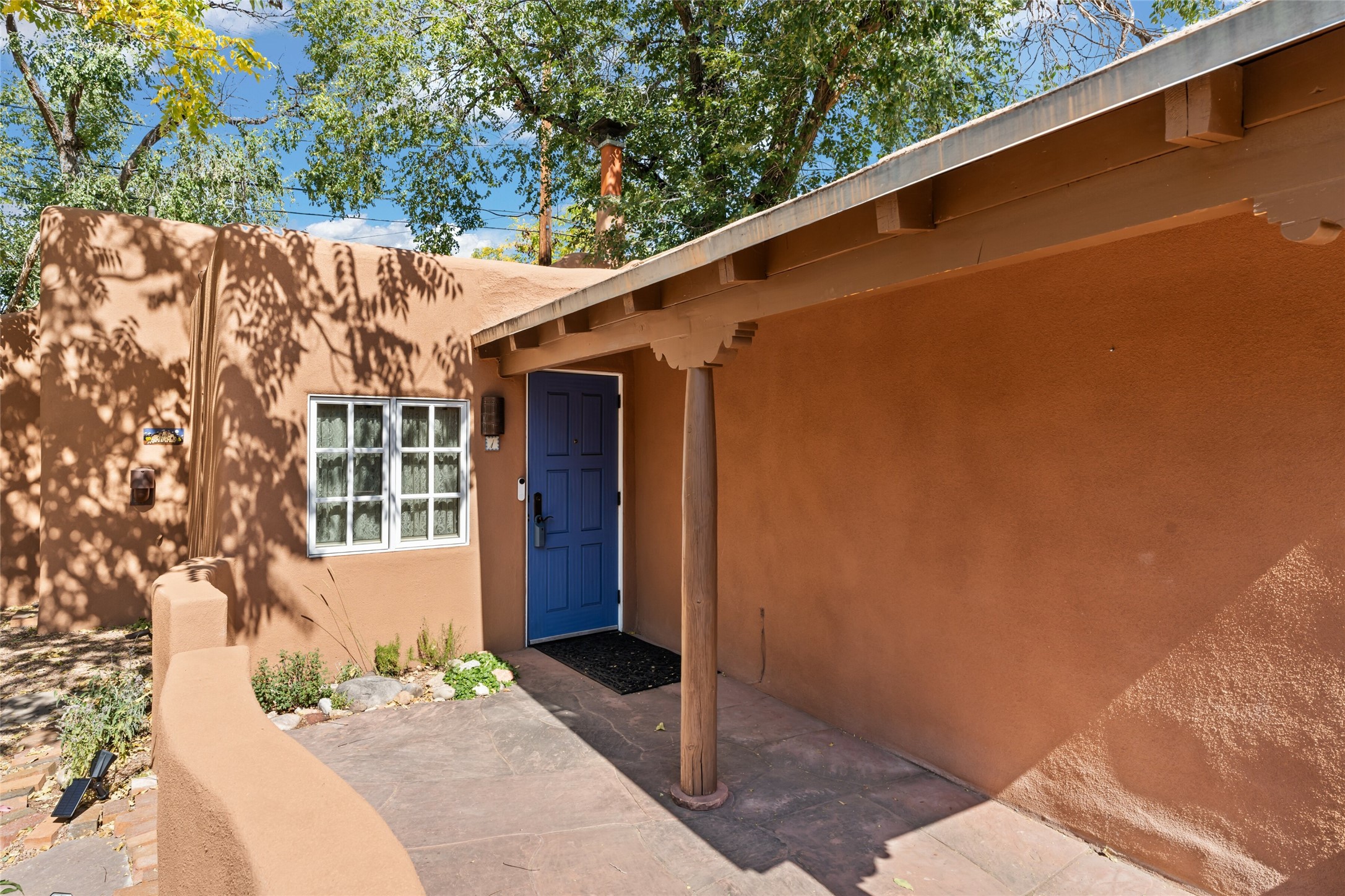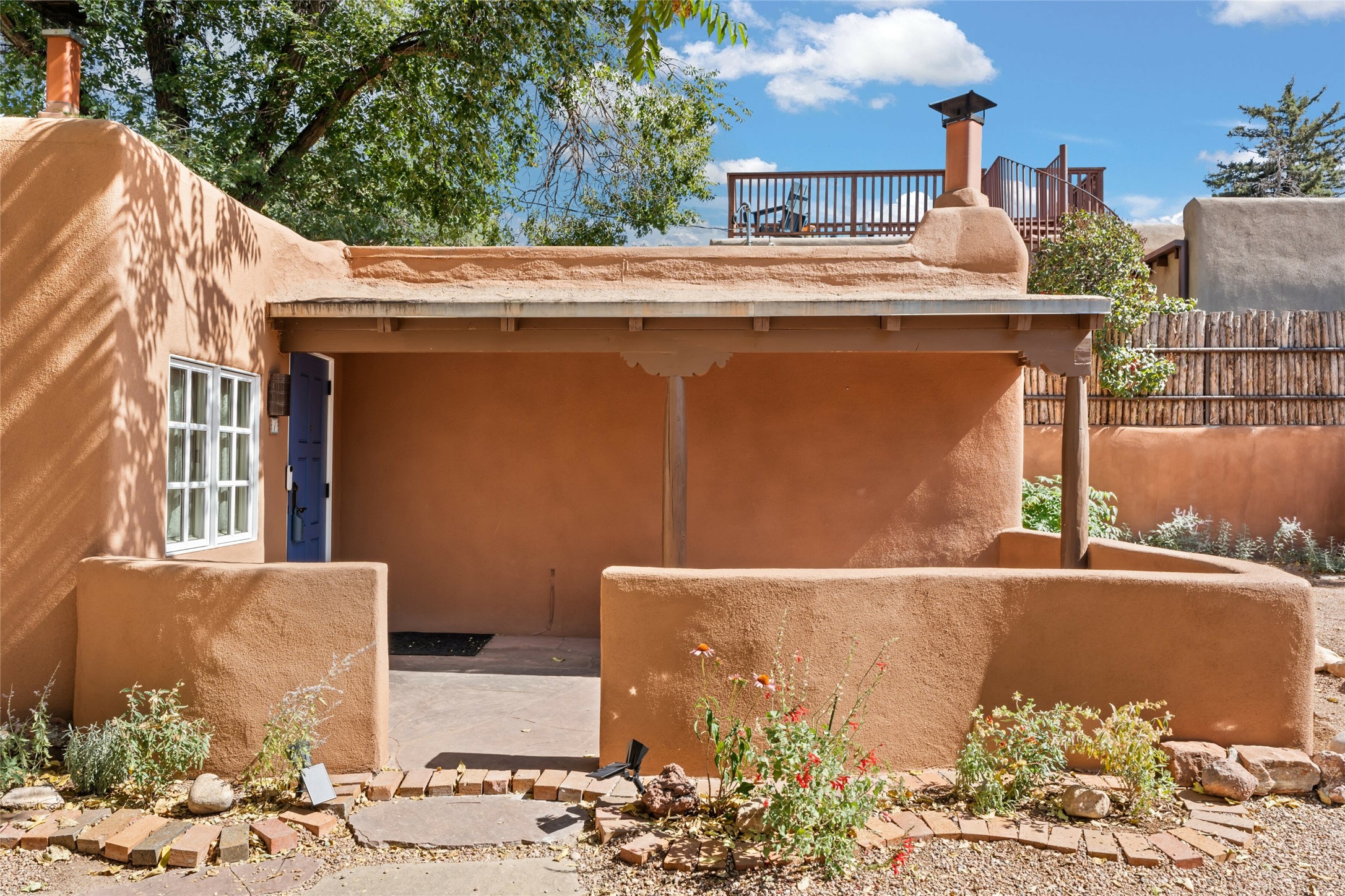 Perfectly redone, perfectly located and perfectly charming, this one bedroom one bath condo is oozing Santa Fe style, while just blocks from the Plaza and steps from Ft. Marcy Park with swimming, walking, playground and pickle ball! One of 3 condos in this little compound on Artist, the casita has had the roof raised with new roof and insulation, not to mention fabulous vigas, beautiful chandeliers and recessed lighting, with upgraded electrical wiring in the house. Most everything has a fresh coat of paint, and the floors are now antique brick except in the kitchen and bath. Both the living room and the bedroom enjoy corner kiva fireplaces, for cozy Santa Fe night ambiance . The kitchen is whimsical and functional, with plenty of storage and a new vintage looking matching fridge, new dishwasher and microwave; and the washer and dryer are also new! There are two outdoor spaces to enjoy - the front entry with it's sunny South face and new 3 ft wall and flower beds, and the shady summer side patio with a new coyote fence and good privacy is the perfect cool summer alfresco dining spot!