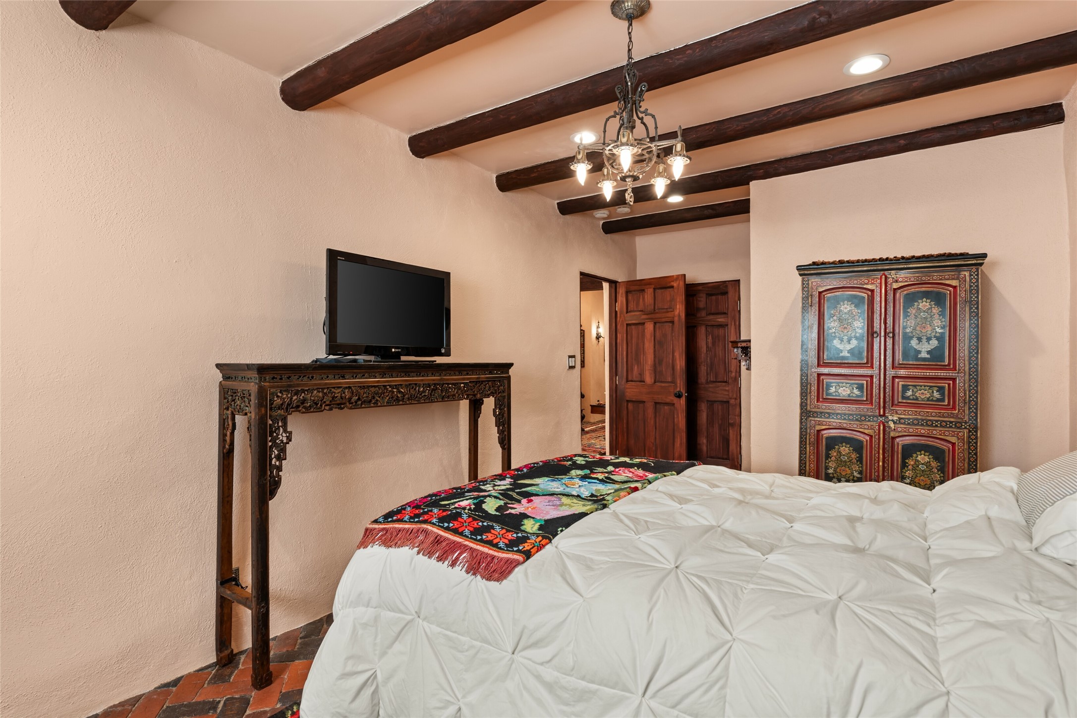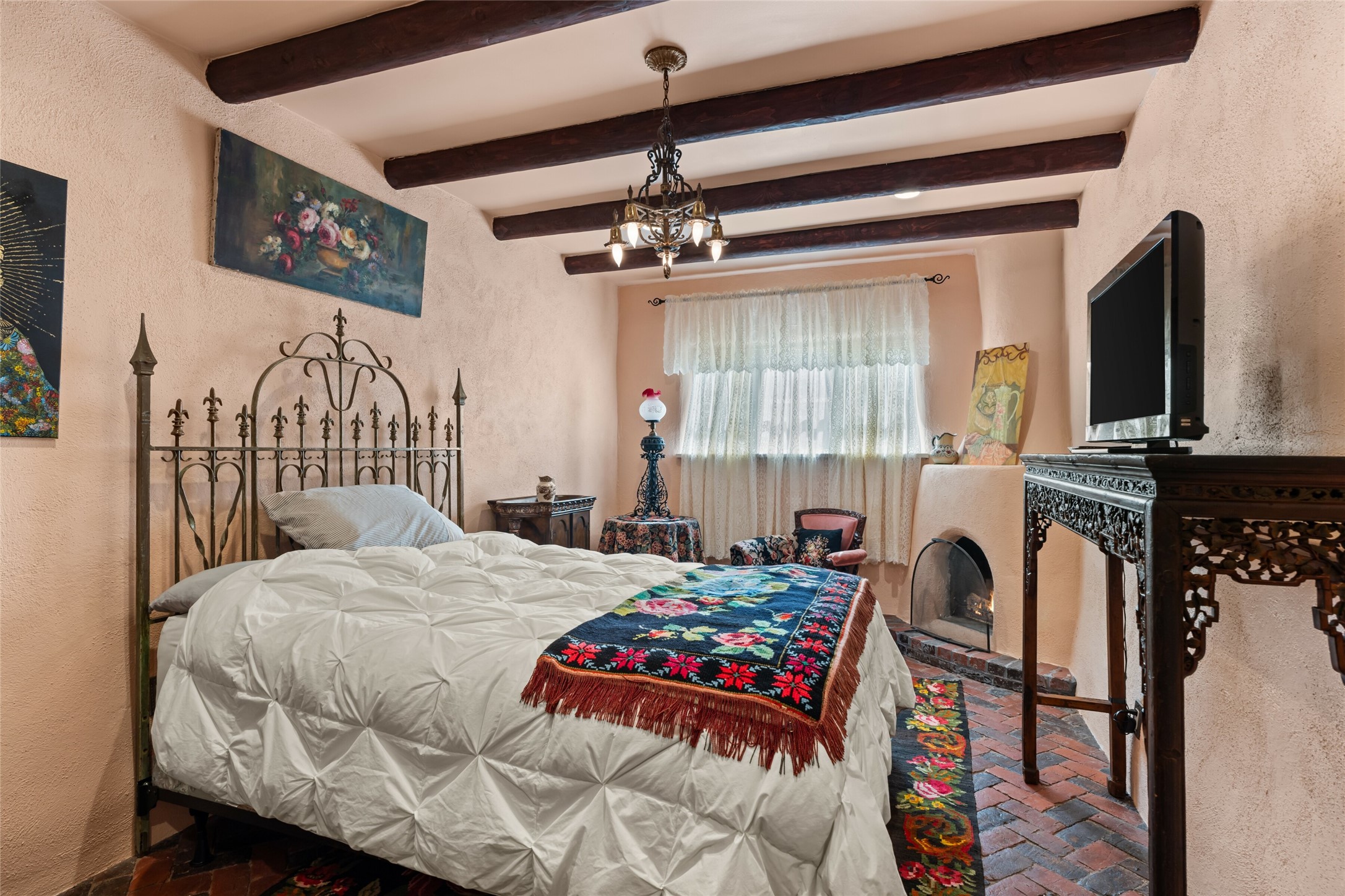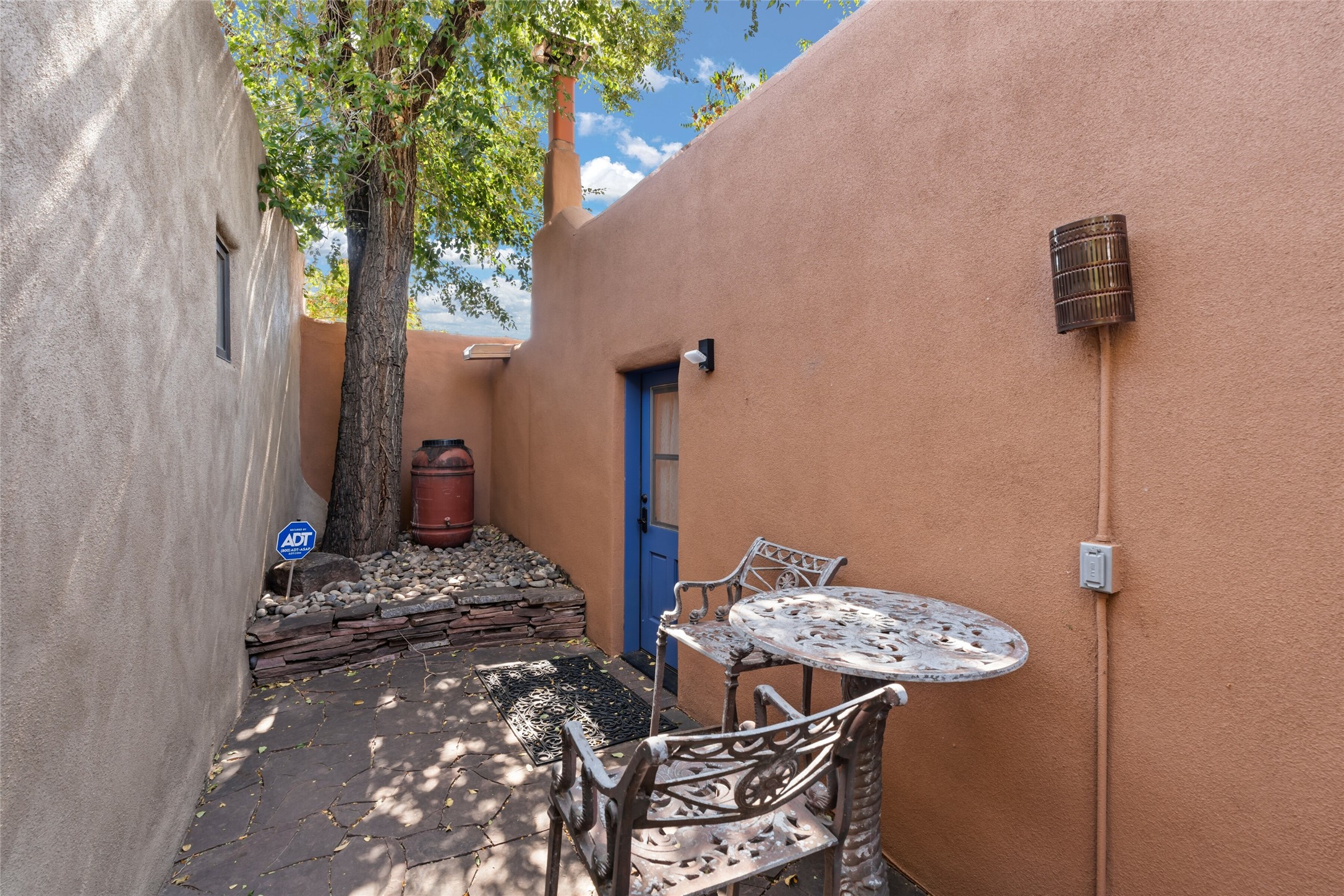 Perfectly redone, perfectly located and perfectly charming, this one bedroom one bath condo is oozing Santa Fe style, while just blocks from the Plaza and steps from Ft. Marcy Park with swimming, walking, playground and pickle ball! One of 3 condos in this little compound on Artist, the casita has had the roof raised with new roof and insulation, not to mention fabulous vigas, beautiful chandeliers and recessed lighting, with upgraded electrical wiring in the house. Most everything has a fresh coat of paint, and the floors are now antique brick except in the kitchen and bath. Both the living room and the bedroom enjoy corner kiva fireplaces, for cozy Santa Fe night ambiance . The kitchen is whimsical and functional, with plenty of storage and a new vintage looking matching fridge, new dishwasher and microwave; and the washer and dryer are also new! There are two outdoor spaces to enjoy - the front entry with it's sunny South face and new 3 ft wall and flower beds, and the shady summer side patio with a new coyote fence and good privacy is the perfect cool summer alfresco dining spot!