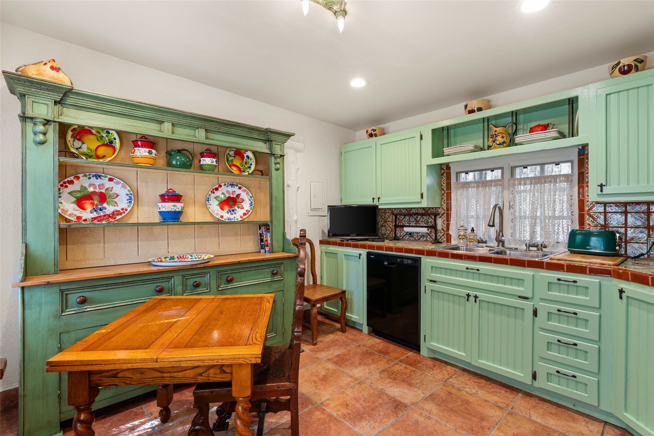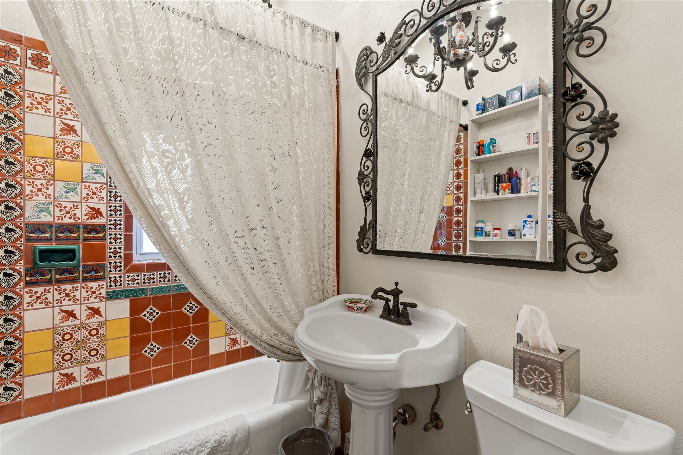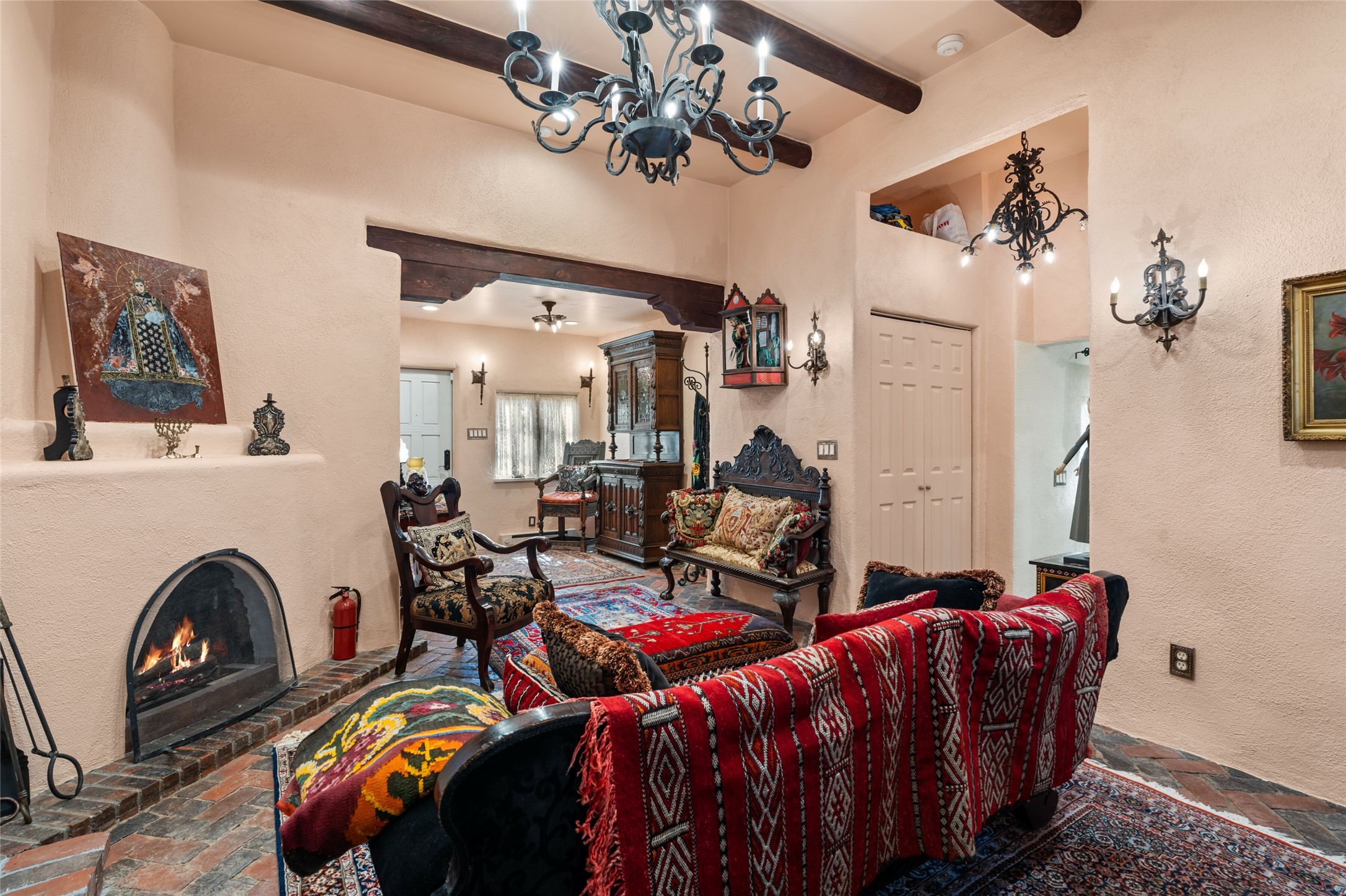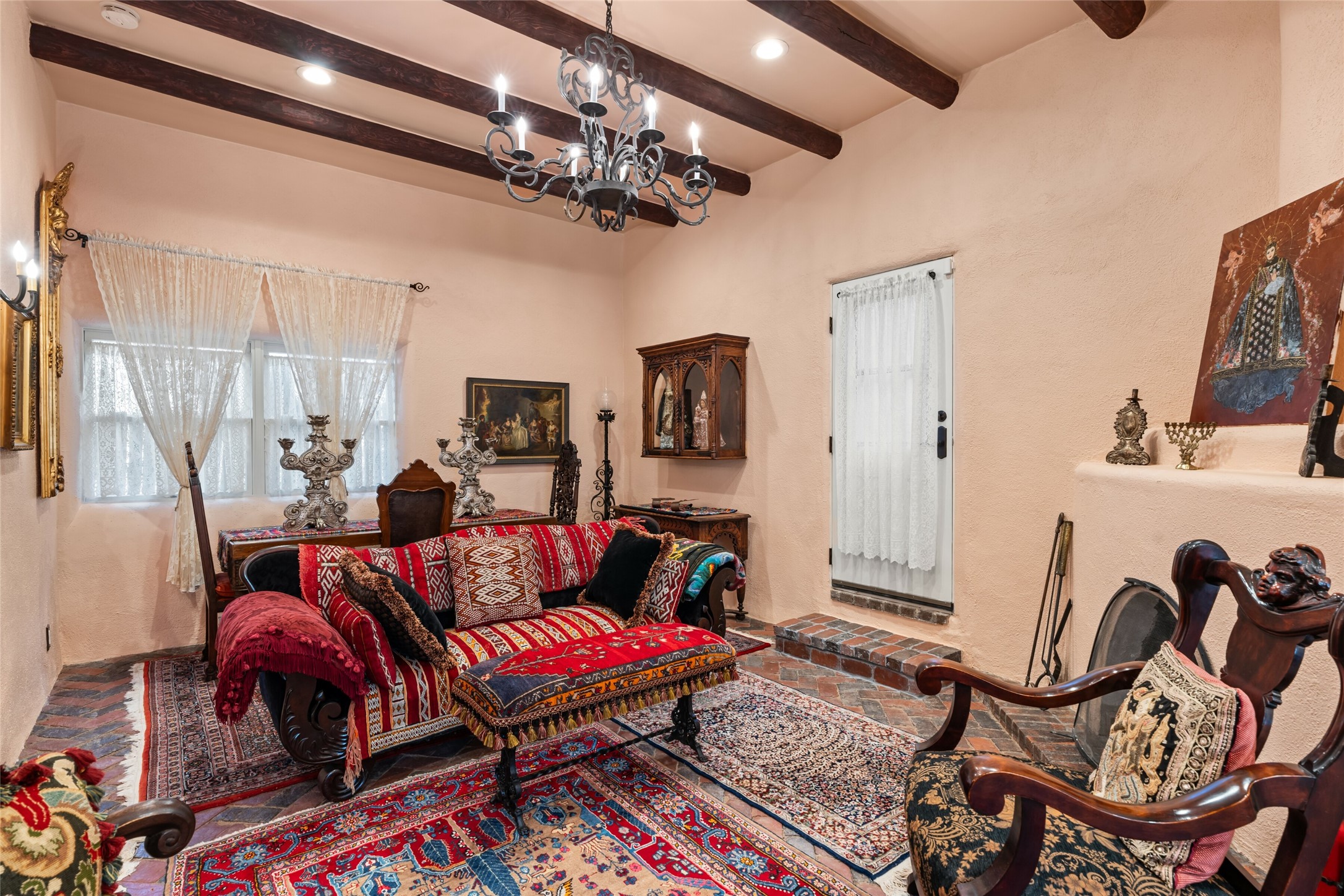 Perfectly redone, perfectly located and perfectly charming, this one bedroom one bath condo is oozing Santa Fe style, while just blocks from the Plaza and steps from Ft. Marcy Park with swimming, walking, playground and pickle ball! One of 3 condos in this little compound on Artist, the casita has had the roof raised with new roof and insulation, not to mention fabulous vigas, beautiful chandeliers and recessed lighting, with upgraded electrical wiring in the house. Most everything has a fresh coat of paint, and the floors are now antique brick except in the kitchen and bath. Both the living room and the bedroom enjoy corner kiva fireplaces, for cozy Santa Fe night ambiance . The kitchen is whimsical and functional, with plenty of storage and a new vintage looking matching fridge, new dishwasher and microwave; and the washer and dryer are also new! There are two outdoor spaces to enjoy - the front entry with it's sunny South face and new 3 ft wall and flower beds, and the shady summer side patio with a new coyote fence and good privacy is the perfect cool summer alfresco dining spot!
