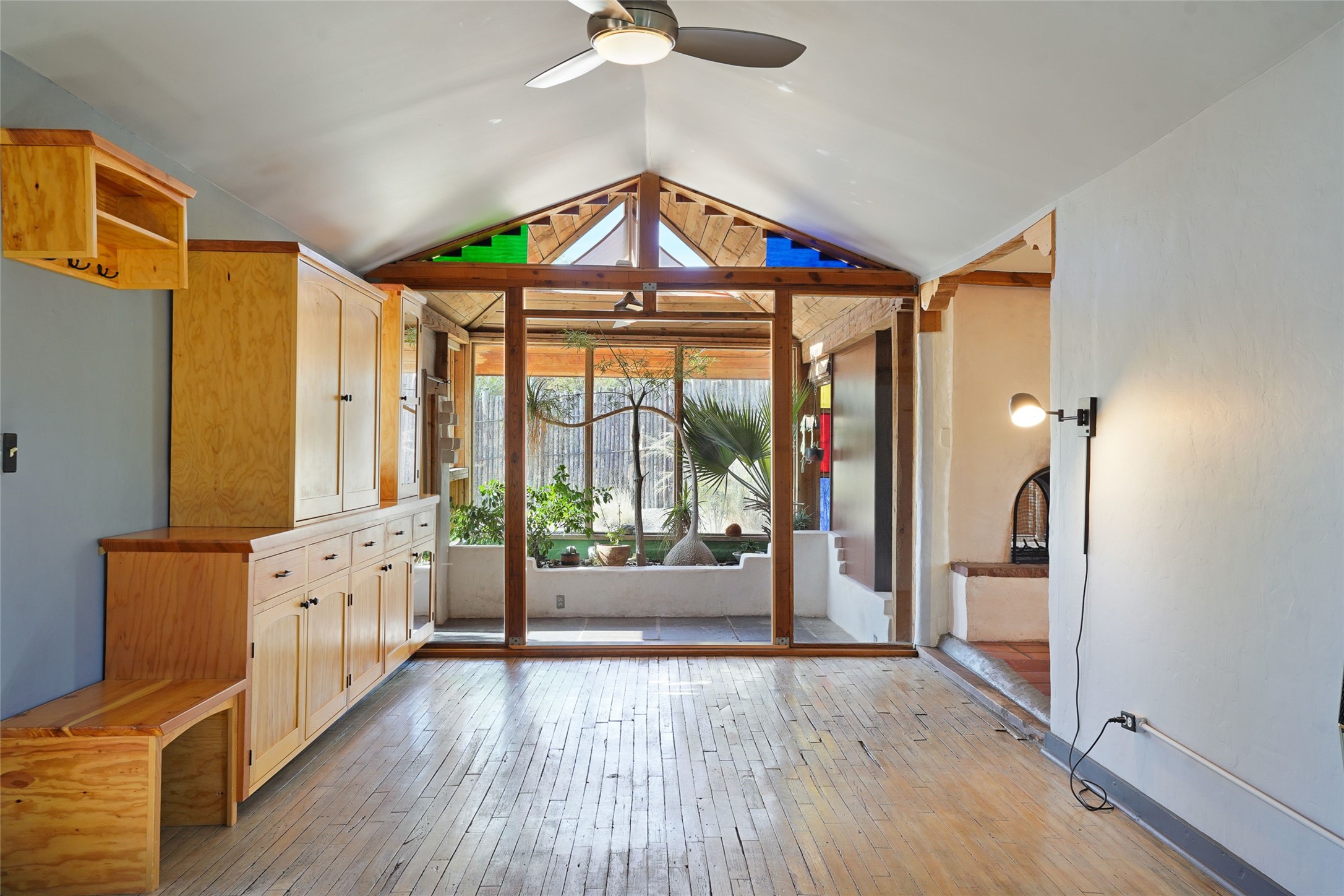 Nestled in the heart of historic Madrid village and close to the County greenbelt, this unique .64-acre property offers a blend of charm and functionality. It features a 972-square-foot artistic main home, a 443-square-foot studio complete bath with shower and sink, and a bright, spacious 750-square-foot workshop. The workshop is equipped with a wood stove for heating and a mini-split system that also provides heating and cooling. The main home showcases partial adobe construction, a sunlit atrium, a two-way kiva fireplace, and a bathroom featuring a clawfoot tub. The property consists of two legally recorded lots. Both the studio and the main house open to an expansive fenced yard with secure coyote fencing, ideal for pets. Just off the kitchen's patio doors lies a tranquil patio space, adding to the peaceful ambiance. This property is part of a lively, creative community with coffee shop, galleries, restaurants, and a general store--all within walking distance. Its location offers convenient access to Albuquerque and Santa Fe via the scenic Turquoise Trail. A perfect blend of artistry, community, and work-at-home possibilities awaits.