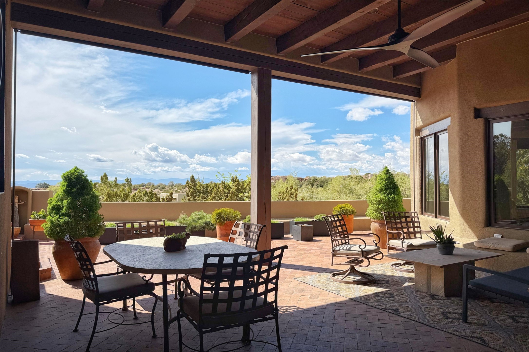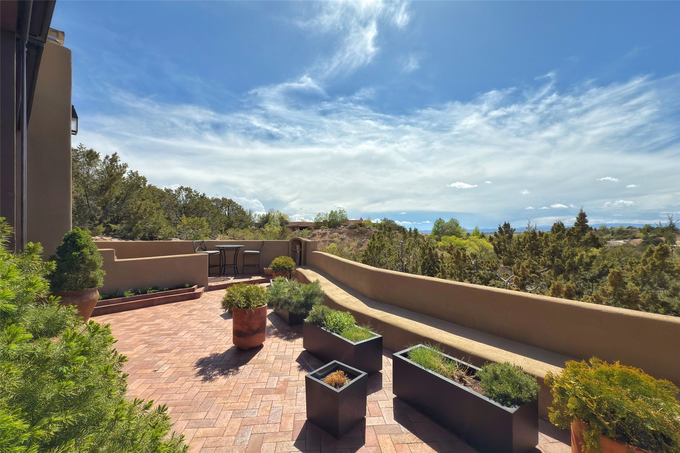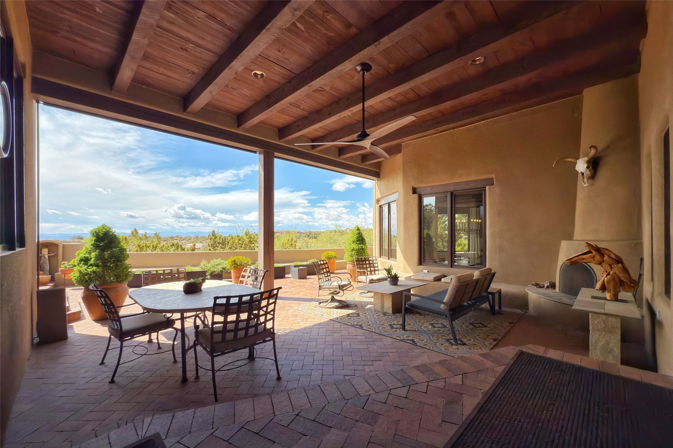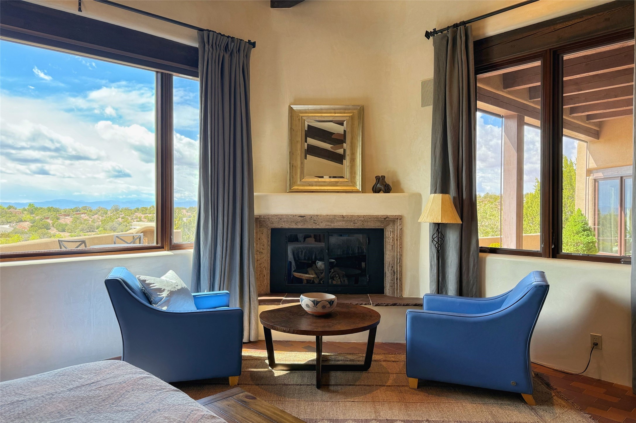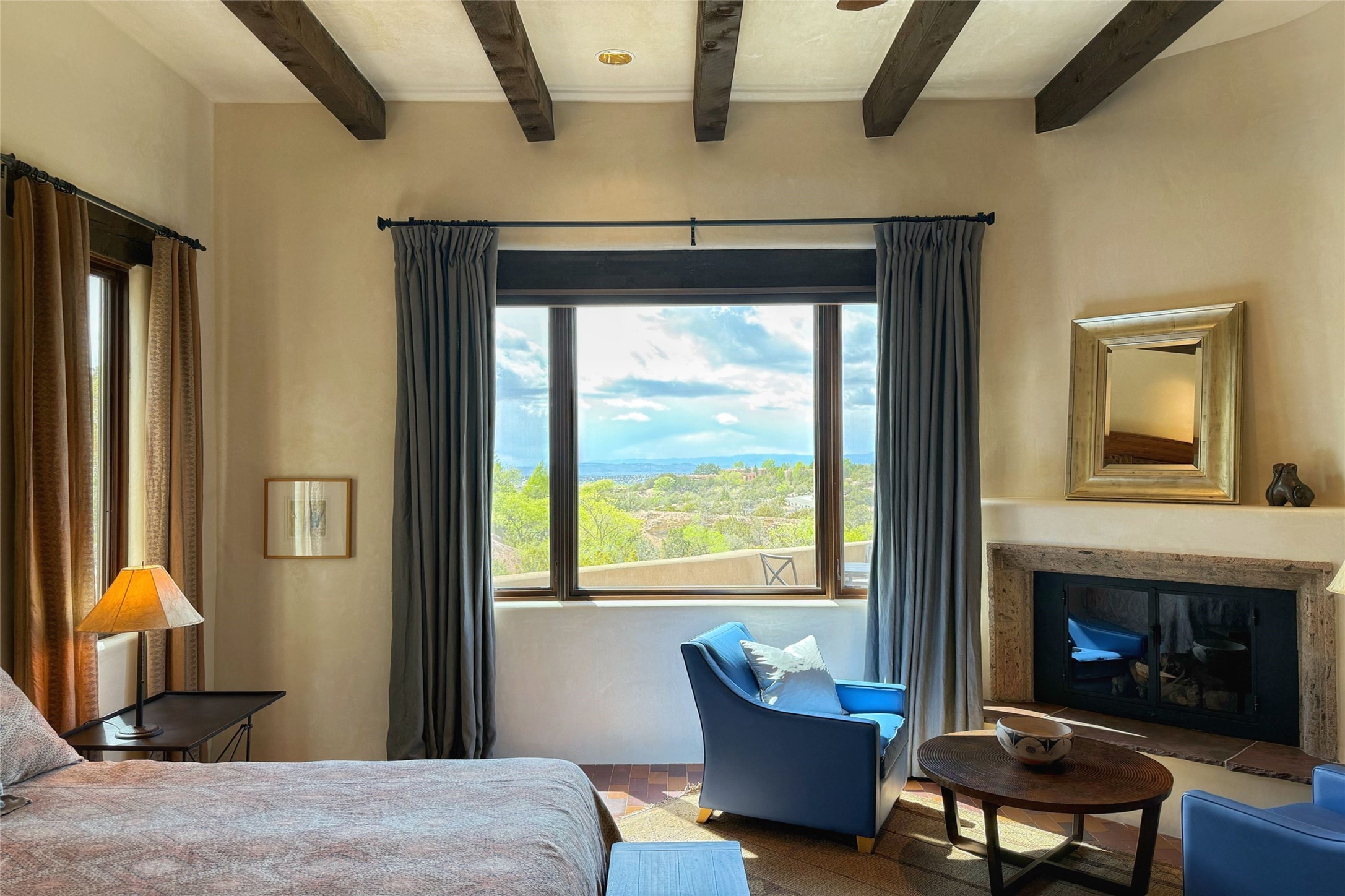 Elegant Foothills Estate with Sangre and Jemez Mountain Views in La CanteraThis exceptional residence is nestled within the prestigious, gated enclave of La Cantera--just moments from the world-class galleries and dining of Canyon Road and the Plaza. Designed for refined living and grand-scale entertaining, the home blends traditional Santa Fe architecture with timeless luxury and sweeping mountain vistas.Enter into a gated courtyard with mature landscaping. A gracious reception and a dramatic gallery hallway lead to an expansive great room with soaring beamed ceilings, one of five fireplaces, and panoramic views. The heart of the home is a spacious open-concept kitchen and dining area, offering breathtaking landscape views. Multiple outdoor living spaces, including a portal with fireplace are ideal for alfresco dining or sunset gatherings. The generous primary suite features a cozy fireplace, walk-in closet, sitting room, and courtyard access. Guests are accommodated in an ensuite bedroom with fireplace and private courtyard. The large studio, currently used as a gym, is ensuite and has a north-facing picture window. There is also outside entry making this space perfect for additional guests or an office. More highlights include a versatile media/office room ensuite with an adjoining sunroom, a wet bar with adjacent wine storage space, a cozy breakfast room, and a workshop off the garage.Set on a private, beautifully landscaped lot with mature trees and tranquil outdoor spaces, this is a rare opportunity to own a remarkable residence in one of Santa Fe's most sought-after communities.