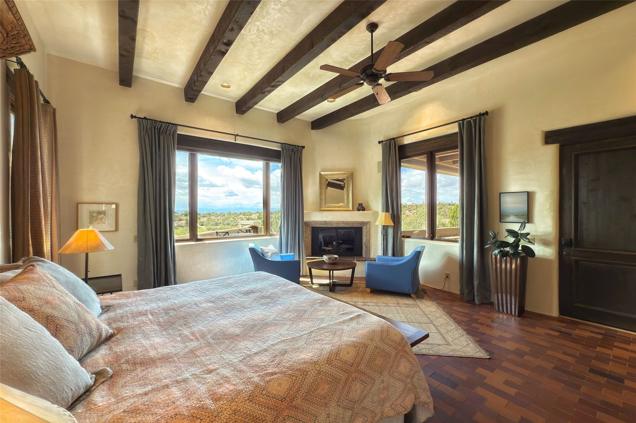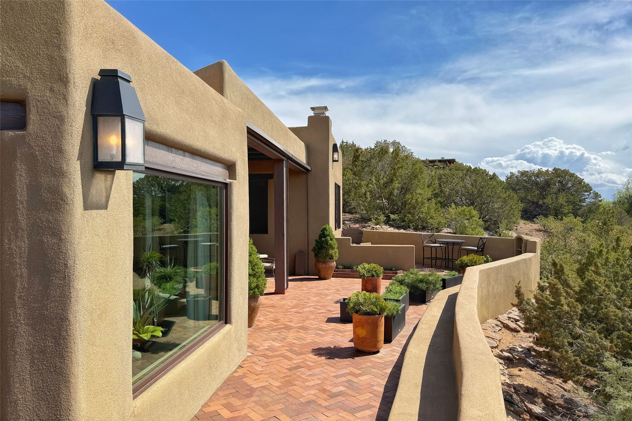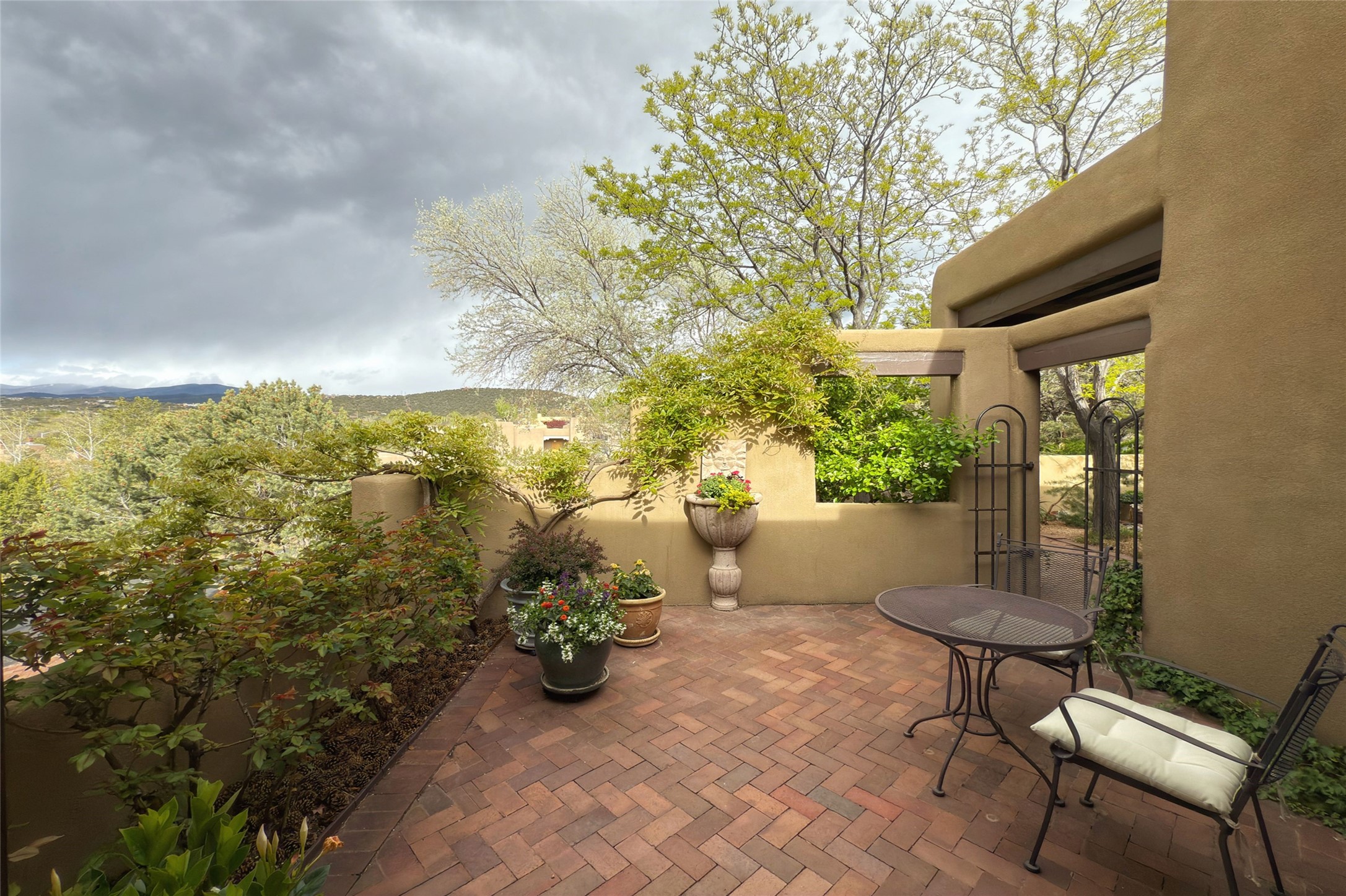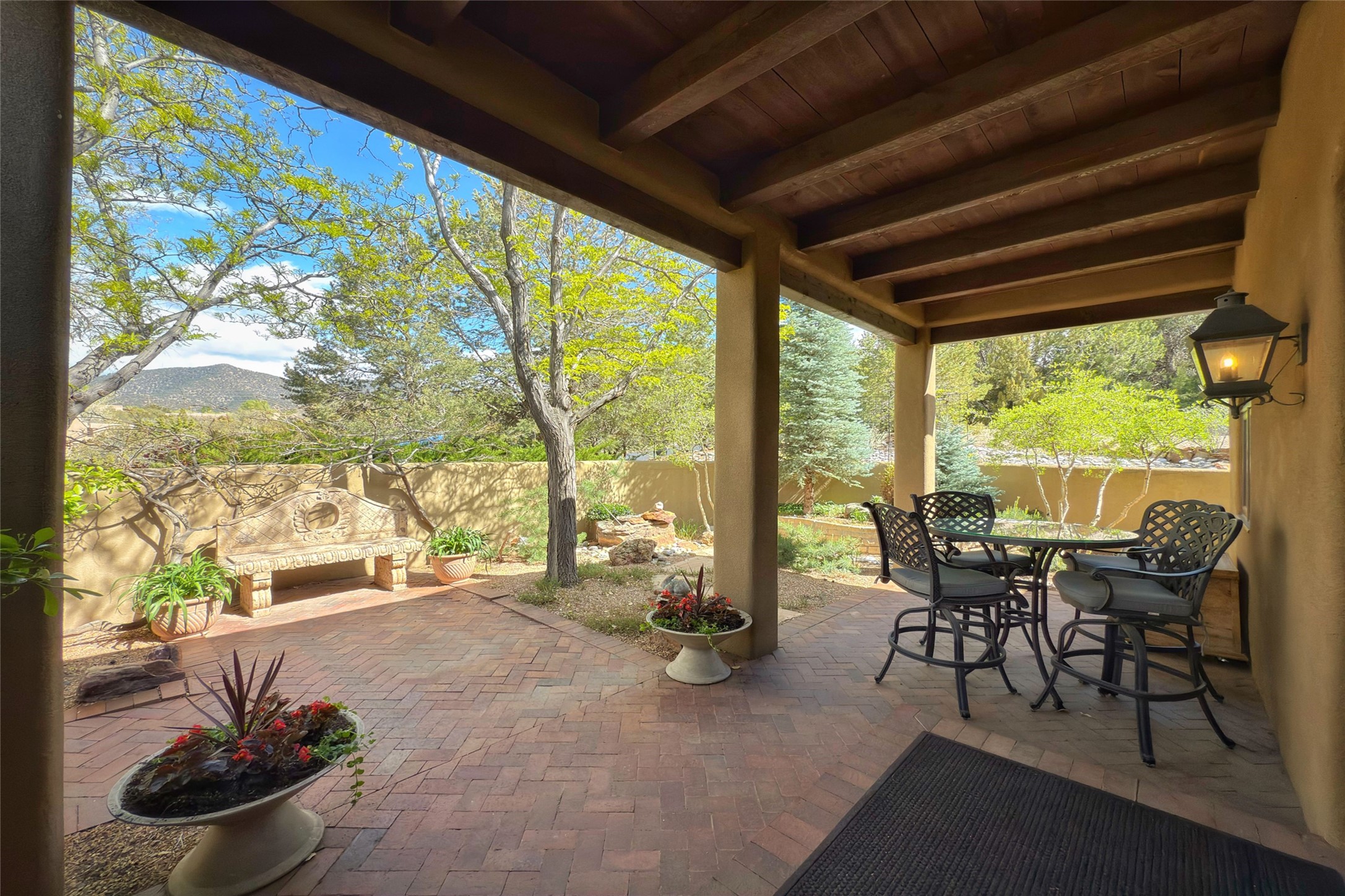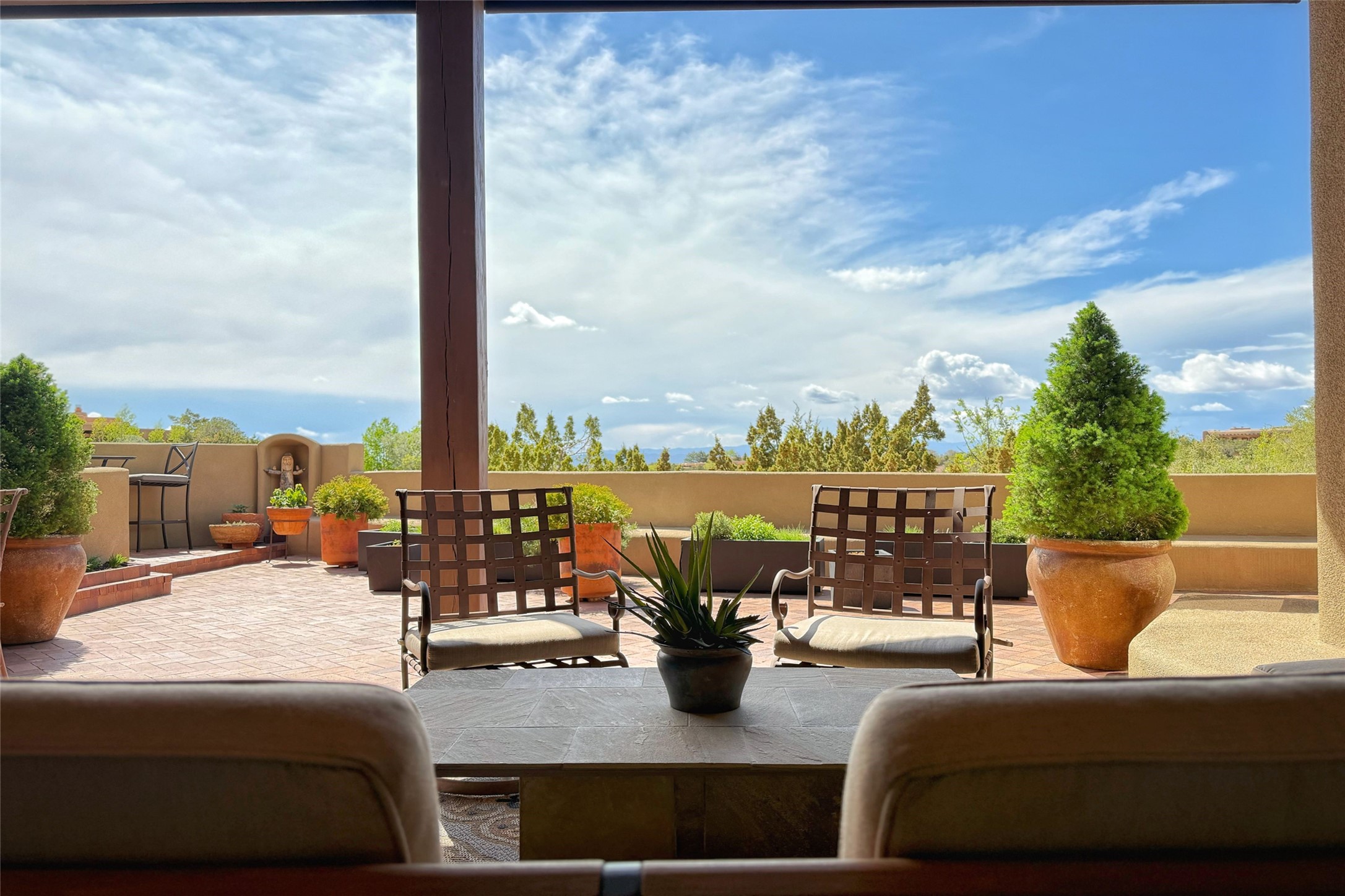 Elegant Foothills Estate with Sangre and Jemez Mountain Views in La CanteraThis exceptional residence is nestled within the prestigious, gated enclave of La Cantera--just moments from the world-class galleries and dining of Canyon Road and the Plaza. Designed for refined living and grand-scale entertaining, the home blends traditional Santa Fe architecture with timeless luxury and sweeping mountain vistas.Enter into a gated courtyard with mature landscaping. A gracious reception and a dramatic gallery hallway lead to an expansive great room with soaring beamed ceilings, one of five fireplaces, and panoramic views. The heart of the home is a spacious open-concept kitchen and dining area, offering breathtaking landscape views. Multiple outdoor living spaces, including a portal with fireplace are ideal for alfresco dining or sunset gatherings. The generous primary suite features a cozy fireplace, walk-in closet, sitting room, and courtyard access. Guests are accommodated in an ensuite bedroom with fireplace and private courtyard. The large studio, currently used as a gym, is ensuite and has a north-facing picture window. There is also outside entry making this space perfect for additional guests or an office. More highlights include a versatile media/office room ensuite with an adjoining sunroom, a wet bar with adjacent wine storage space, a cozy breakfast room, and a workshop off the garage.Set on a private, beautifully landscaped lot with mature trees and tranquil outdoor spaces, this is a rare opportunity to own a remarkable residence in one of Santa Fe's most sought-after communities.