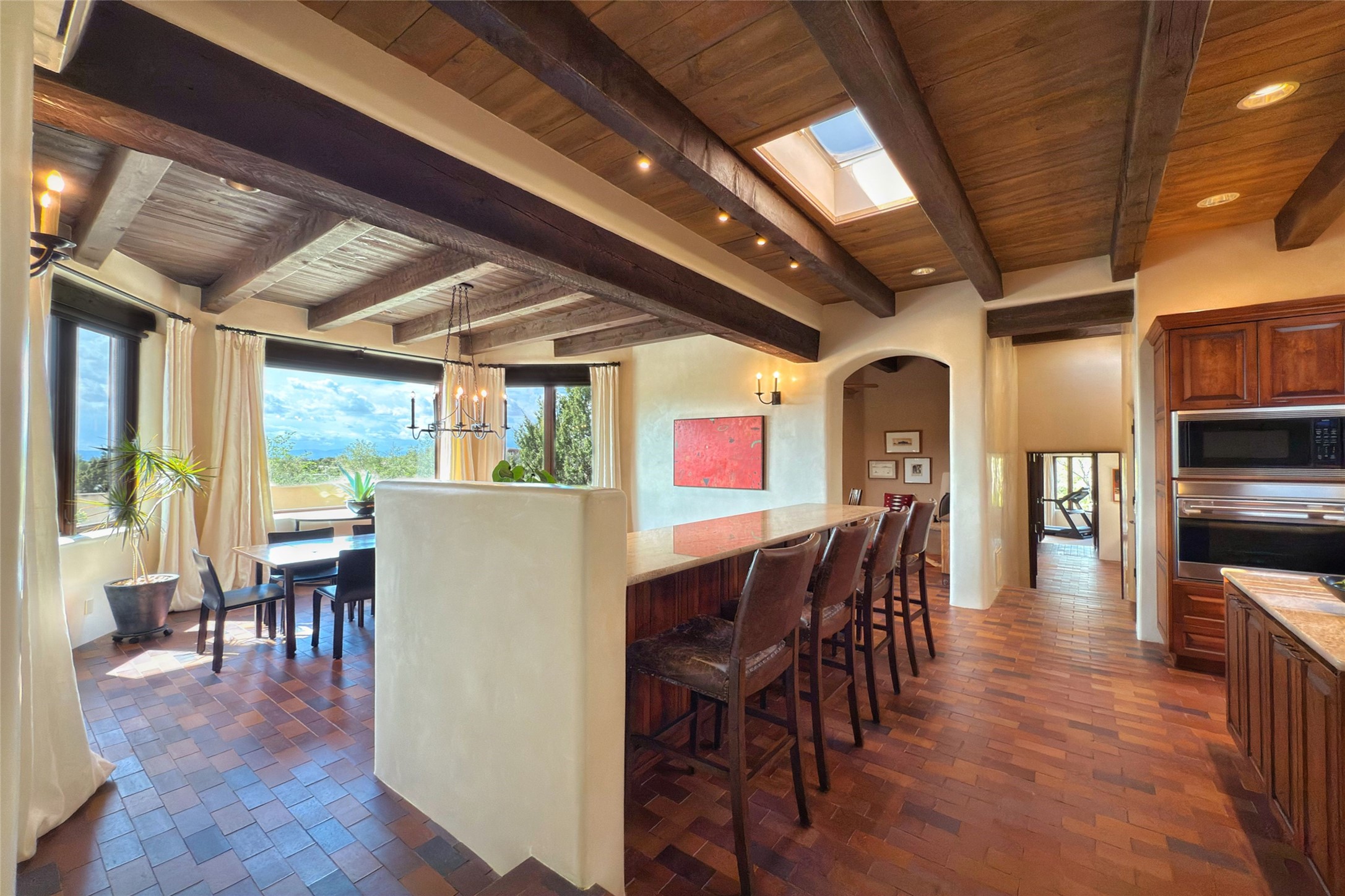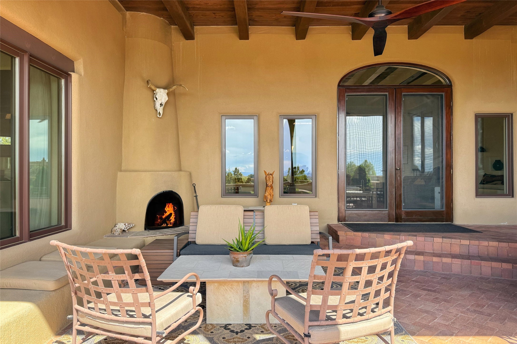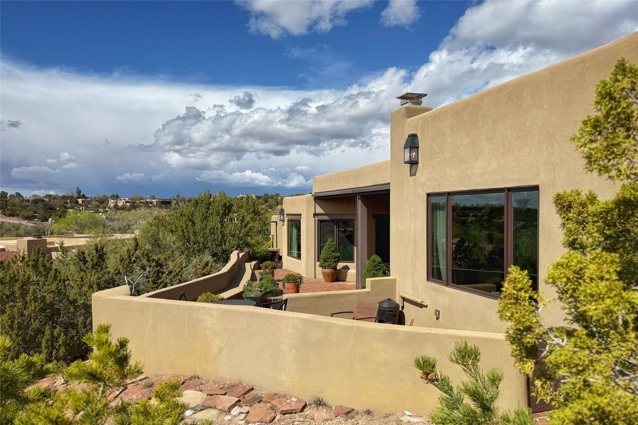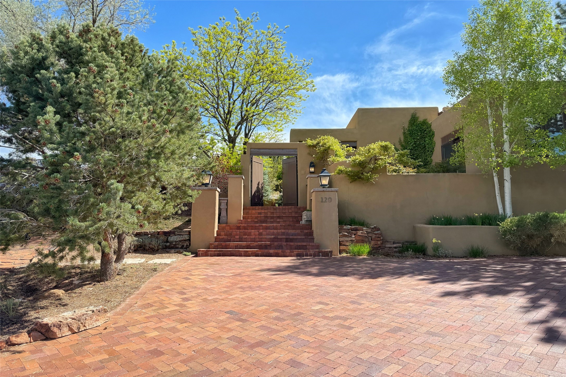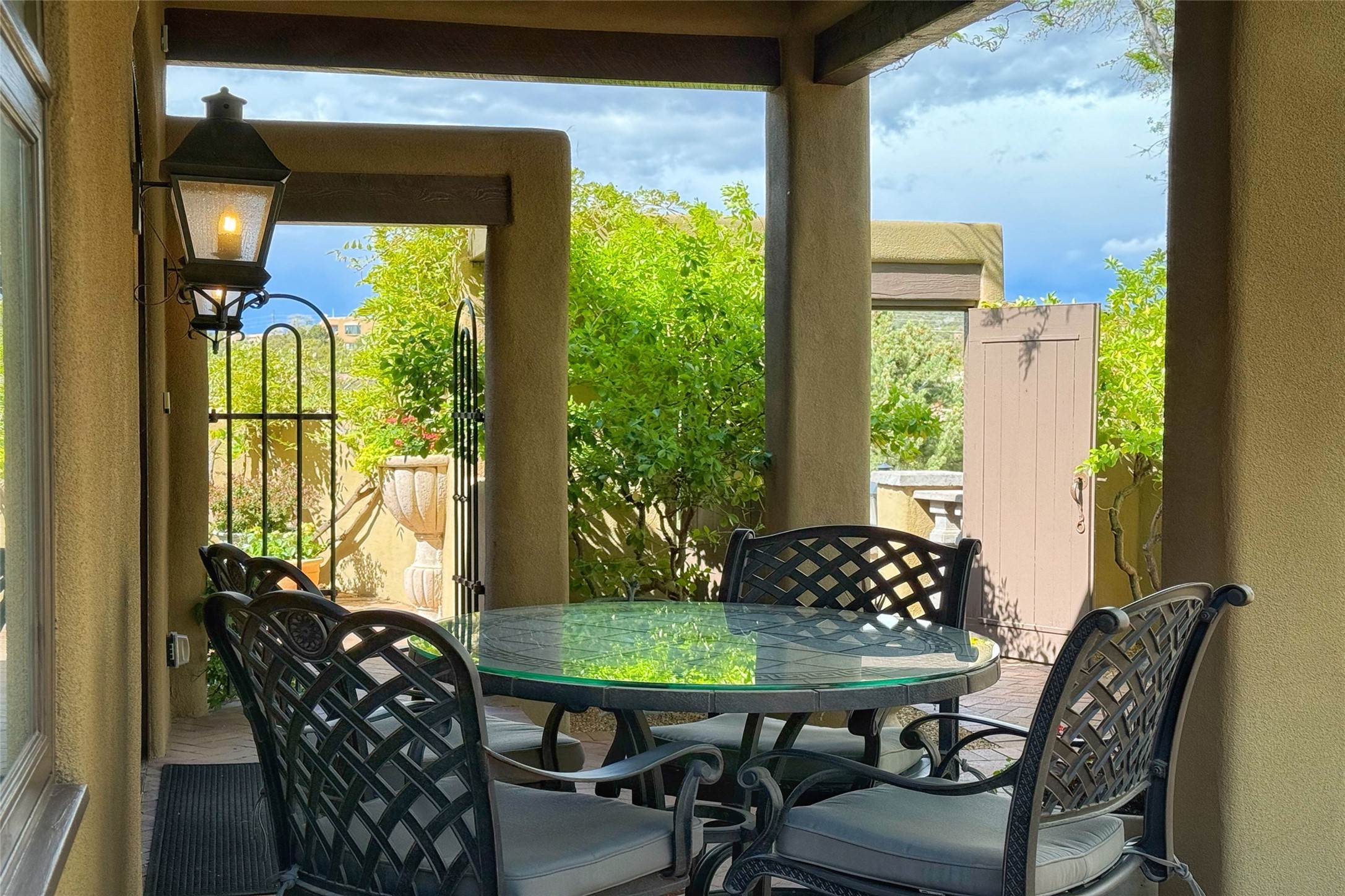 Elegant Foothills Estate with Sangre and Jemez Mountain Views in La CanteraThis exceptional residence is nestled within the prestigious, gated enclave of La Cantera--just moments from the world-class galleries and dining of Canyon Road and the Plaza. Designed for refined living and grand-scale entertaining, the home blends traditional Santa Fe architecture with timeless luxury and sweeping mountain vistas.Enter into a gated courtyard with mature landscaping. A gracious reception and a dramatic gallery hallway lead to an expansive great room with soaring beamed ceilings, one of five fireplaces, and panoramic views. The heart of the home is a spacious open-concept kitchen and dining area, offering breathtaking landscape views. Multiple outdoor living spaces, including a portal with fireplace are ideal for alfresco dining or sunset gatherings. The generous primary suite features a cozy fireplace, walk-in closet, sitting room, and courtyard access. Guests are accommodated in an ensuite bedroom with fireplace and private courtyard. The large studio, currently used as a gym, is ensuite and has a north-facing picture window. There is also outside entry making this space perfect for additional guests or an office. More highlights include a versatile media/office room ensuite with an adjoining sunroom, a wet bar with adjacent wine storage space, a cozy breakfast room, and a workshop off the garage.Set on a private, beautifully landscaped lot with mature trees and tranquil outdoor spaces, this is a rare opportunity to own a remarkable residence in one of Santa Fe's most sought-after communities.