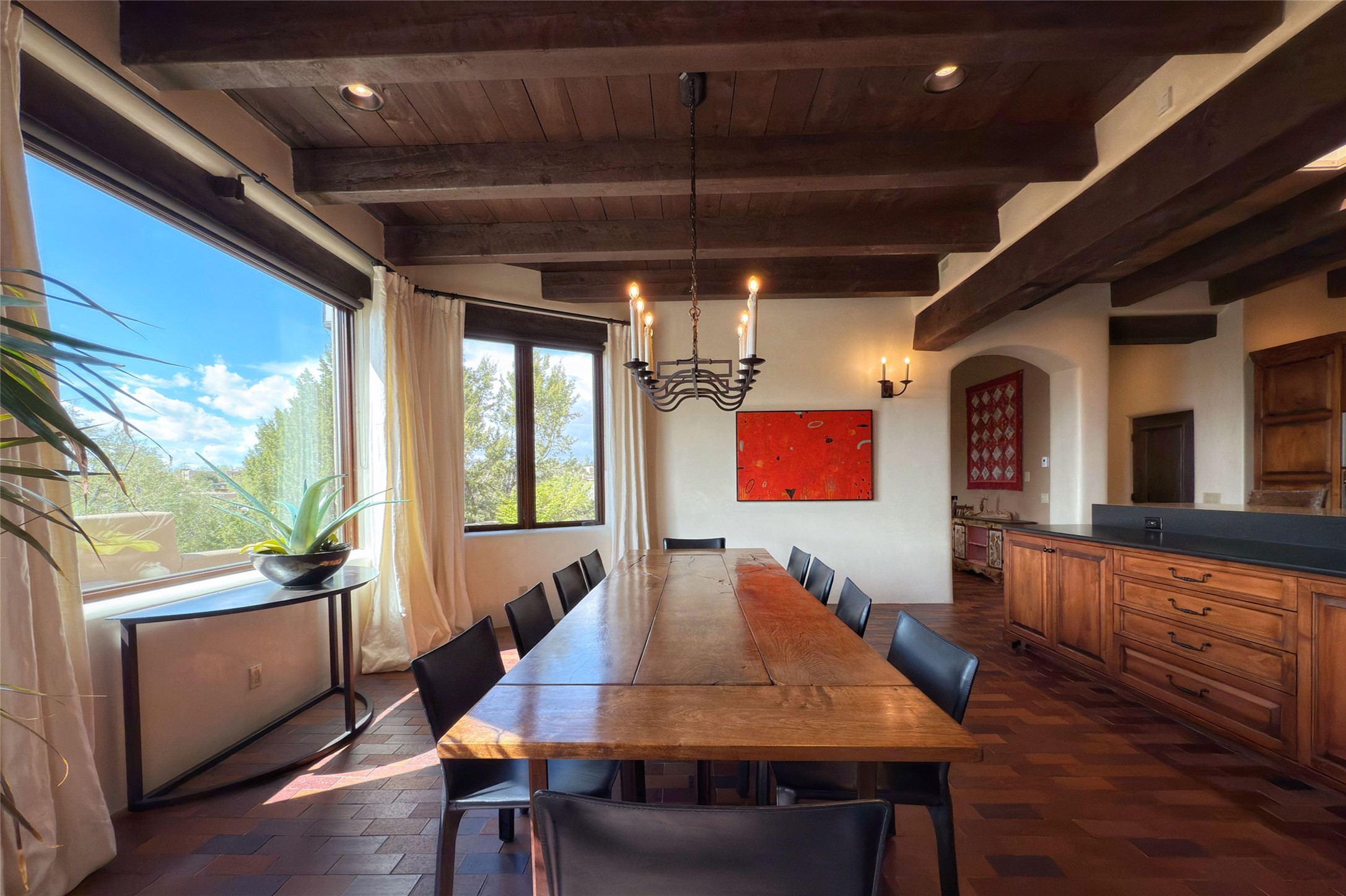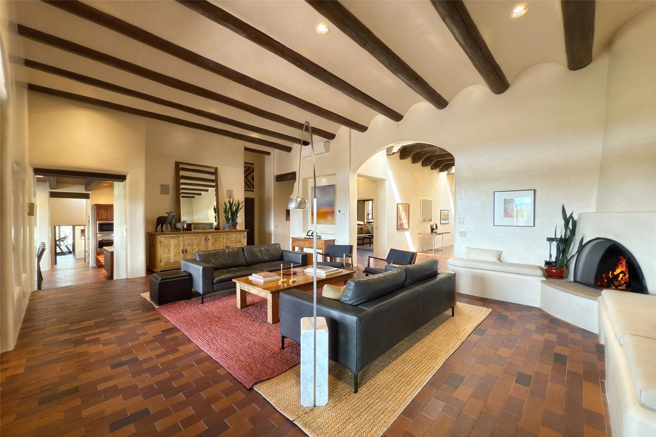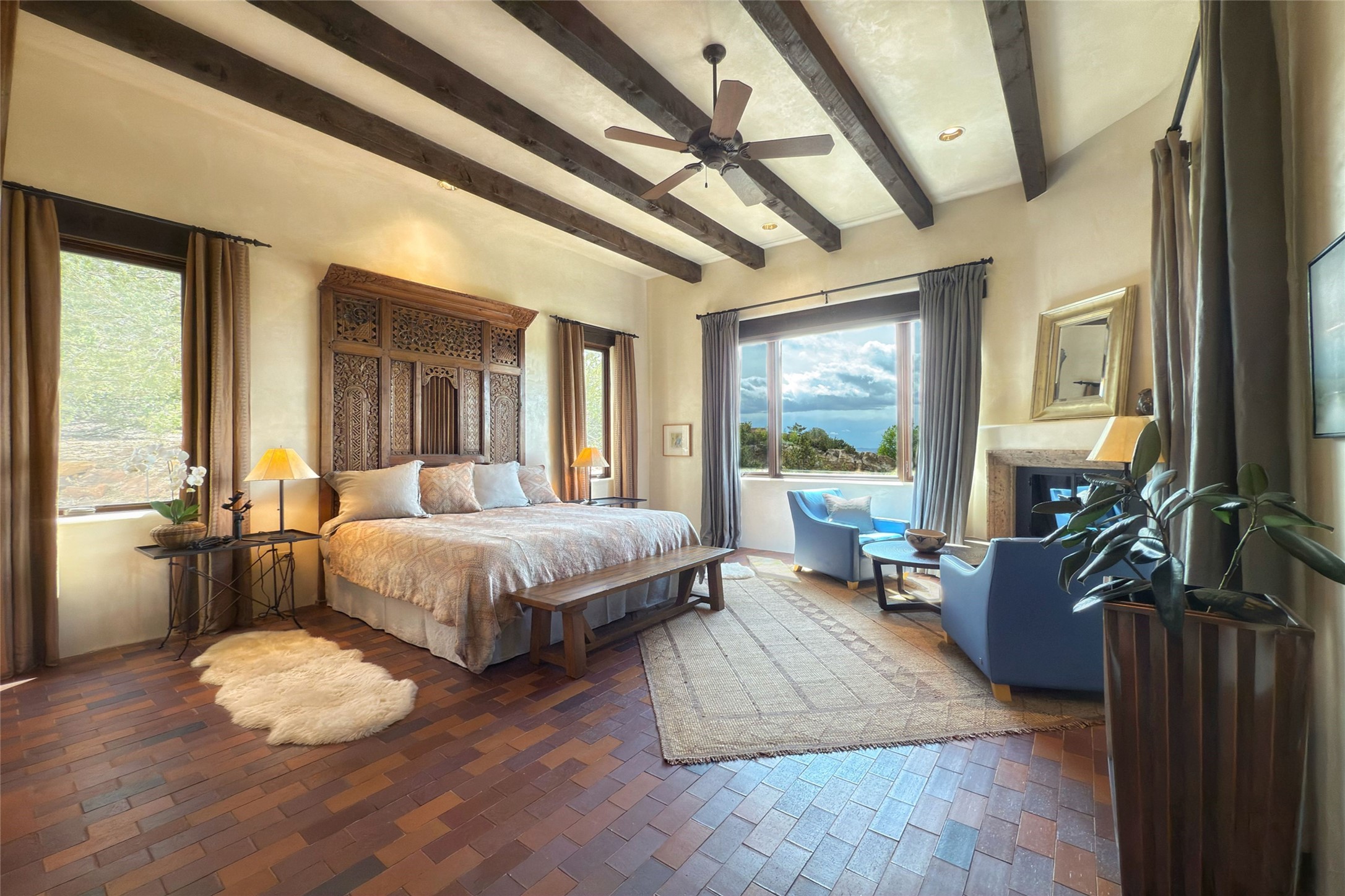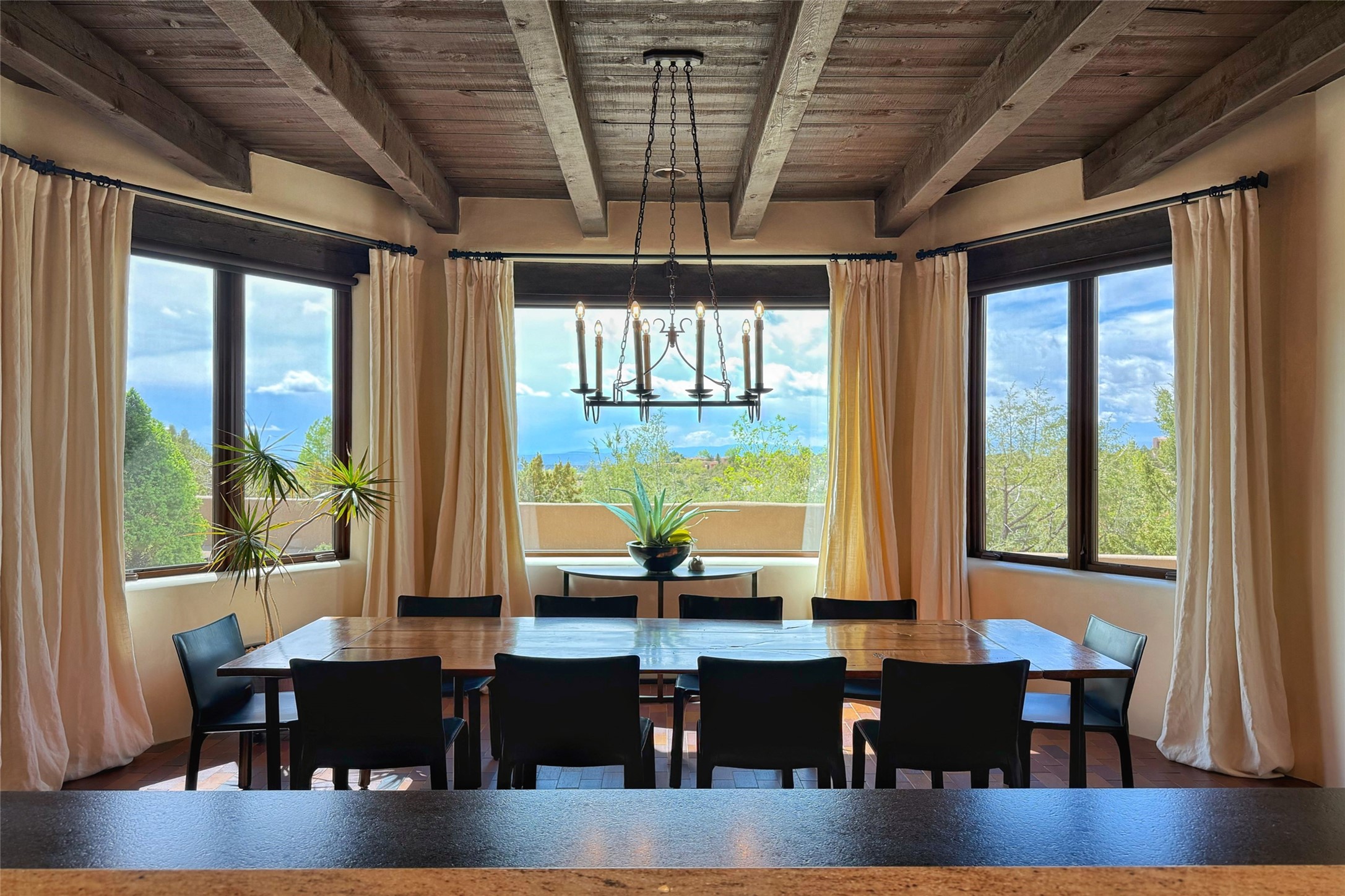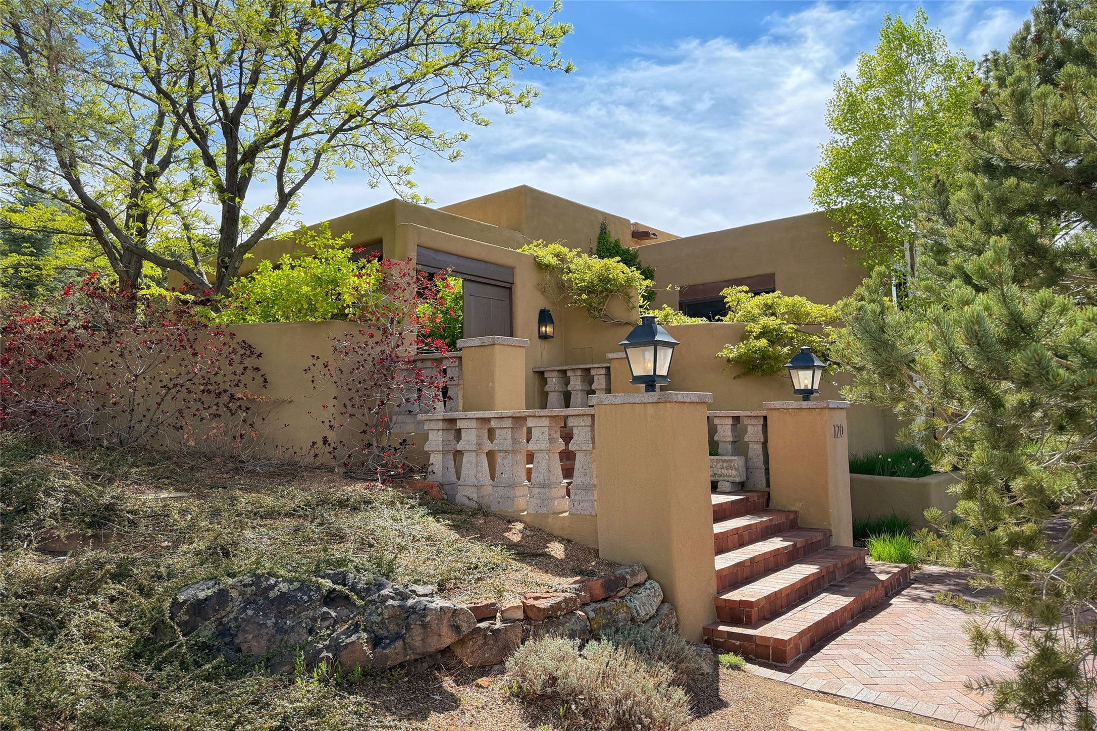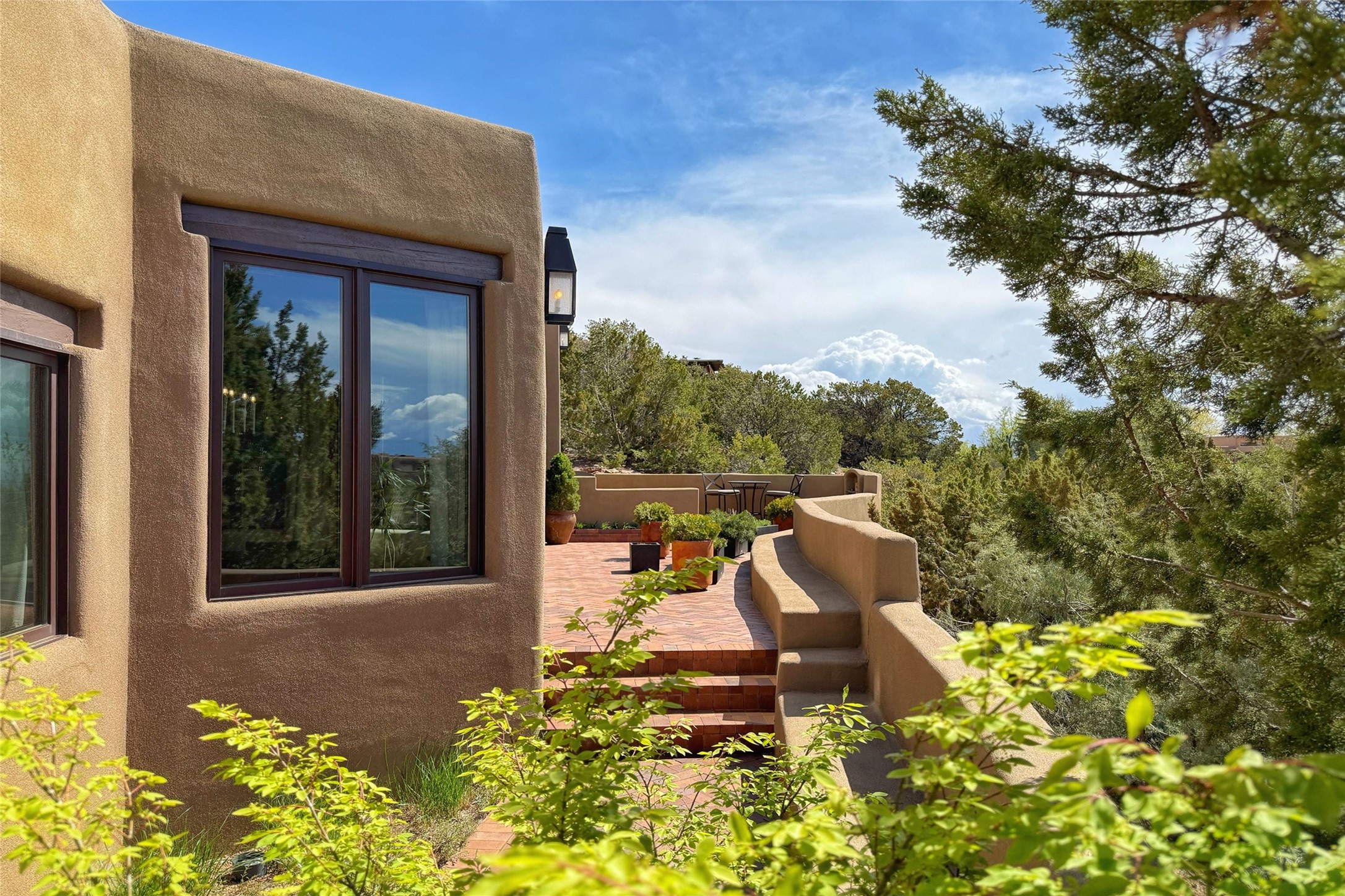 Elegant Foothills Estate with Sangre and Jemez Mountain Views in La CanteraThis exceptional residence is nestled within the prestigious, gated enclave of La Cantera--just moments from the world-class galleries and dining of Canyon Road and the Plaza. Designed for refined living and grand-scale entertaining, the home blends traditional Santa Fe architecture with timeless luxury and sweeping mountain vistas.Enter into a gated courtyard with mature landscaping. A gracious reception and a dramatic gallery hallway lead to an expansive great room with soaring beamed ceilings, one of five fireplaces, and panoramic views. The heart of the home is a spacious open-concept kitchen and dining area, offering breathtaking landscape views. Multiple outdoor living spaces, including a portal with fireplace are ideal for alfresco dining or sunset gatherings. The generous primary suite features a cozy fireplace, walk-in closet, sitting room, and courtyard access. Guests are accommodated in an ensuite bedroom with fireplace and private courtyard. The large studio, currently used as a gym, is ensuite and has a north-facing picture window. There is also outside entry making this space perfect for additional guests or an office. More highlights include a versatile media/office room ensuite with an adjoining sunroom, a wet bar with adjacent wine storage space, a cozy breakfast room, and a workshop off the garage.Set on a private, beautifully landscaped lot with mature trees and tranquil outdoor spaces, this is a rare opportunity to own a remarkable residence in one of Santa Fe's most sought-after communities.