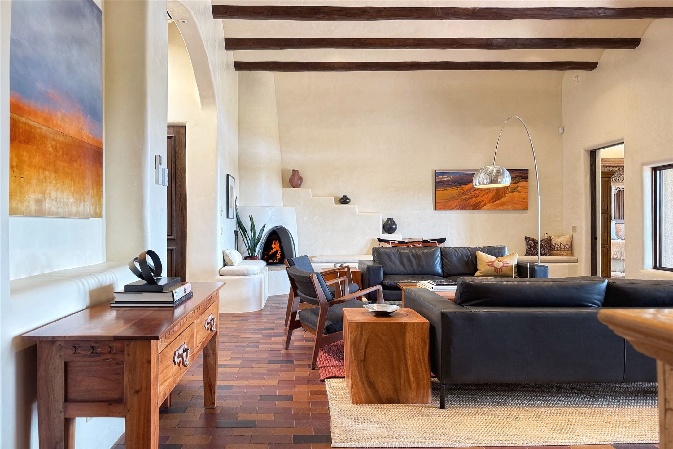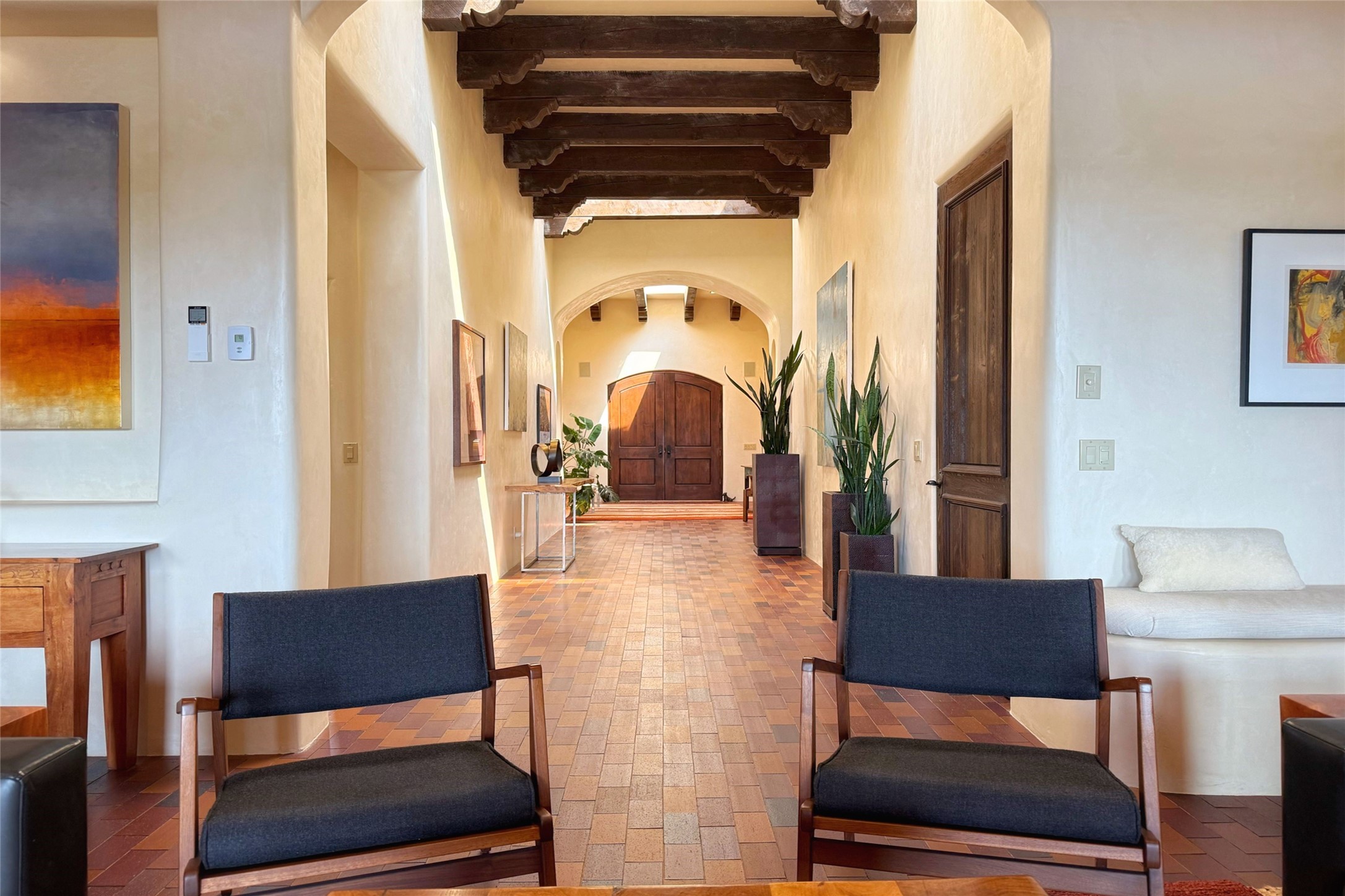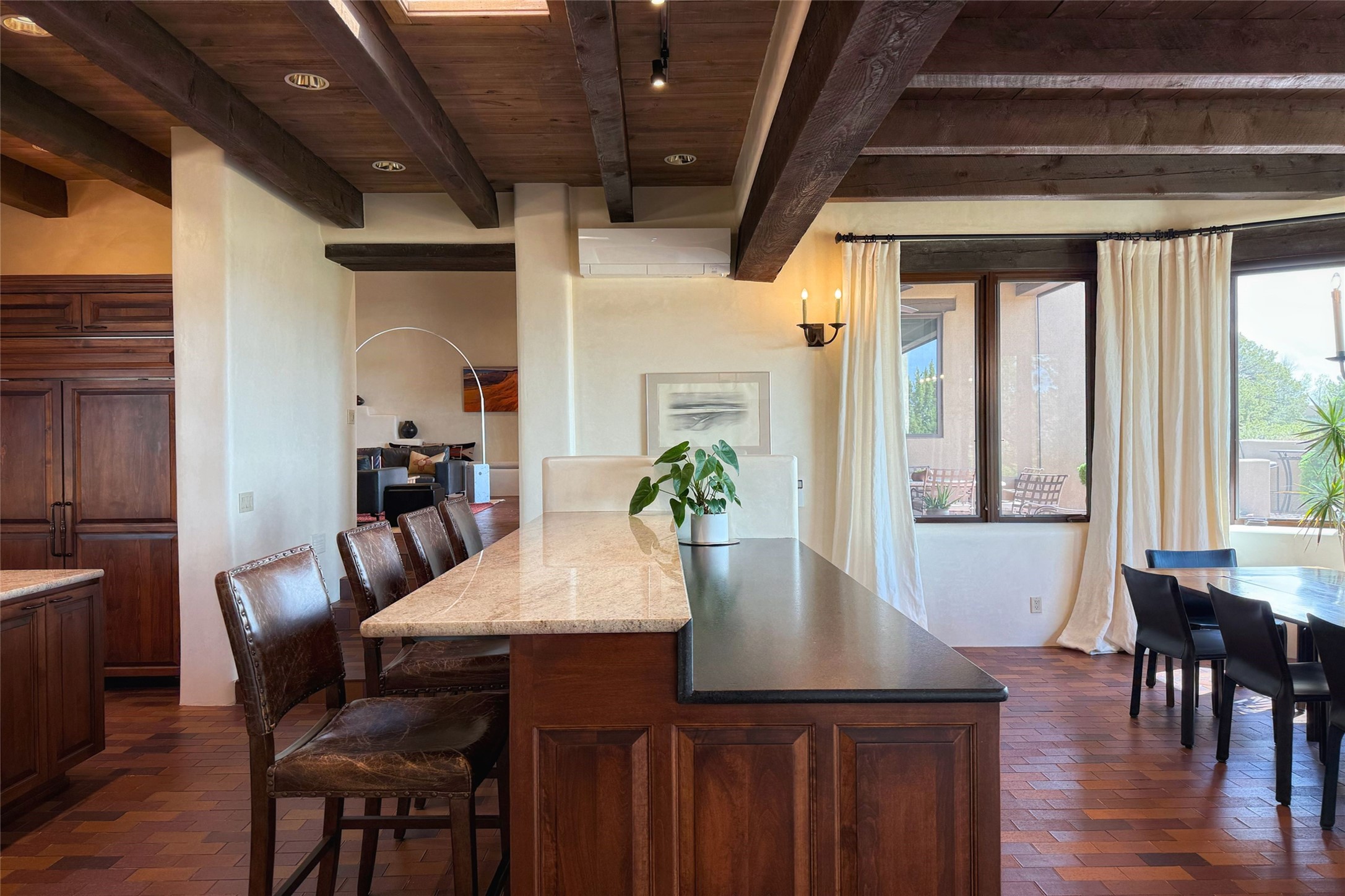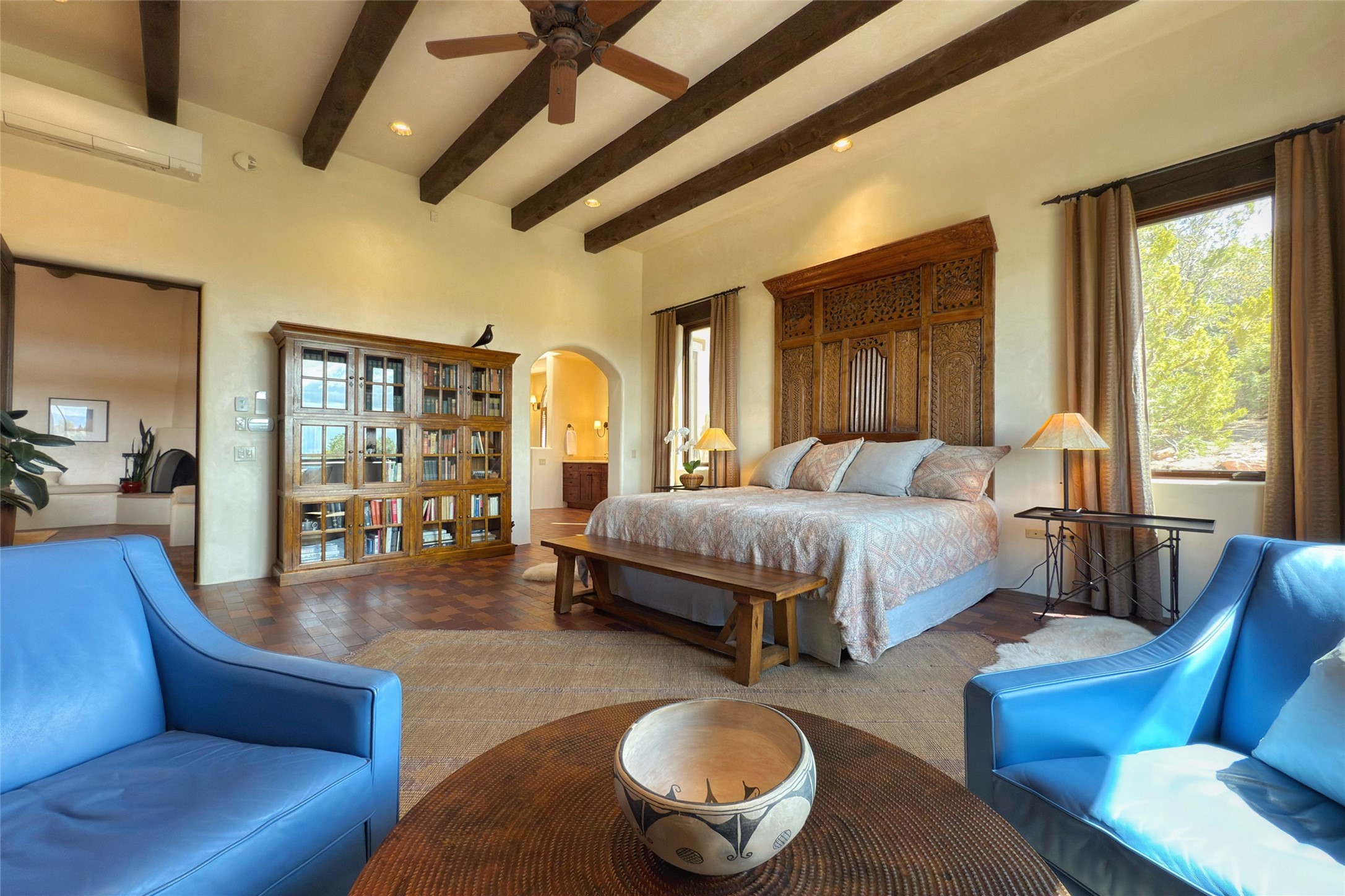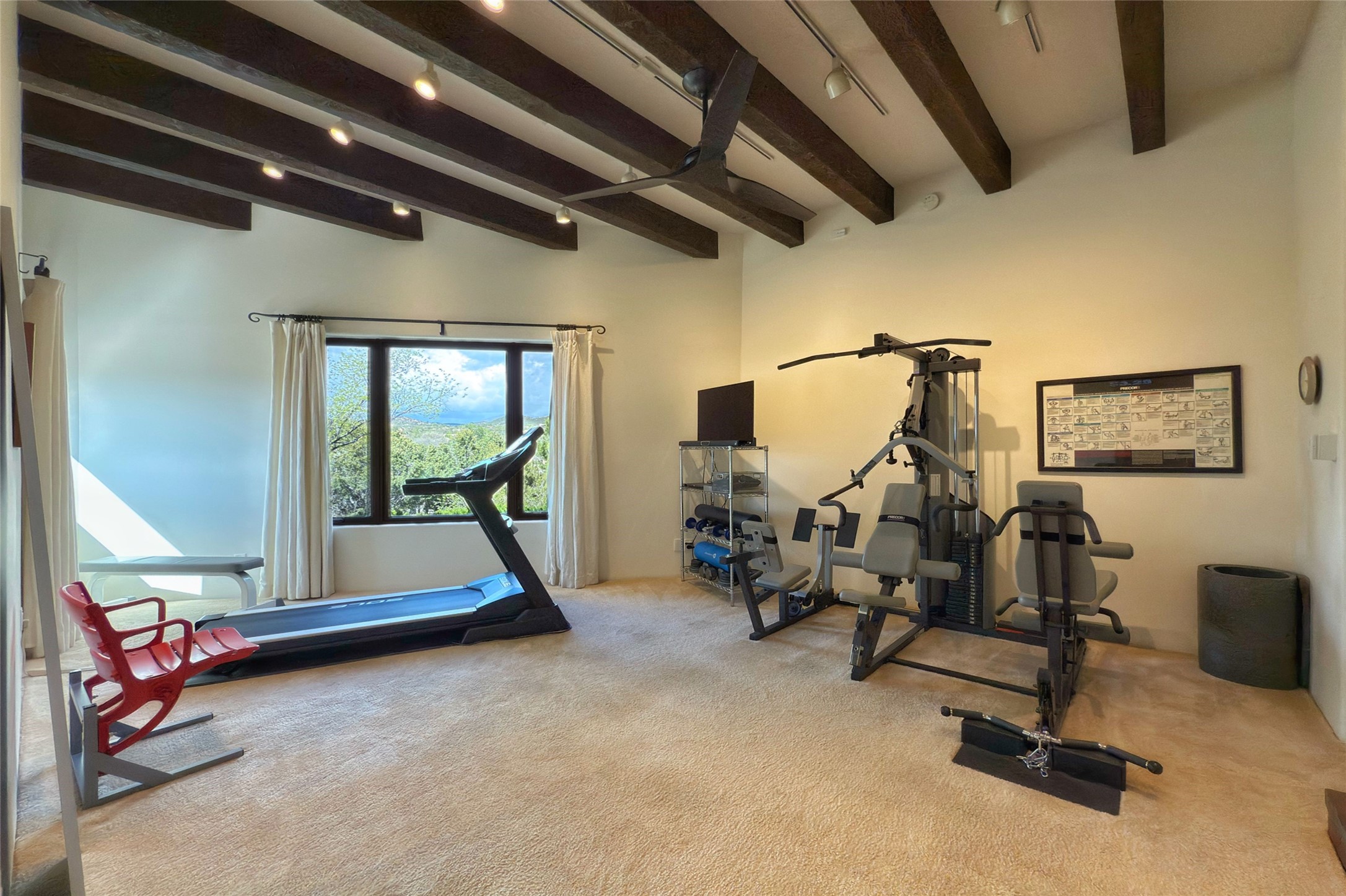 Elegant Foothills Estate with Sangre and Jemez Mountain Views in La CanteraThis exceptional residence is nestled within the prestigious, gated enclave of La Cantera--just moments from the world-class galleries and dining of Canyon Road and the Plaza. Designed for refined living and grand-scale entertaining, the home blends traditional Santa Fe architecture with timeless luxury and sweeping mountain vistas.Enter into a gated courtyard with mature landscaping. A gracious reception and a dramatic gallery hallway lead to an expansive great room with soaring beamed ceilings, one of five fireplaces, and panoramic views. The heart of the home is a spacious open-concept kitchen and dining area, offering breathtaking landscape views. Multiple outdoor living spaces, including a portal with fireplace are ideal for alfresco dining or sunset gatherings. The generous primary suite features a cozy fireplace, walk-in closet, sitting room, and courtyard access. Guests are accommodated in an ensuite bedroom with fireplace and private courtyard. The large studio, currently used as a gym, is ensuite and has a north-facing picture window. There is also outside entry making this space perfect for additional guests or an office. More highlights include a versatile media/office room ensuite with an adjoining sunroom, a wet bar with adjacent wine storage space, a cozy breakfast room, and a workshop off the garage.Set on a private, beautifully landscaped lot with mature trees and tranquil outdoor spaces, this is a rare opportunity to own a remarkable residence in one of Santa Fe's most sought-after communities.