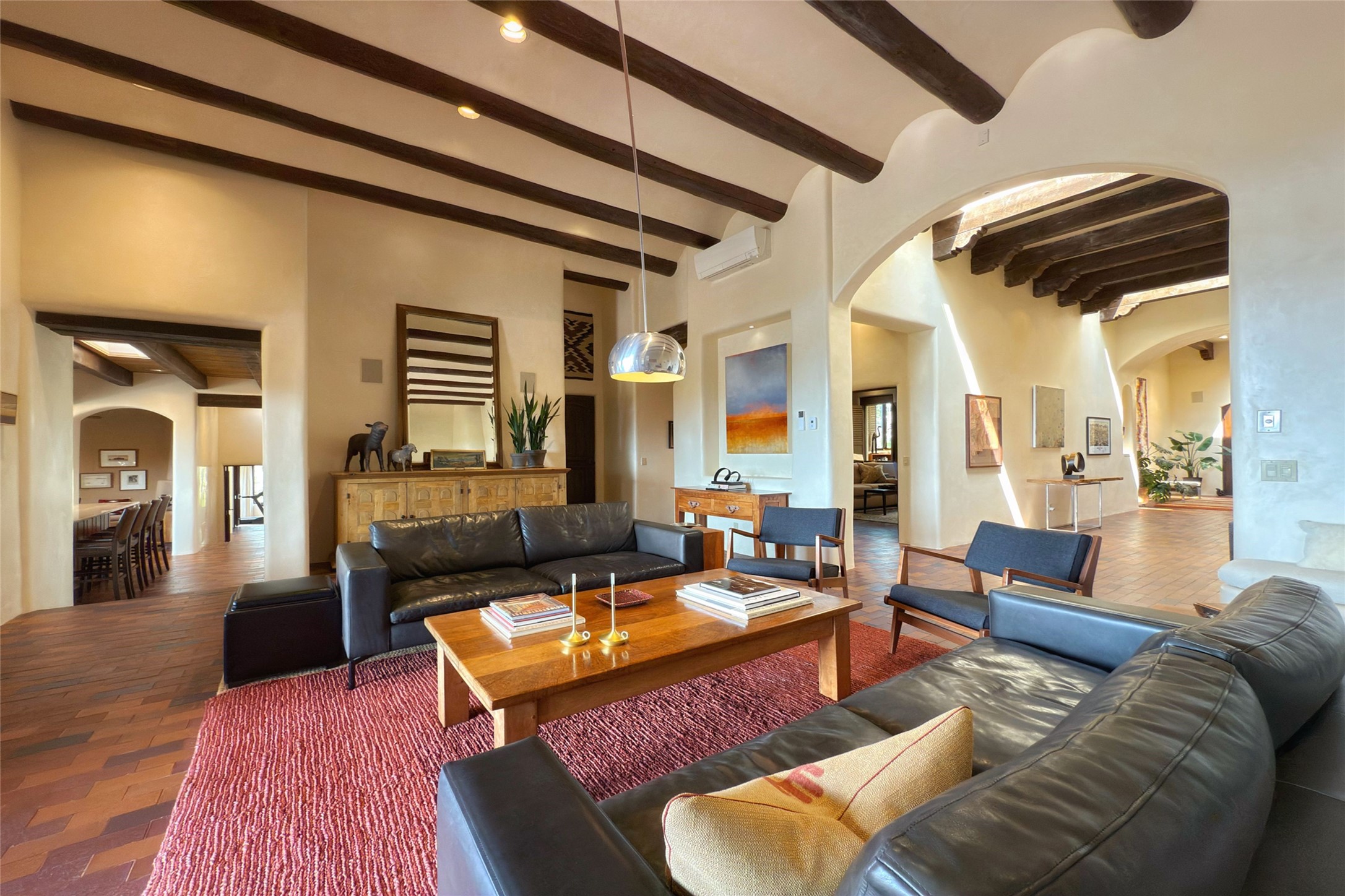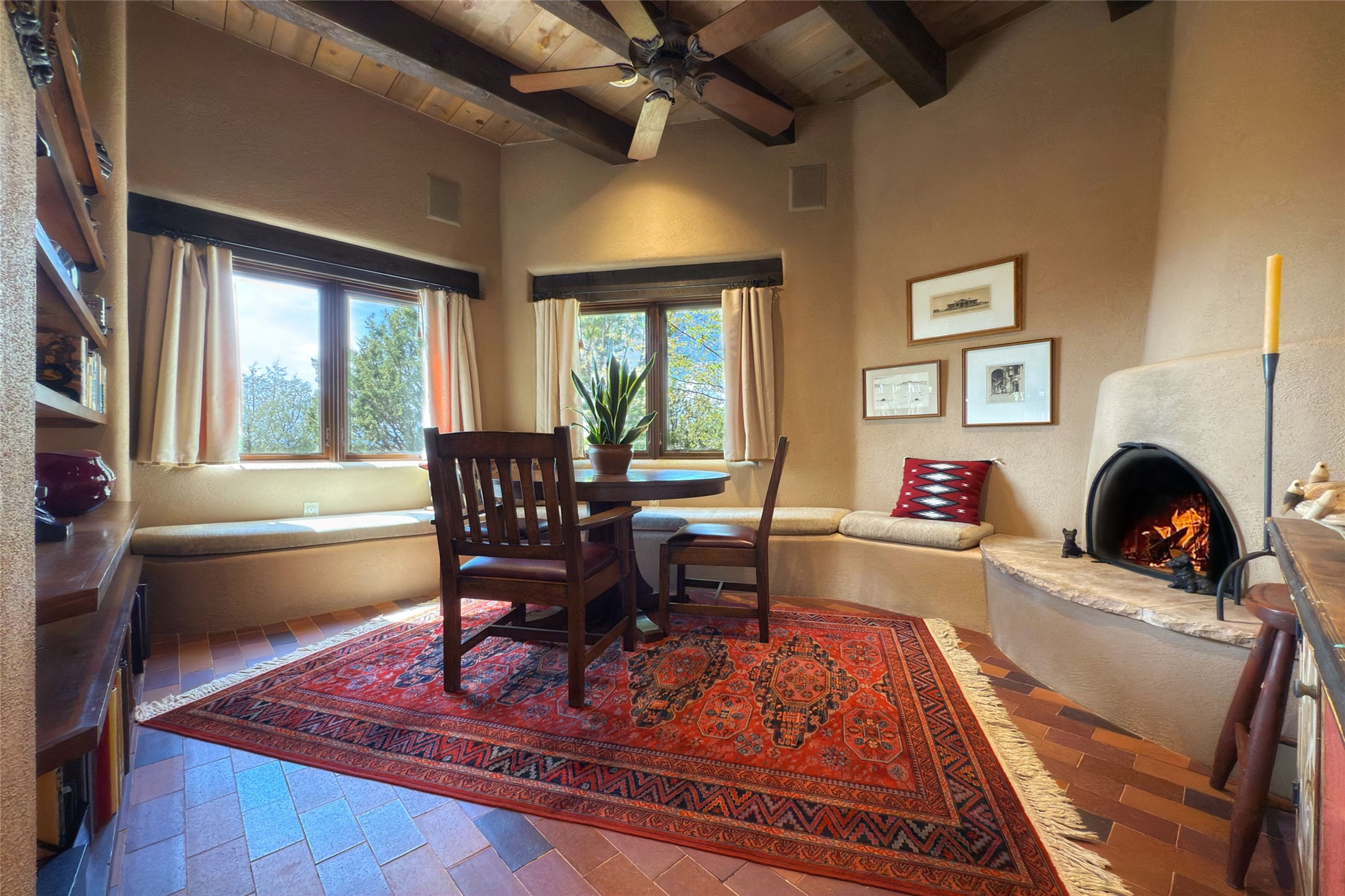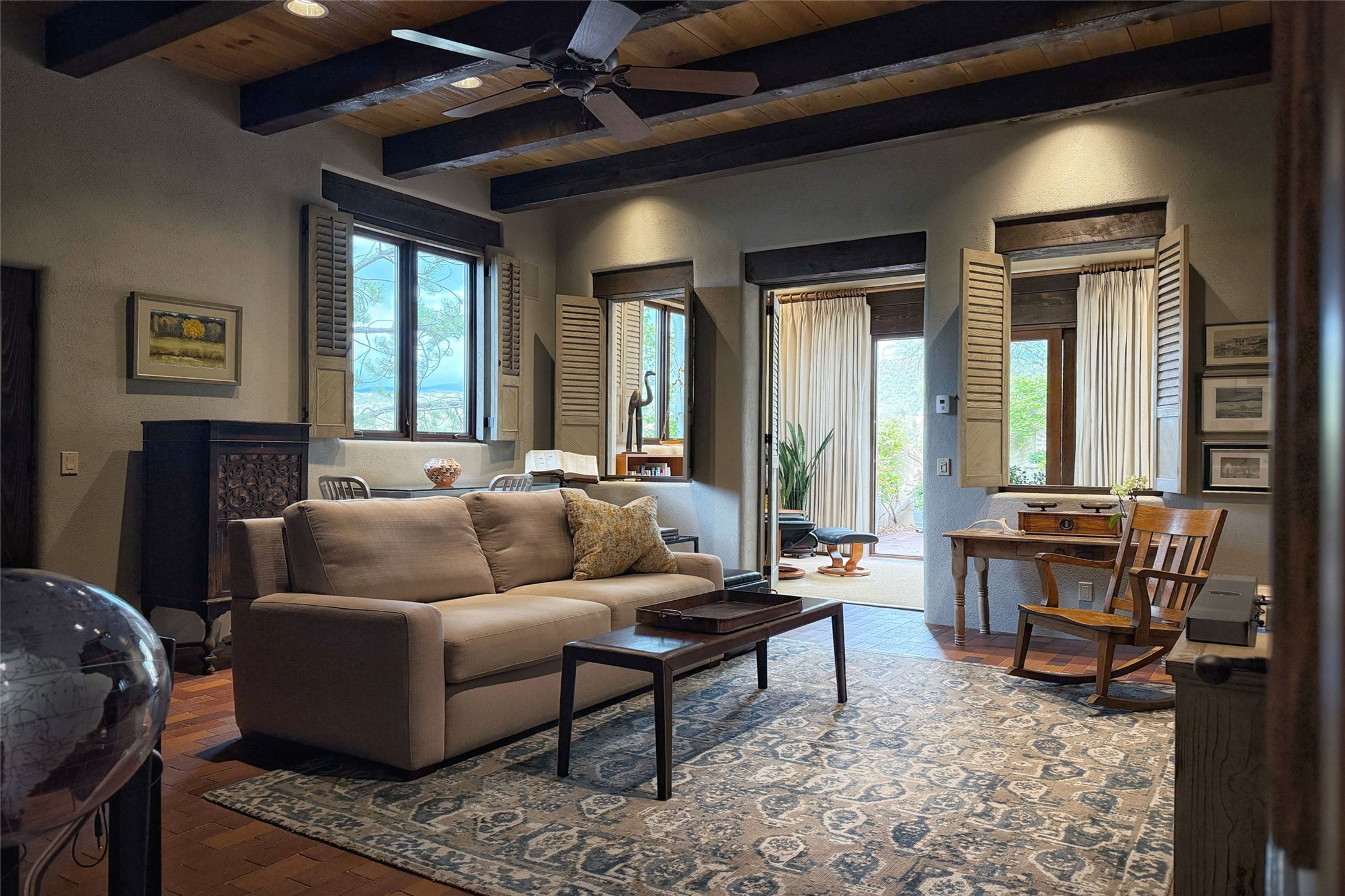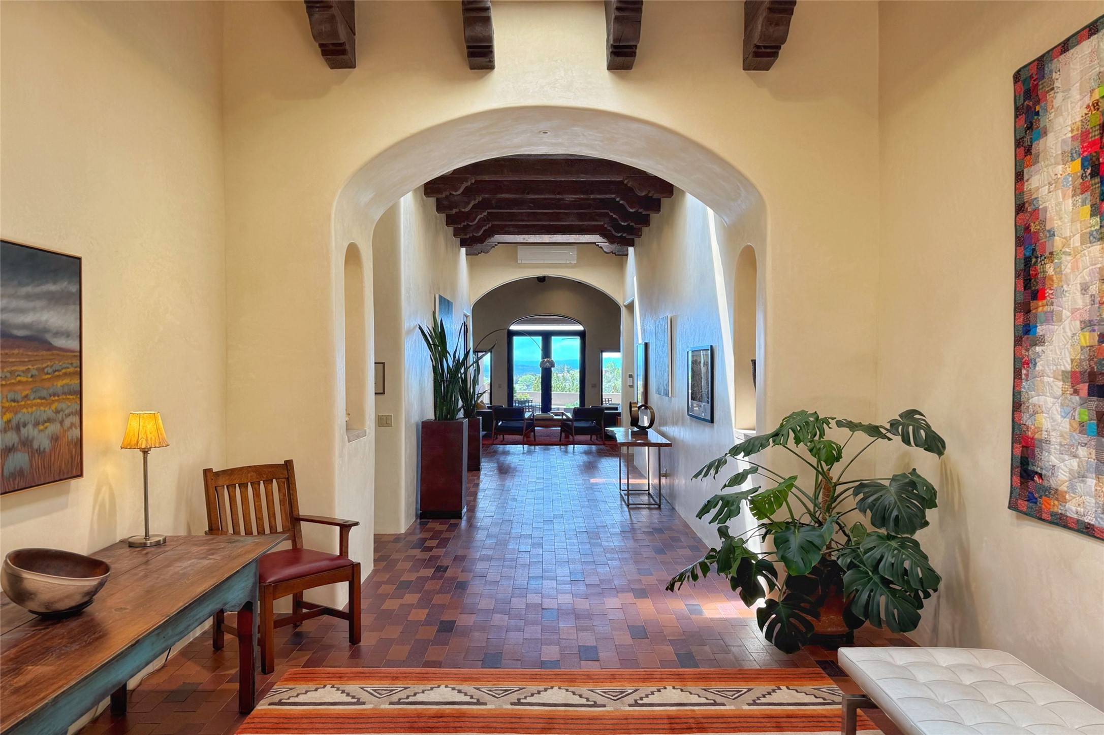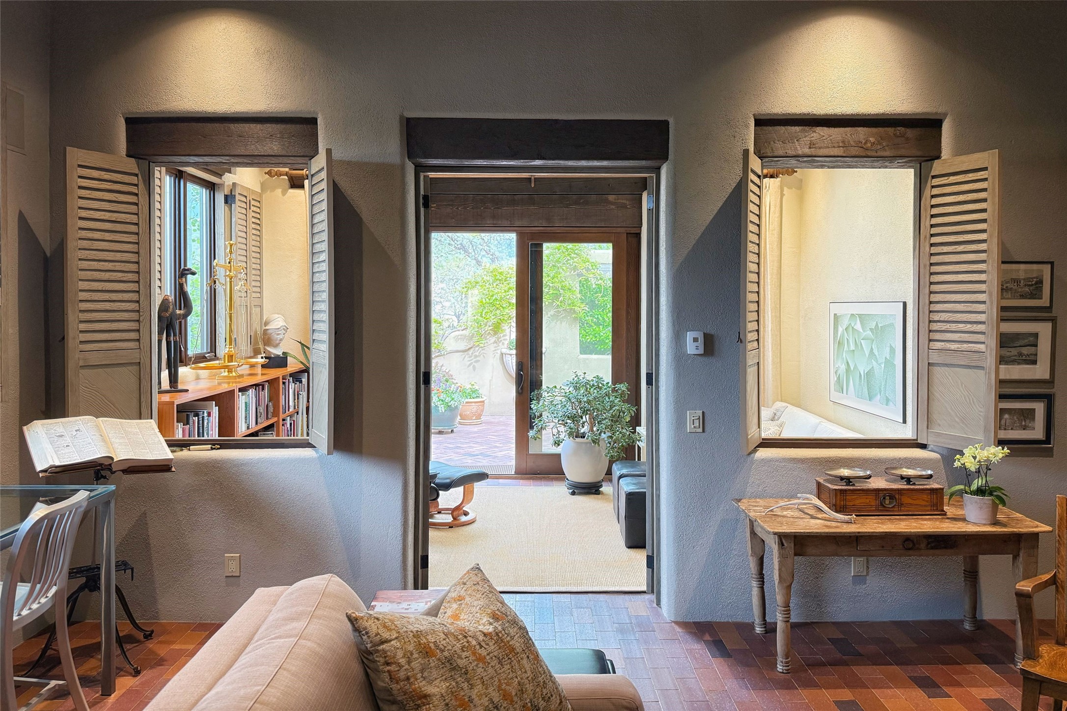 Elegant Foothills Estate with Sangre and Jemez Mountain Views in La CanteraThis exceptional residence is nestled within the prestigious, gated enclave of La Cantera--just moments from the world-class galleries and dining of Canyon Road and the Plaza. Designed for refined living and grand-scale entertaining, the home blends traditional Santa Fe architecture with timeless luxury and sweeping mountain vistas.Enter into a gated courtyard with mature landscaping. A gracious reception and a dramatic gallery hallway lead to an expansive great room with soaring beamed ceilings, one of five fireplaces, and panoramic views. The heart of the home is a spacious open-concept kitchen and dining area, offering breathtaking landscape views. Multiple outdoor living spaces, including a portal with fireplace are ideal for alfresco dining or sunset gatherings. The generous primary suite features a cozy fireplace, walk-in closet, sitting room, and courtyard access. Guests are accommodated in an ensuite bedroom with fireplace and private courtyard. The large studio, currently used as a gym, is ensuite and has a north-facing picture window. There is also outside entry making this space perfect for additional guests or an office. More highlights include a versatile media/office room ensuite with an adjoining sunroom, a wet bar with adjacent wine storage space, a cozy breakfast room, and a workshop off the garage.Set on a private, beautifully landscaped lot with mature trees and tranquil outdoor spaces, this is a rare opportunity to own a remarkable residence in one of Santa Fe's most sought-after communities.