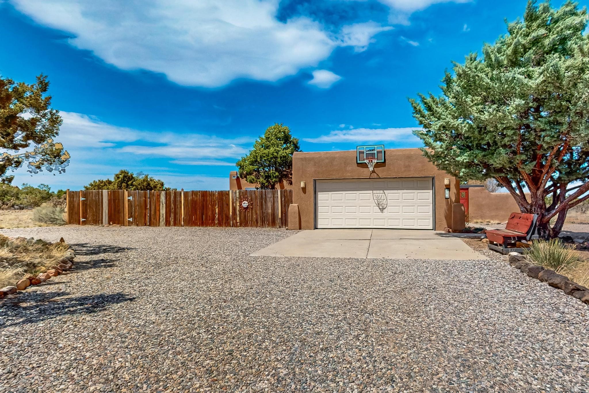 Lovely light classic contemporary pueblo, open plan design with a large extra sunroom. Natural gas forced air with a swamp cooler hook up giving central air conditioning to give both winter heat and summer cool. A 2 way wood burning fireplace with a gas log starter sits between the living room and main bedroom. A private front courtyard, Saltillo floors, viga beams and corbels add a touch of SF character. Ceiling fans in all rooms, one year old hot water heater and a brand new septic tank installed 2024. There is a privately fenced back yard accessed from the sunroom and sunny dining area for entertaining or quiet relaxation. This home sits back on 1.6 acres accessed by paved roads within easy reach of Eldorado amenities, two local shopping centers, schools, parks, library and senior center, only minutes into Santa Fe.