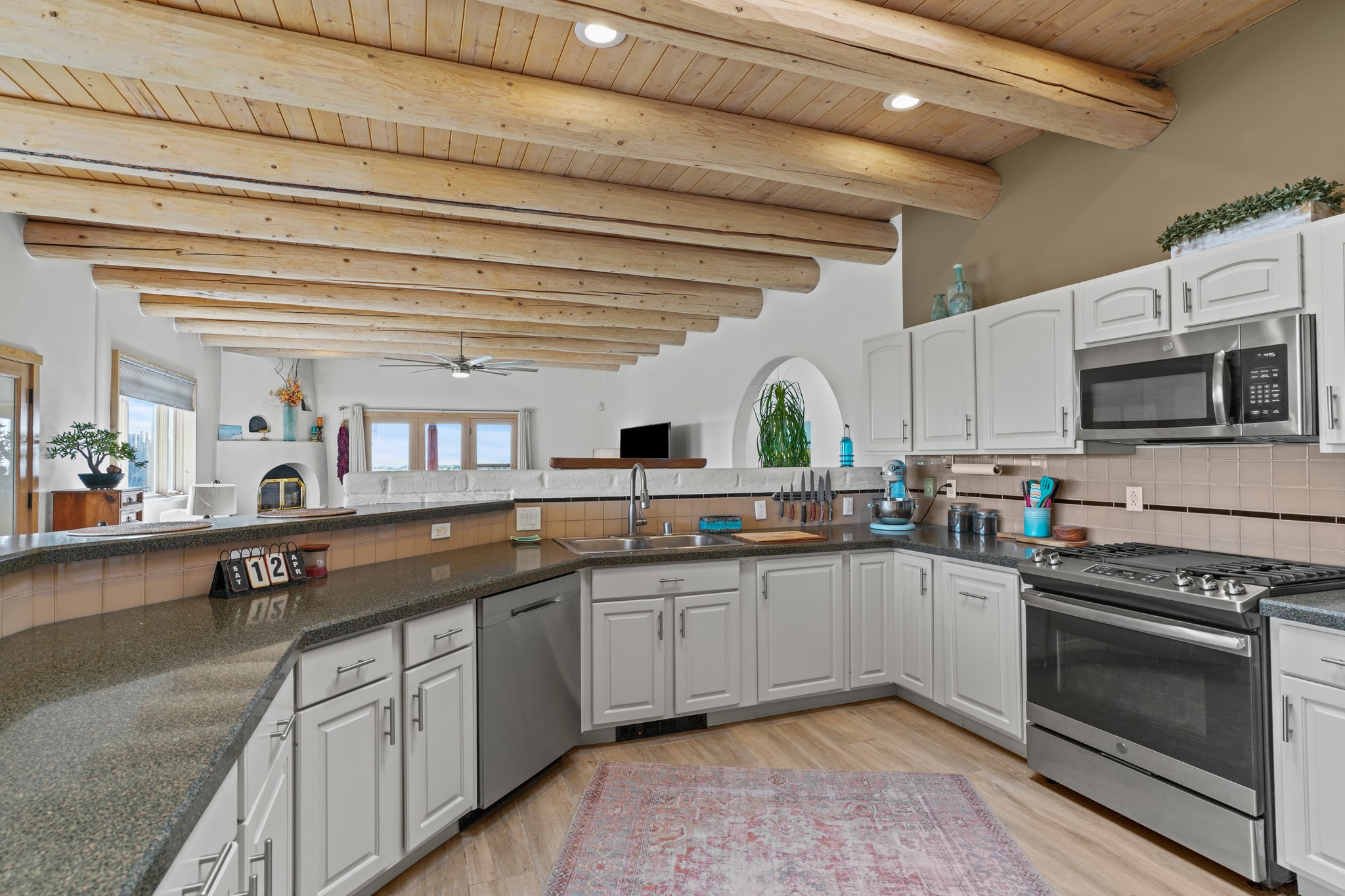 Welcome to this attractive passive solar home at 5 Puerto Road in the popular community of Eldorado, which is just a 15-minute drive south of the Santa Fe city limits. Located off of a quiet cul-de-sac and bordered by a spacious greenbelt, this gorgeous light-filled home on 2 acres is the one you've been waiting for.Upon entry you will notice the distinctive and appealing open floor plan design as the spacious kitchen opens to the living and dining rooms. You'll also enjoy the high ceilings with vigas in this single level home with beautifully-tiled flooring and no interior steps. The primary suite features clerestory windows, a walk-in closet, a separate, designated work or exercise area and direct access to the private outdoor hot tub! Additional and beneficial features are the newer photovoltaic solar panel system that significantly reduces the electric bill, trombe walls, a kiva fireplace and the oversized 2-car garage. The southwestern views of the Jemez, Ortiz and Sandia Mountains are magnificent. For the outdoor enthusiasts, Eldorado contains the best walking/biking paths and boasts one of the best outdoor swimming pools in Santa Fe County.