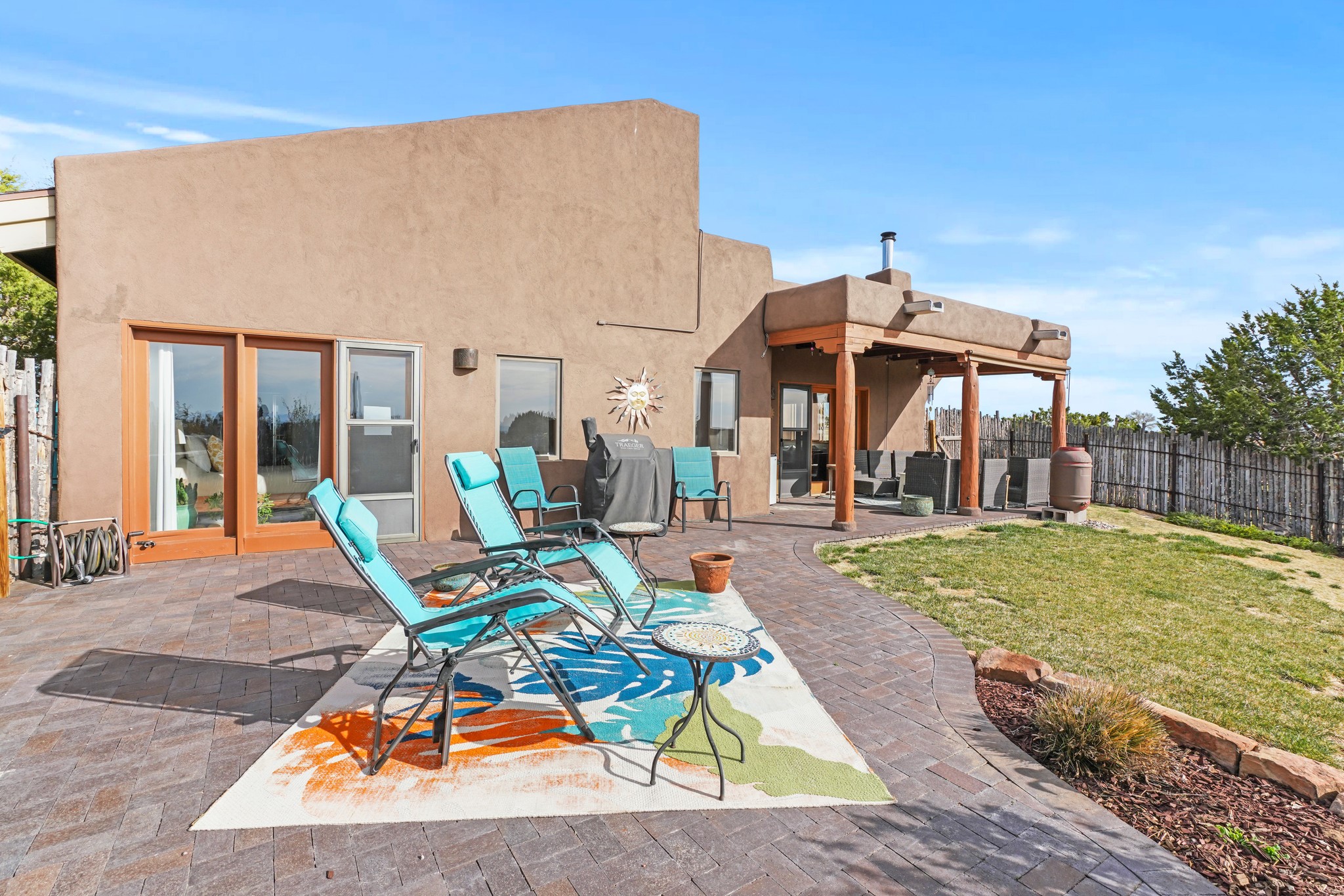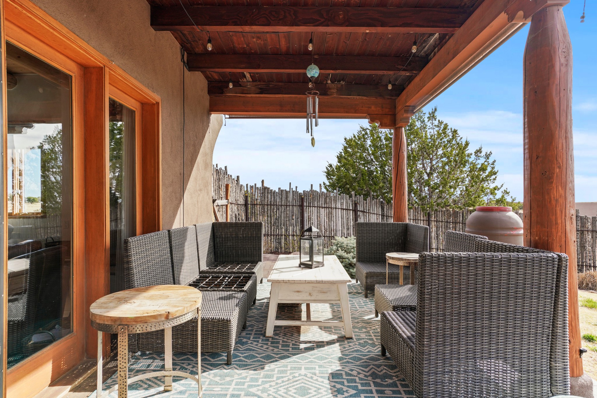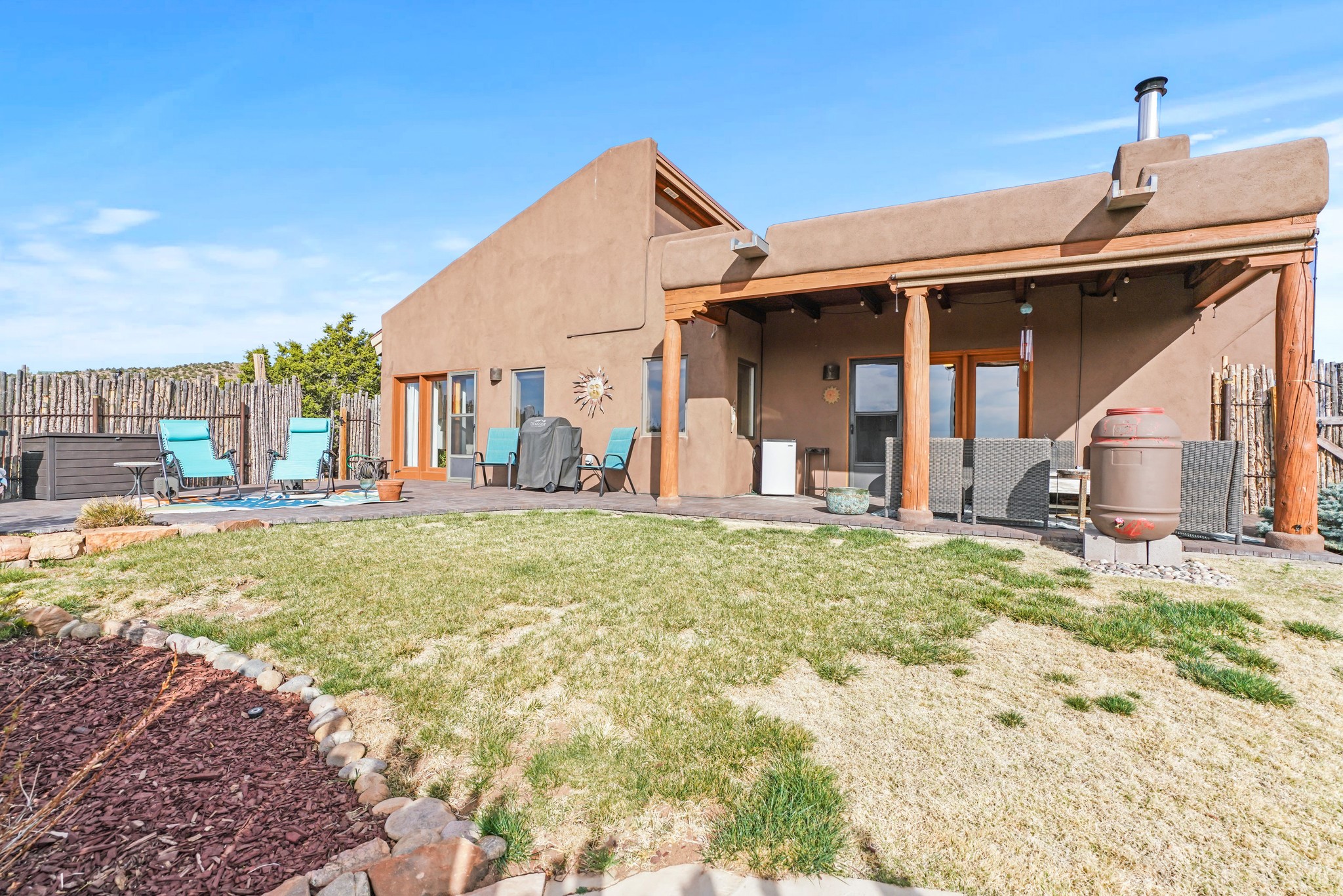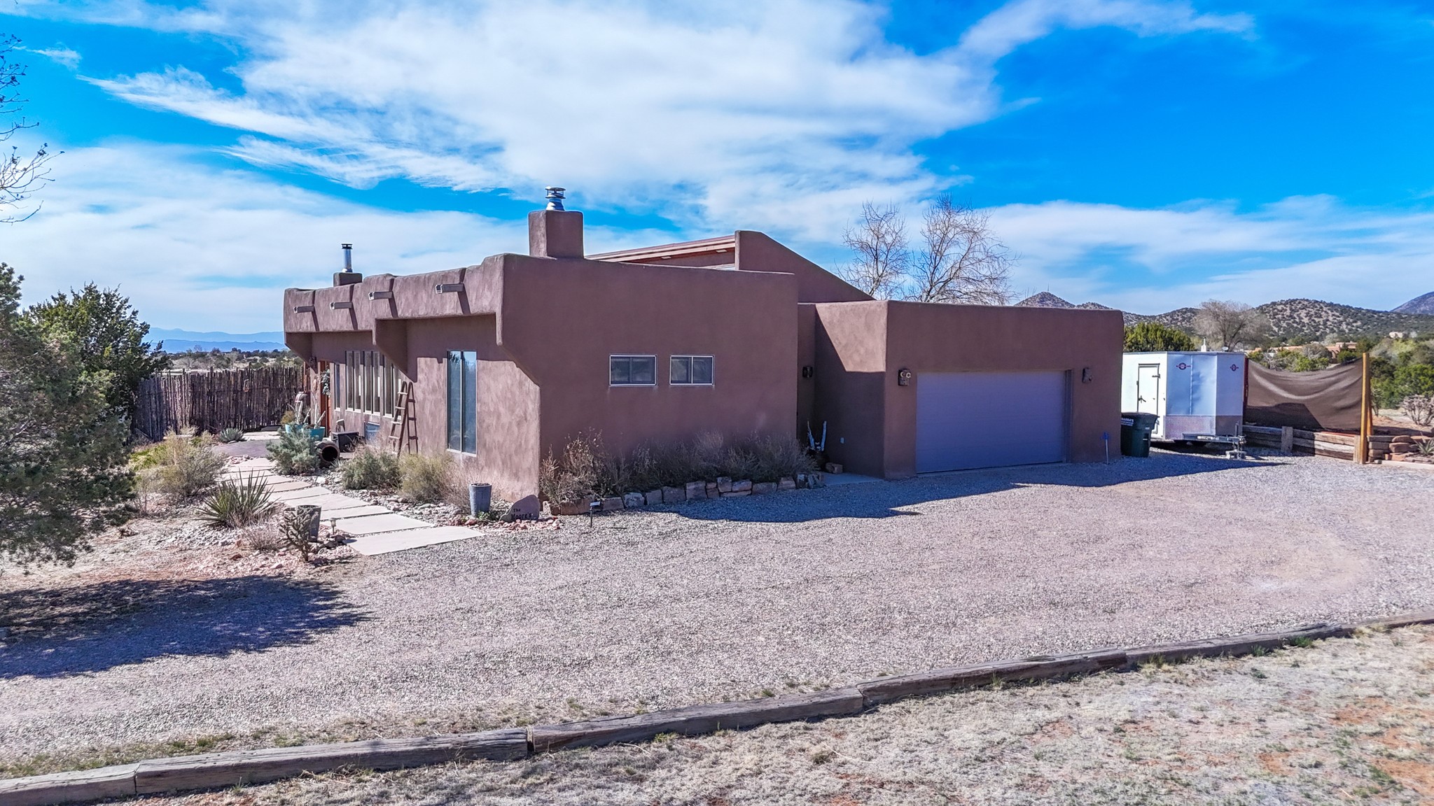 Welcome to this attractive passive solar home at 5 Puerto Road in the popular community of Eldorado, which is just a 15-minute drive south of the Santa Fe city limits. Located off of a quiet cul-de-sac and bordered by a spacious greenbelt, this gorgeous light-filled home on 2 acres is the one you've been waiting for.Upon entry you will notice the distinctive and appealing open floor plan design as the spacious kitchen opens to the living and dining rooms. You'll also enjoy the high ceilings with vigas in this single level home with beautifully-tiled flooring and no interior steps. The primary suite features clerestory windows, a walk-in closet, a separate, designated work or exercise area and direct access to the private outdoor hot tub! Additional and beneficial features are the newer photovoltaic solar panel system that significantly reduces the electric bill, trombe walls, a kiva fireplace and the oversized 2-car garage. The southwestern views of the Jemez, Ortiz and Sandia Mountains are magnificent. For the outdoor enthusiasts, Eldorado contains the best walking/biking paths and boasts one of the best outdoor swimming pools in Santa Fe County.