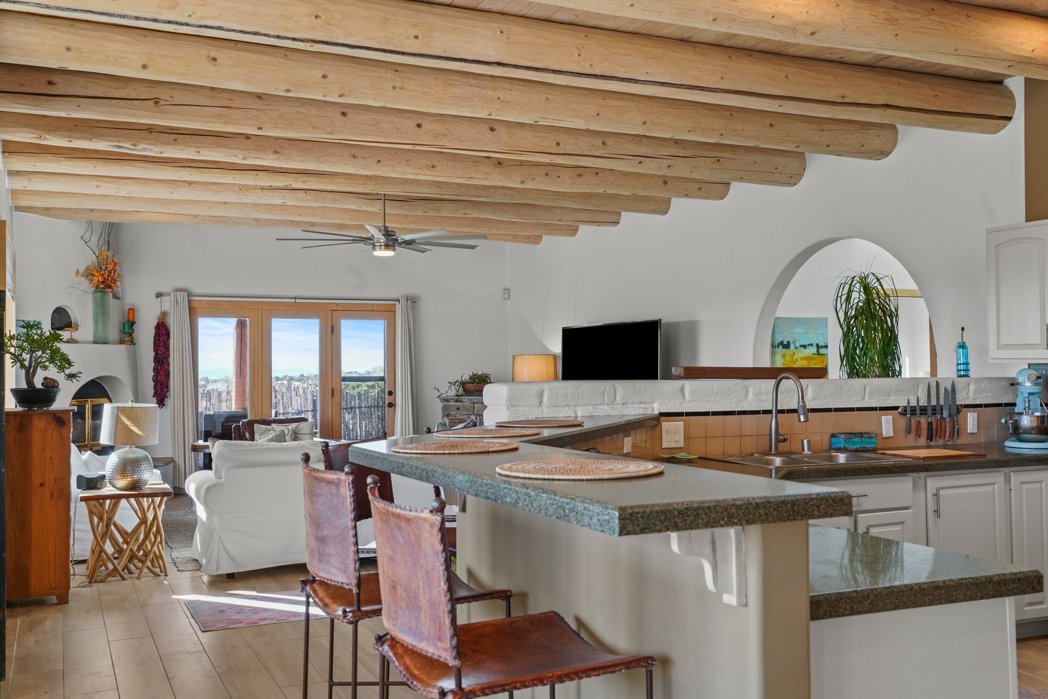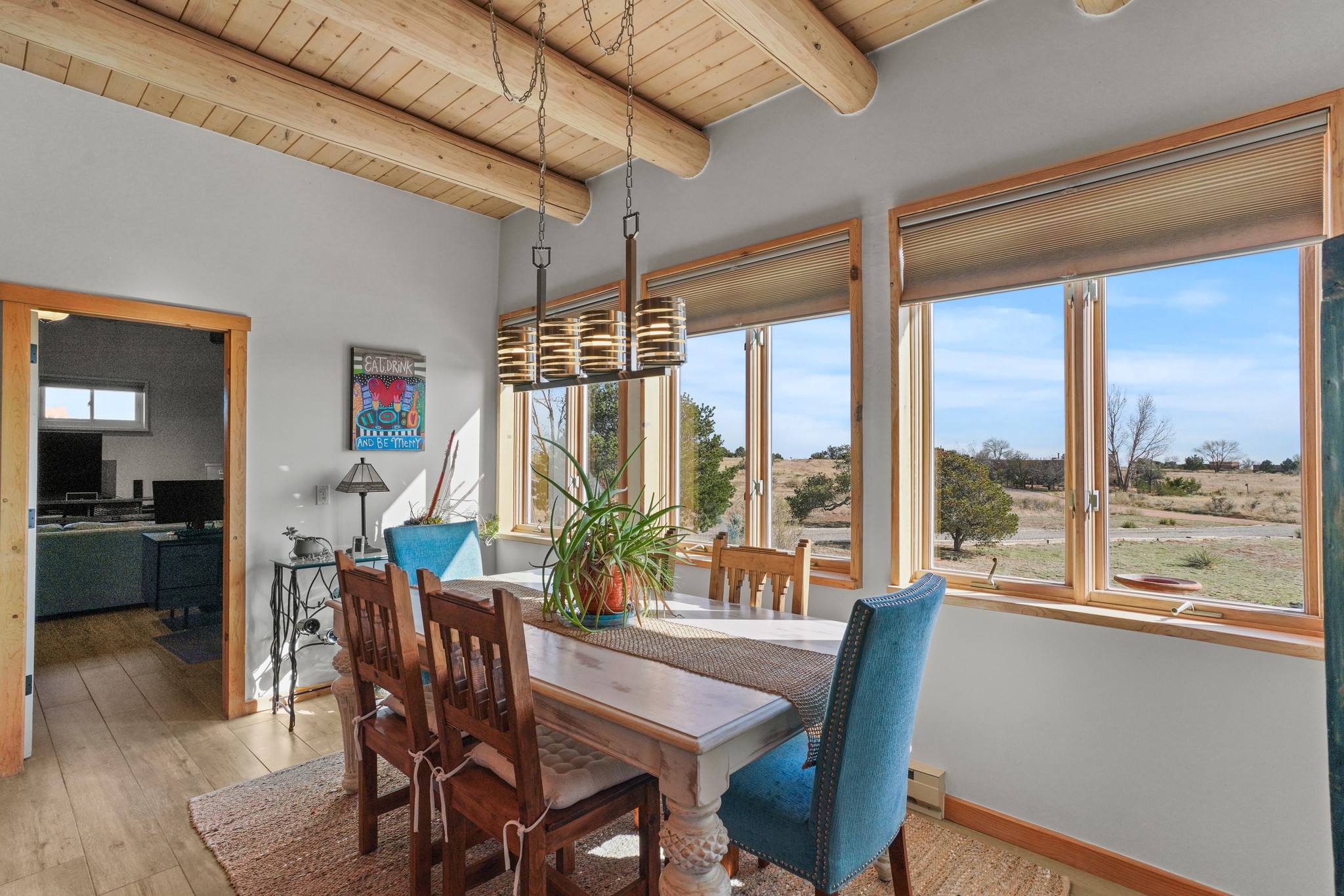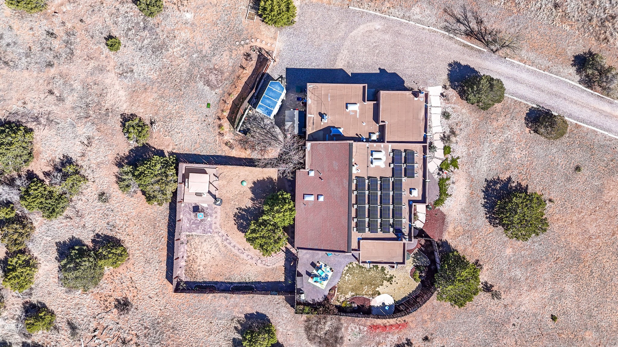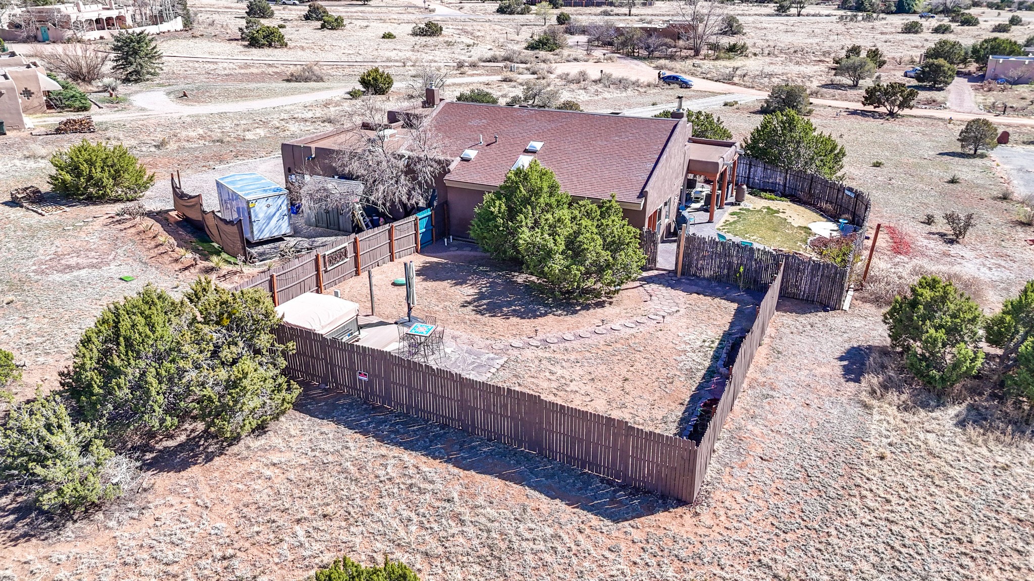 Welcome to this attractive passive solar home at 5 Puerto Road in the popular community of Eldorado, which is just a 15-minute drive south of the Santa Fe city limits. Located off of a quiet cul-de-sac and bordered by a spacious greenbelt, this gorgeous light-filled home on 2 acres is the one you've been waiting for.Upon entry you will notice the distinctive and appealing open floor plan design as the spacious kitchen opens to the living and dining rooms. You'll also enjoy the high ceilings with vigas in this single level home with beautifully-tiled flooring and no interior steps. The primary suite features clerestory windows, a walk-in closet, a separate, designated work or exercise area and direct access to the private outdoor hot tub! Additional and beneficial features are the newer photovoltaic solar panel system that significantly reduces the electric bill, trombe walls, a kiva fireplace and the oversized 2-car garage. The southwestern views of the Jemez, Ortiz and Sandia Mountains are magnificent. For the outdoor enthusiasts, Eldorado contains the best walking/biking paths and boasts one of the best outdoor swimming pools in Santa Fe County.