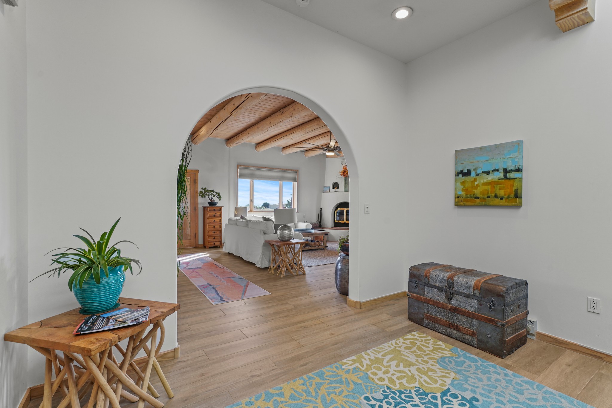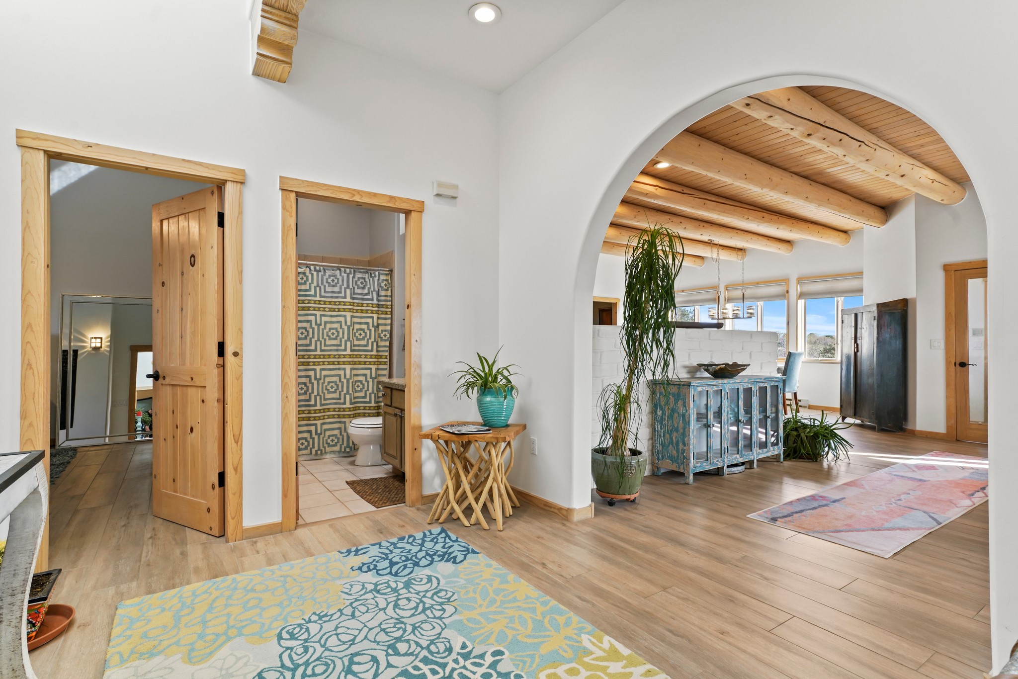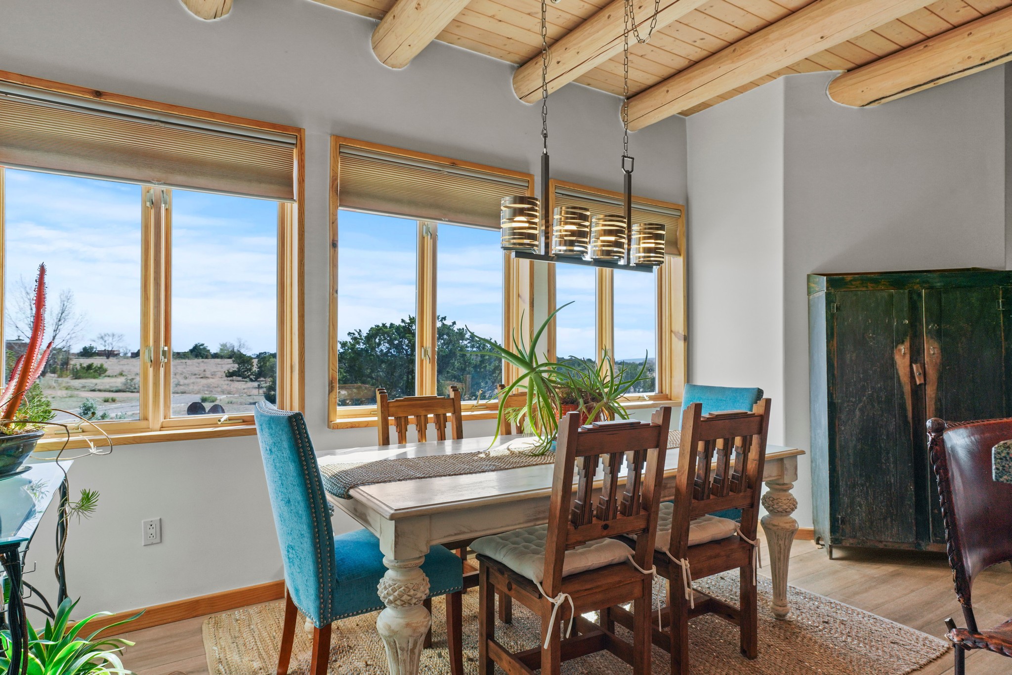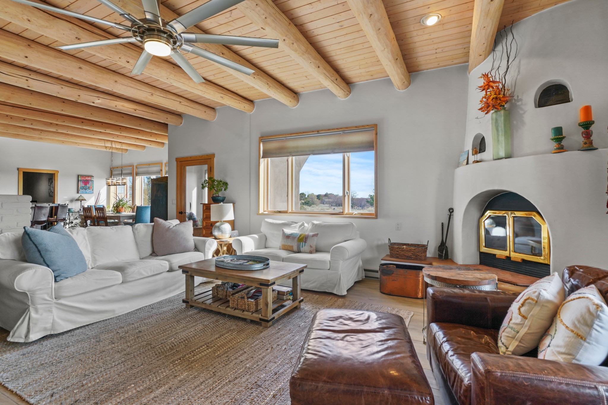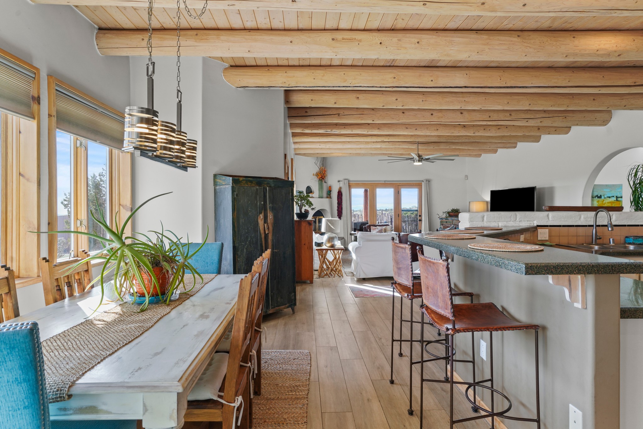 Welcome to this attractive passive solar home at 5 Puerto Road in the popular community of Eldorado, which is just a 15-minute drive south of the Santa Fe city limits. Located off of a quiet cul-de-sac and bordered by a spacious greenbelt, this gorgeous light-filled home on 2 acres is the one you've been waiting for.Upon entry you will notice the distinctive and appealing open floor plan design as the spacious kitchen opens to the living and dining rooms. You'll also enjoy the high ceilings with vigas in this single level home with beautifully-tiled flooring and no interior steps. The primary suite features clerestory windows, a walk-in closet, a separate, designated work or exercise area and direct access to the private outdoor hot tub! Additional and beneficial features are the newer photovoltaic solar panel system that significantly reduces the electric bill, trombe walls, a kiva fireplace and the oversized 2-car garage. The southwestern views of the Jemez, Ortiz and Sandia Mountains are magnificent. For the outdoor enthusiasts, Eldorado contains the best walking/biking paths and boasts one of the best outdoor swimming pools in Santa Fe County.