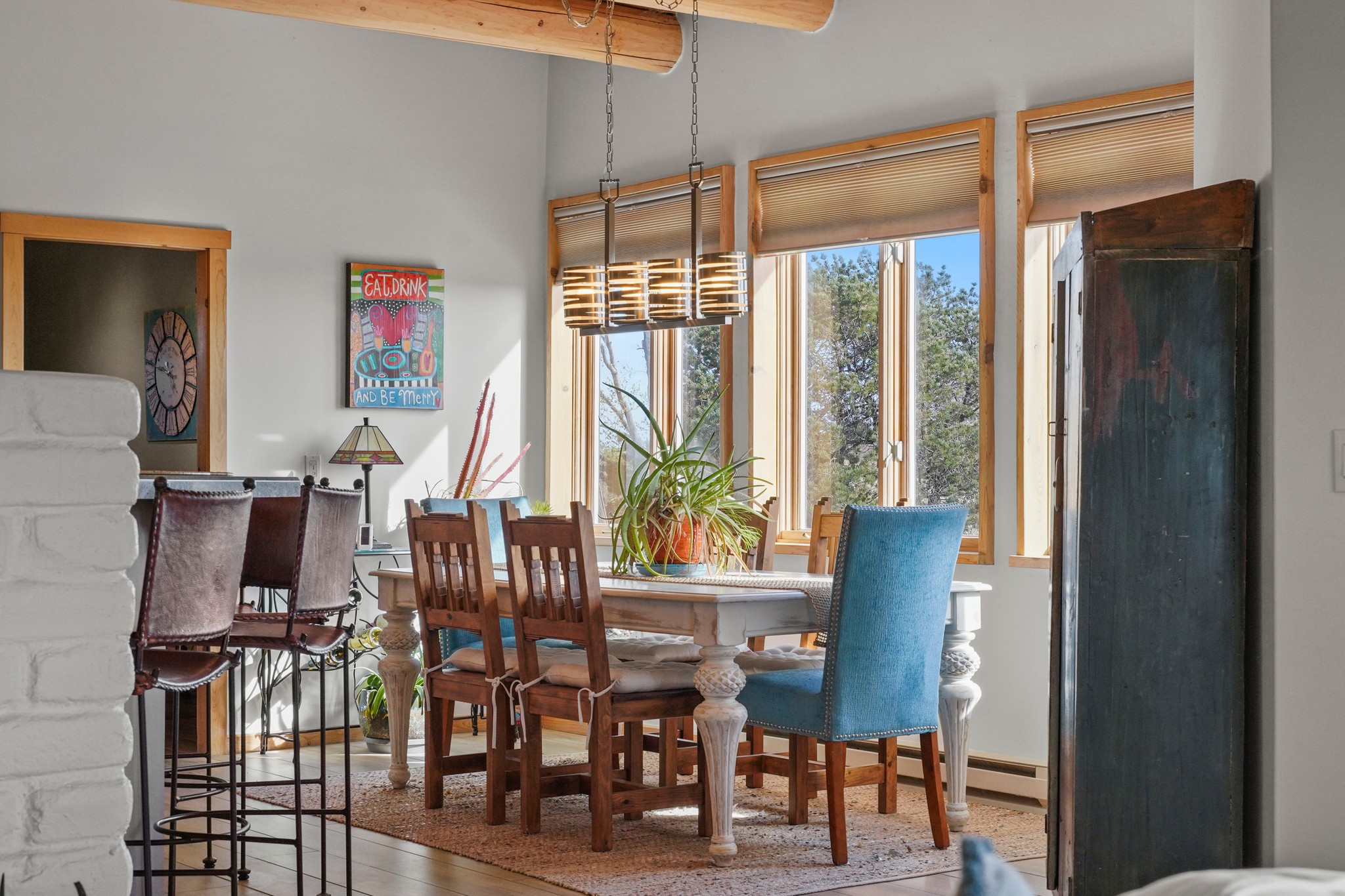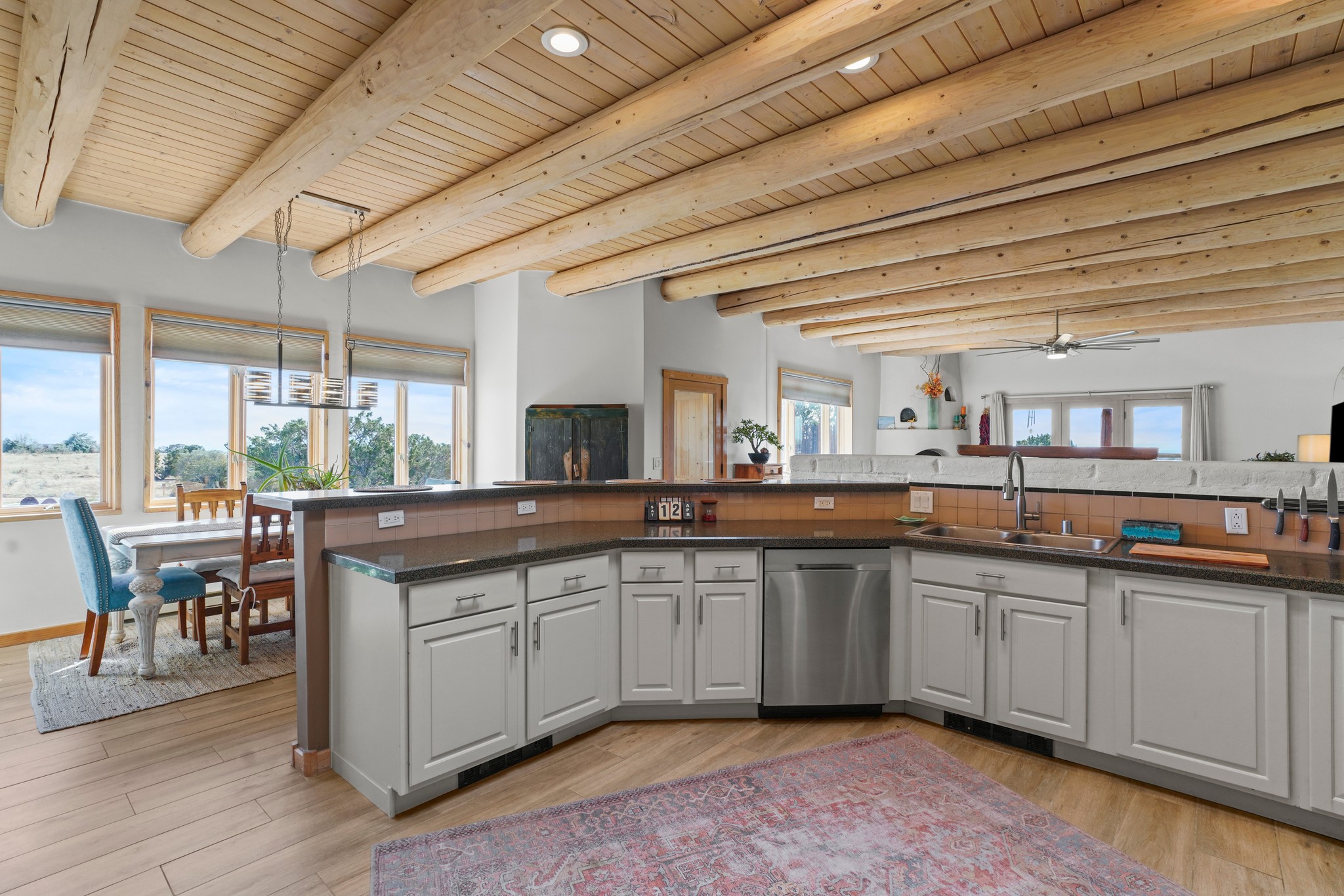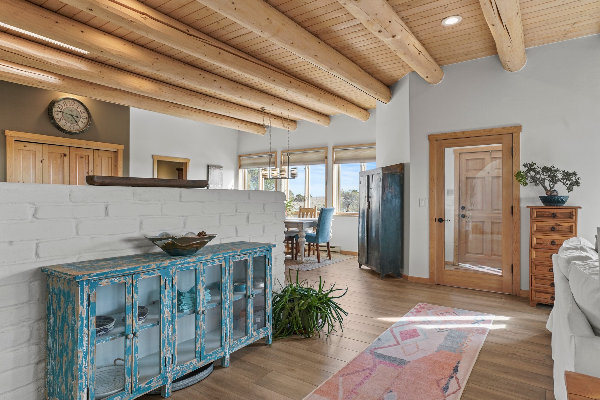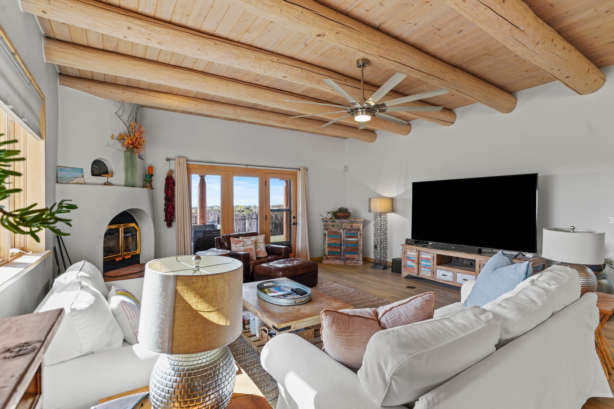 Welcome to this attractive passive solar home at 5 Puerto Road in the popular community of Eldorado, which is just a 15-minute drive south of the Santa Fe city limits. Located off of a quiet cul-de-sac and bordered by a spacious greenbelt, this gorgeous light-filled home on 2 acres is the one you've been waiting for.Upon entry you will notice the distinctive and appealing open floor plan design as the spacious kitchen opens to the living and dining rooms. You'll also enjoy the high ceilings with vigas in this single level home with beautifully-tiled flooring and no interior steps. The primary suite features clerestory windows, a walk-in closet, a separate, designated work or exercise area and direct access to the private outdoor hot tub! Additional and beneficial features are the newer photovoltaic solar panel system that significantly reduces the electric bill, trombe walls, a kiva fireplace and the oversized 2-car garage. The southwestern views of the Jemez, Ortiz and Sandia Mountains are magnificent. For the outdoor enthusiasts, Eldorado contains the best walking/biking paths and boasts one of the best outdoor swimming pools in Santa Fe County.