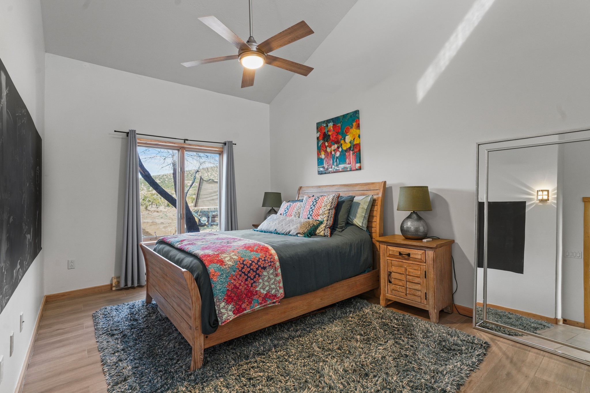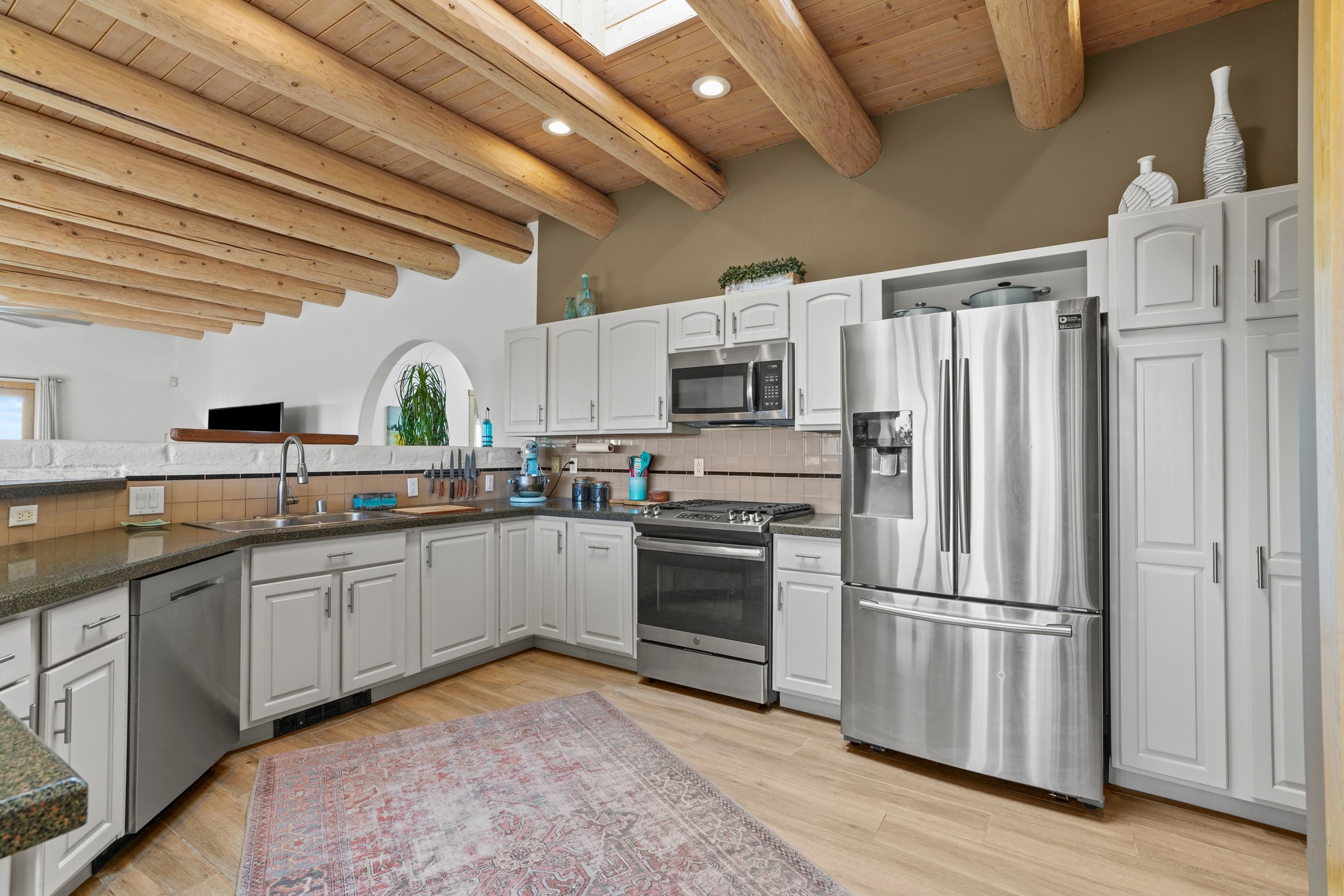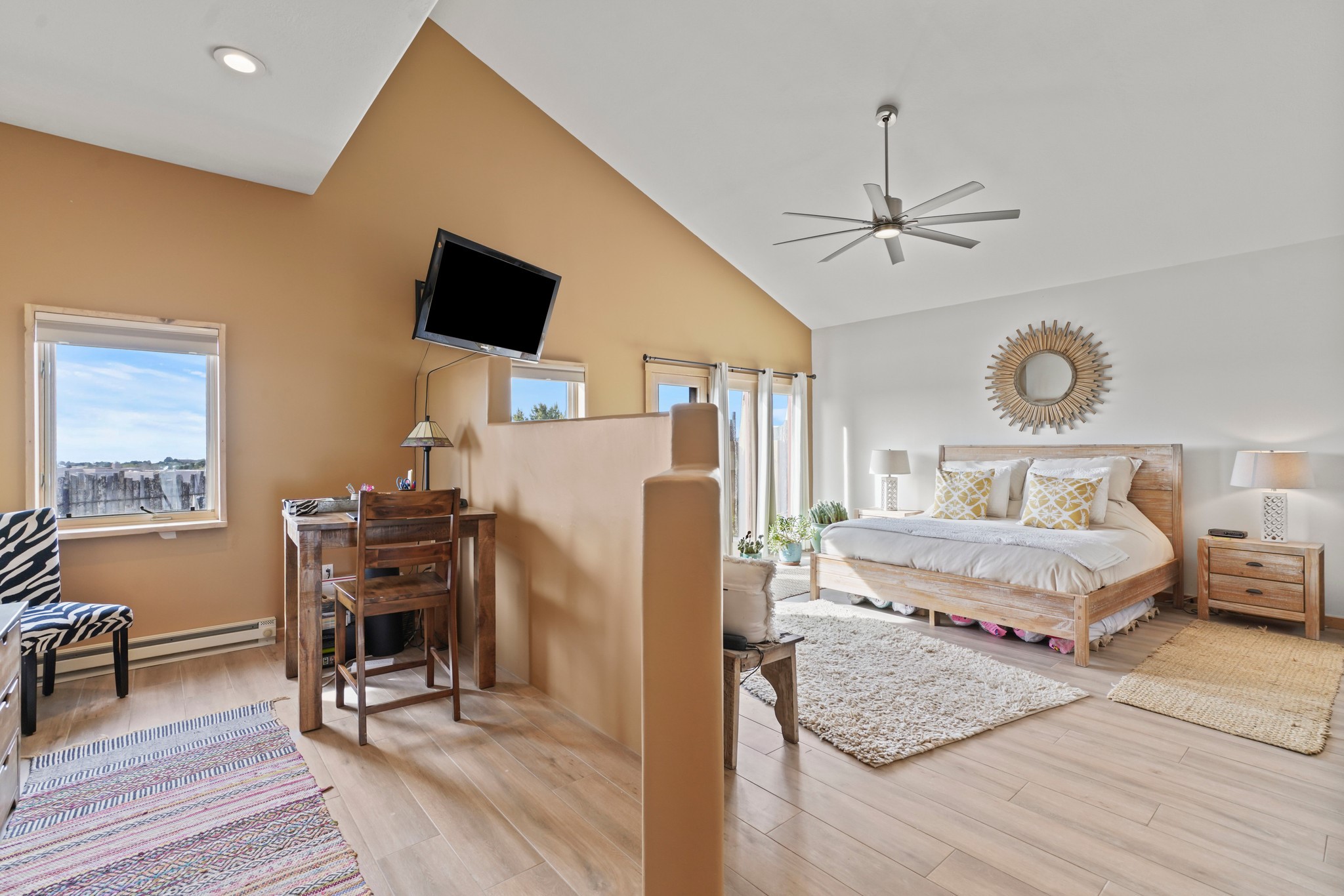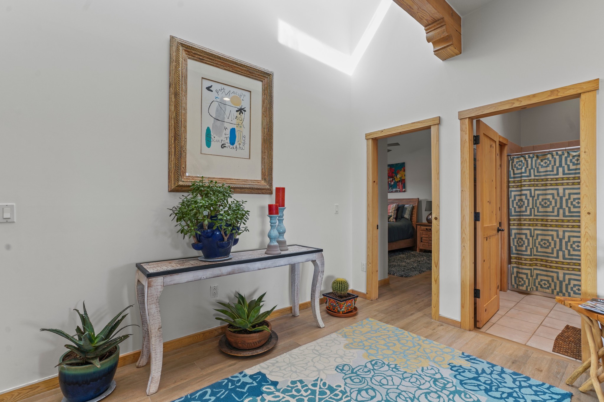 Welcome to this attractive passive solar home at 5 Puerto Road in the popular community of Eldorado, which is just a 15-minute drive south of the Santa Fe city limits. Located off of a quiet cul-de-sac and bordered by a spacious greenbelt, this gorgeous light-filled home on 2 acres is the one you've been waiting for.Upon entry you will notice the distinctive and appealing open floor plan design as the spacious kitchen opens to the living and dining rooms. You'll also enjoy the high ceilings with vigas in this single level home with beautifully-tiled flooring and no interior steps. The primary suite features clerestory windows, a walk-in closet, a separate, designated work or exercise area and direct access to the private outdoor hot tub! Additional and beneficial features are the newer photovoltaic solar panel system that significantly reduces the electric bill, trombe walls, a kiva fireplace and the oversized 2-car garage. The southwestern views of the Jemez, Ortiz and Sandia Mountains are magnificent. For the outdoor enthusiasts, Eldorado contains the best walking/biking paths and boasts one of the best outdoor swimming pools in Santa Fe County.