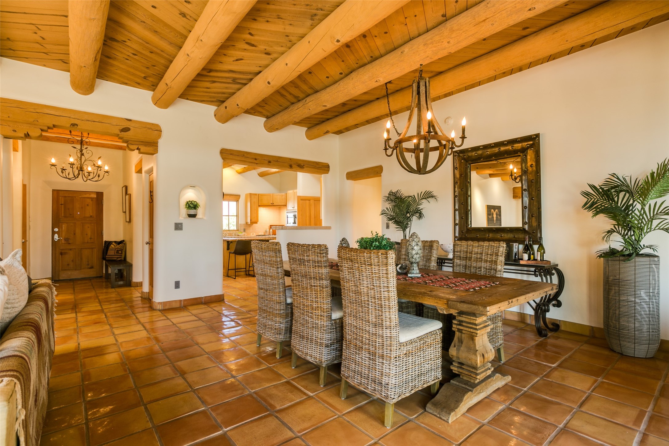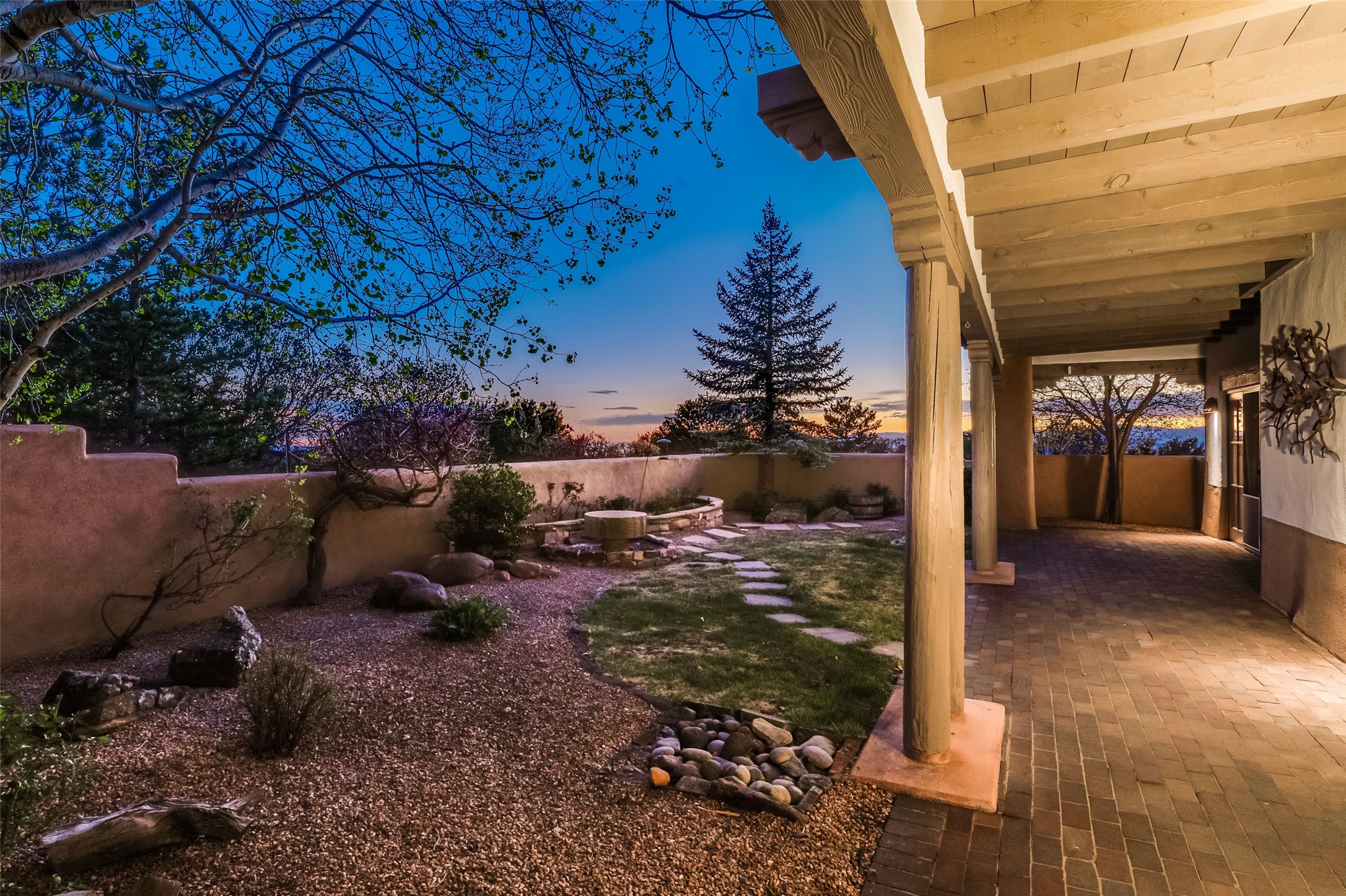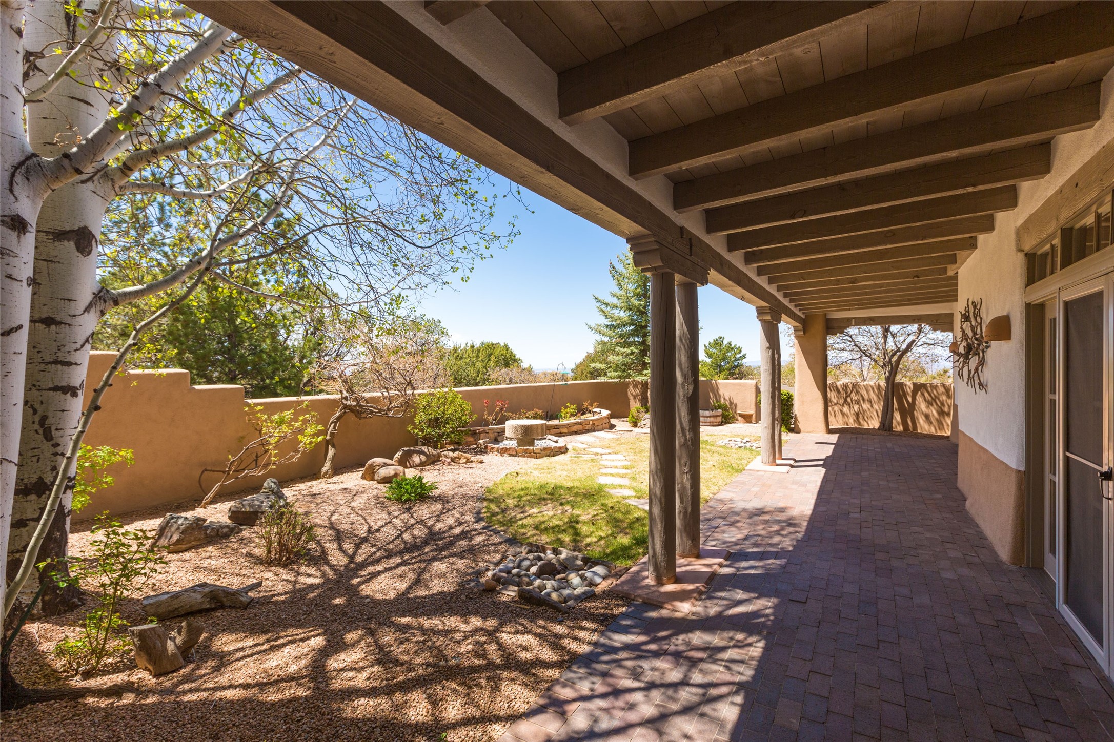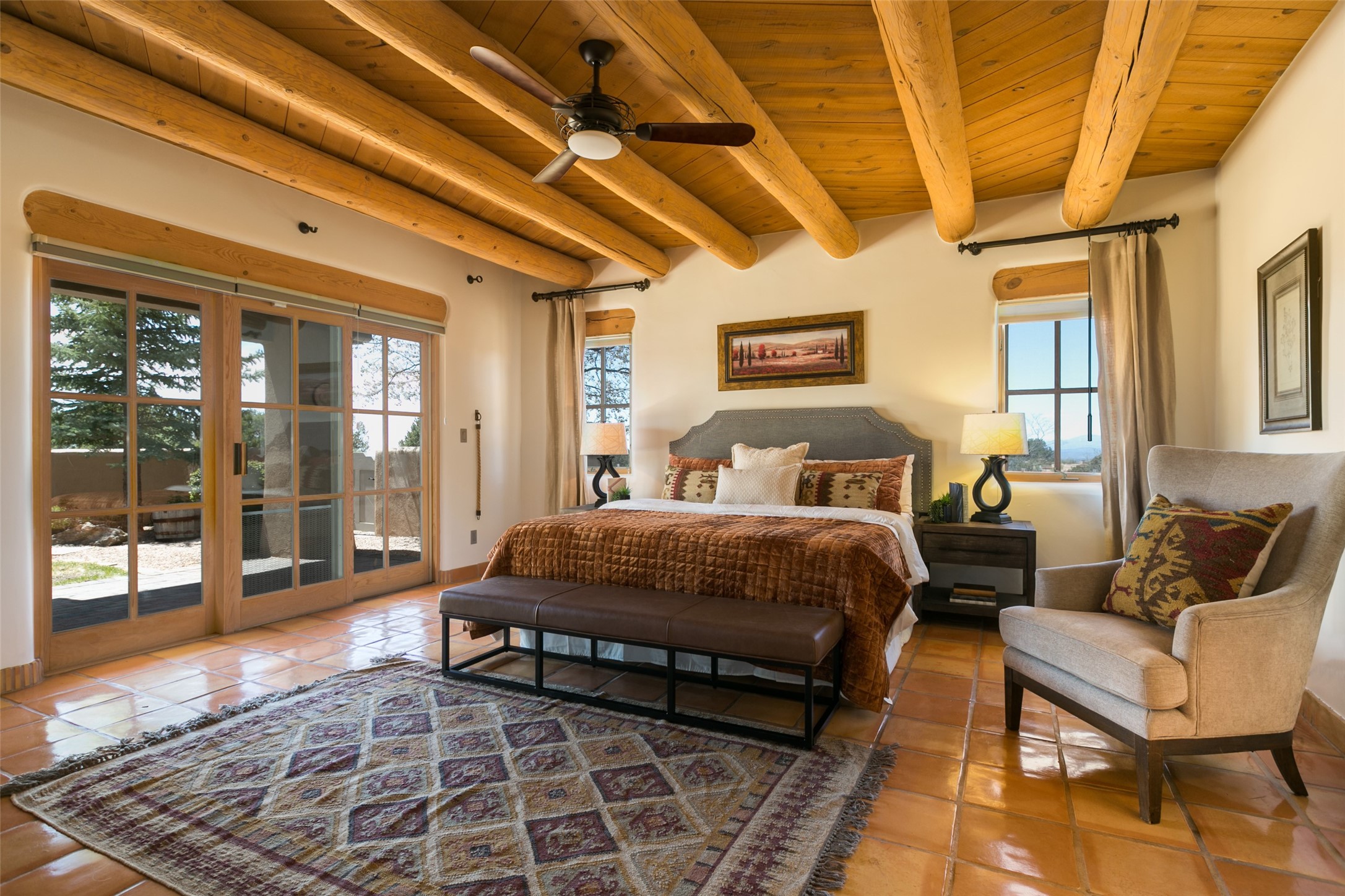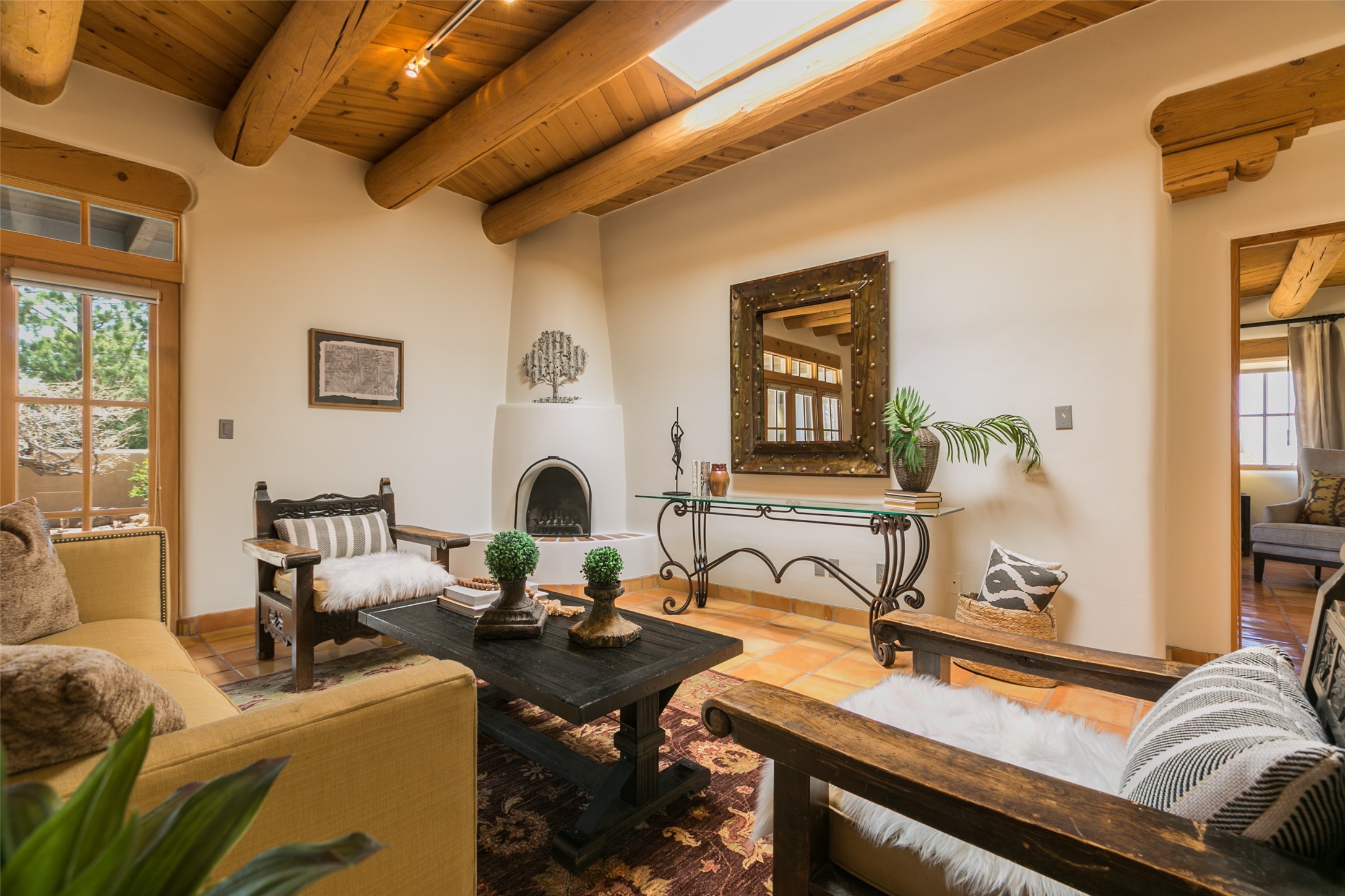Nestled in the prestigious, 24/7 guard-gated community of Quail Run, this elegant home blends resort-style amenities with Southwestern charm. Enjoy scenic trails, tennis and pickleball courts, a fitness center with indoor lap and hydrotherapy pools, fitness classes, a 9-hole PGA-rated golf course, on-site dining, and 24-hour security. The home features Saltillo tile, vaulted ceilings with vigas, Kiva fireplaces, picture windows, and an open-concept layout flowing to a private courtyard and walled yard. The home includes 3 ensuite bedrooms, 4 baths, an office, and kitchen with stone island & ample cabinetry. Unwind on the outdoor deck while taking in spectacular sunsets and breathtaking mountain views. A rare chance to enjoy upscale living in one of Santa Fe's most sought-after communities.
