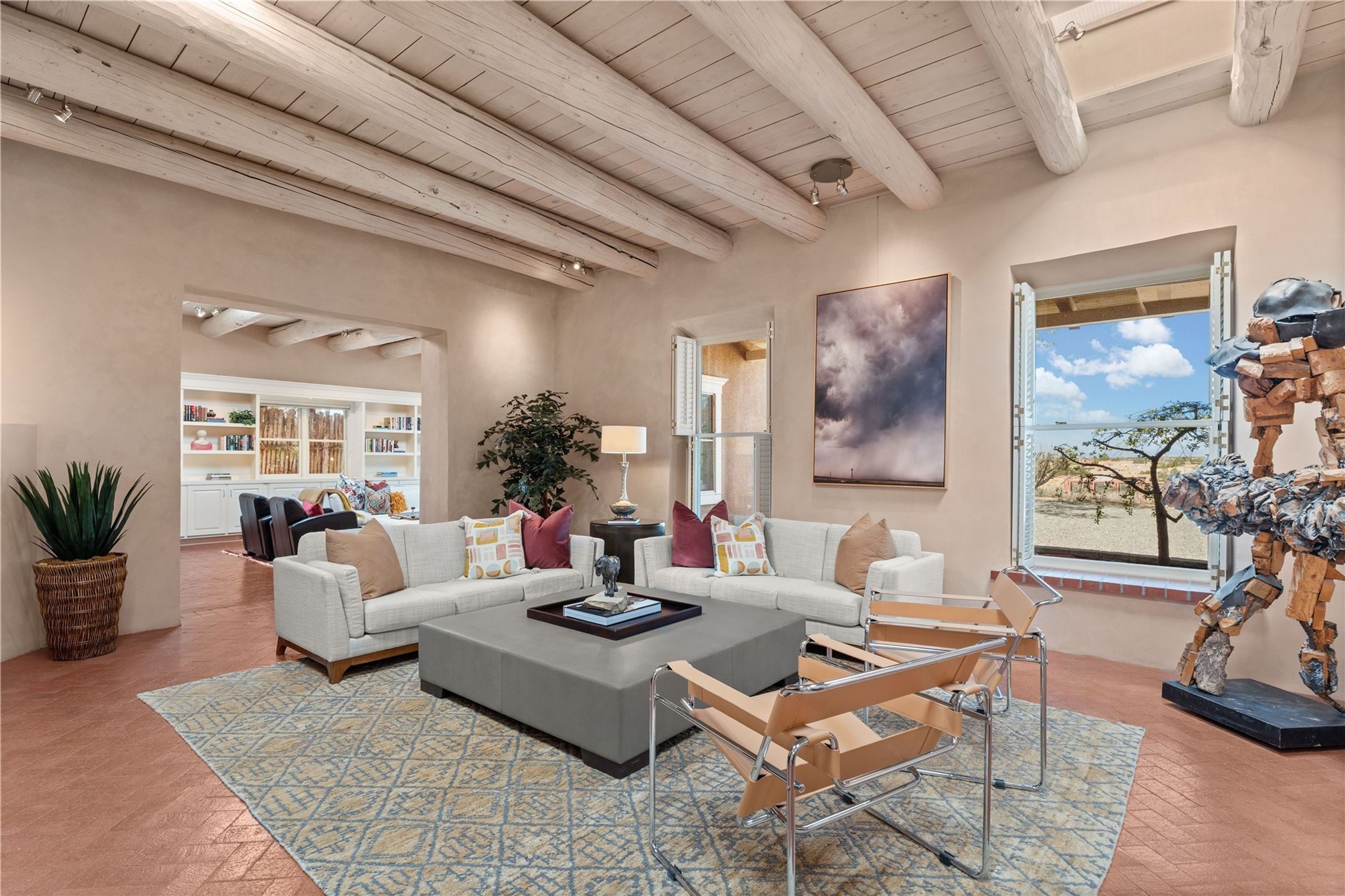This unique and beautiful 3-bedroom, 3-bath modified Territorial-style, adobe home features unobstructed east-west mountain views and a tableau of breathtaking sunrises and sunsets. Designed by Doug Atwill, a Santa Fe builder/artist with exceptional vision, this home also features 13 ft. high beamed ceilings, 23 skylights, and radiant-heated brick floors complemented by 3 fireplaces. As you enter, a wide and gracious hallway welcomes and guides you to the back portal with stunning views of the eastern mountains. Situated to align with the summer solstice, this central hallway enjoys abundant light and provides a perfect place for displaying artwork. Public areas of the home, including elegant living room, library/media room, and spacious kitchen/dining room, are located on the south side of the hall while the private bedrooms are located on the north side. An outdoor grilling/barbecue station, hot tub, and multiple portals/patios, provide ample space for relaxation and entertaining. Gardeners and chefs alike will delight in the property's mature fruit trees and 2 waist-high irrigated planting beds. Oversized (built 2020) two-car detached garage features heating/cooling, floor-to-ceiling cabinets, art storage, EV charger, 220-volt RV charger and rooftop viewing/entertainment deck with panoramic mountain views. Environmentally conscious buyers will appreciate the green features including the solar photovoltaic electric system. Water monitoring and shut off system. Located less than one mile north of Fort Marcy and the historic Santa Fe Plaza.