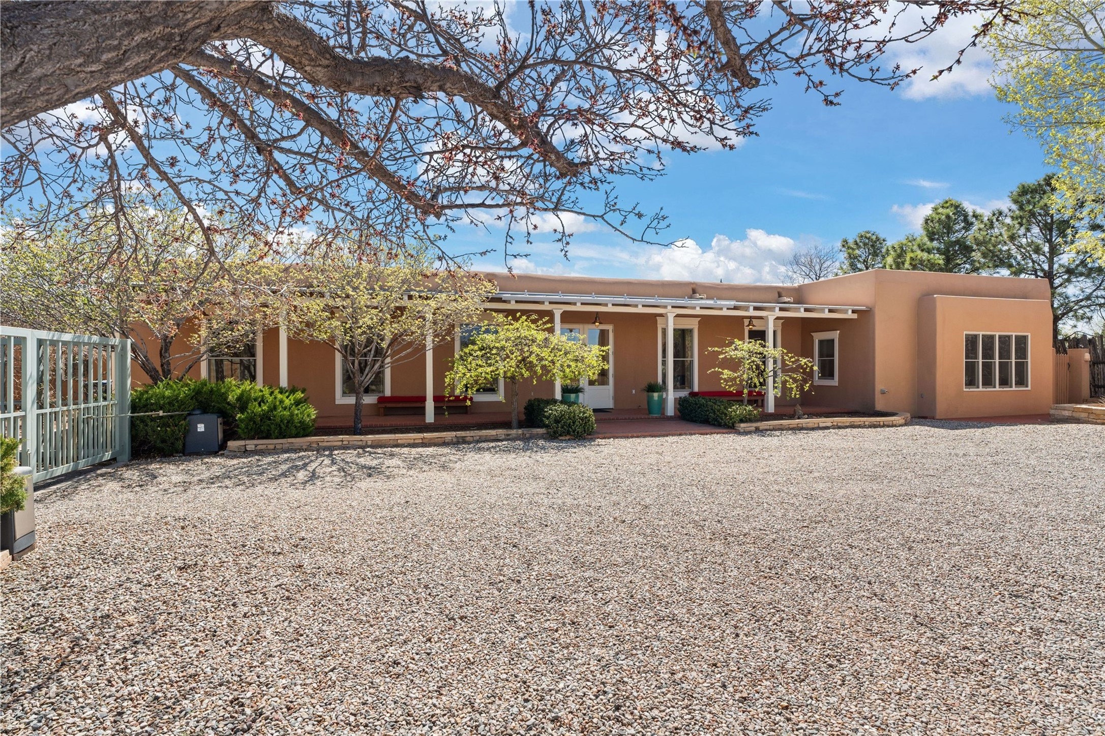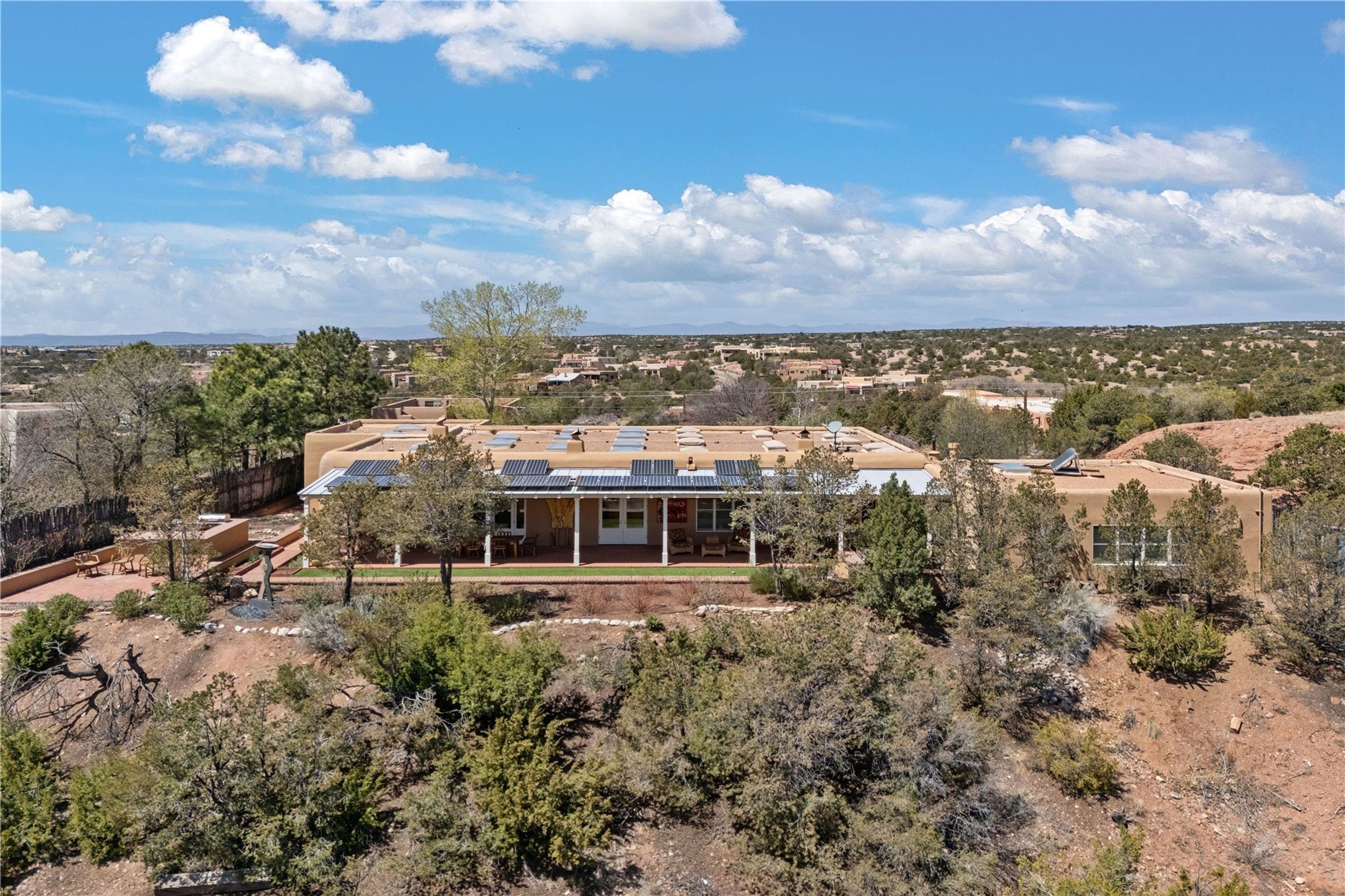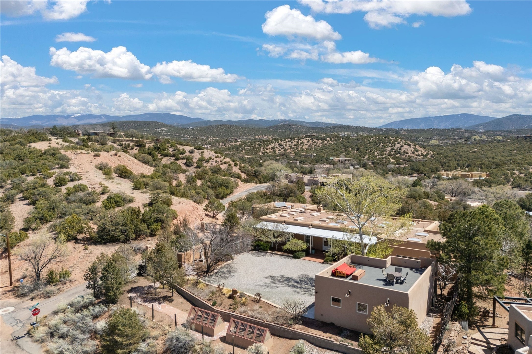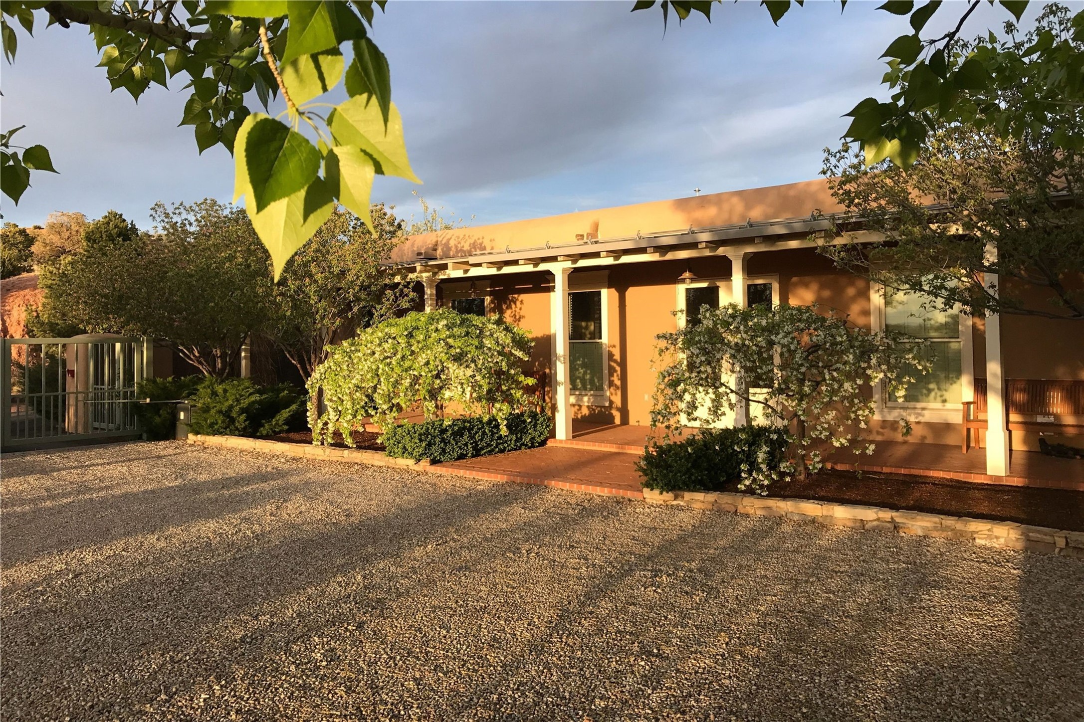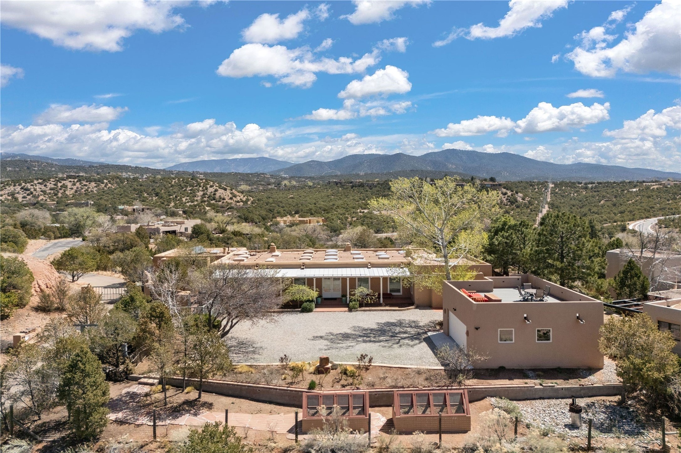 This unique and beautiful 3-bedroom, 3-bath modified Territorial-style, adobe home features unobstructed east-west mountain views and a tableau of breathtaking sunrises and sunsets. Designed by Doug Atwill, a Santa Fe builder/artist with exceptional vision, this home also features 13 ft. high beamed ceilings, 23 skylights, and radiant-heated brick floors complemented by 3 fireplaces. As you enter, a wide and gracious hallway welcomes and guides you to the back portal with stunning views of the eastern mountains. Situated to align with the summer solstice, this central hallway enjoys abundant light and provides a perfect place for displaying artwork. Public areas of the home, including elegant living room, library/media room, and spacious kitchen/dining room, are located on the south side of the hall while the private bedrooms are located on the north side. An outdoor grilling/barbecue station, hot tub, and multiple portals/patios, provide ample space for relaxation and entertaining. Gardeners and chefs alike will delight in the property's mature fruit trees and 2 waist-high irrigated planting beds. Oversized (built 2020) two-car detached garage features heating/cooling, floor-to-ceiling cabinets, art storage, EV charger, 220-volt RV charger and rooftop viewing/entertainment deck with panoramic mountain views. Environmentally conscious buyers will appreciate the green features including the solar photovoltaic electric system. Water monitoring and shut off system. Located less than one mile north of Fort Marcy and the historic Santa Fe Plaza.