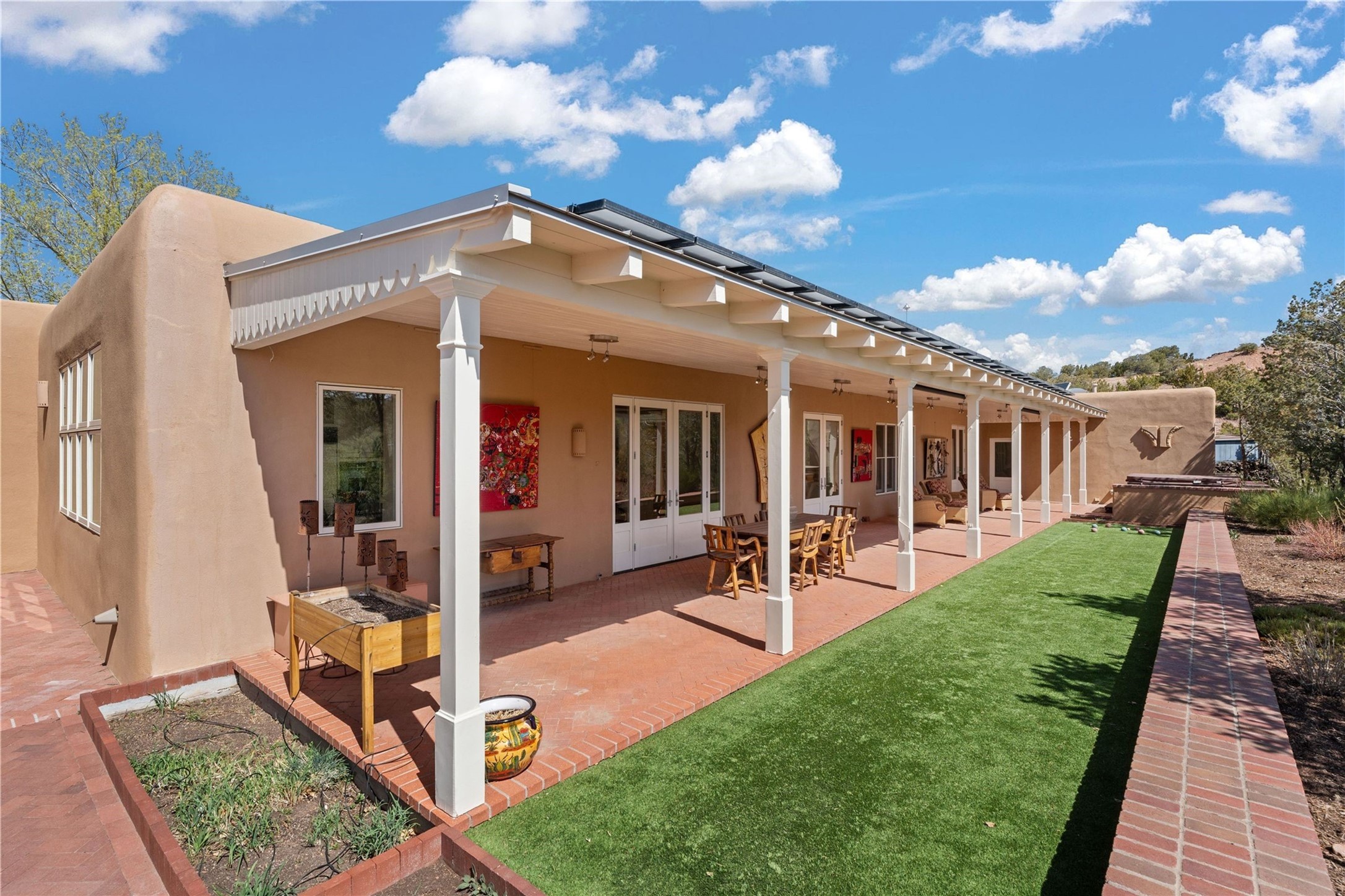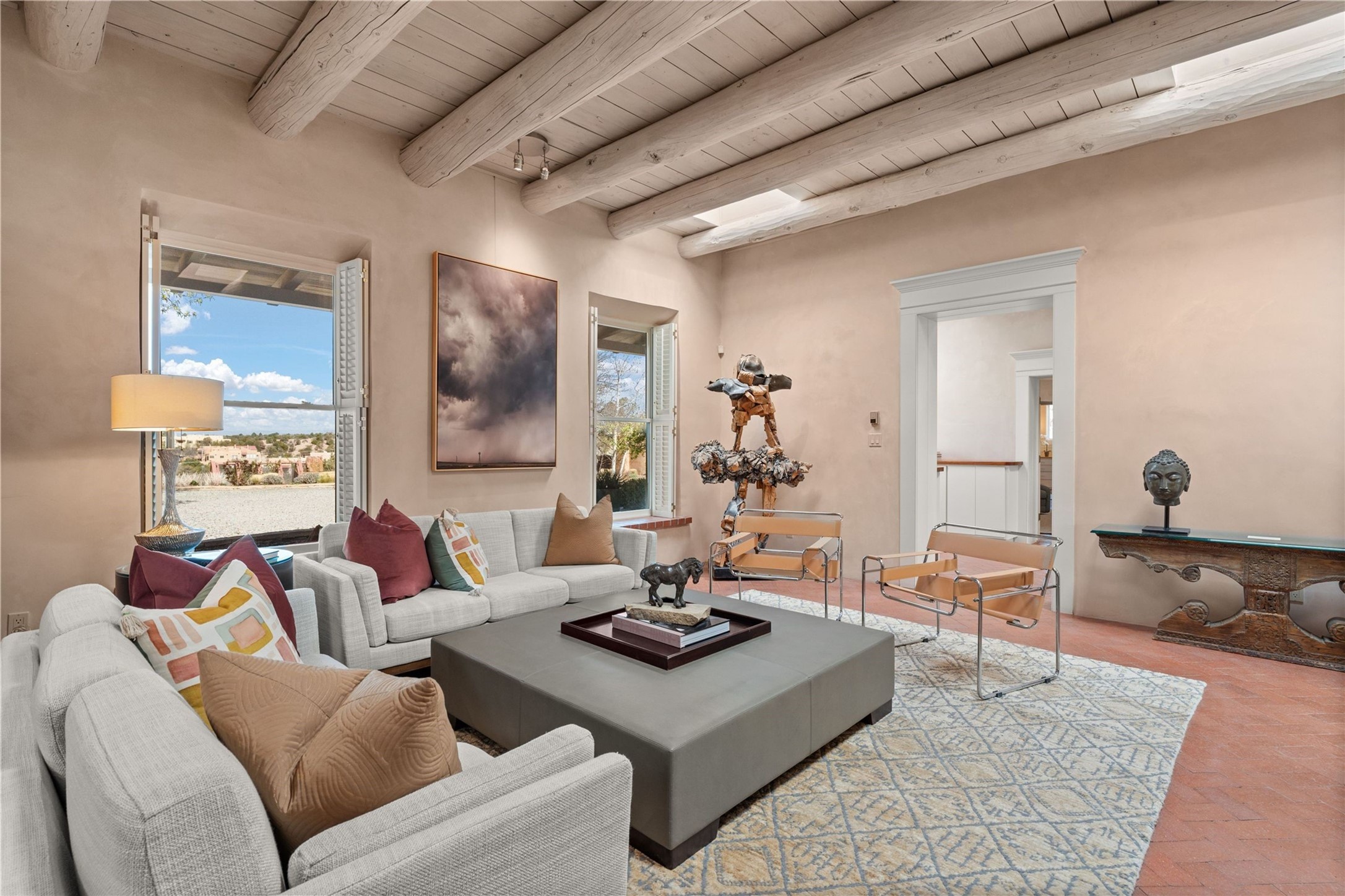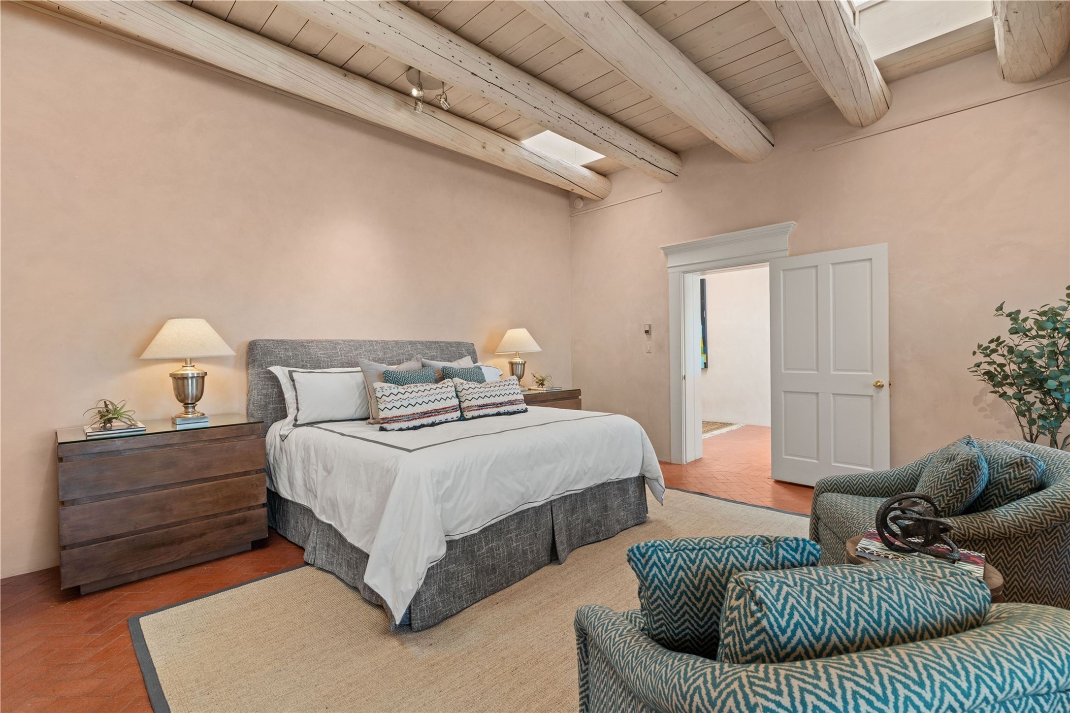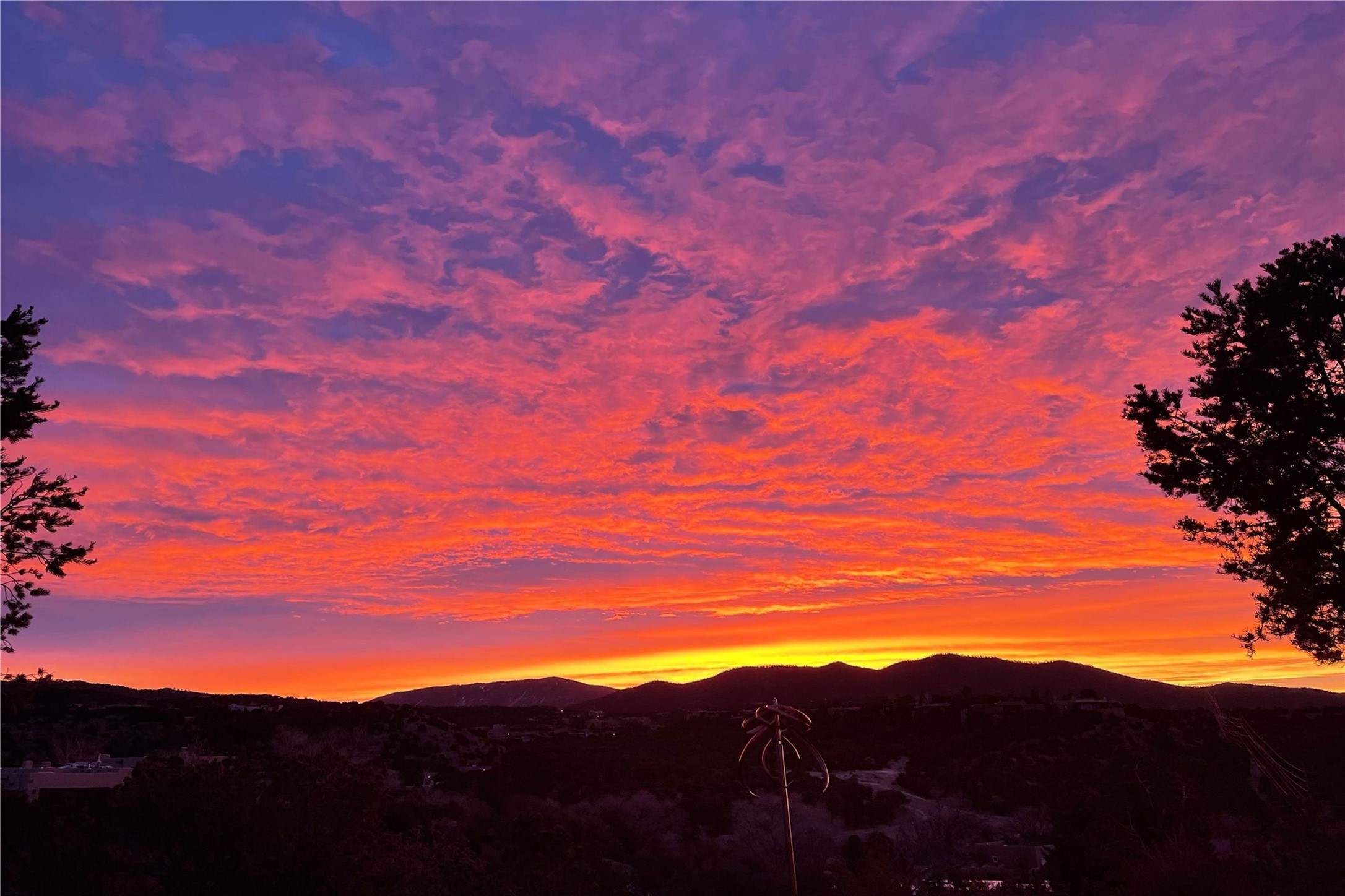 This unique and beautiful 3-bedroom, 3-bath modified Territorial-style, adobe home features unobstructed east-west mountain views and a tableau of breathtaking sunrises and sunsets. Designed by Doug Atwill, a Santa Fe builder/artist with exceptional vision, this home also features 13 ft. high beamed ceilings, 23 skylights, and radiant-heated brick floors complemented by 3 fireplaces. As you enter, a wide and gracious hallway welcomes and guides you to the back portal with stunning views of the eastern mountains. Situated to align with the summer solstice, this central hallway enjoys abundant light and provides a perfect place for displaying artwork. Public areas of the home, including elegant living room, library/media room, and spacious kitchen/dining room, are located on the south side of the hall while the private bedrooms are located on the north side. An outdoor grilling/barbecue station, hot tub, and multiple portals/patios, provide ample space for relaxation and entertaining. Gardeners and chefs alike will delight in the property's mature fruit trees and 2 waist-high irrigated planting beds. Oversized (built 2020) two-car detached garage features heating/cooling, floor-to-ceiling cabinets, art storage, EV charger, 220-volt RV charger and rooftop viewing/entertainment deck with panoramic mountain views. Environmentally conscious buyers will appreciate the green features including the solar photovoltaic electric system. Water monitoring and shut off system. Located less than one mile north of Fort Marcy and the historic Santa Fe Plaza.