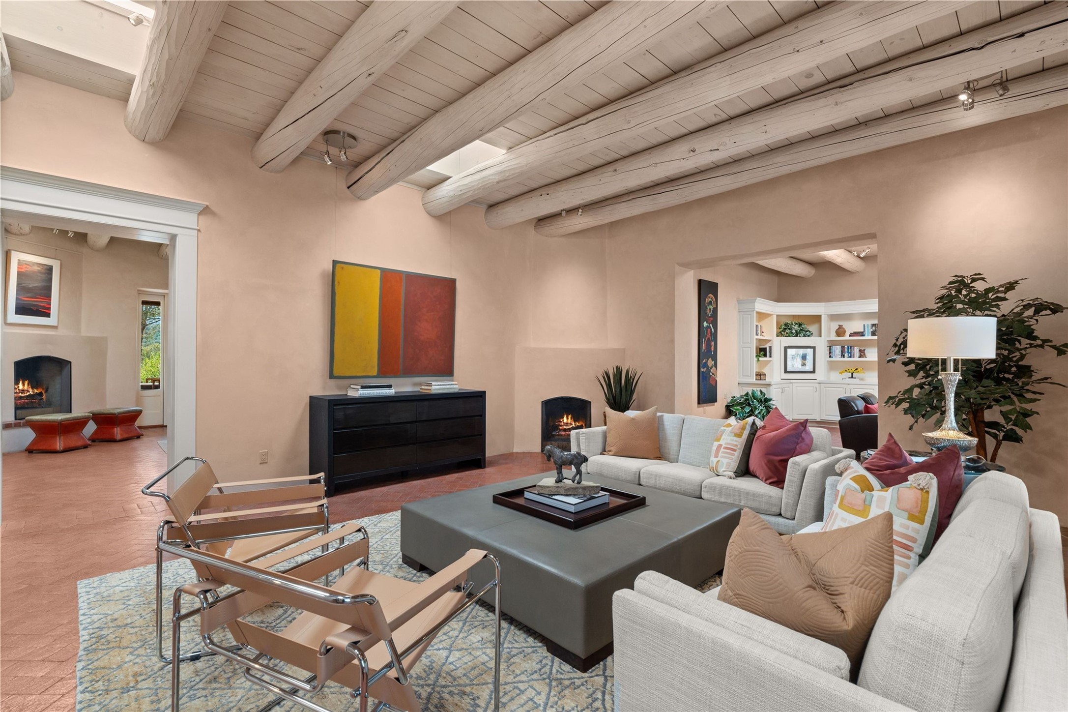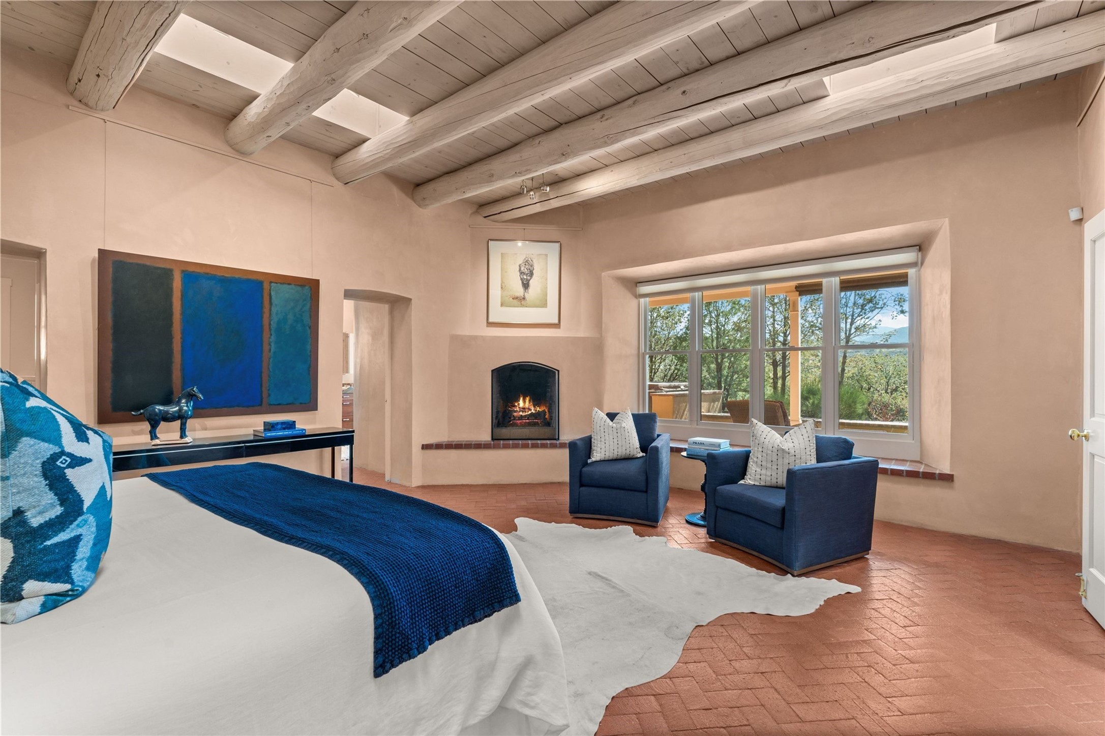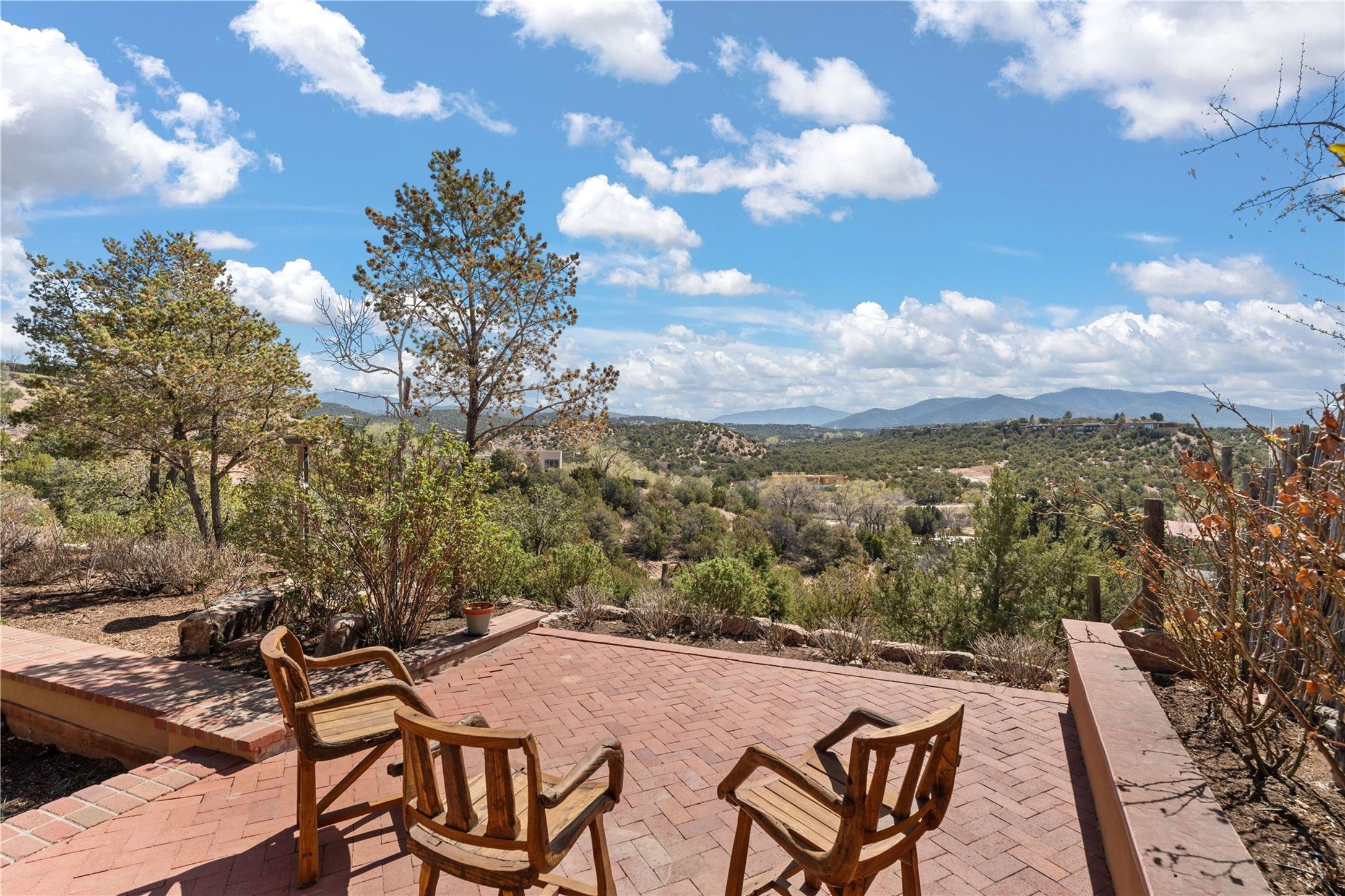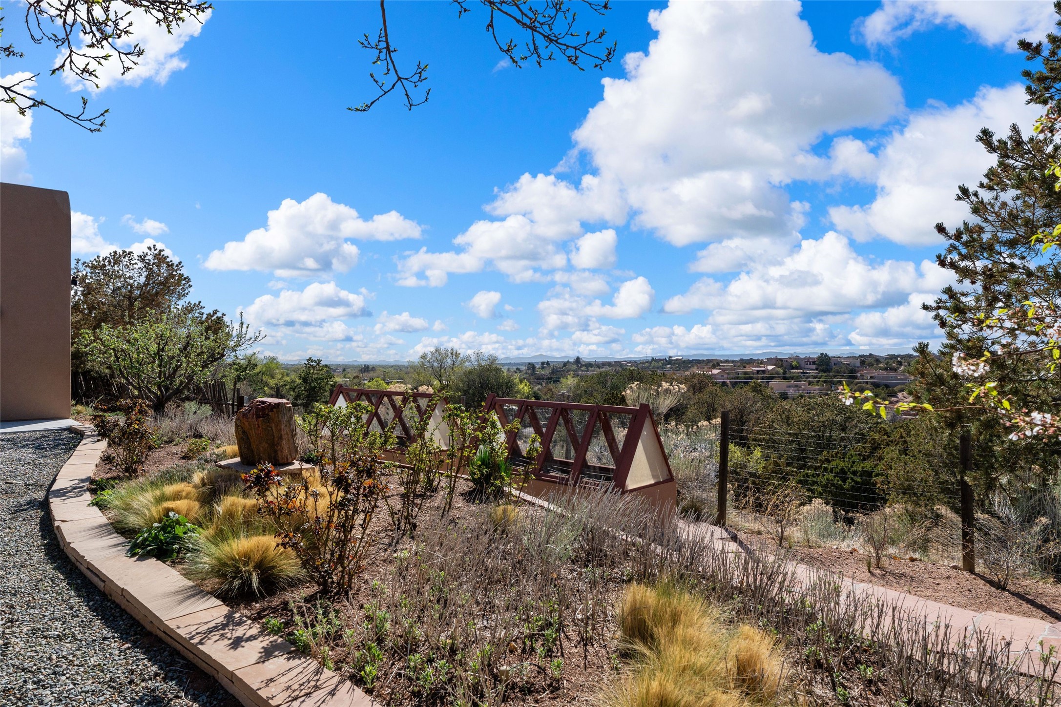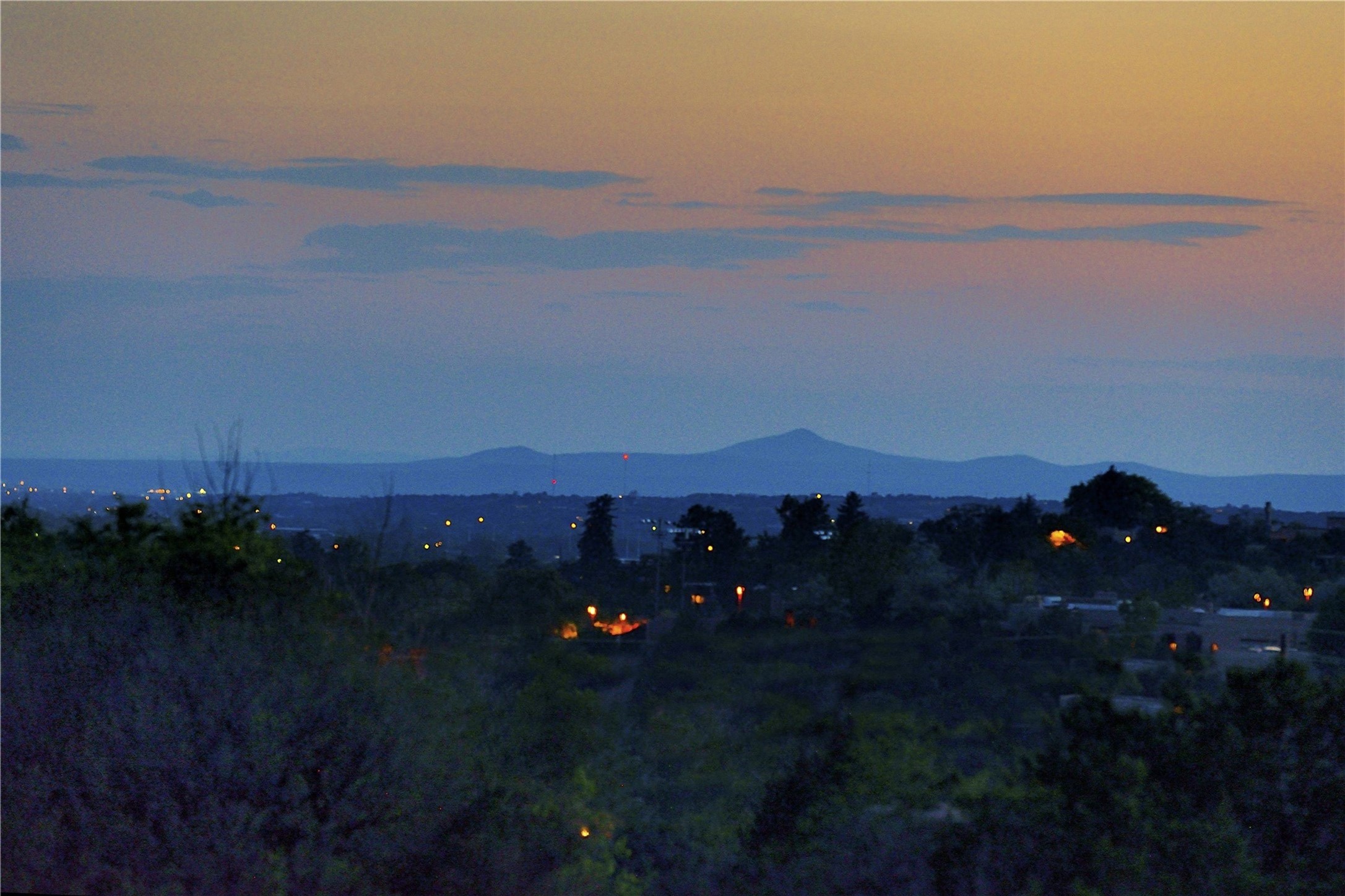 This unique and beautiful 3-bedroom, 3-bath modified Territorial-style, adobe home features unobstructed east-west mountain views and a tableau of breathtaking sunrises and sunsets. Designed by Doug Atwill, a Santa Fe builder/artist with exceptional vision, this home also features 13 ft. high beamed ceilings, 23 skylights, and radiant-heated brick floors complemented by 3 fireplaces. As you enter, a wide and gracious hallway welcomes and guides you to the back portal with stunning views of the eastern mountains. Situated to align with the summer solstice, this central hallway enjoys abundant light and provides a perfect place for displaying artwork. Public areas of the home, including elegant living room, library/media room, and spacious kitchen/dining room, are located on the south side of the hall while the private bedrooms are located on the north side. An outdoor grilling/barbecue station, hot tub, and multiple portals/patios, provide ample space for relaxation and entertaining. Gardeners and chefs alike will delight in the property's mature fruit trees and 2 waist-high irrigated planting beds. Oversized (built 2020) two-car detached garage features heating/cooling, floor-to-ceiling cabinets, art storage, EV charger, 220-volt RV charger and rooftop viewing/entertainment deck with panoramic mountain views. Environmentally conscious buyers will appreciate the green features including the solar photovoltaic electric system. Water monitoring and shut off system. Located less than one mile north of Fort Marcy and the historic Santa Fe Plaza.