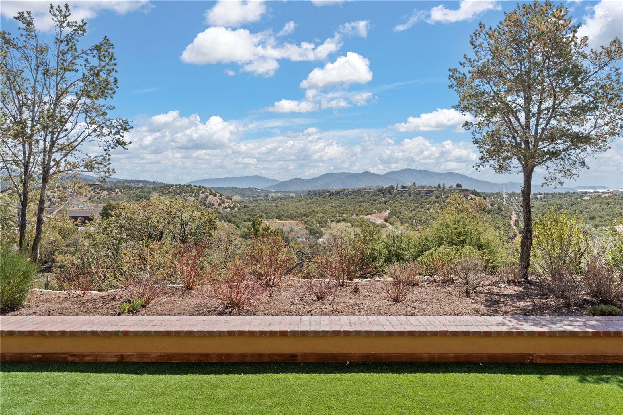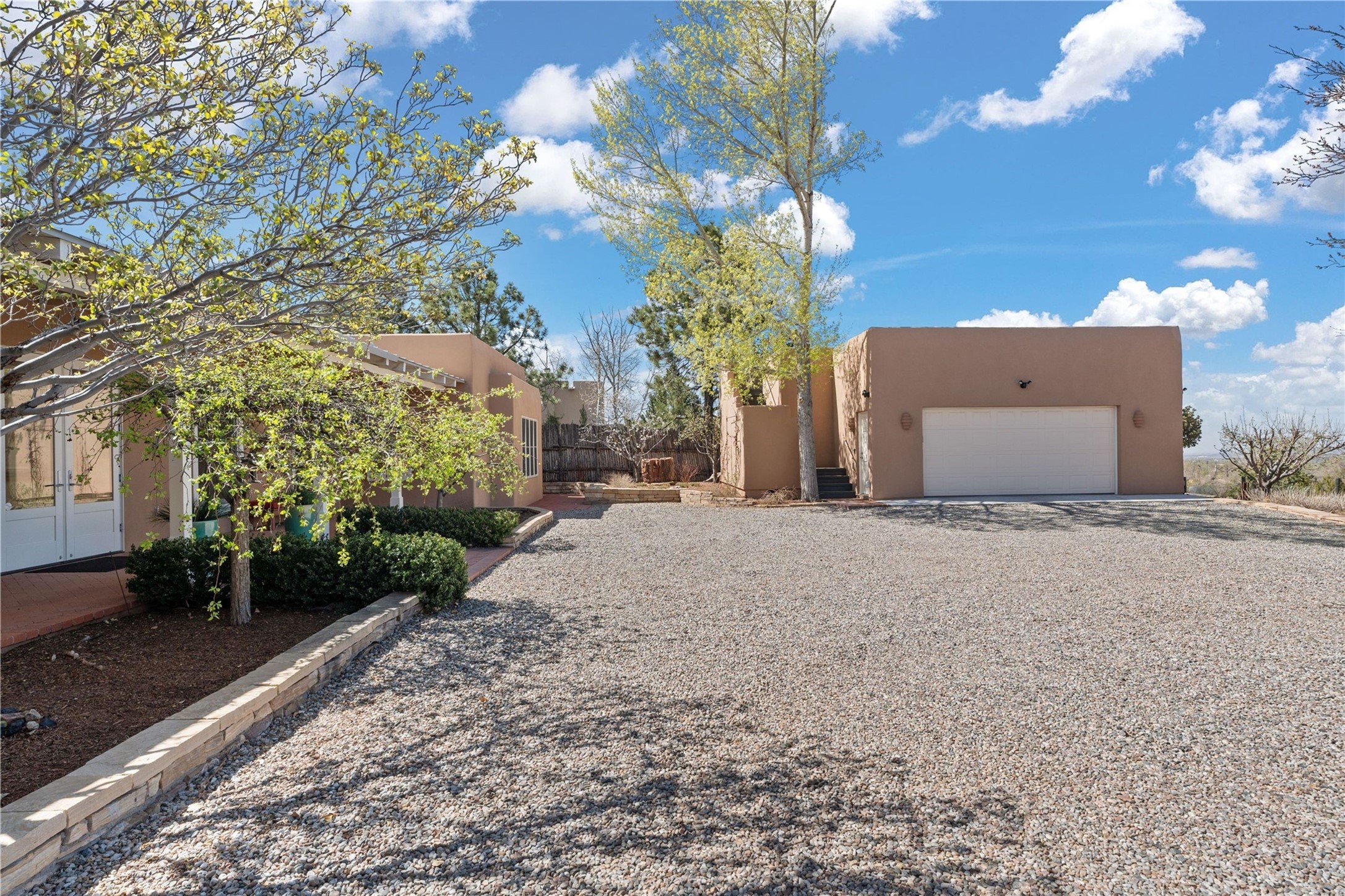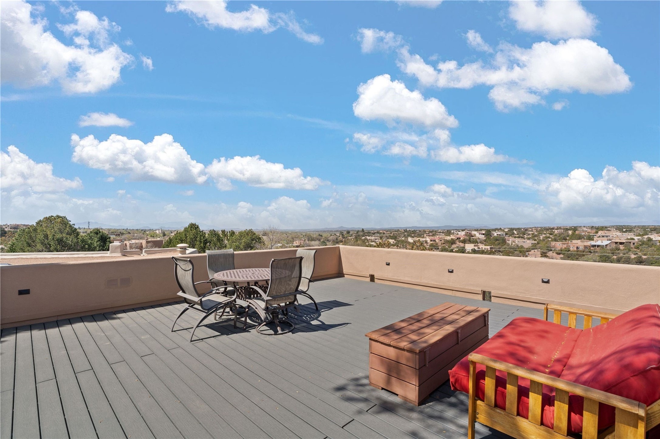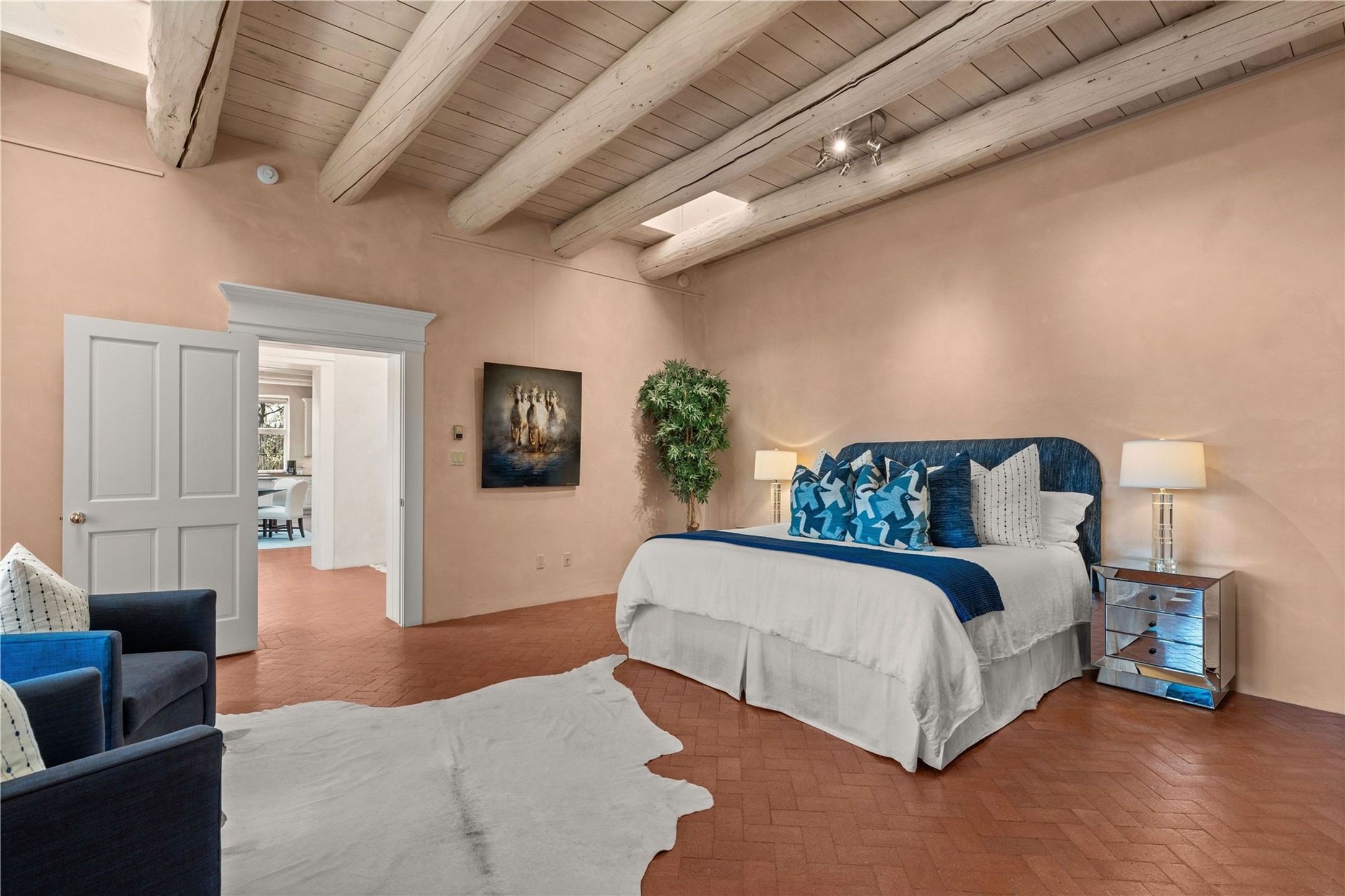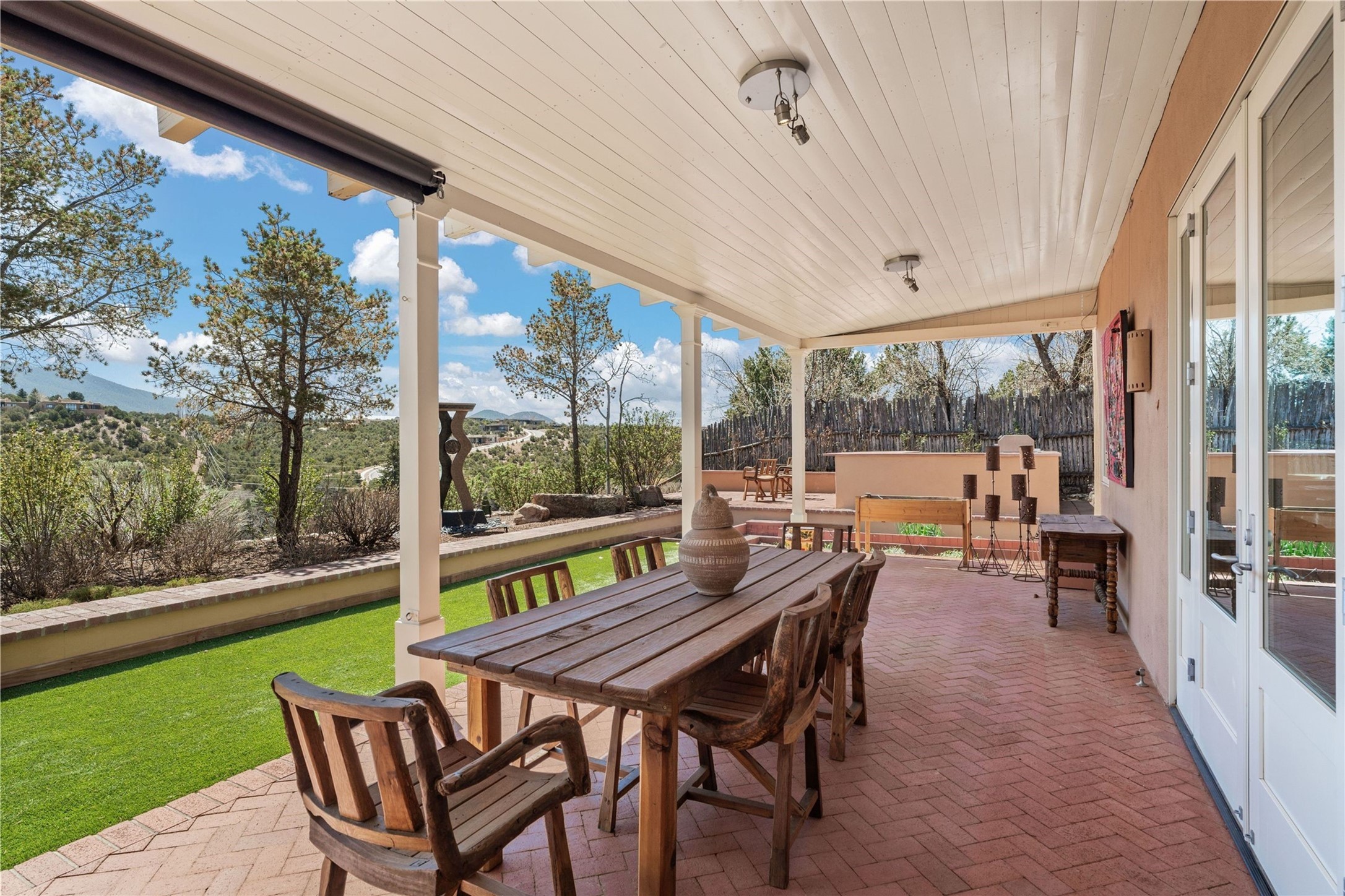 This unique and beautiful 3-bedroom, 3-bath modified Territorial-style, adobe home features unobstructed east-west mountain views and a tableau of breathtaking sunrises and sunsets. Designed by Doug Atwill, a Santa Fe builder/artist with exceptional vision, this home also features 13 ft. high beamed ceilings, 23 skylights, and radiant-heated brick floors complemented by 3 fireplaces. As you enter, a wide and gracious hallway welcomes and guides you to the back portal with stunning views of the eastern mountains. Situated to align with the summer solstice, this central hallway enjoys abundant light and provides a perfect place for displaying artwork. Public areas of the home, including elegant living room, library/media room, and spacious kitchen/dining room, are located on the south side of the hall while the private bedrooms are located on the north side. An outdoor grilling/barbecue station, hot tub, and multiple portals/patios, provide ample space for relaxation and entertaining. Gardeners and chefs alike will delight in the property's mature fruit trees and 2 waist-high irrigated planting beds. Oversized (built 2020) two-car detached garage features heating/cooling, floor-to-ceiling cabinets, art storage, EV charger, 220-volt RV charger and rooftop viewing/entertainment deck with panoramic mountain views. Environmentally conscious buyers will appreciate the green features including the solar photovoltaic electric system. Water monitoring and shut off system. Located less than one mile north of Fort Marcy and the historic Santa Fe Plaza.