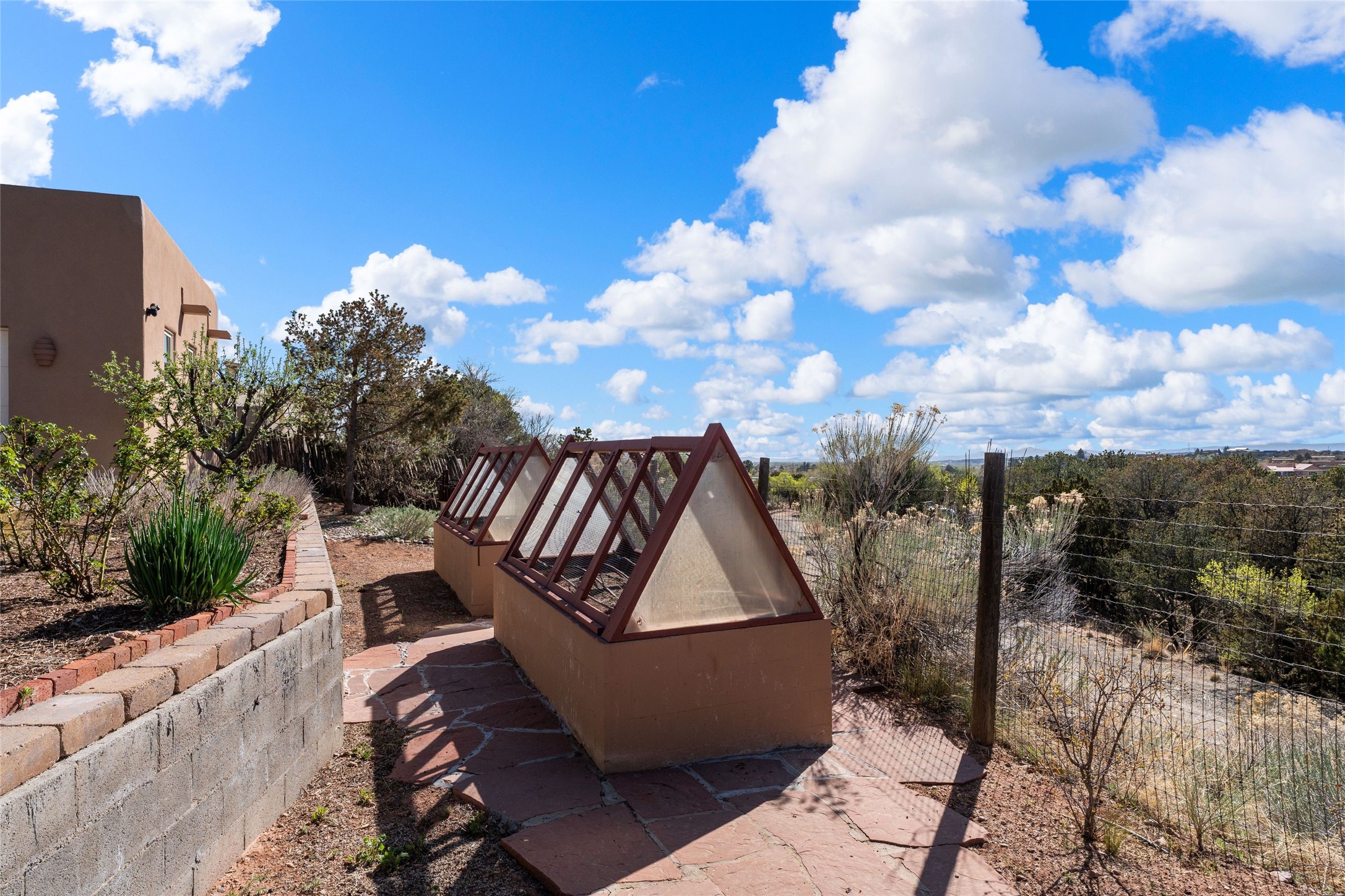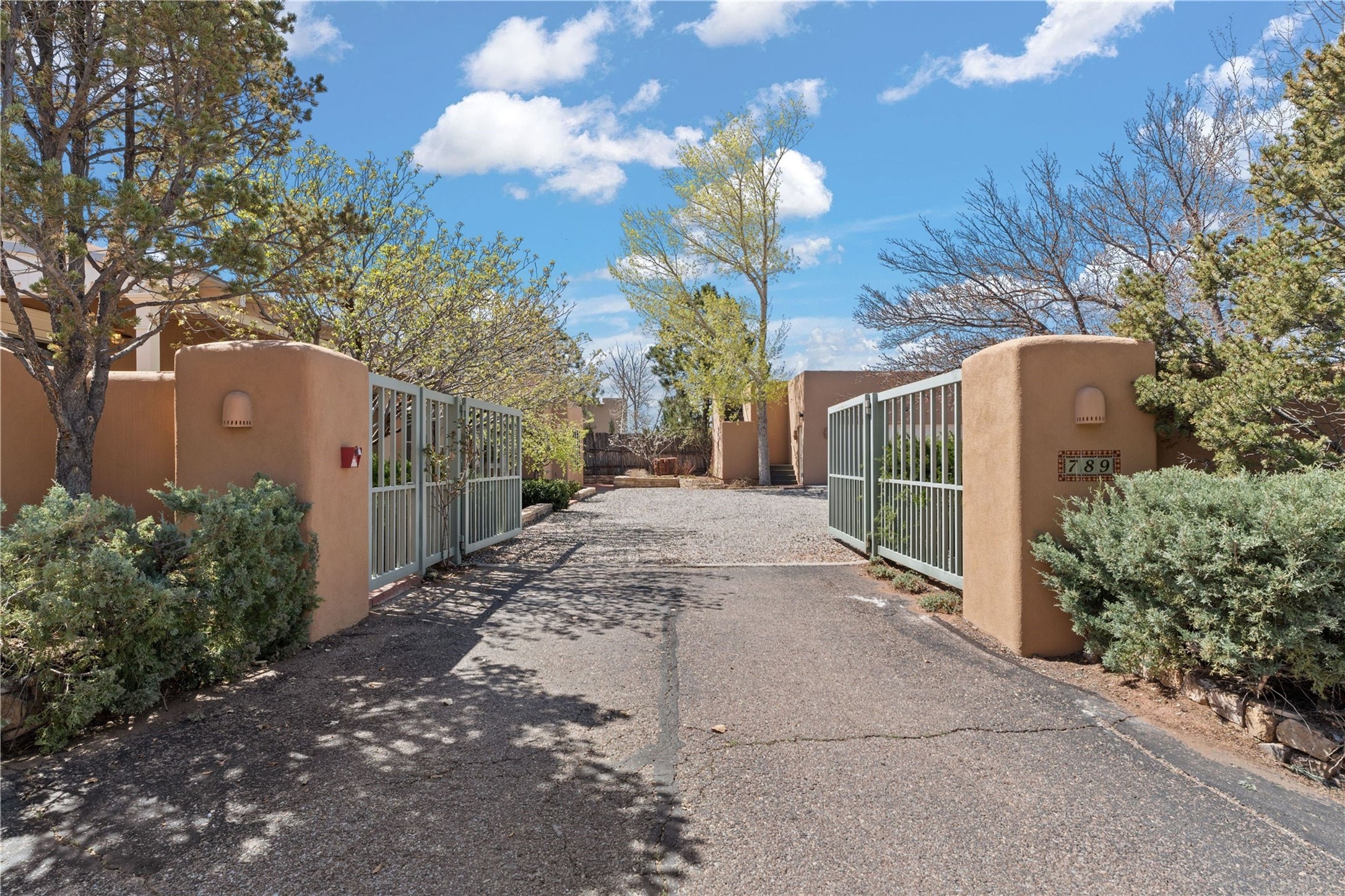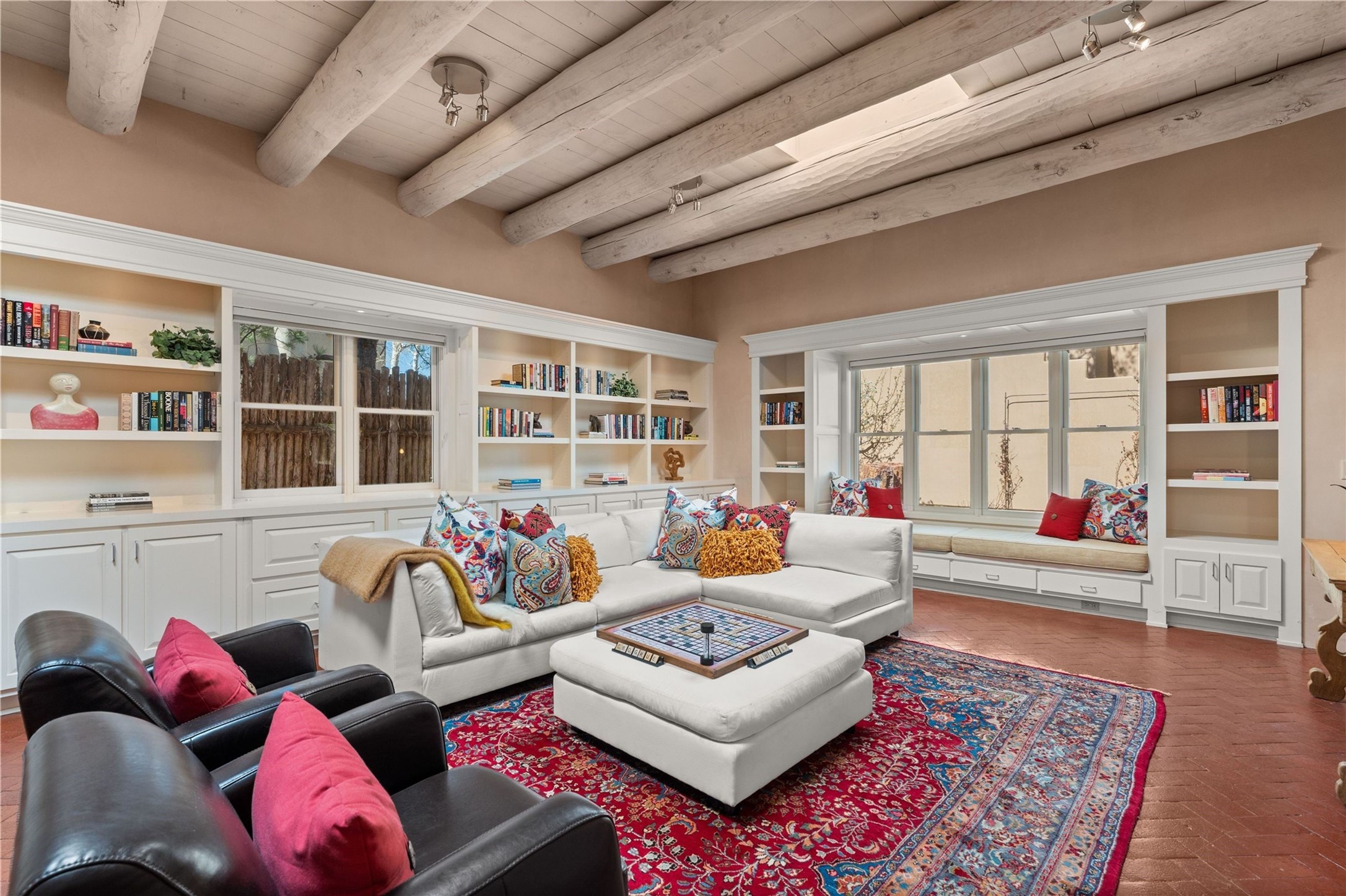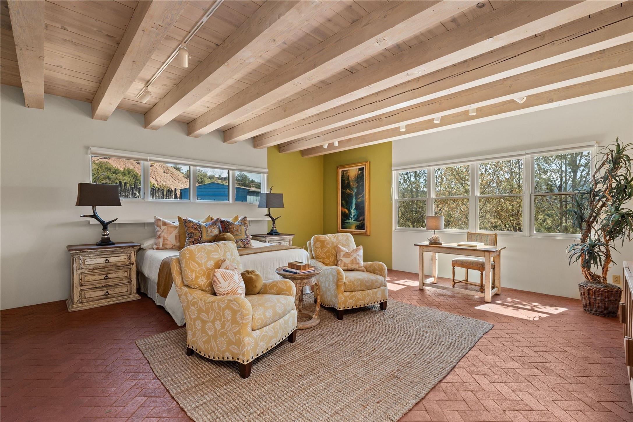 This unique and beautiful 3-bedroom, 3-bath modified Territorial-style, adobe home features unobstructed east-west mountain views and a tableau of breathtaking sunrises and sunsets. Designed by Doug Atwill, a Santa Fe builder/artist with exceptional vision, this home also features 13 ft. high beamed ceilings, 23 skylights, and radiant-heated brick floors complemented by 3 fireplaces. As you enter, a wide and gracious hallway welcomes and guides you to the back portal with stunning views of the eastern mountains. Situated to align with the summer solstice, this central hallway enjoys abundant light and provides a perfect place for displaying artwork. Public areas of the home, including elegant living room, library/media room, and spacious kitchen/dining room, are located on the south side of the hall while the private bedrooms are located on the north side. An outdoor grilling/barbecue station, hot tub, and multiple portals/patios, provide ample space for relaxation and entertaining. Gardeners and chefs alike will delight in the property's mature fruit trees and 2 waist-high irrigated planting beds. Oversized (built 2020) two-car detached garage features heating/cooling, floor-to-ceiling cabinets, art storage, EV charger, 220-volt RV charger and rooftop viewing/entertainment deck with panoramic mountain views. Environmentally conscious buyers will appreciate the green features including the solar photovoltaic electric system. Water monitoring and shut off system. Located less than one mile north of Fort Marcy and the historic Santa Fe Plaza.