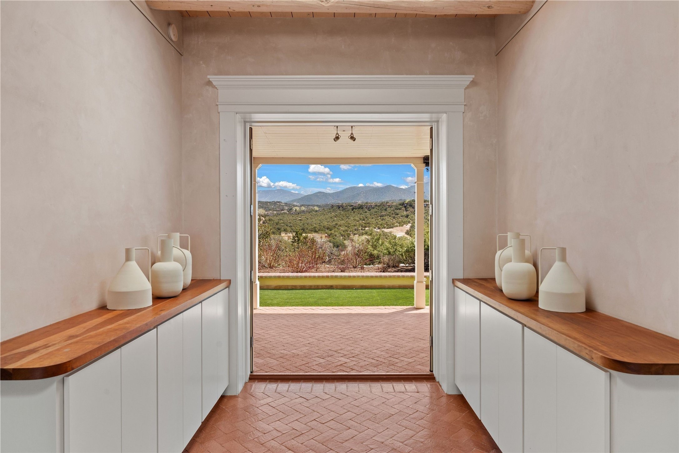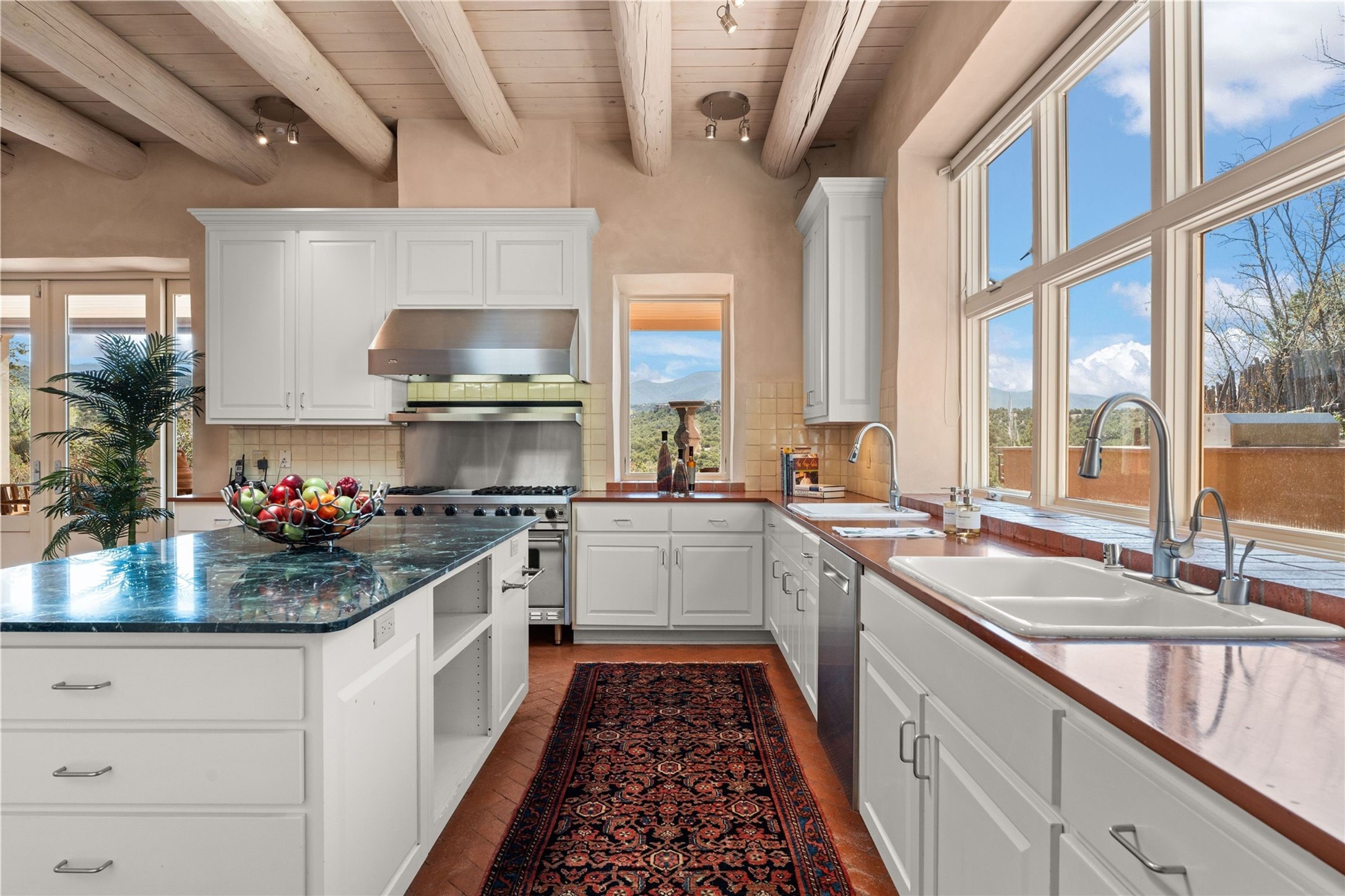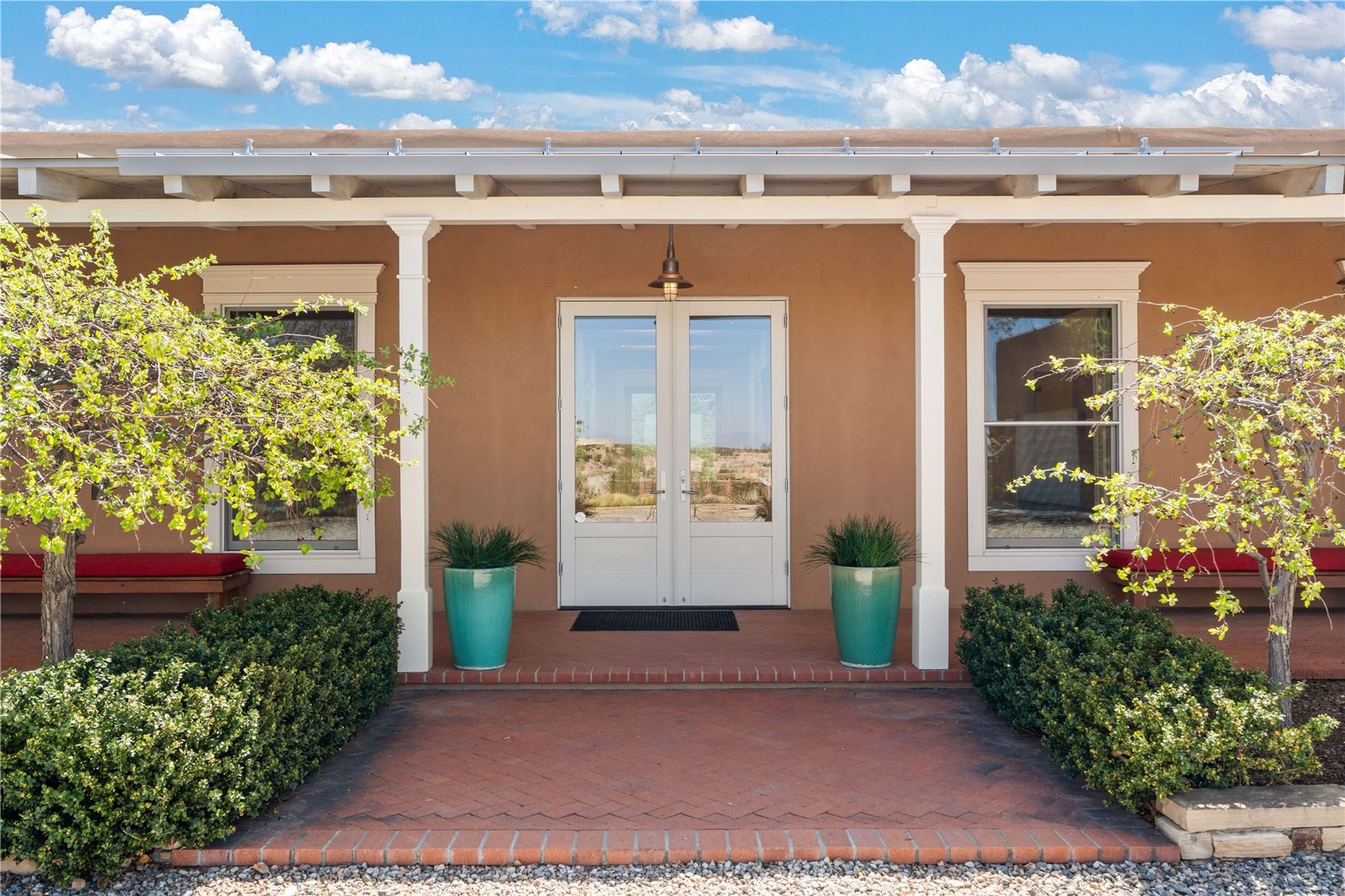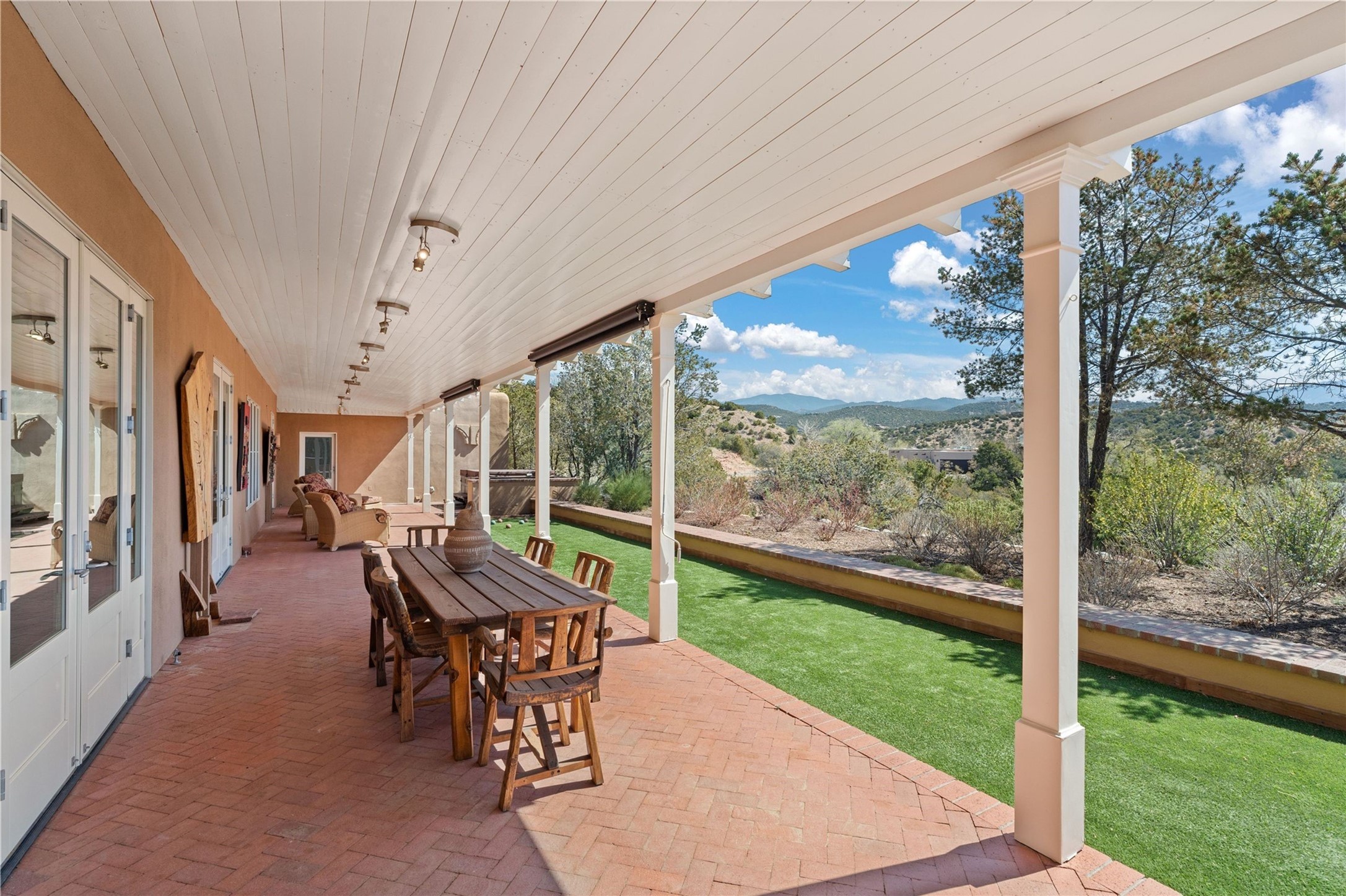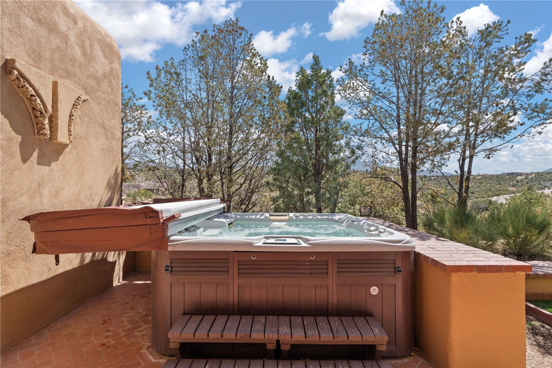 This unique and beautiful 3-bedroom, 3-bath modified Territorial-style, adobe home features unobstructed east-west mountain views and a tableau of breathtaking sunrises and sunsets. Designed by Doug Atwill, a Santa Fe builder/artist with exceptional vision, this home also features 13 ft. high beamed ceilings, 23 skylights, and radiant-heated brick floors complemented by 3 fireplaces. As you enter, a wide and gracious hallway welcomes and guides you to the back portal with stunning views of the eastern mountains. Situated to align with the summer solstice, this central hallway enjoys abundant light and provides a perfect place for displaying artwork. Public areas of the home, including elegant living room, library/media room, and spacious kitchen/dining room, are located on the south side of the hall while the private bedrooms are located on the north side. An outdoor grilling/barbecue station, hot tub, and multiple portals/patios, provide ample space for relaxation and entertaining. Gardeners and chefs alike will delight in the property's mature fruit trees and 2 waist-high irrigated planting beds. Oversized (built 2020) two-car detached garage features heating/cooling, floor-to-ceiling cabinets, art storage, EV charger, 220-volt RV charger and rooftop viewing/entertainment deck with panoramic mountain views. Environmentally conscious buyers will appreciate the green features including the solar photovoltaic electric system. Water monitoring and shut off system. Located less than one mile north of Fort Marcy and the historic Santa Fe Plaza.